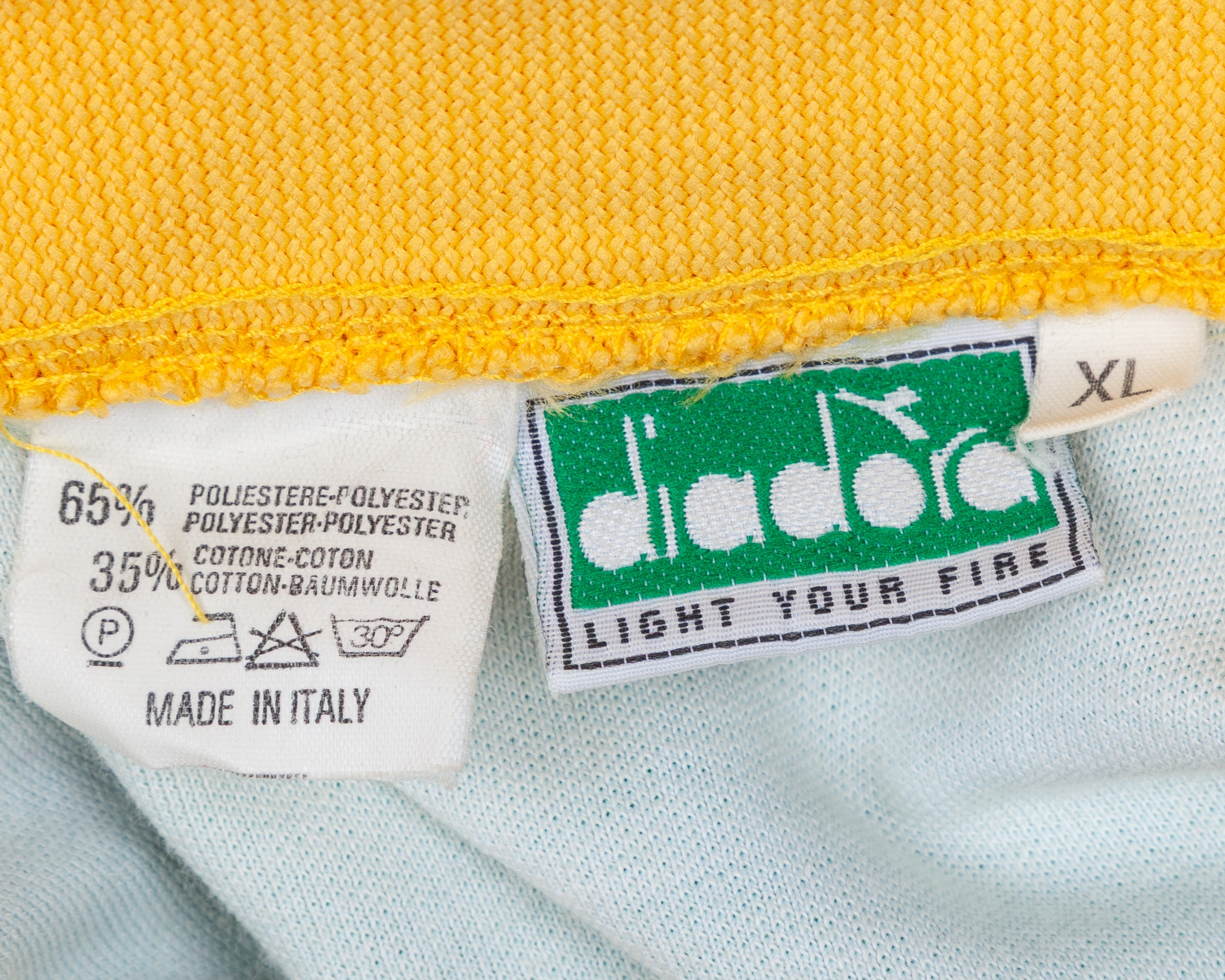 Green and yellow No.4 Lithuania v. Sweden long-sleeved shirt, 1994, Diadora, XL, with v-neck collar and embroidered cloth badge inscribed LIETUVA
