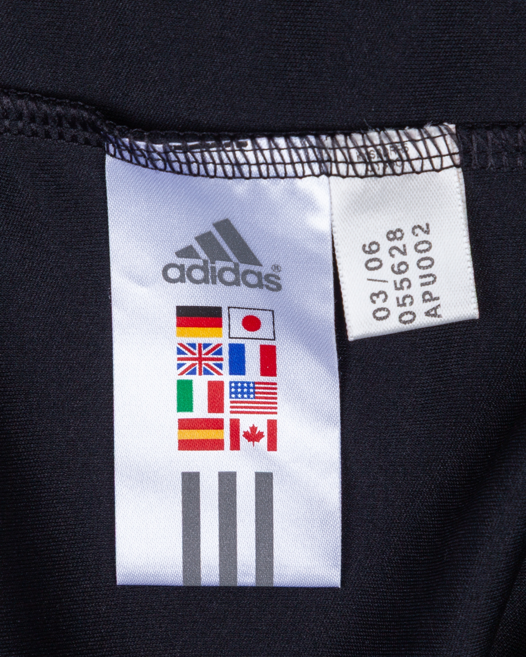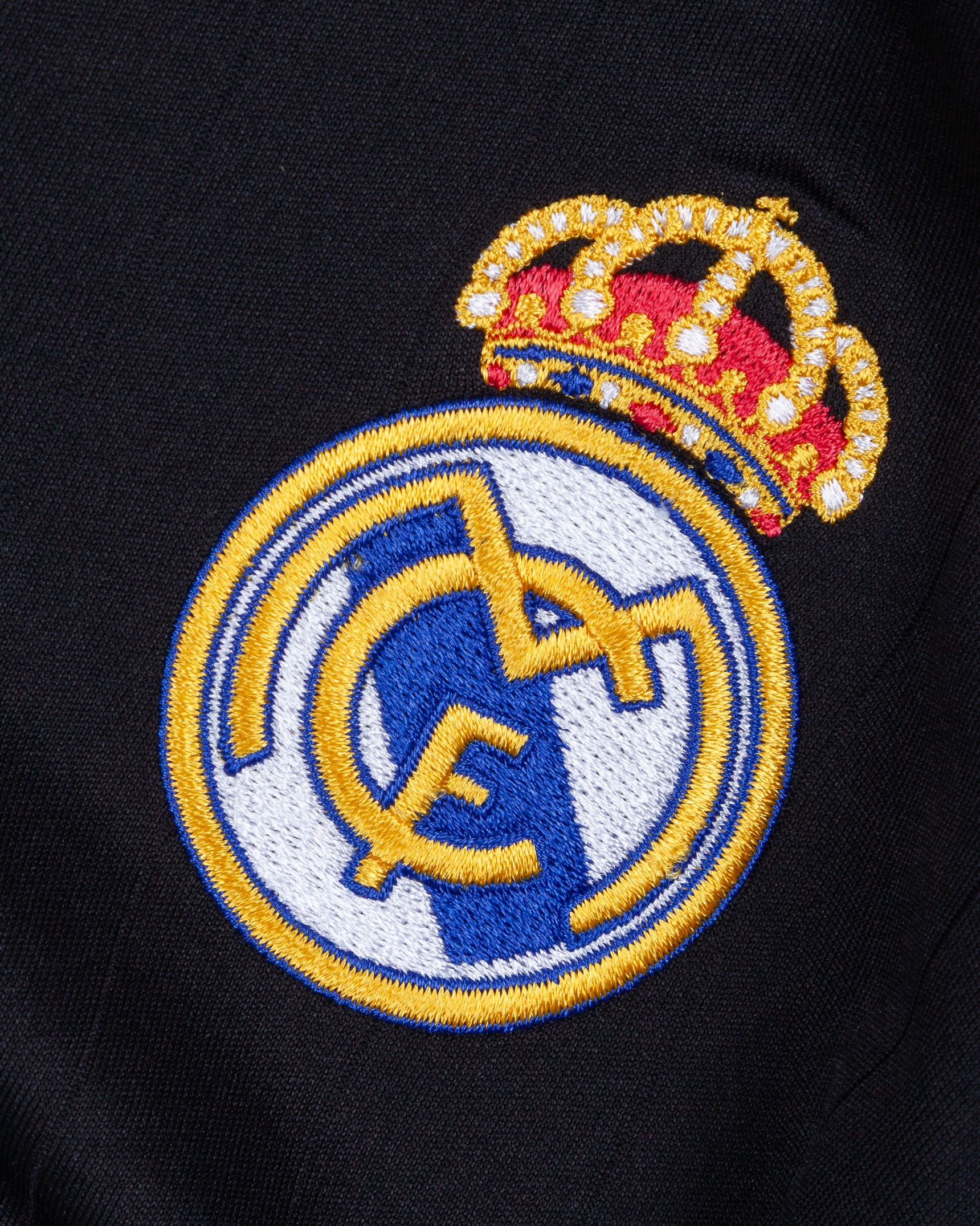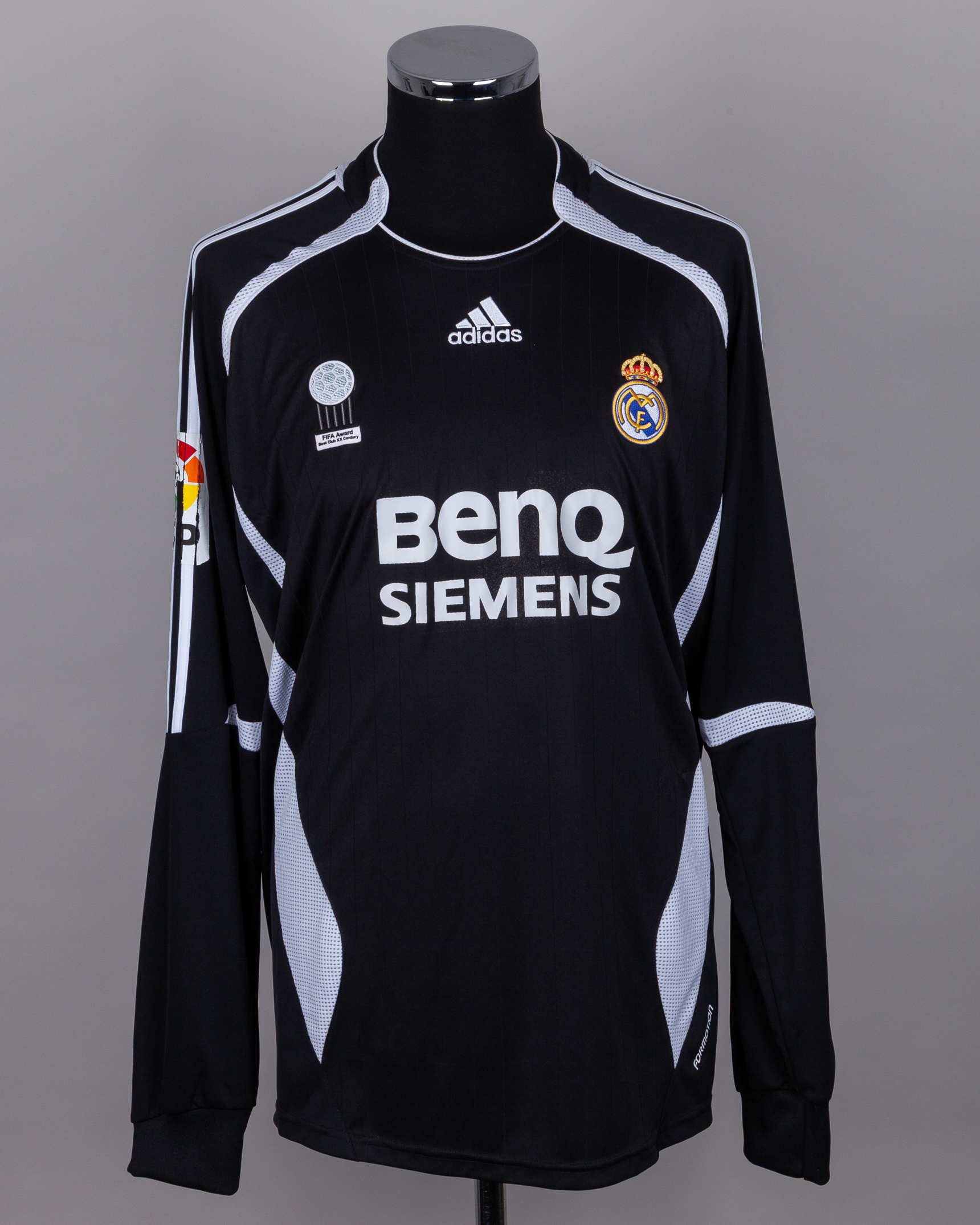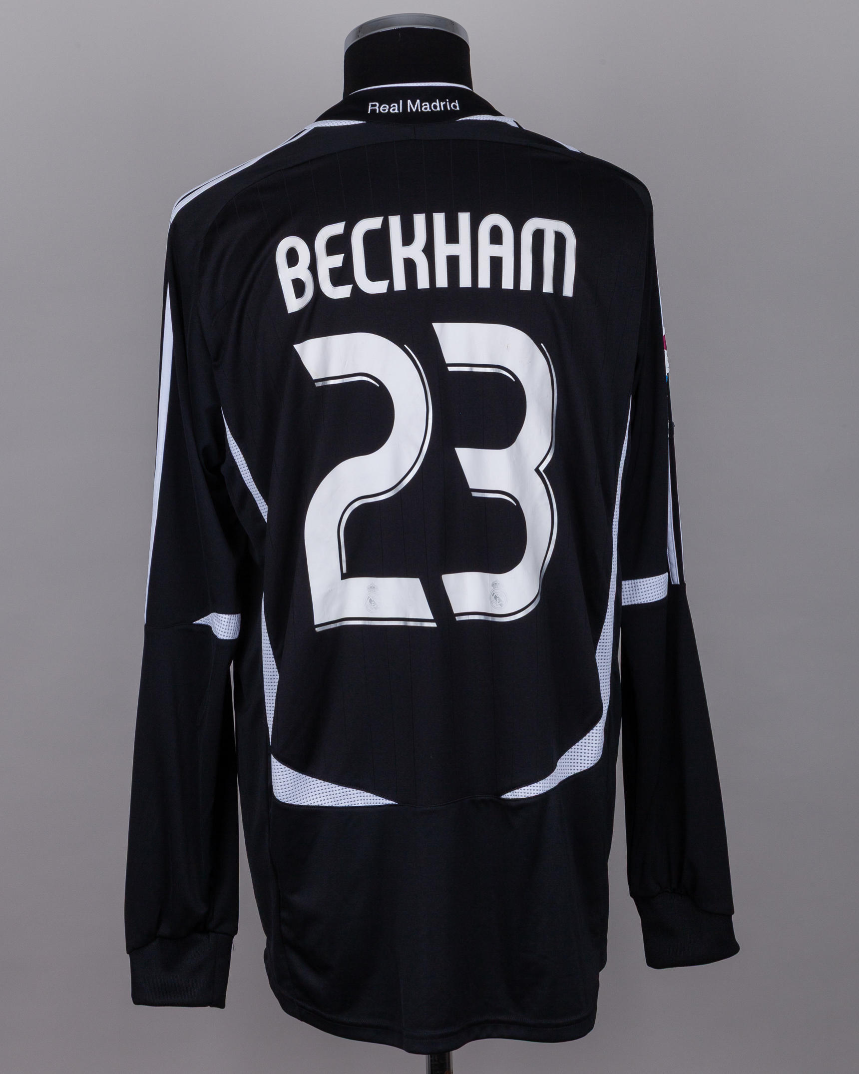 David Beckham black No.23 Real Madrid v. Real Sociedad long-sleeved shirt, 2007, Adidas, XL, with crew-neck collar and embroidered badge, the reverse lettered BECKHAM, the right sleeve with LFP flash, print worn particularly shirt