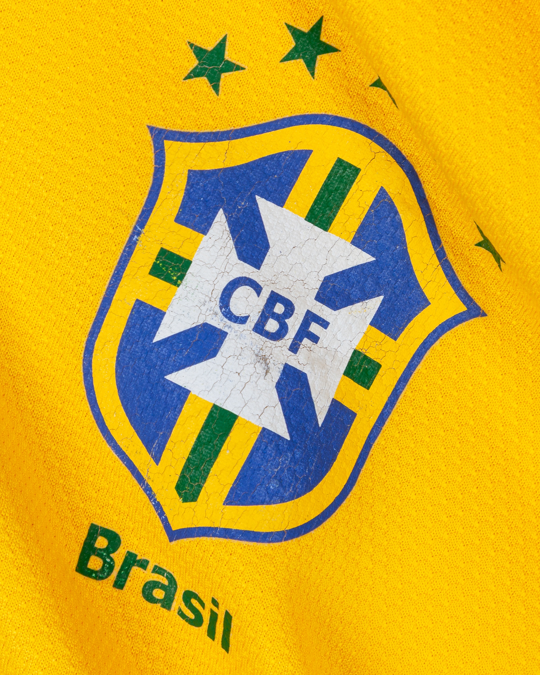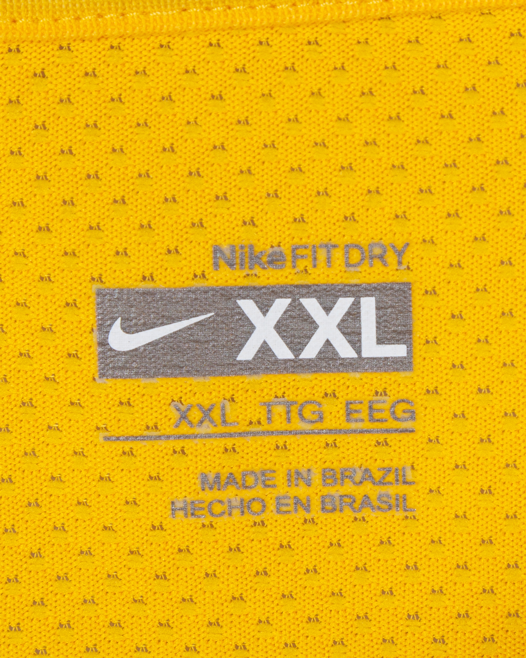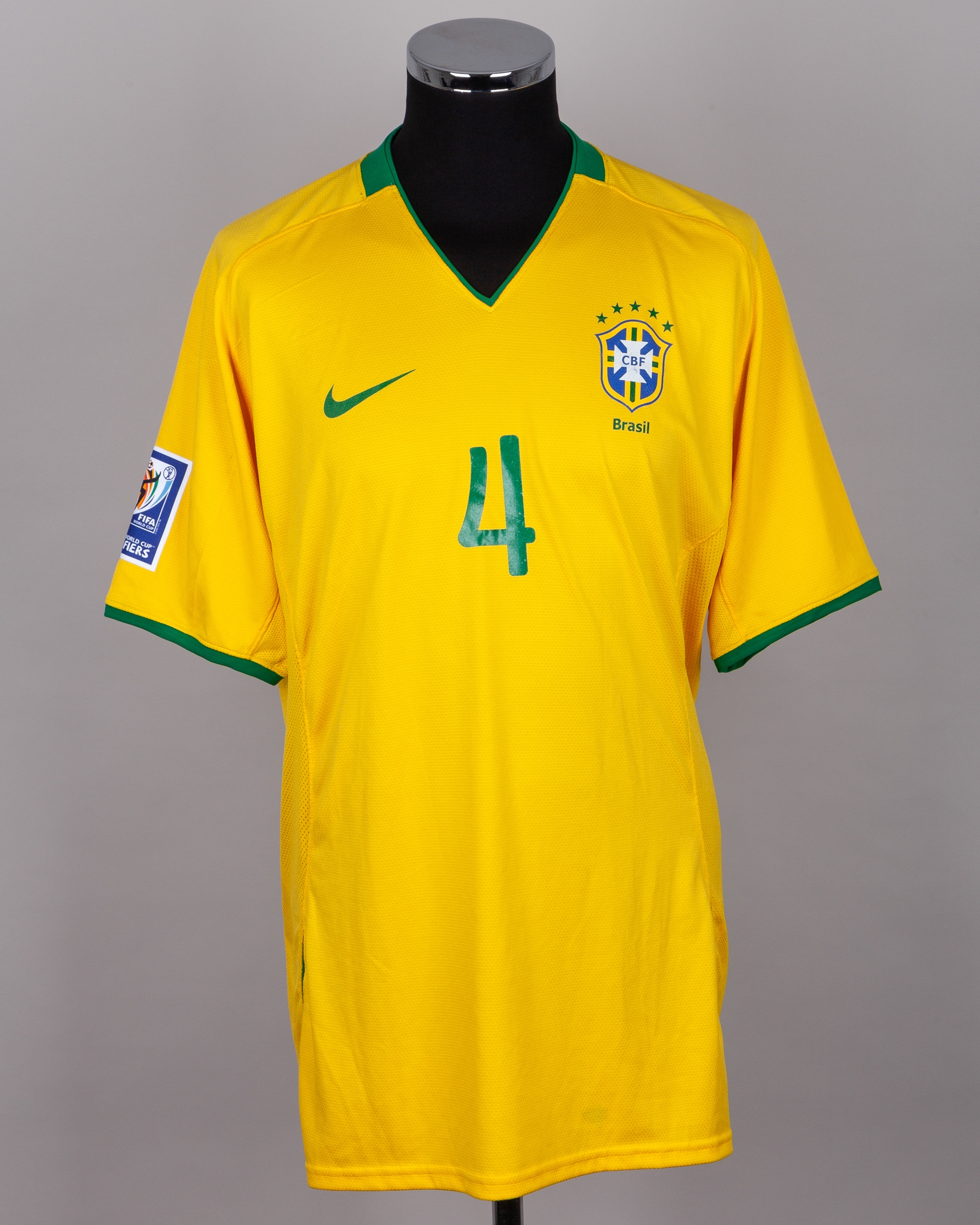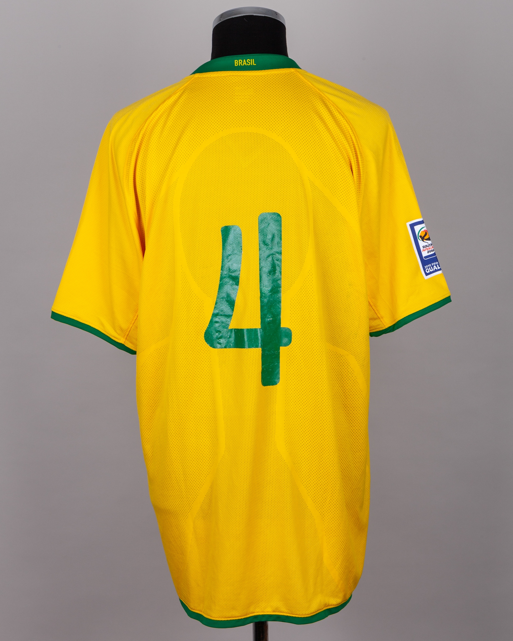 Juan yellow and green No.4 Brazil short-sleeved shirt, 2008-09, Nike, XXL, with v-neck collar and printed badged, the right sleeve with 2010 FIFA World Cup qualifiers flash, with some staining and number worn