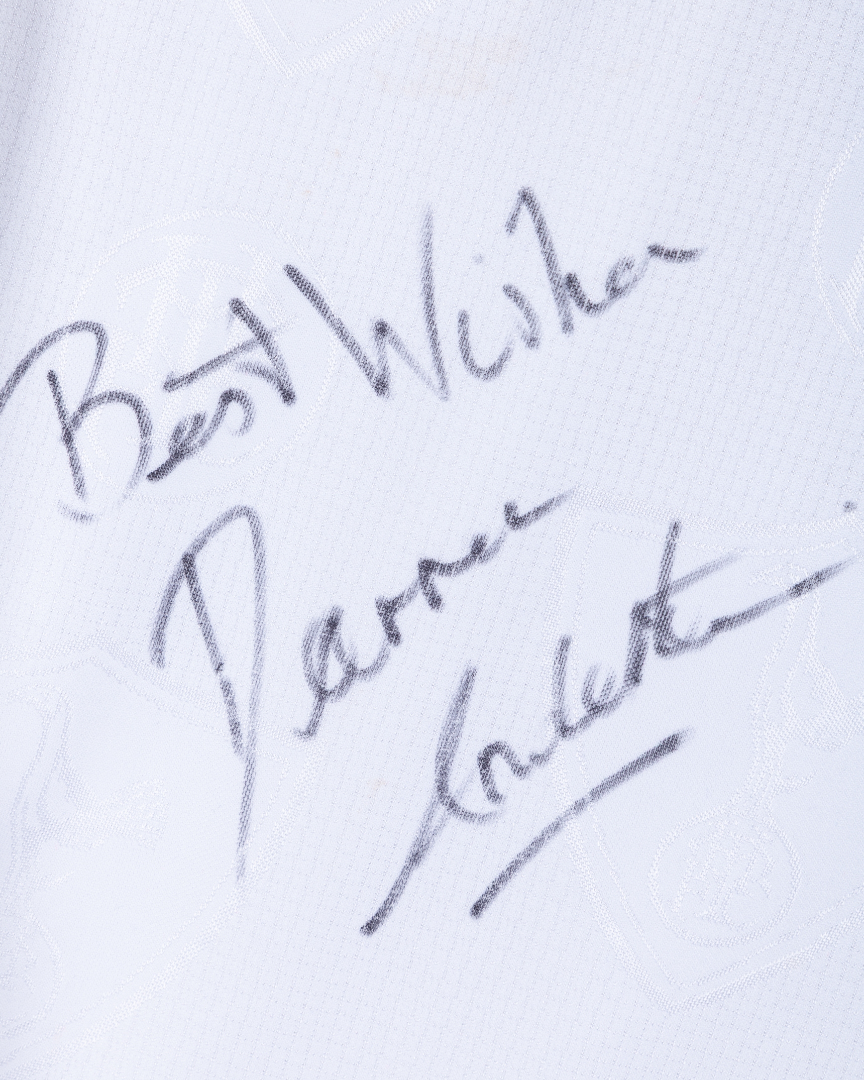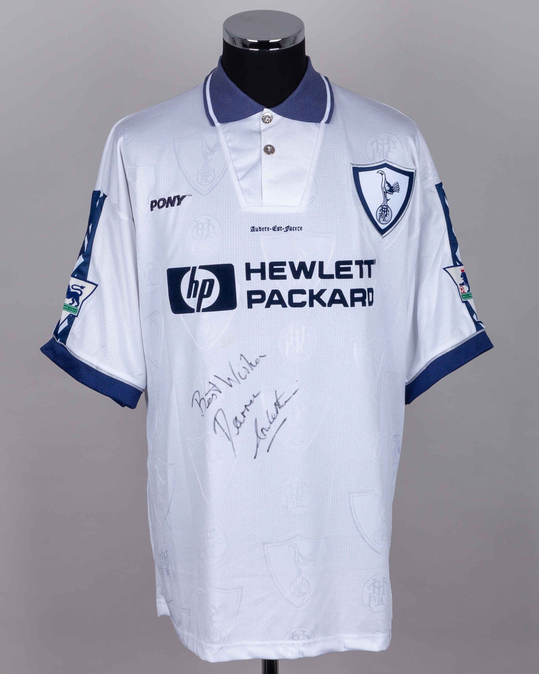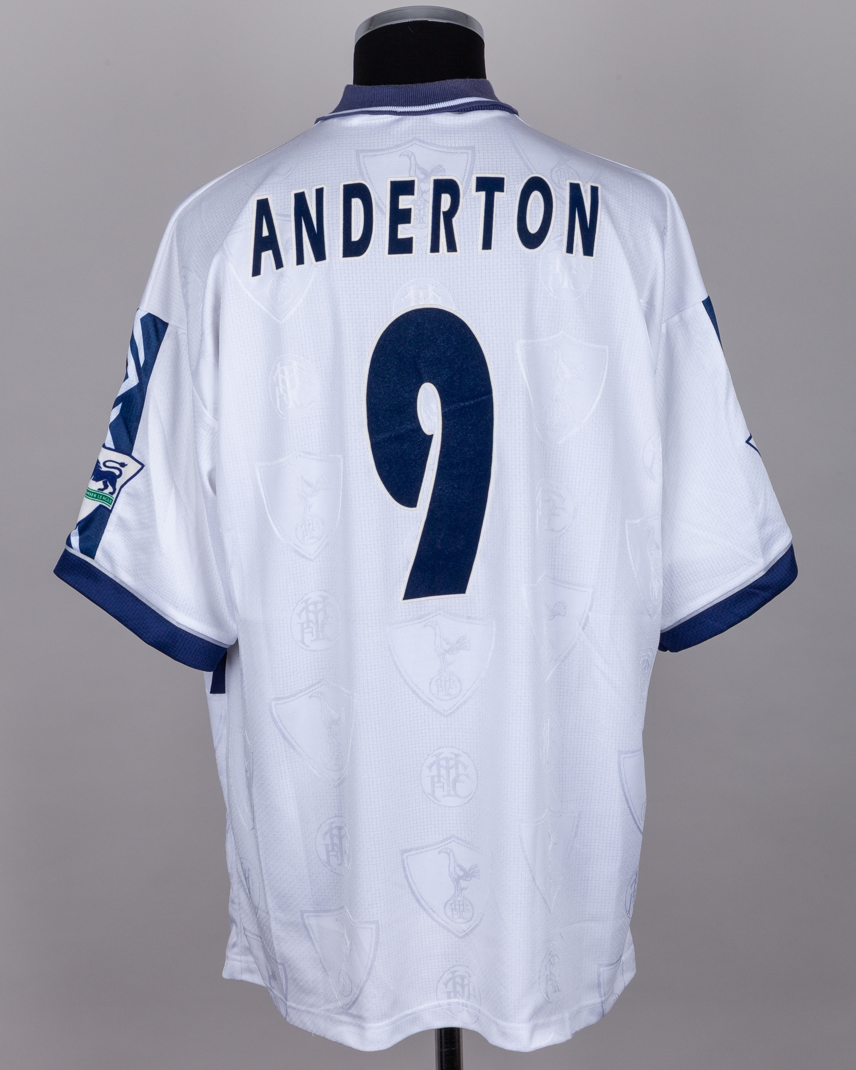 Darren Anderton white and blue No.9 Tottenham Hotspur short-sleeved shirt, 1995-96, Pony, with button-up collar and embroidered cloth badge inscribed THFC, the front of the shirt autographed by Anderton, the reverse lettered ANDERTON, the sleeves with The F.A. Premier League flashes