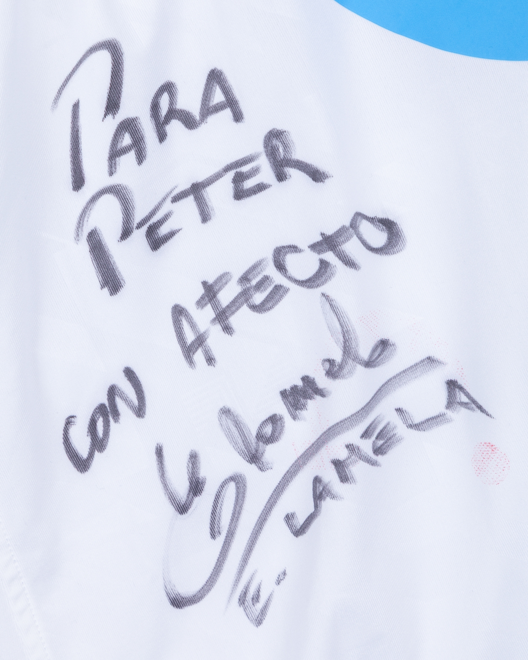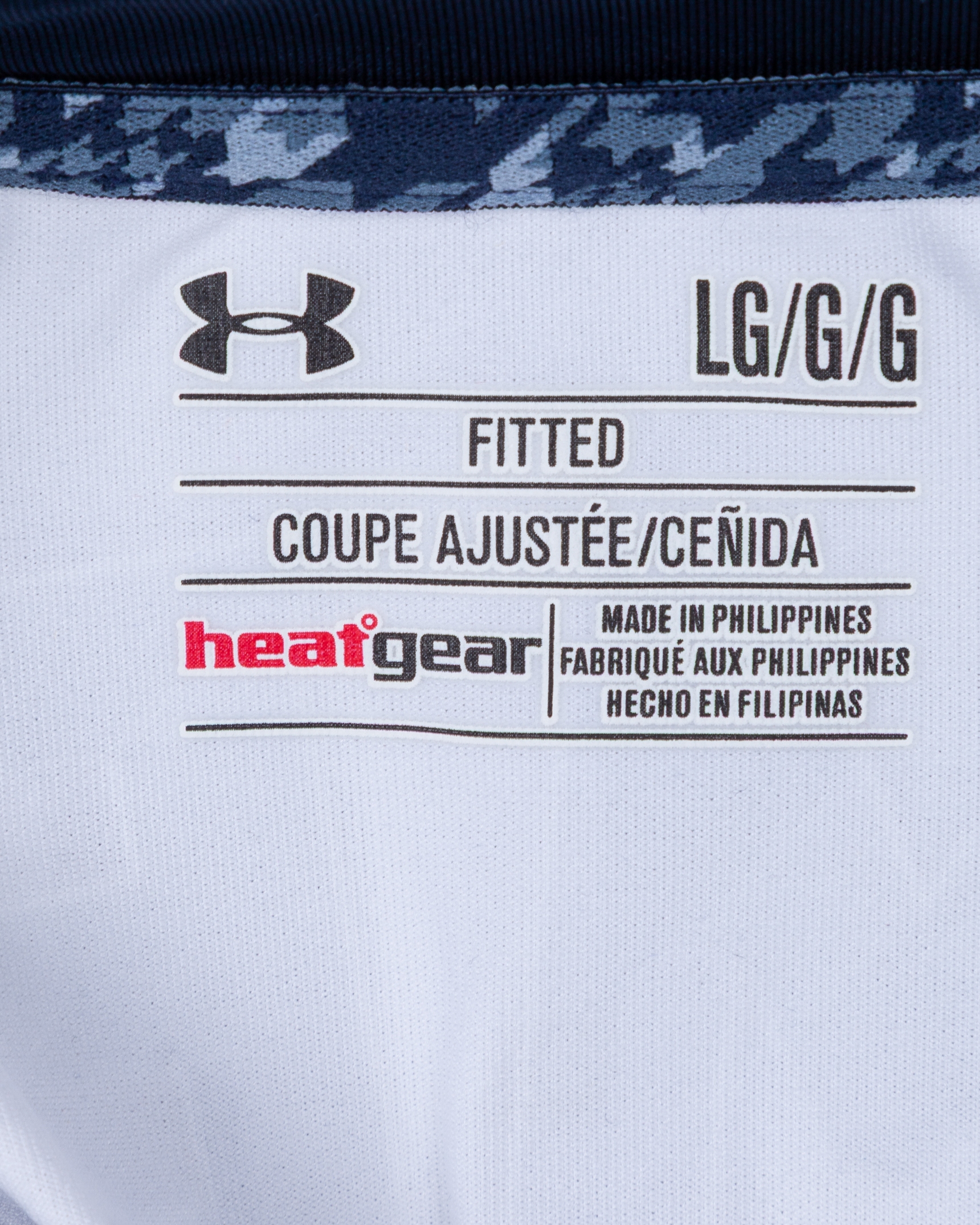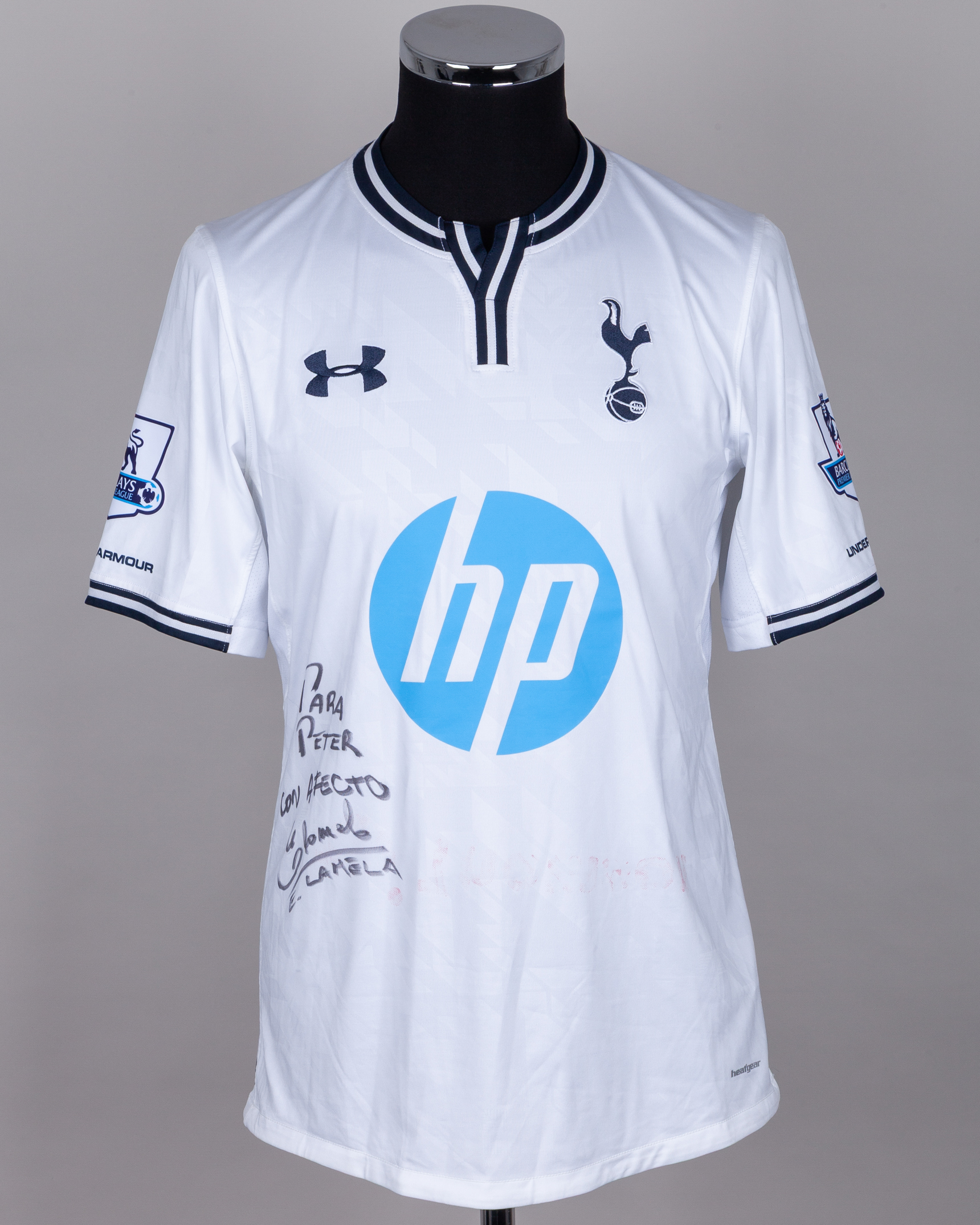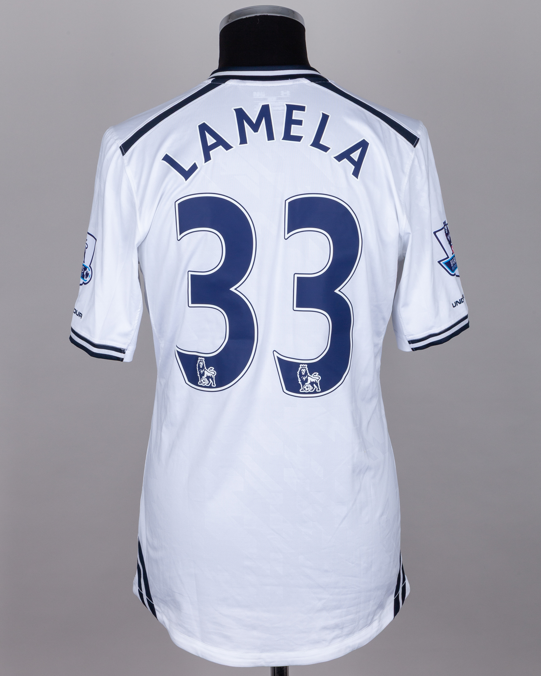 Eric Lamela white and blue No.33 Tottenham Hotspur short-sleeved shirt, 2013-14, Under armour, L, with crew-neck collar and embroidered cloth badge, the front of the shirt dedicated and autographed by Lamela, the reverse lettered LAMELA, the sleeves with Barclays Premier League flashes, staining to front with Thompson logo