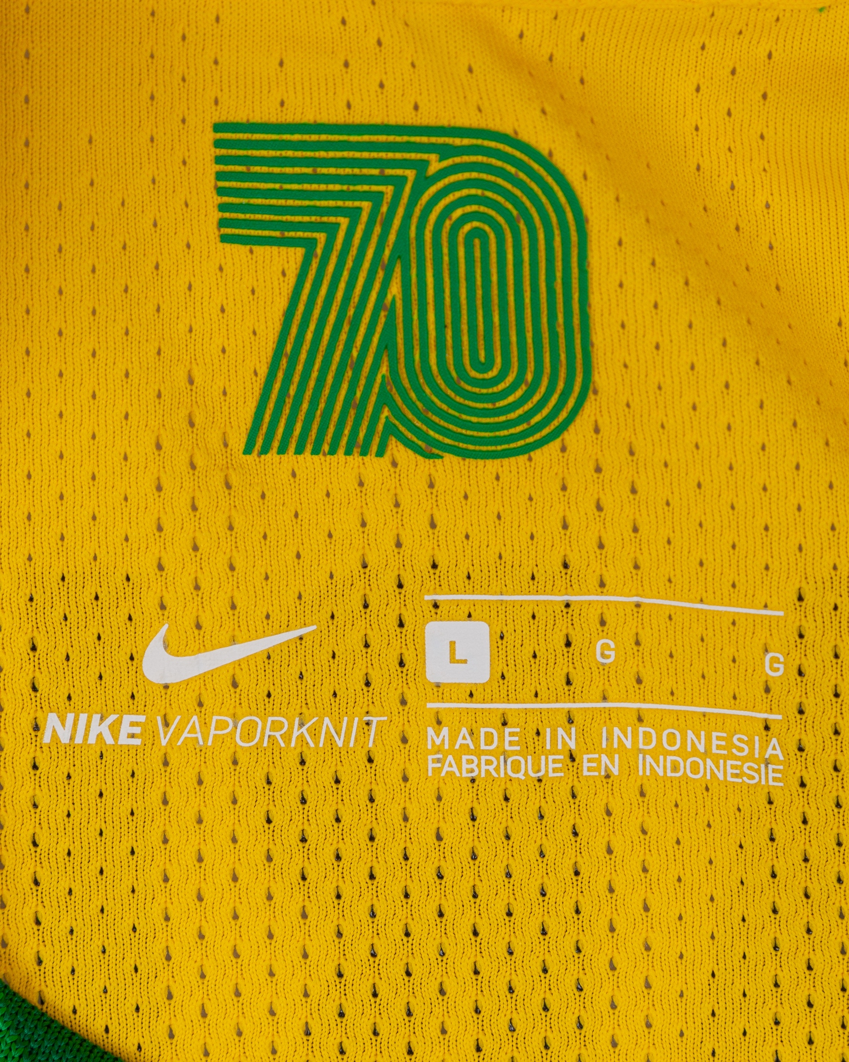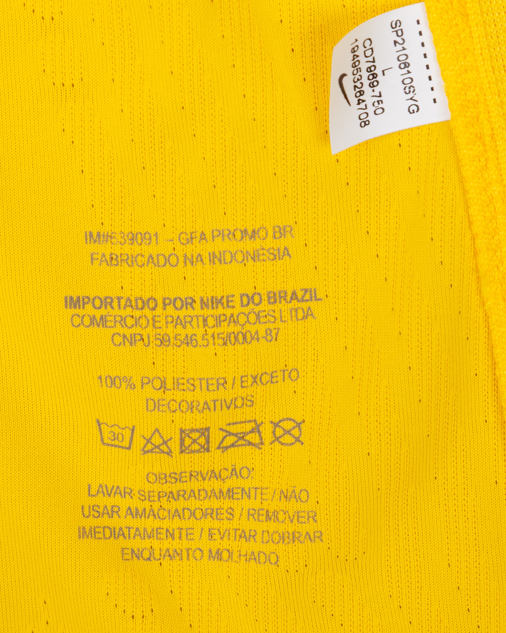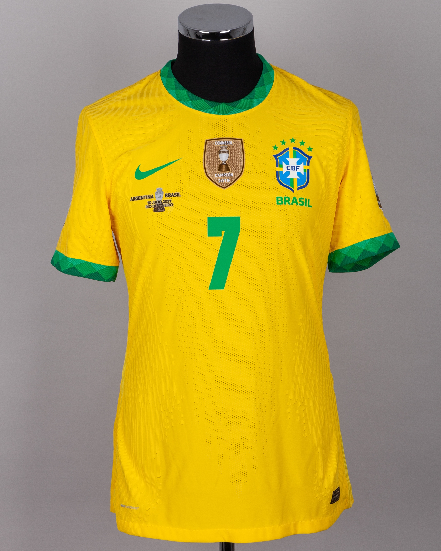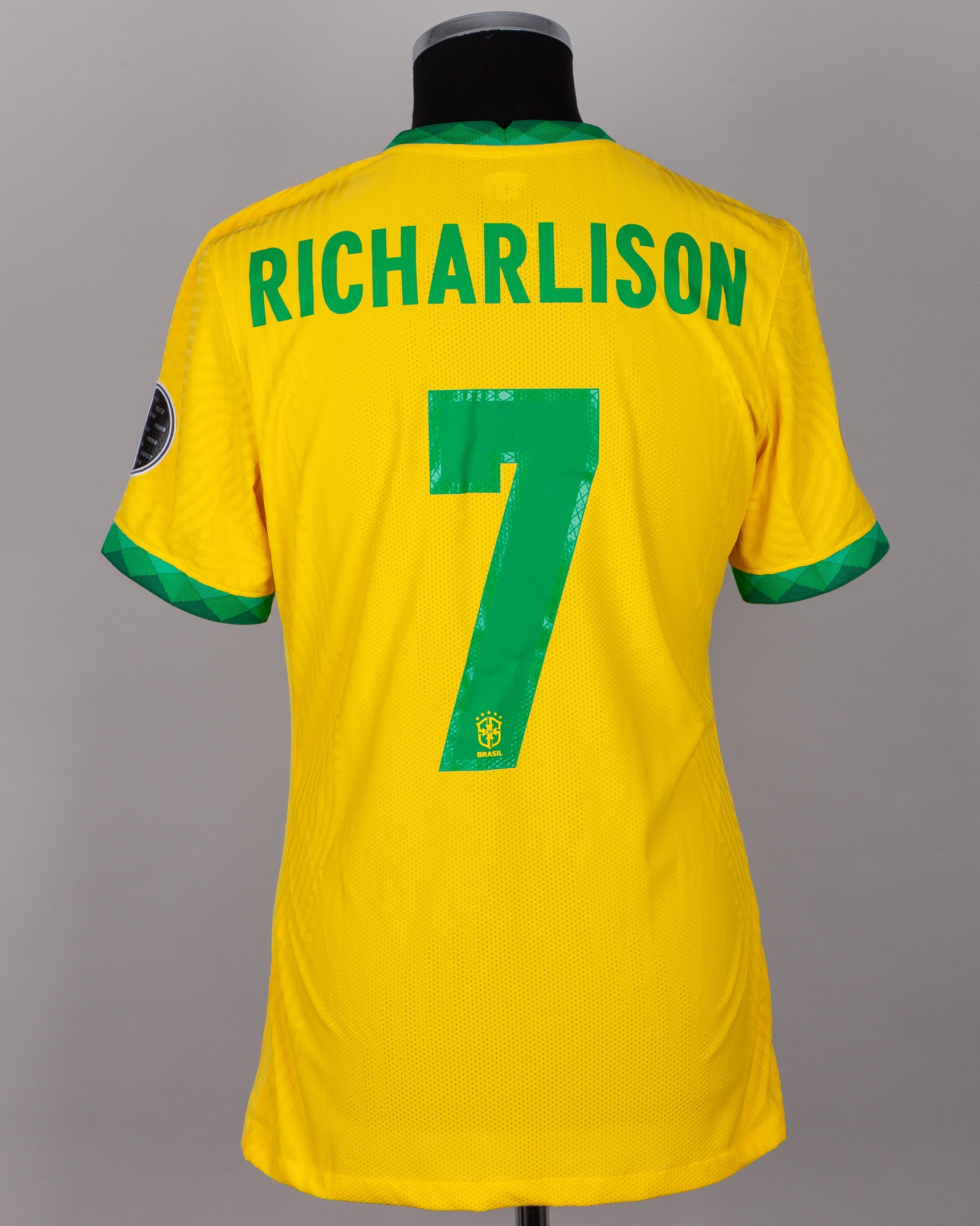 Richarlison yellow and green No.7 Brazil v. Argentina Copa America Final short-sleeved shirt, 2021, Nike, L, with crew-neck collar and printed badge, with Conmebol Campeon 2019 badge, with ARGENTINA VS BRASIL 10 JULIO 2021 RIO DE JANEIRO FINAL BRASIL decal, the reverse lettered RICHARLISON, the right sleeve with Copa America 2021 Final flash and the left sleeve with nine times champions flash
