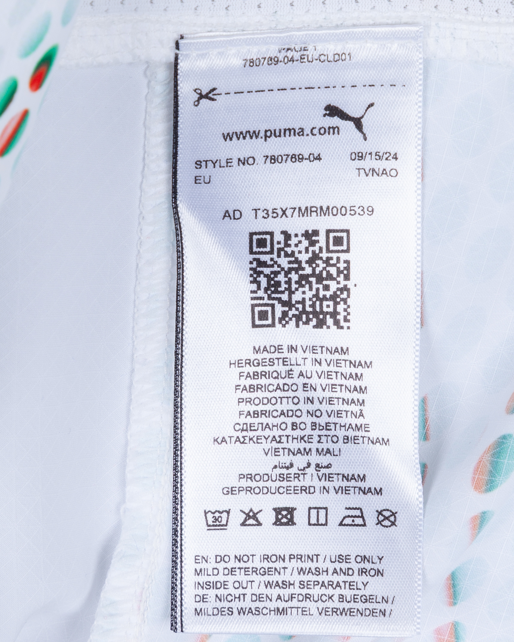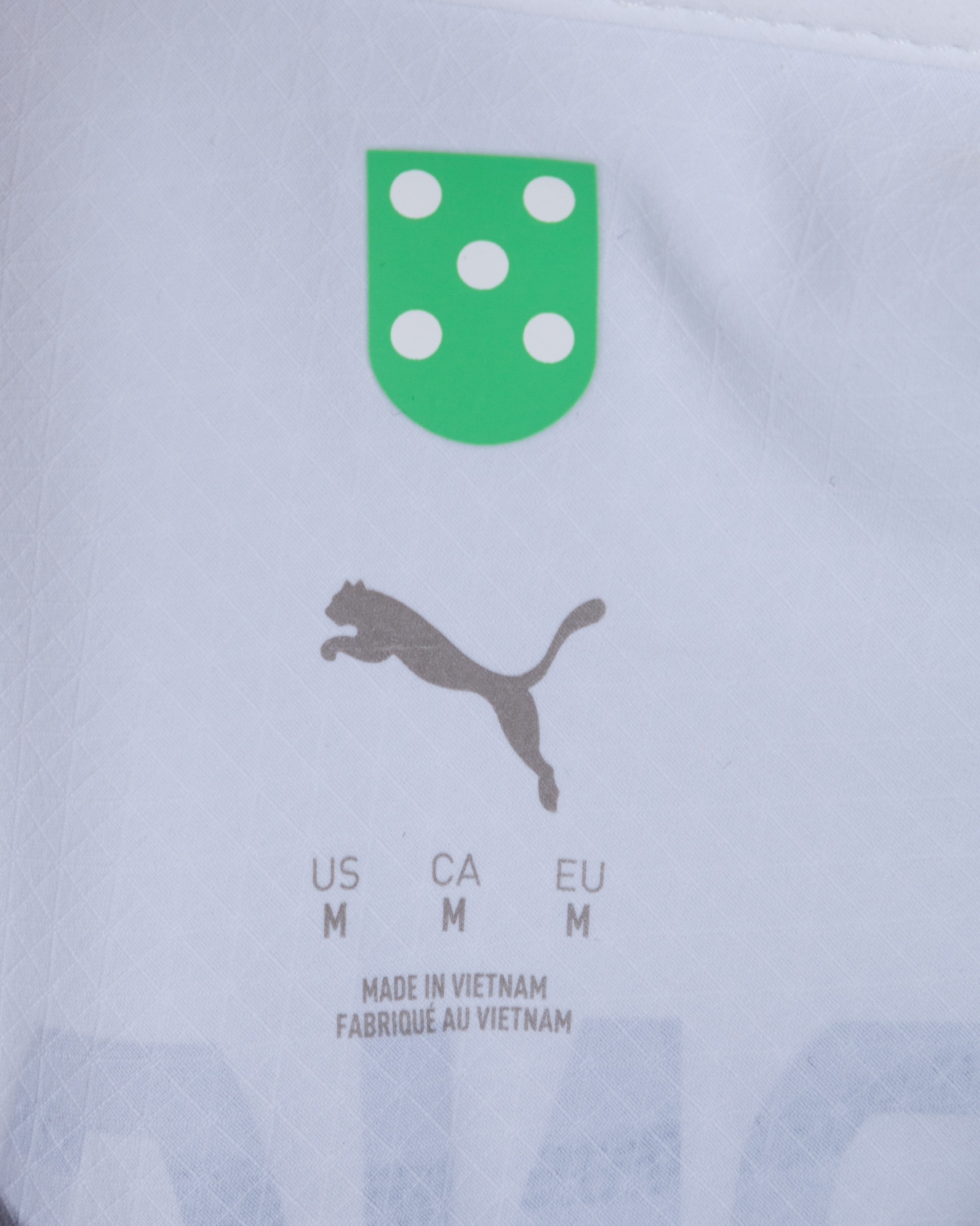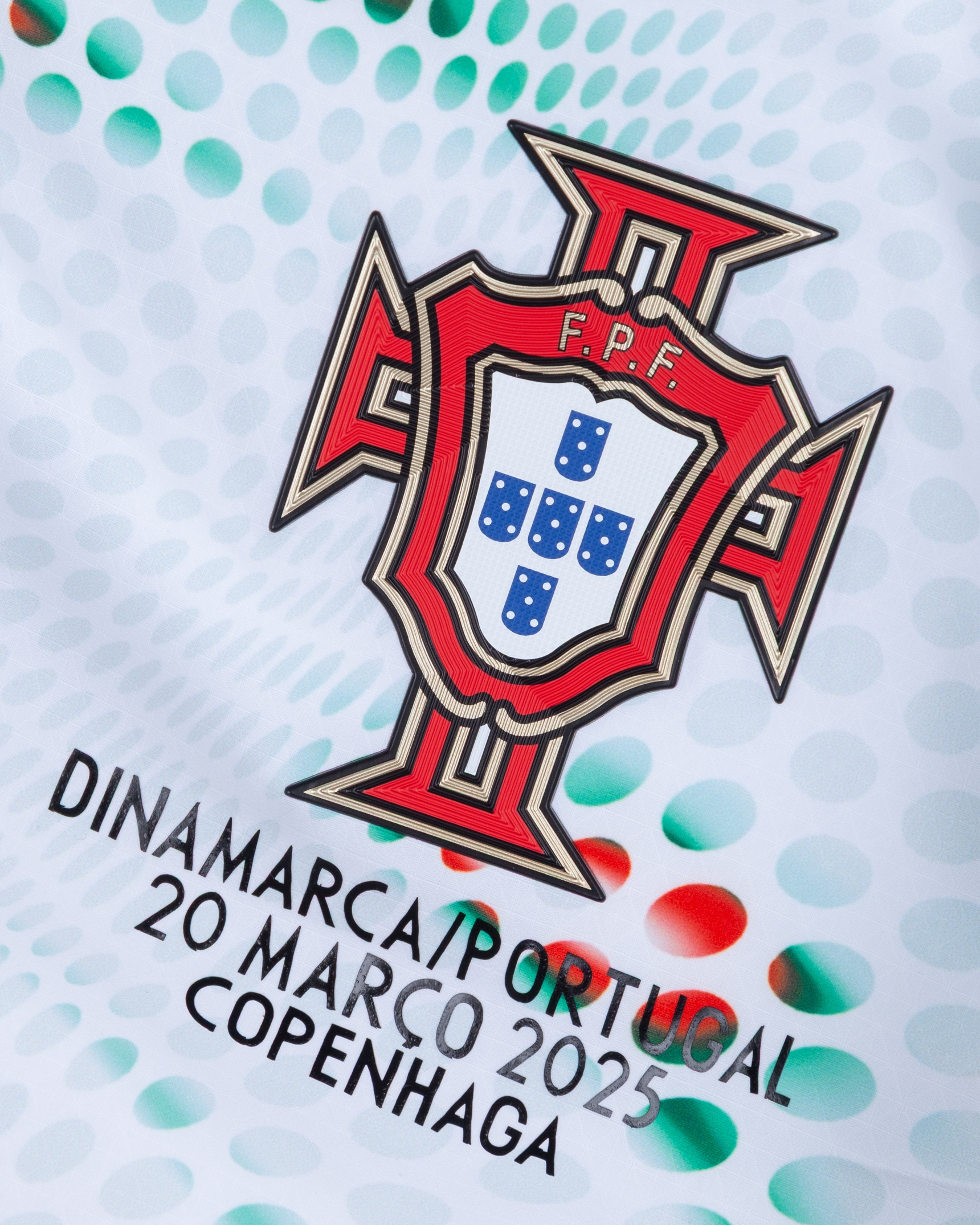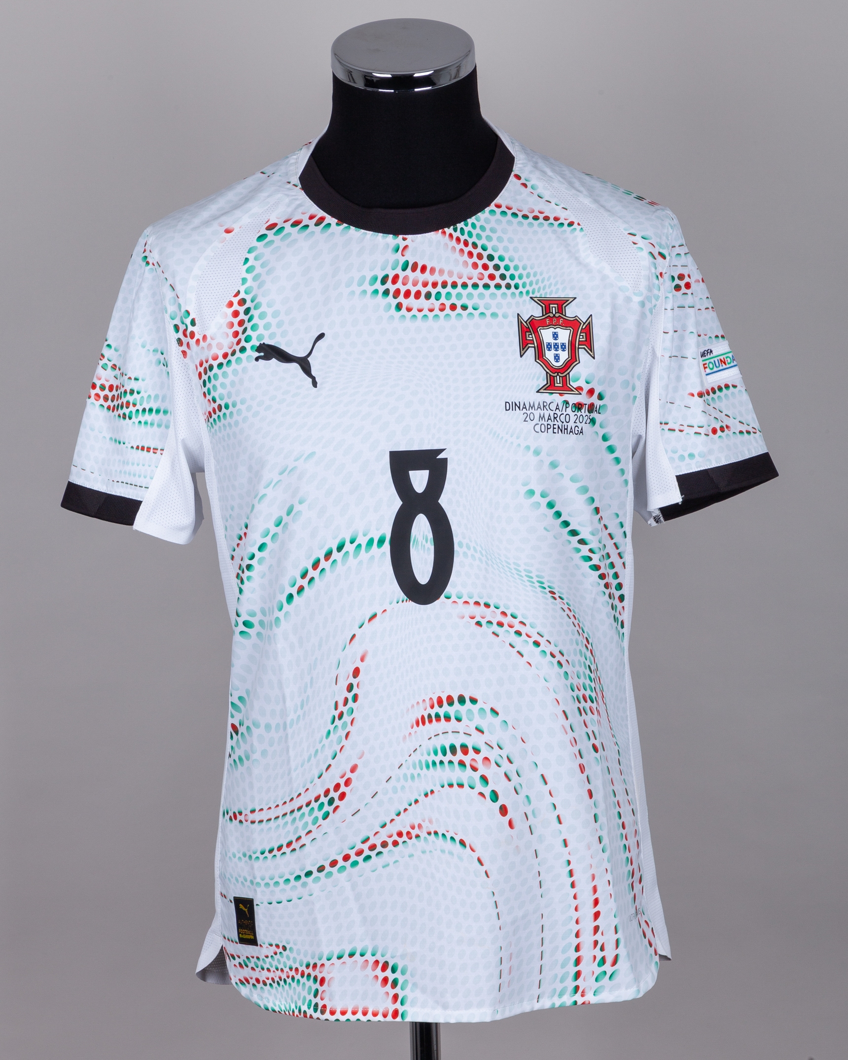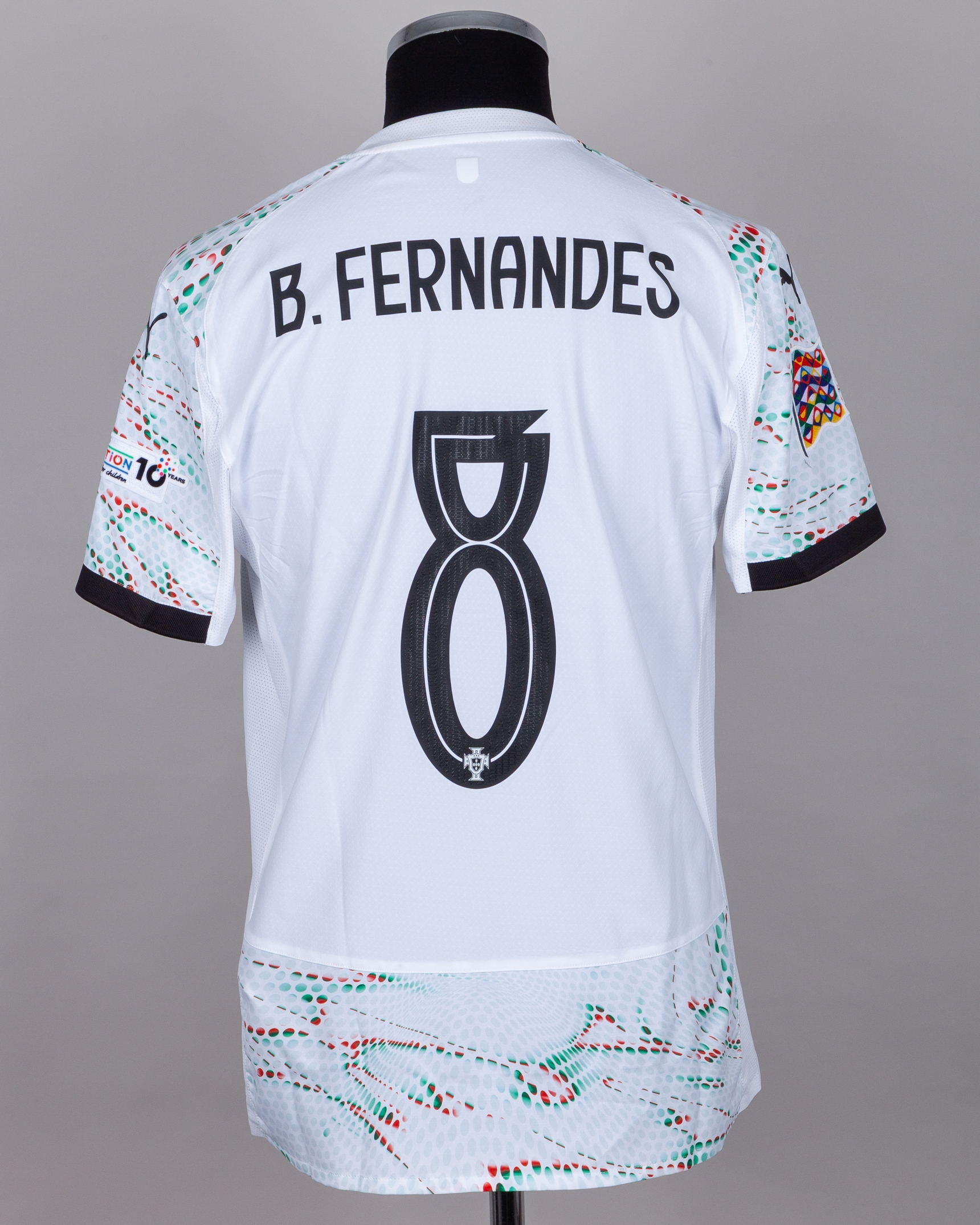 Bruno Fernandes white, green and red No.8 Portugal v. Denmark short-sleeved shirt, 2025, Puma, M, with crew-neck collar and printed badge, with DINAMARCA/PORTUGAL 20 MARCO 2025 COPENHAGA decal, the reverse lettered B. FERNANDES, the right sleeve with Nations League flash and the left with UEFA foundation 10 years flash