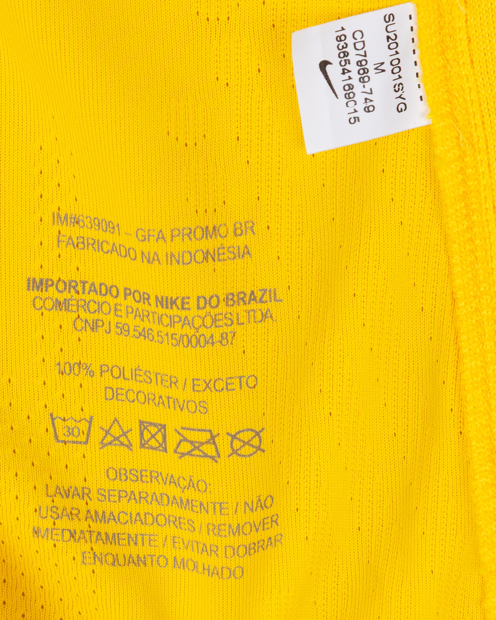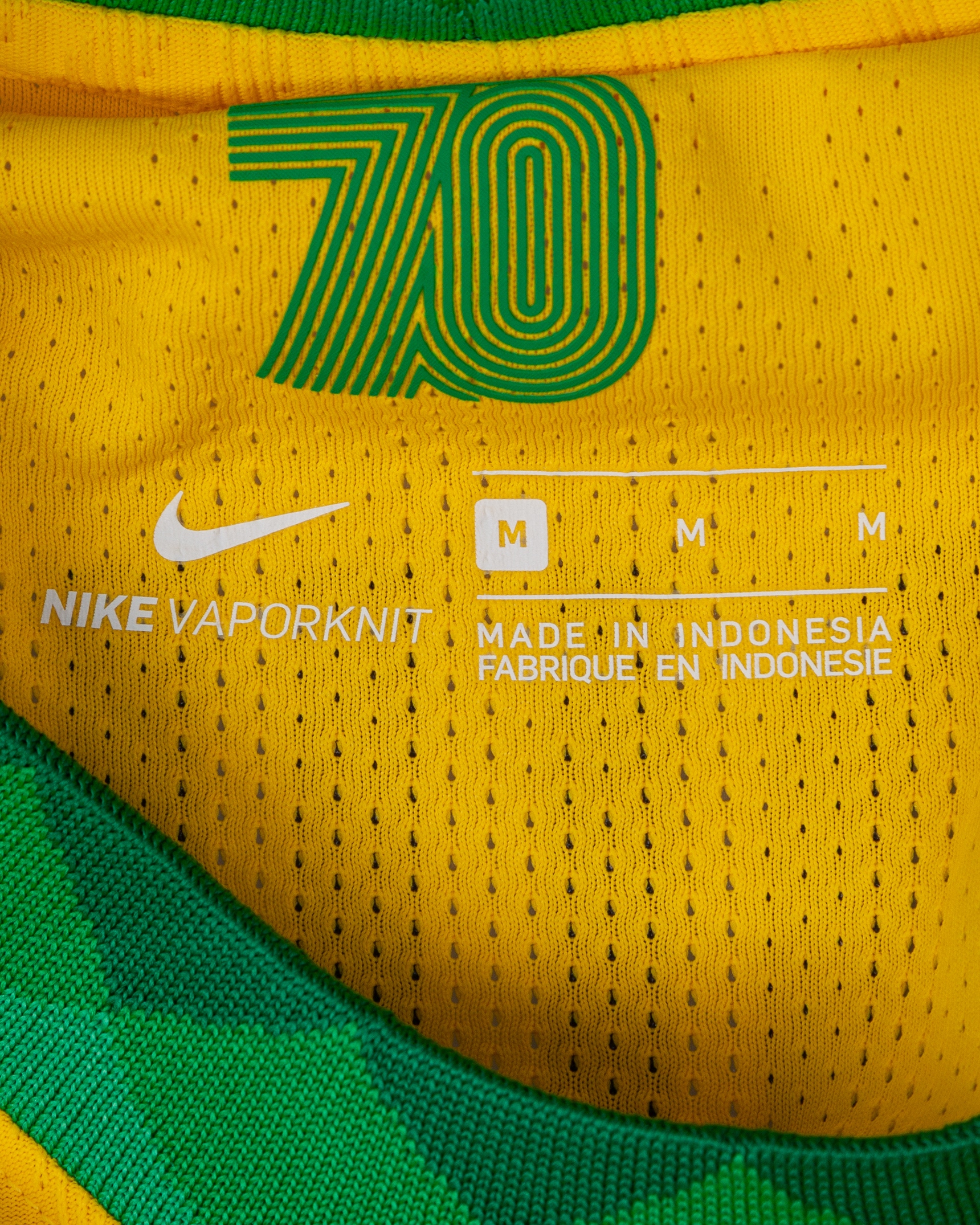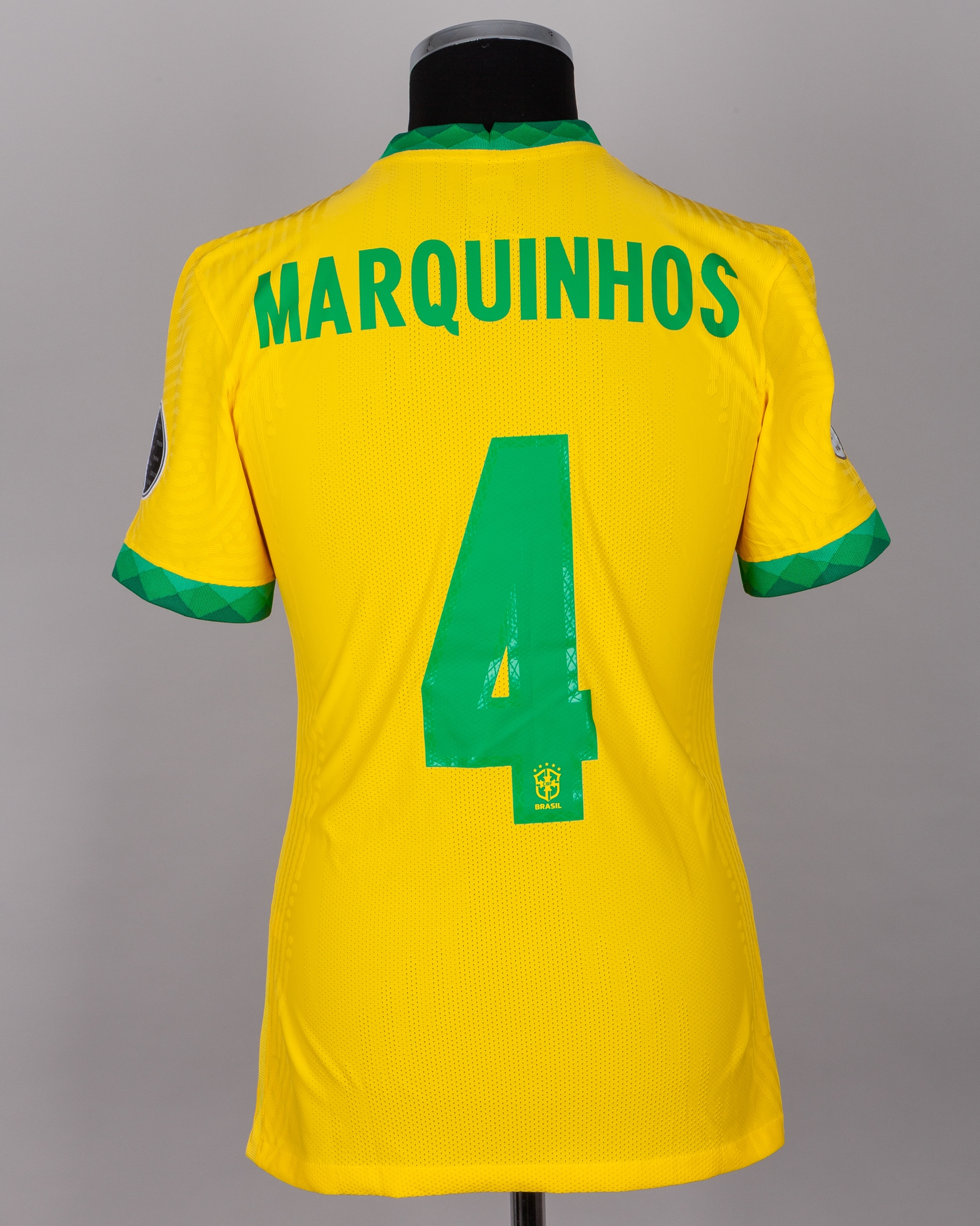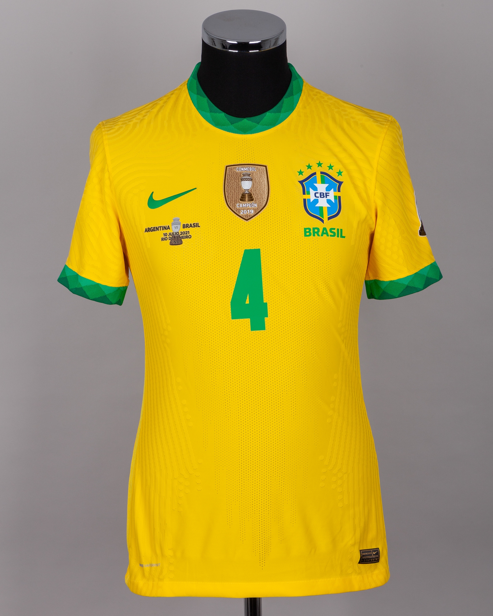 Marquinhos yellow and green No.4 Brazil v. Argentina Copa America Final short-sleeved shirt, 2021, Nike, M, with crew-neck collar and printed badge, with Conmebol Campeon 2019 badge, with ARGENTINA VS BRASIL 10 JULIO 2021 RIO DE JANEIRO FINAL BRASIL decal, the reverse lettered MARQUINHOS, the right sleeve with Copa America 2021 Final flash and the left sleeve with nine times champions flash