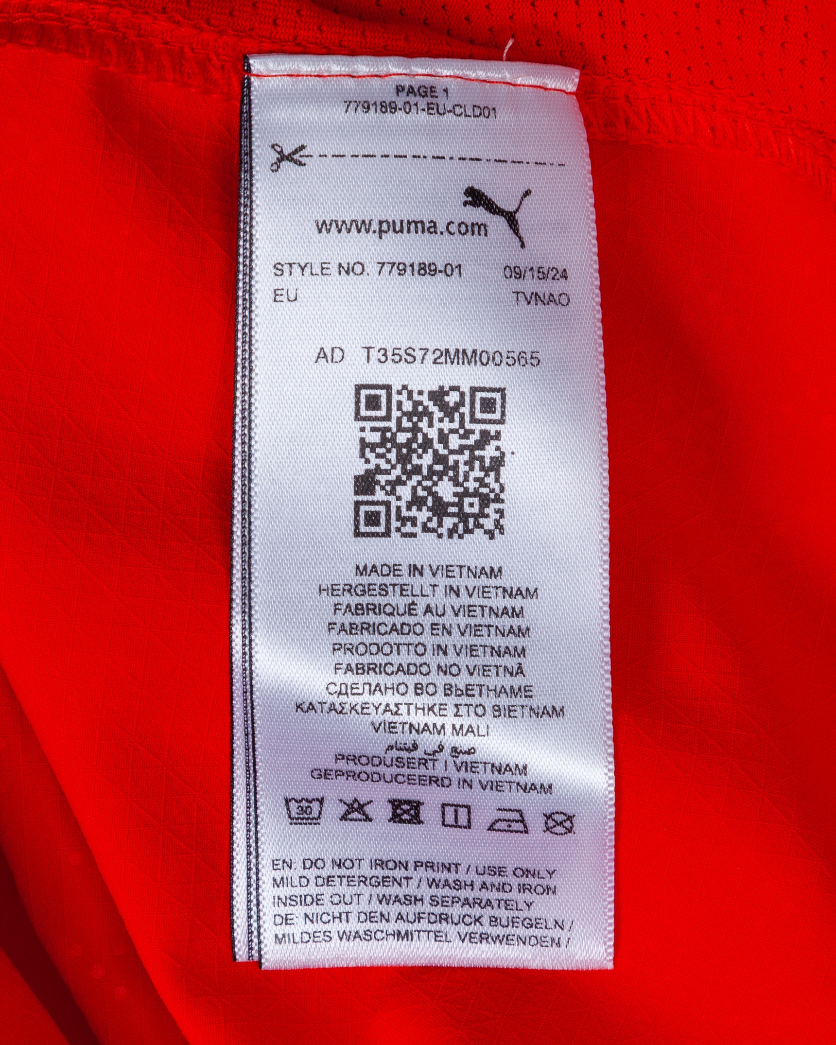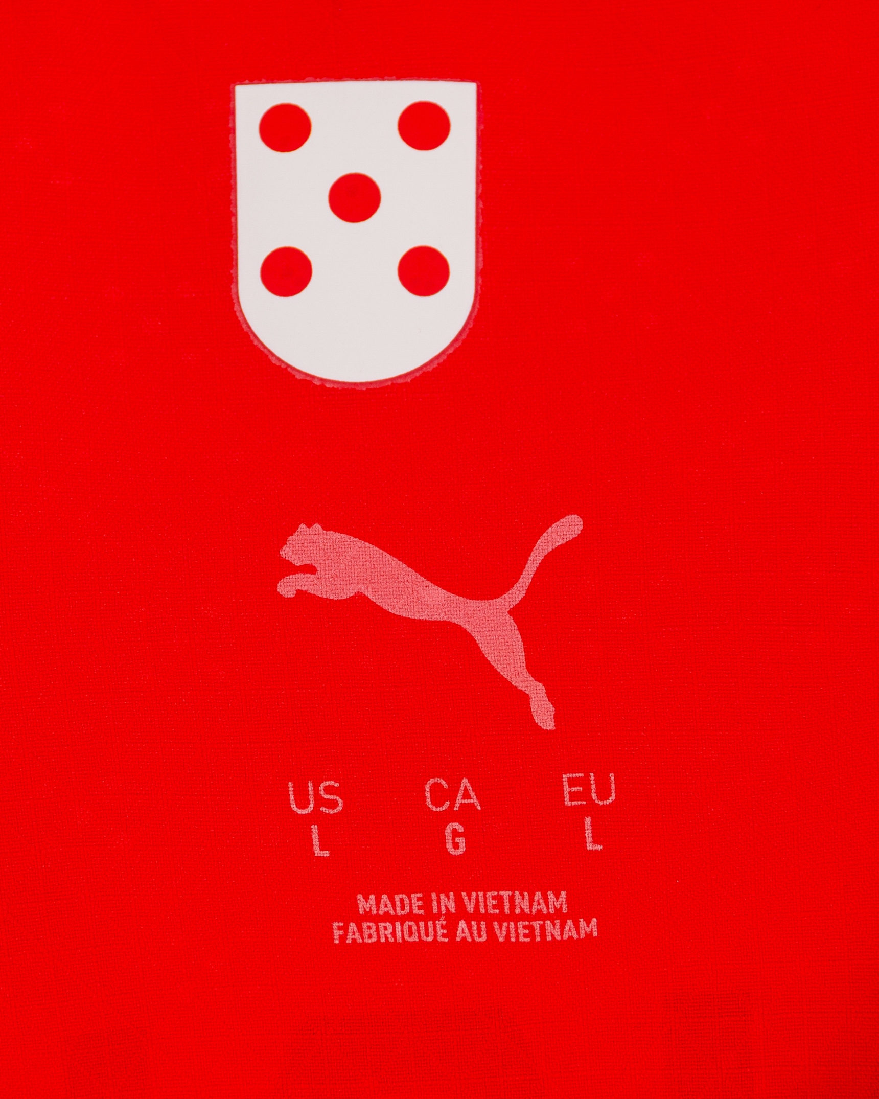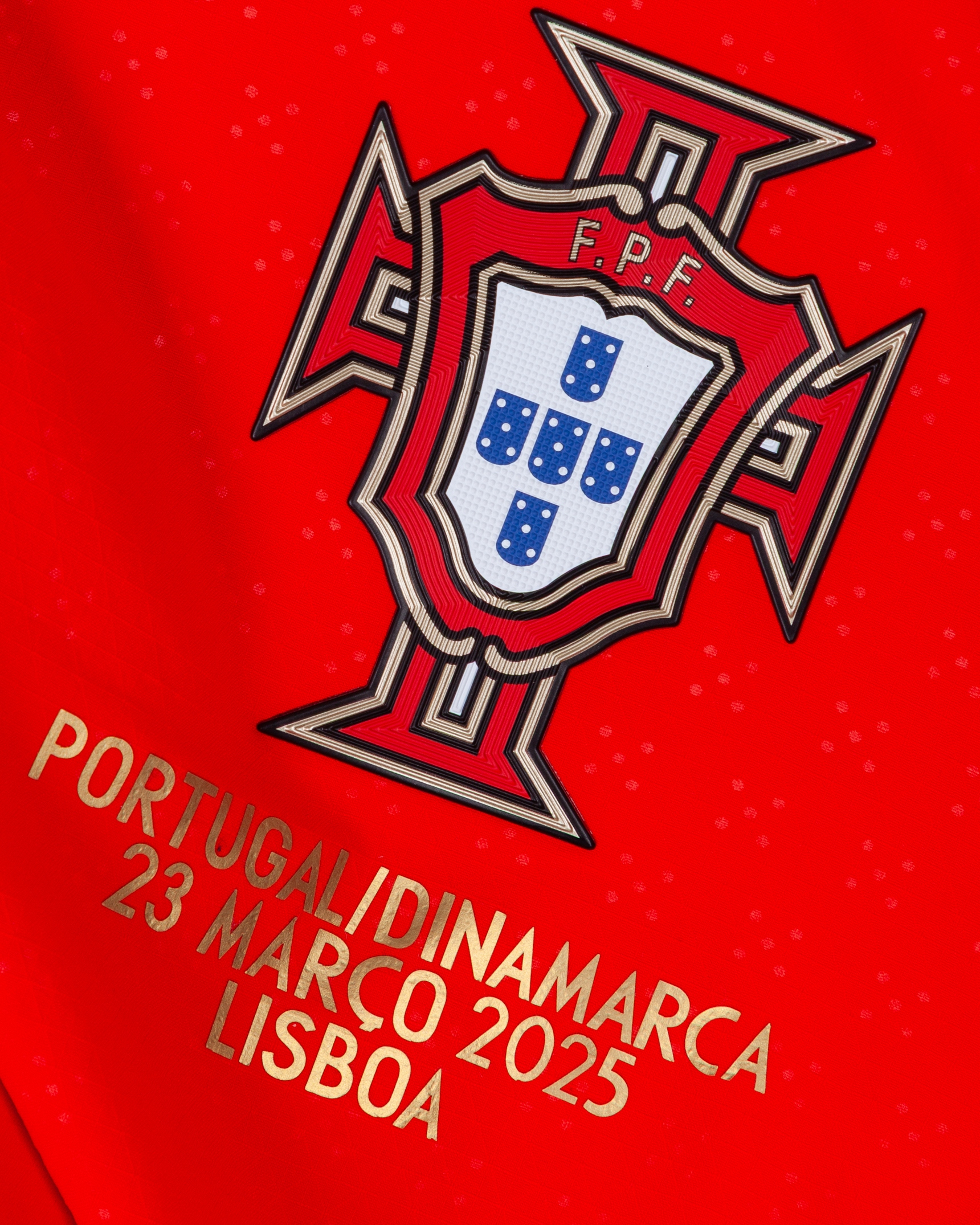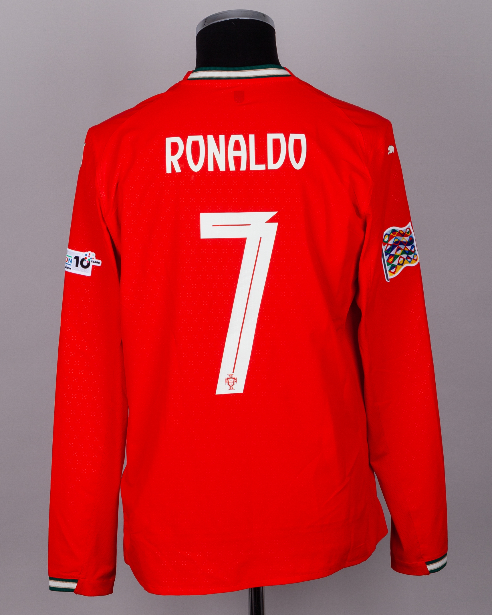 Cristiano Ronaldo red No.7 Portugal v. Denmark long-sleeved shirt, 2025, Puma, L, with crew-neck collar and printed badge, with PORTUGAL/DINAMARCA 23 MARCO 2025 LISBOA decal, the reverse lettered RONALDO, the right sleeve with Nations League flash and the left with UEFA foundation 10 years flash