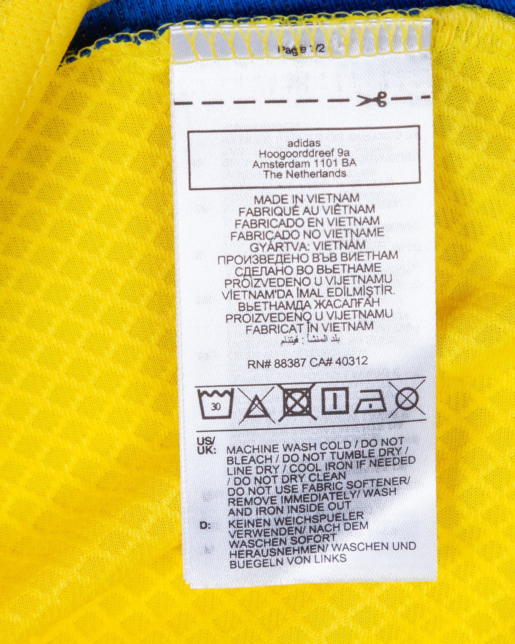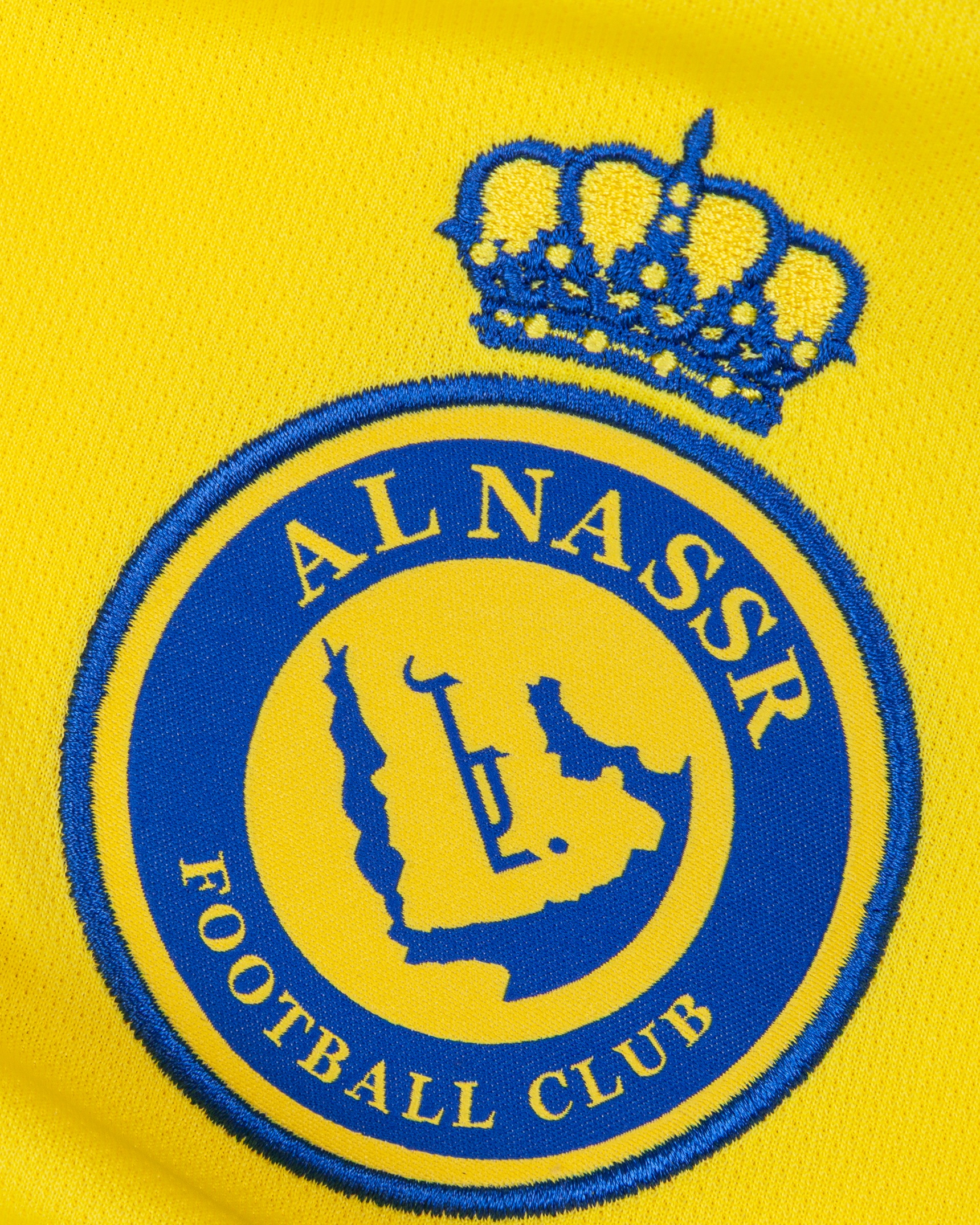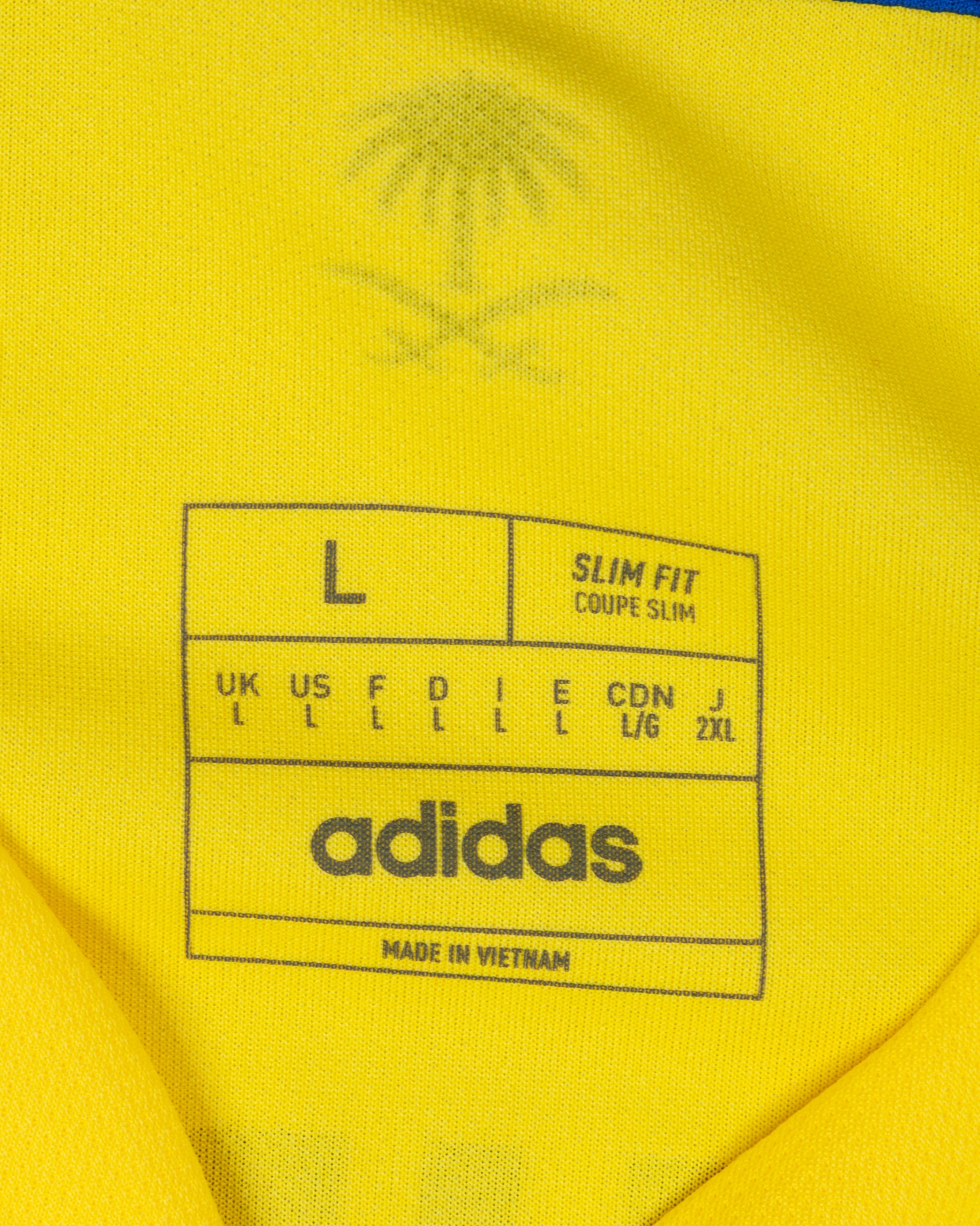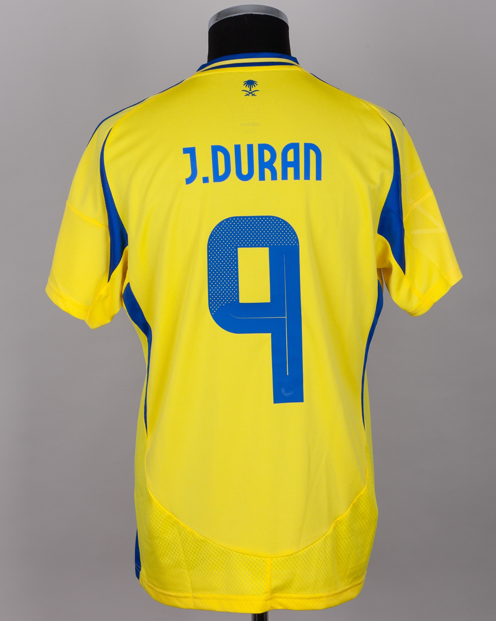 Jhon Duran yellow and blue No.9 Al Nassr short-sleeved shirt, 2024-25, Adidas, L, with v-neck collar and embroidered cloth badge inscribed AL NASSR FOOTBALL CLUB, the reverse lettered J. DURAN, the right sleeve with AFC Champions League flash