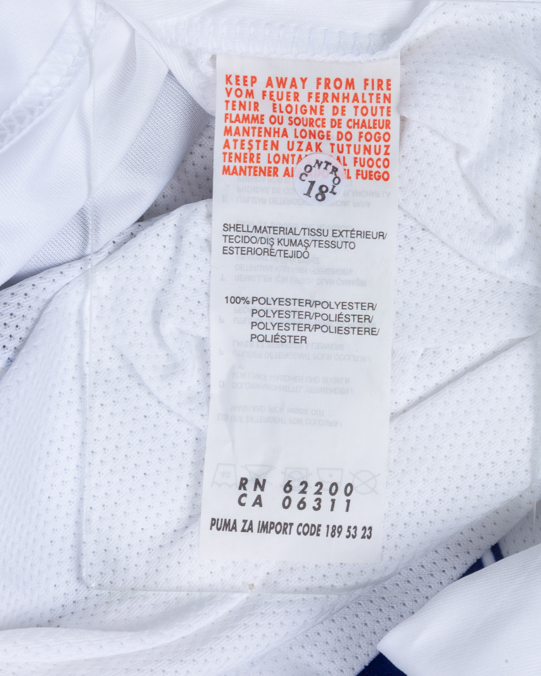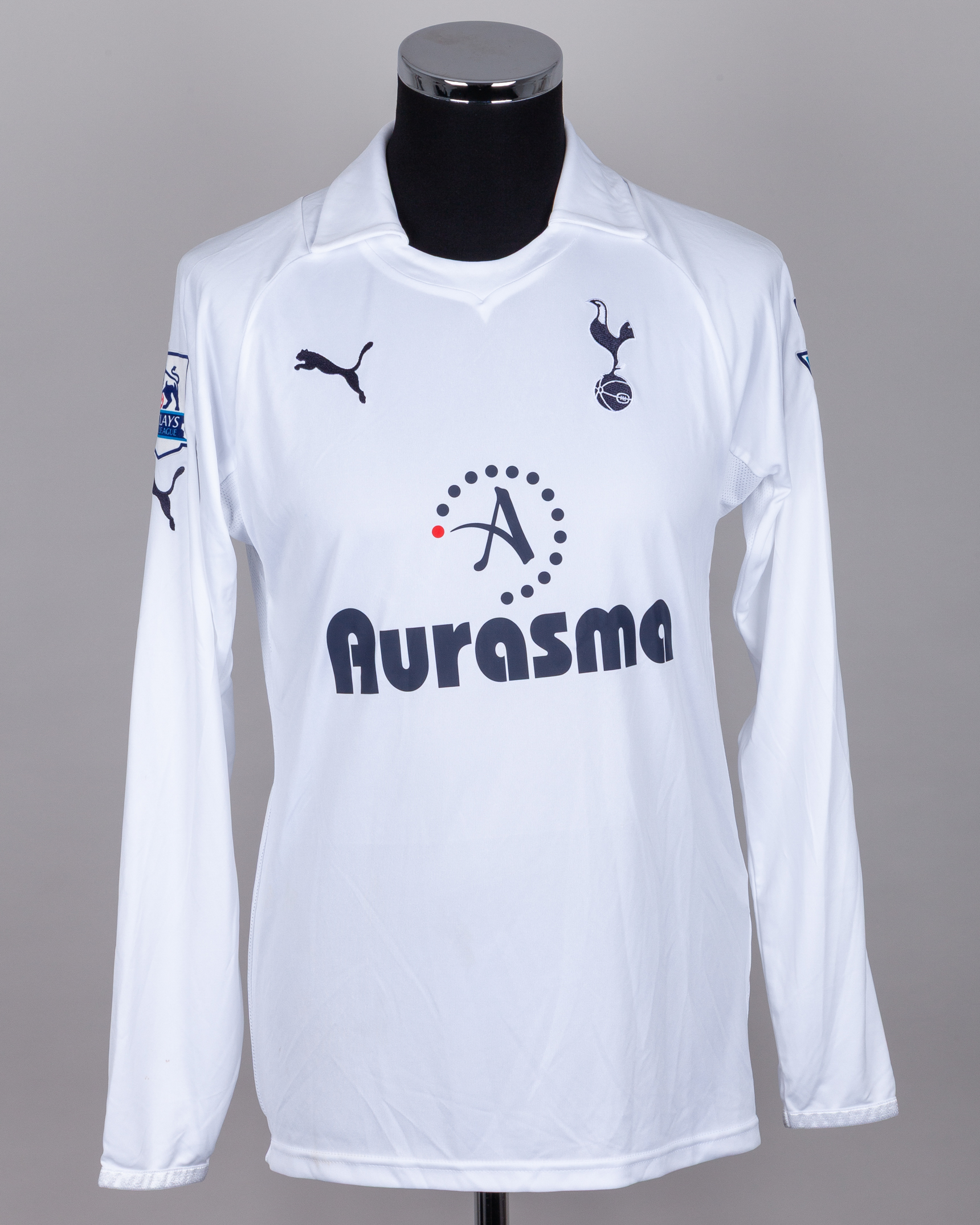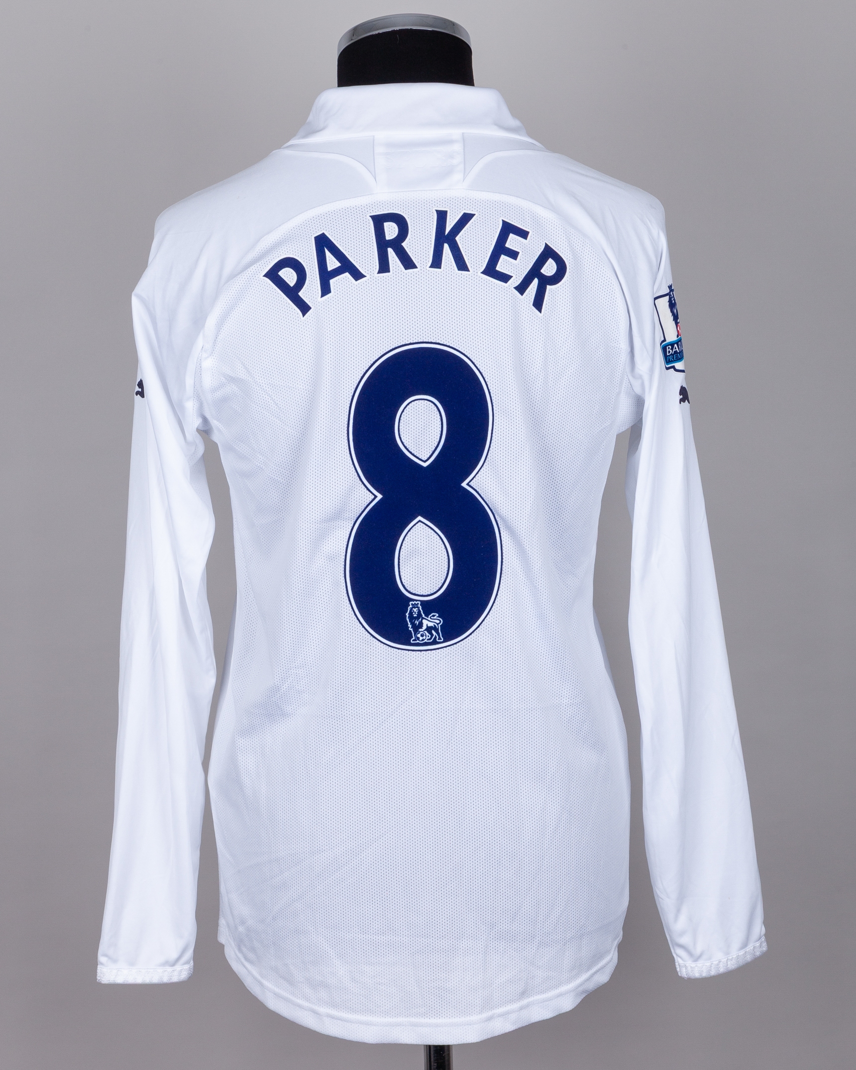 Scott Parker white and blue No.8 Tottenham Hotspur long-sleeved shirt, 2011-12, Puma, M, with crew-neck collar and embroidered cloth badge, the reverse lettered PARKER, the sleeves with Barclays Premier League flashes