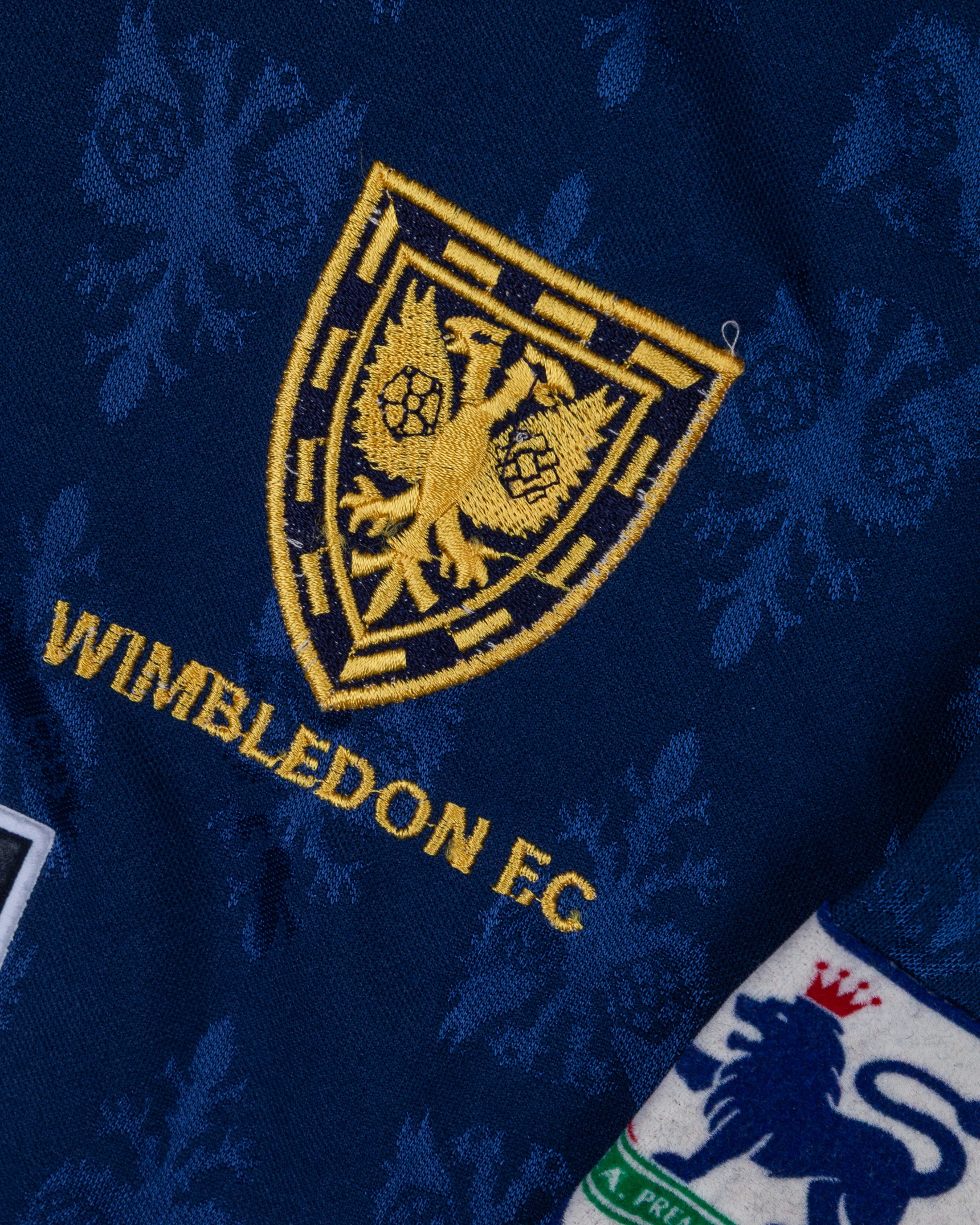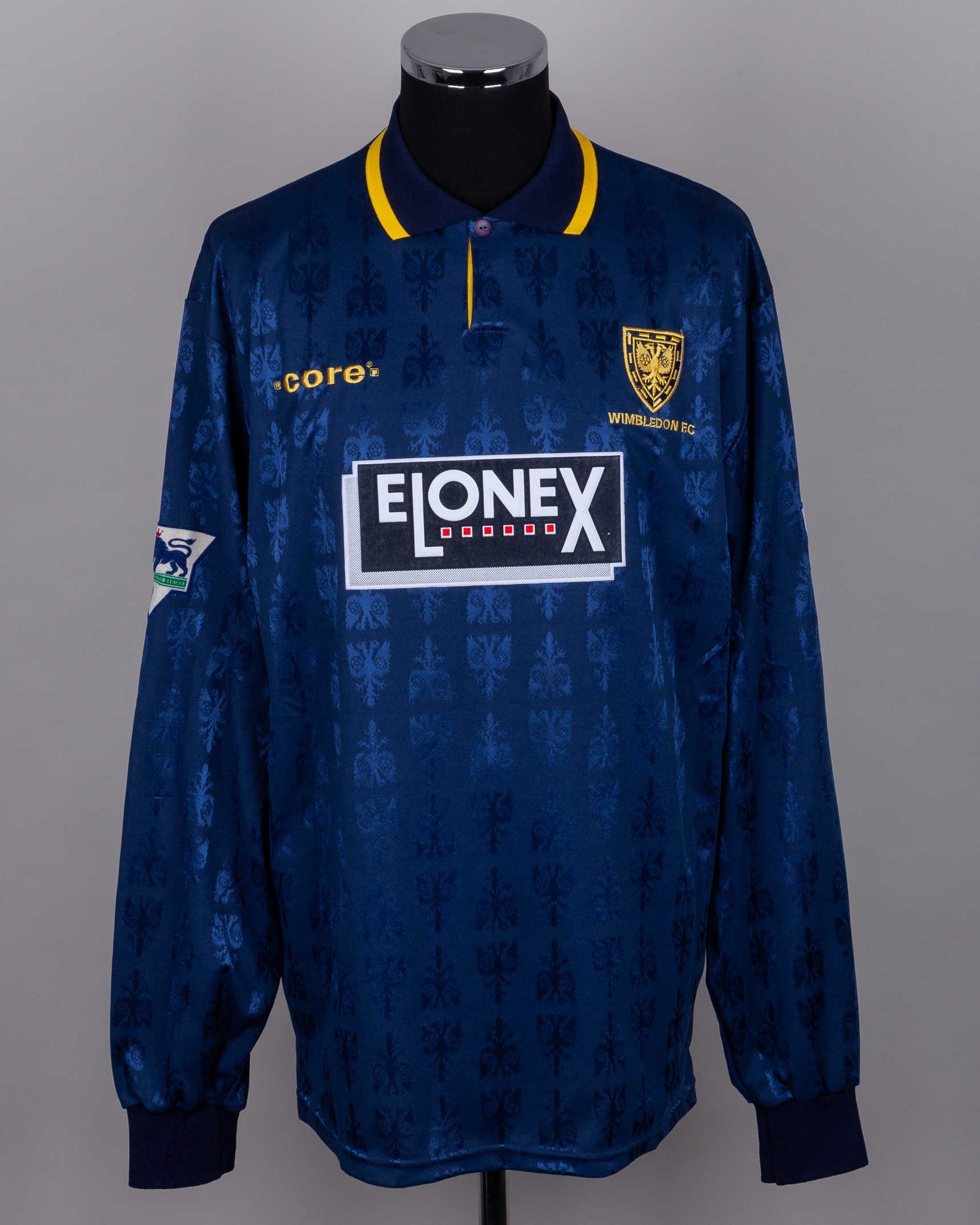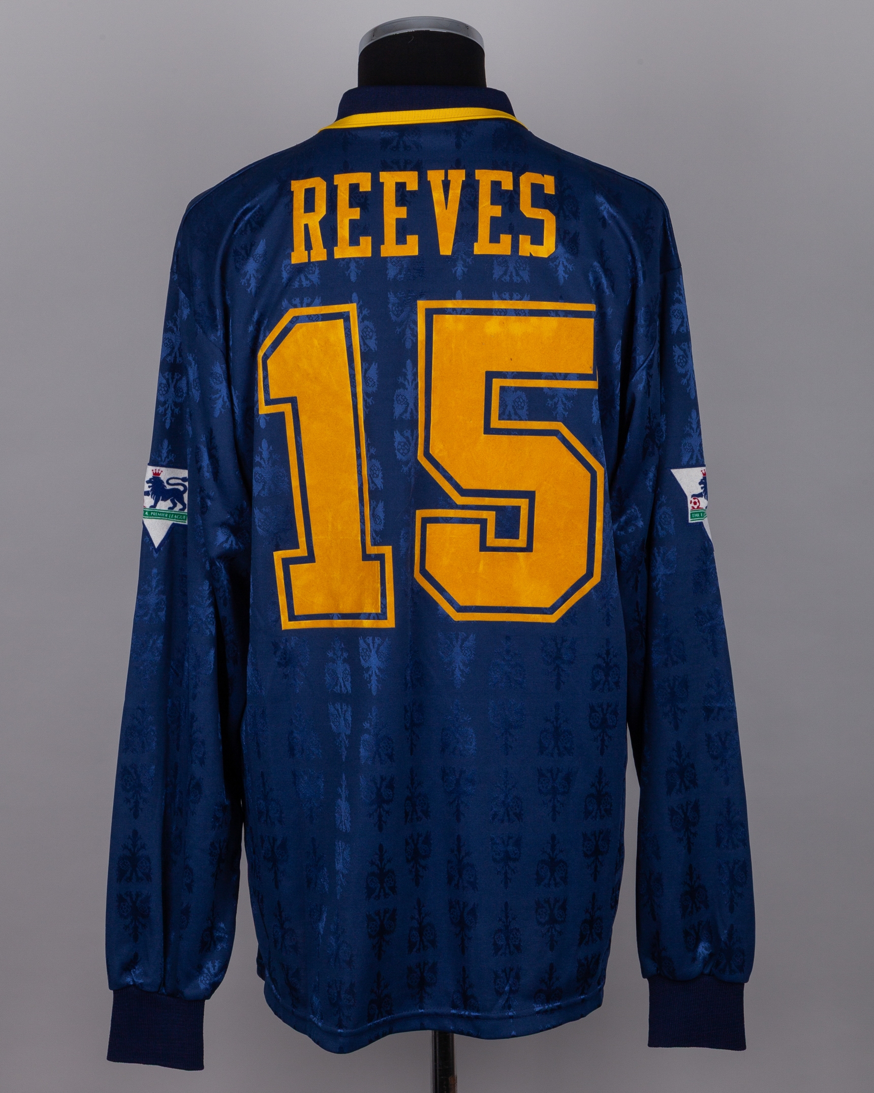 Alan Reeves blue and yellow No.15 Wimbledon long-sleeved shirt, 1994-95, Core, XL, with button-up collar and embroidered badge inscribed WIMBLEDON F.C., the reverse lettered REEVES, the sleeves with The F.A.Premier League flashes
