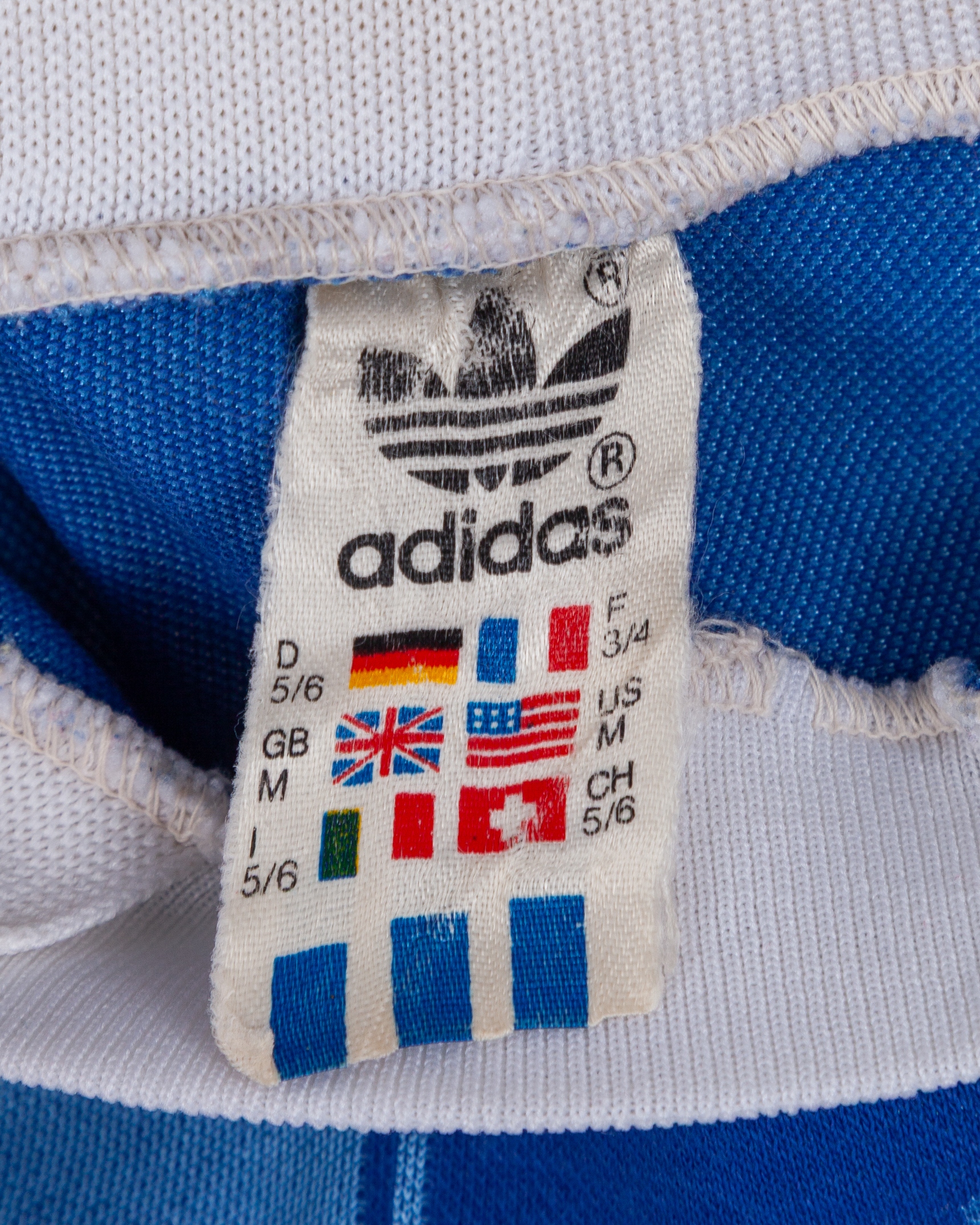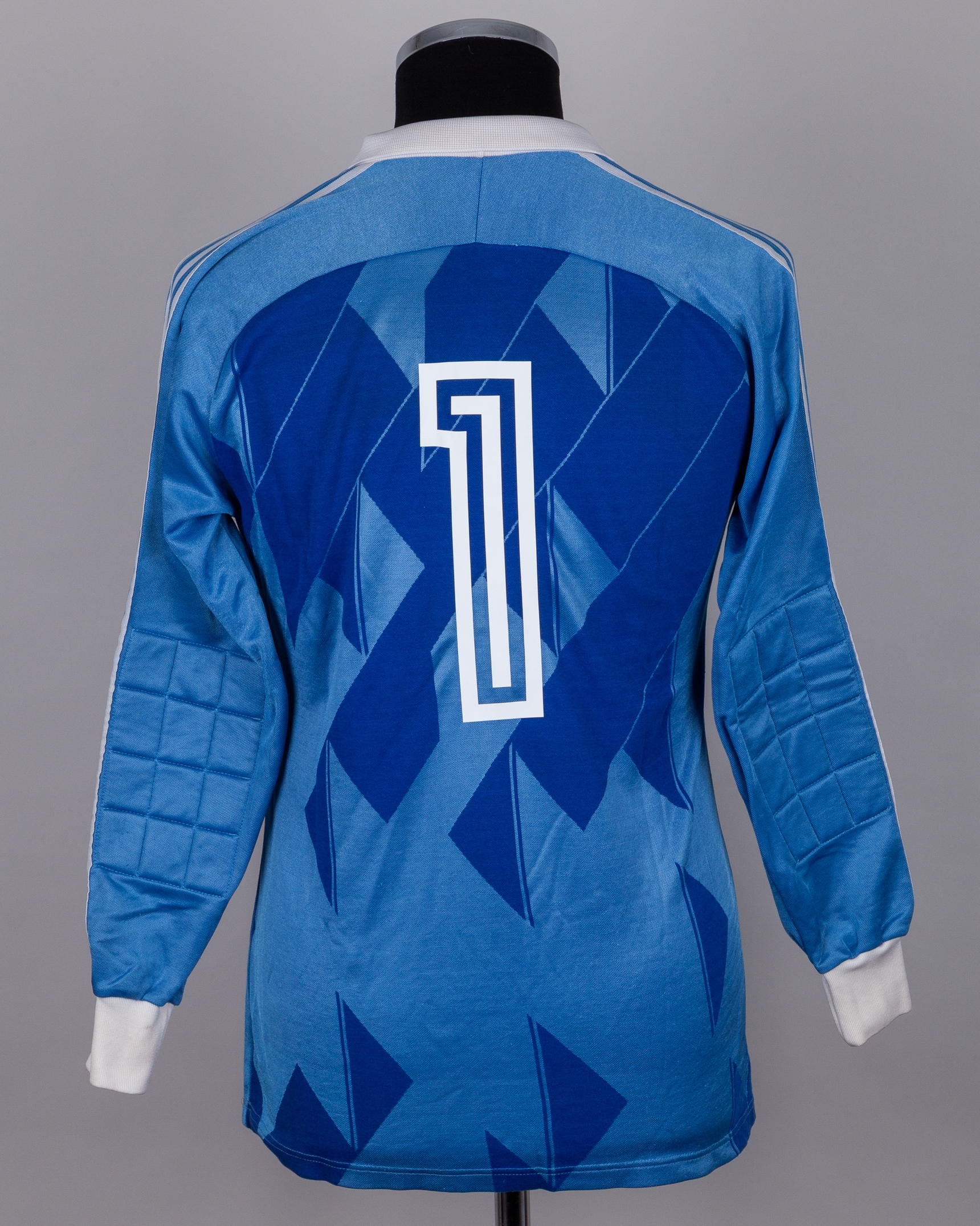 Rinat Dasayev blue and white No.1 USSR goalkeepers shirt, c.1988, Adidas, M, with crew-neck collar and embroidered cloth badge