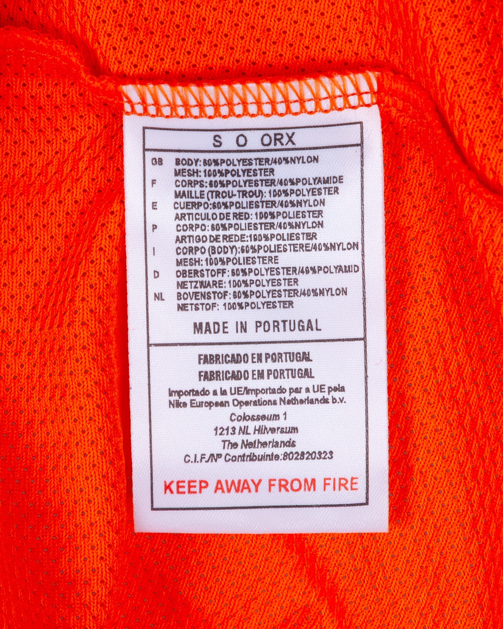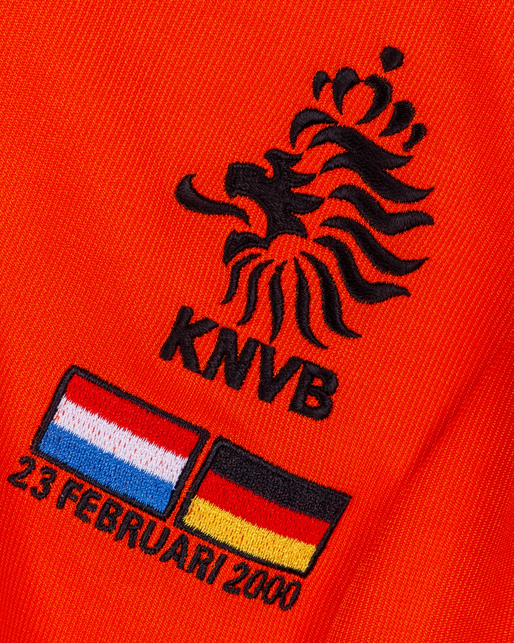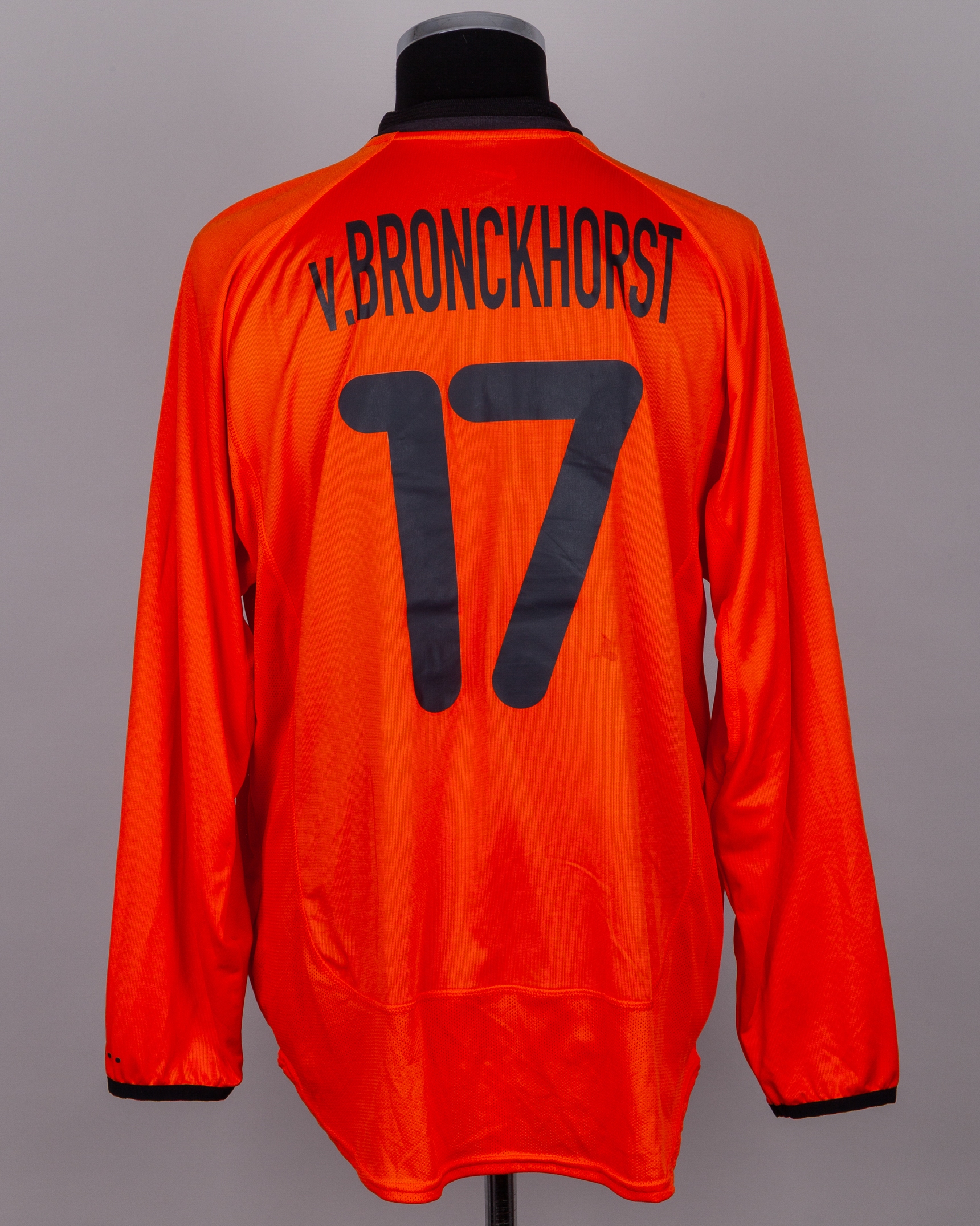Giovanni Van Bronckhorst orange and black No.17 Holland v. Germany long-sleeved shirt, 2000, Nike, XL, with v-neck collar and embroidered cloth badge inscribed KNVB and embroidered flag of nations and inscribed 23 FEBRUARI 2000, the reverse lettered v.BRONCKHORST