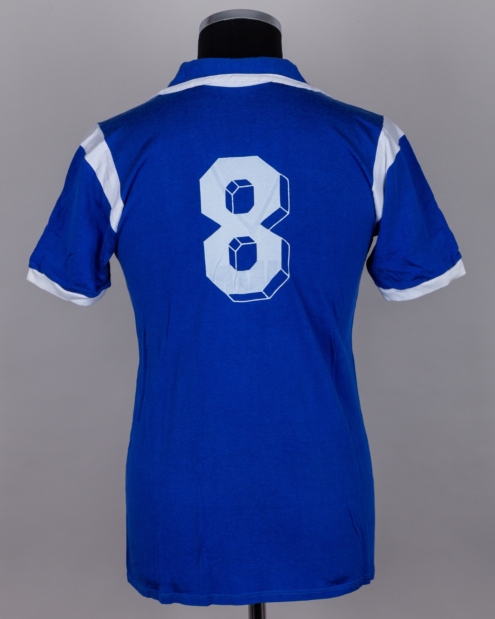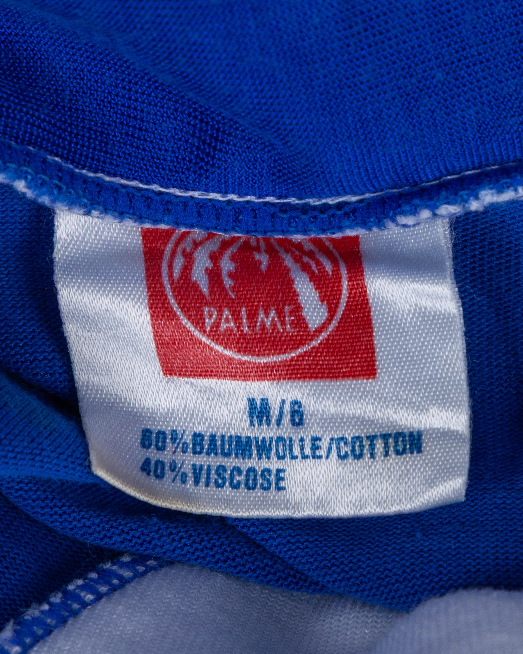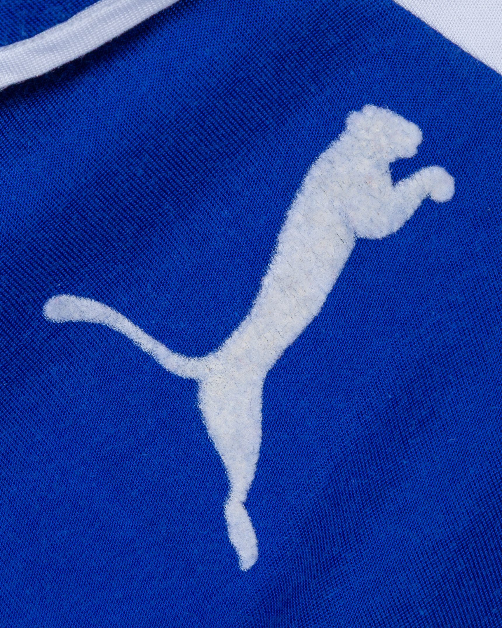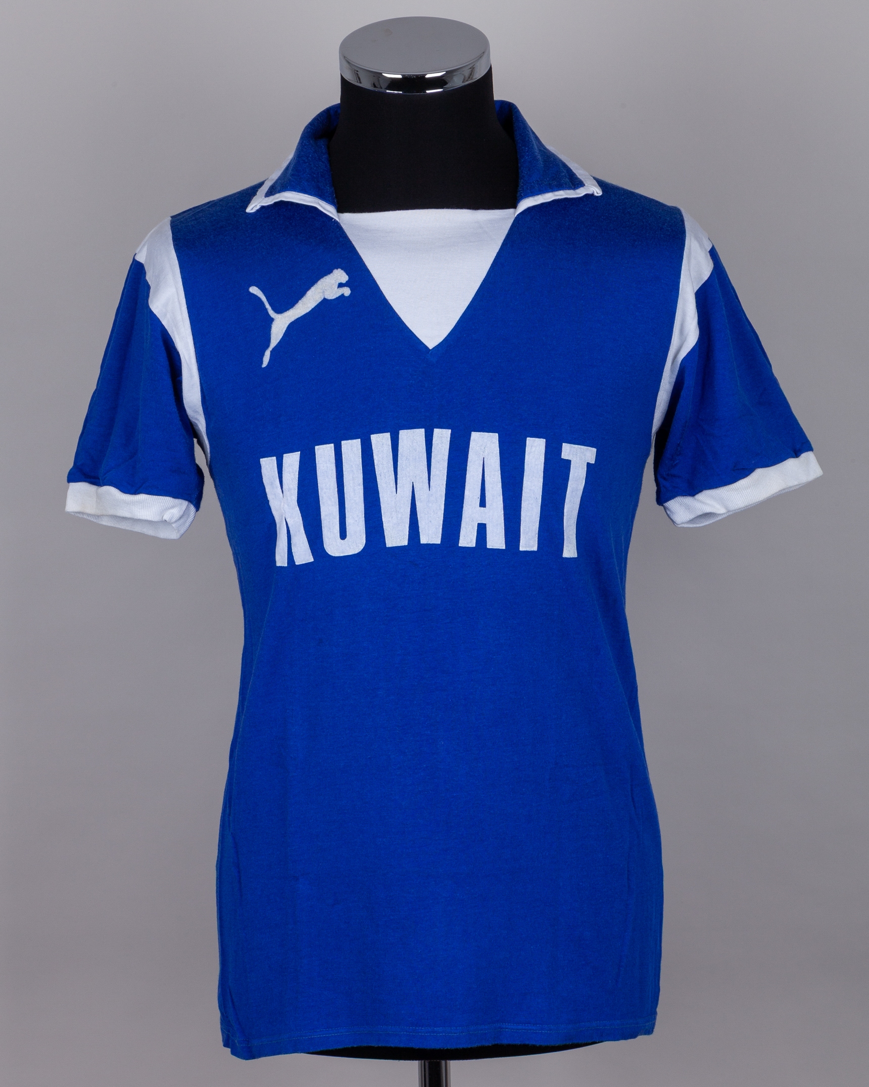 Blue No.8 Kuwait short-sleeved shirt, c.1985, Puma, M, with v-neck style colla and felt badge