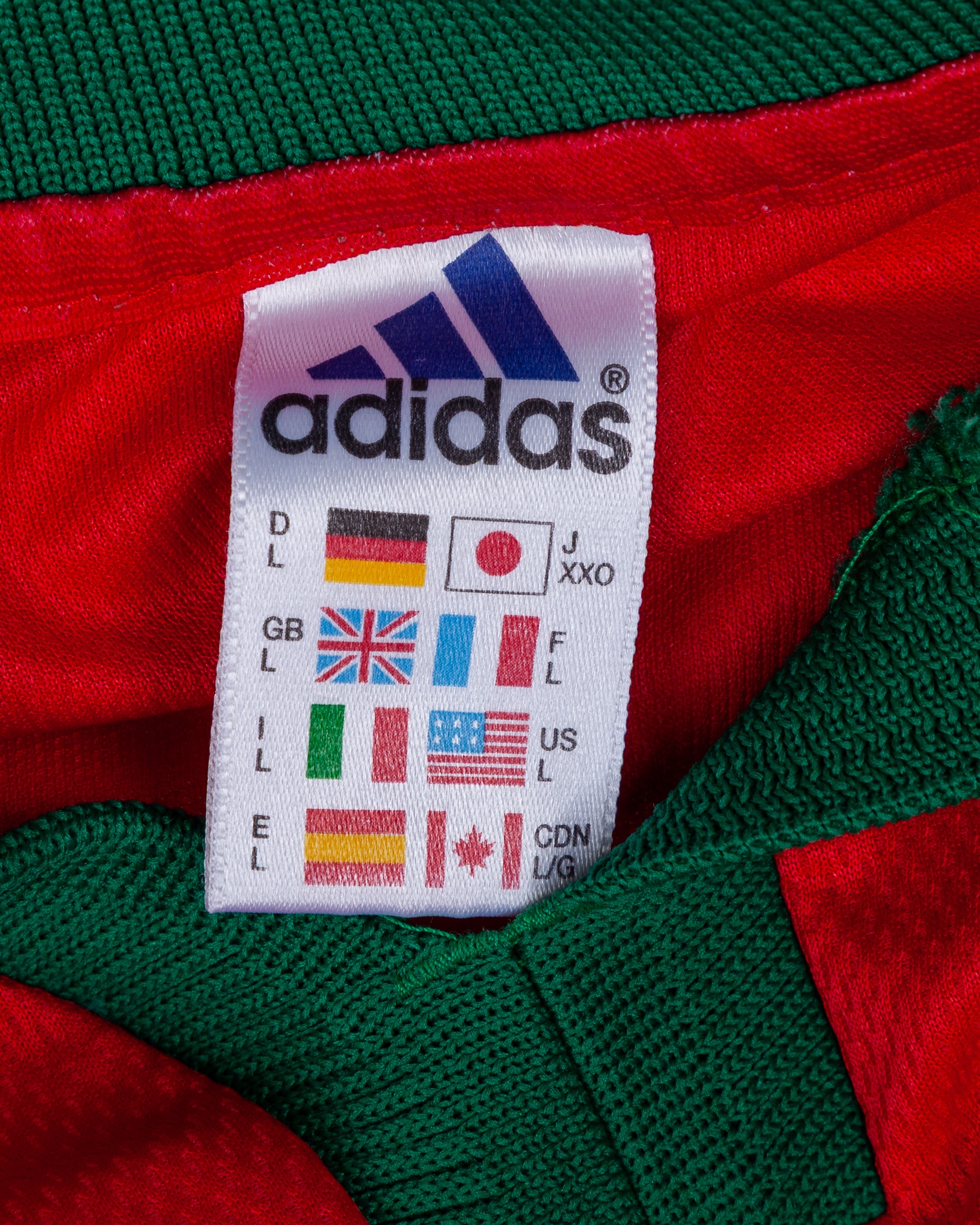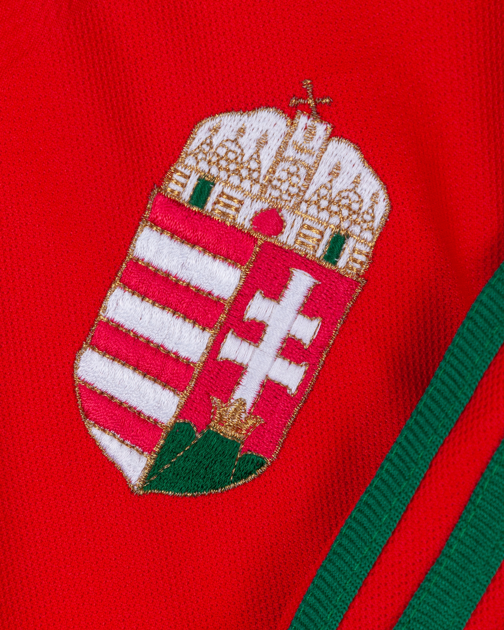 Red, white and green No.16 Hungary short-sleeved shirt, c.2000, Adidas, L, with v-neck collar and embroidered badge
