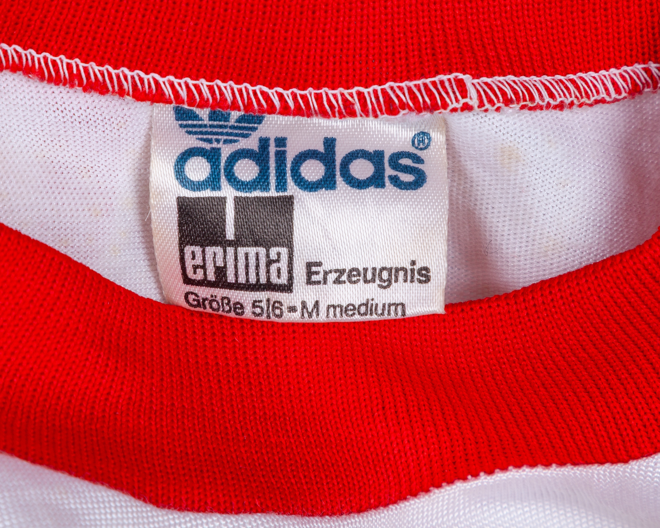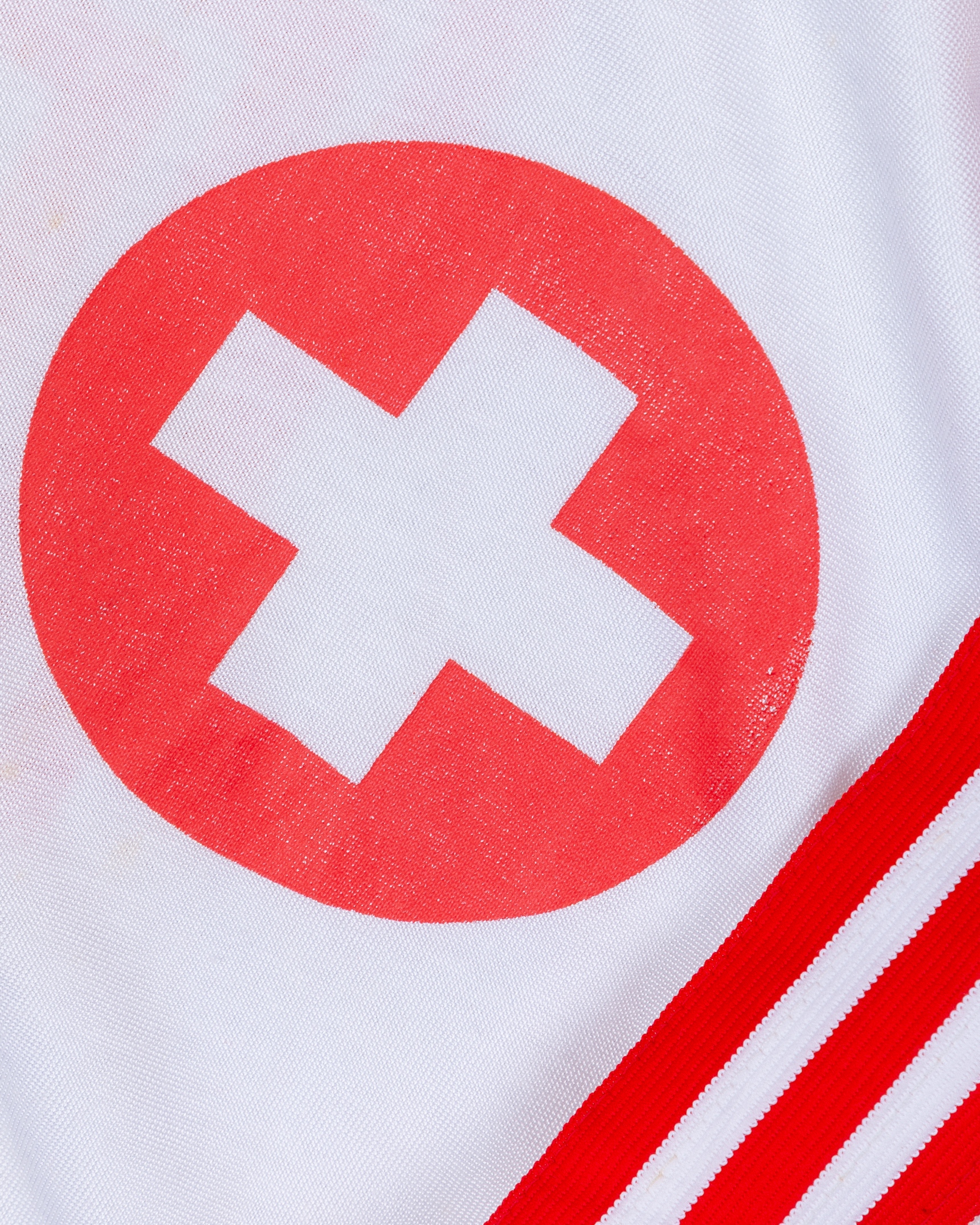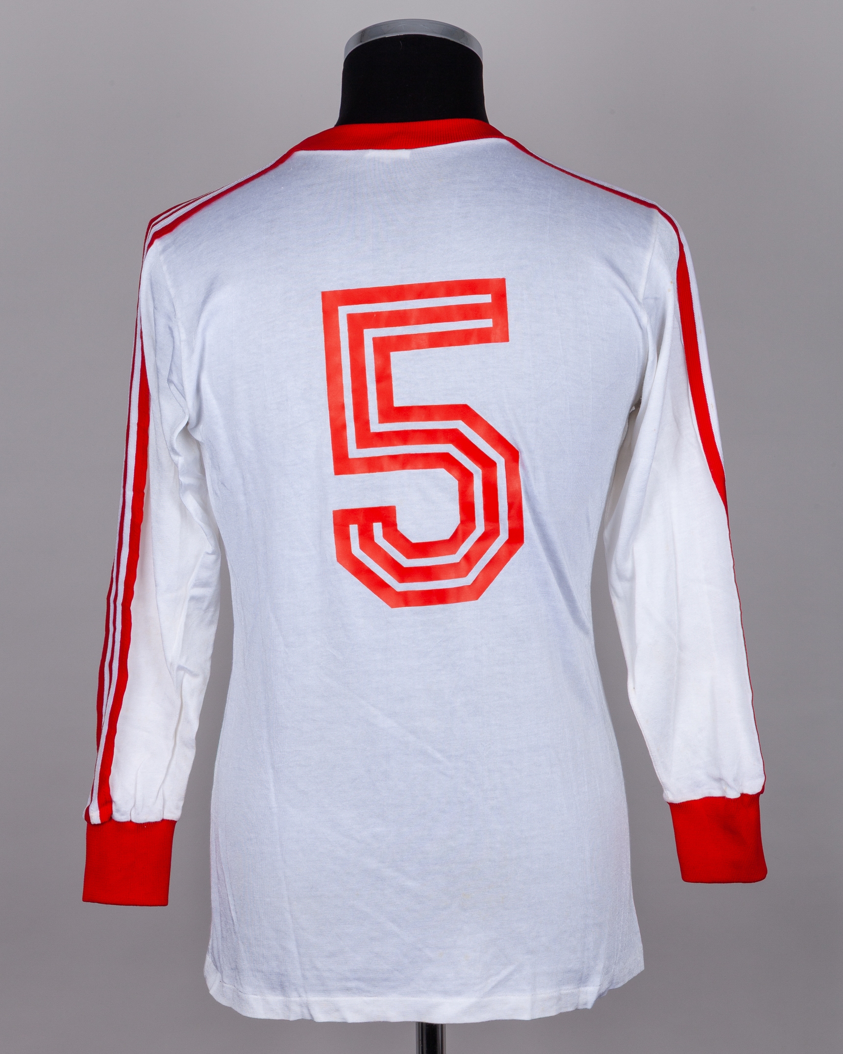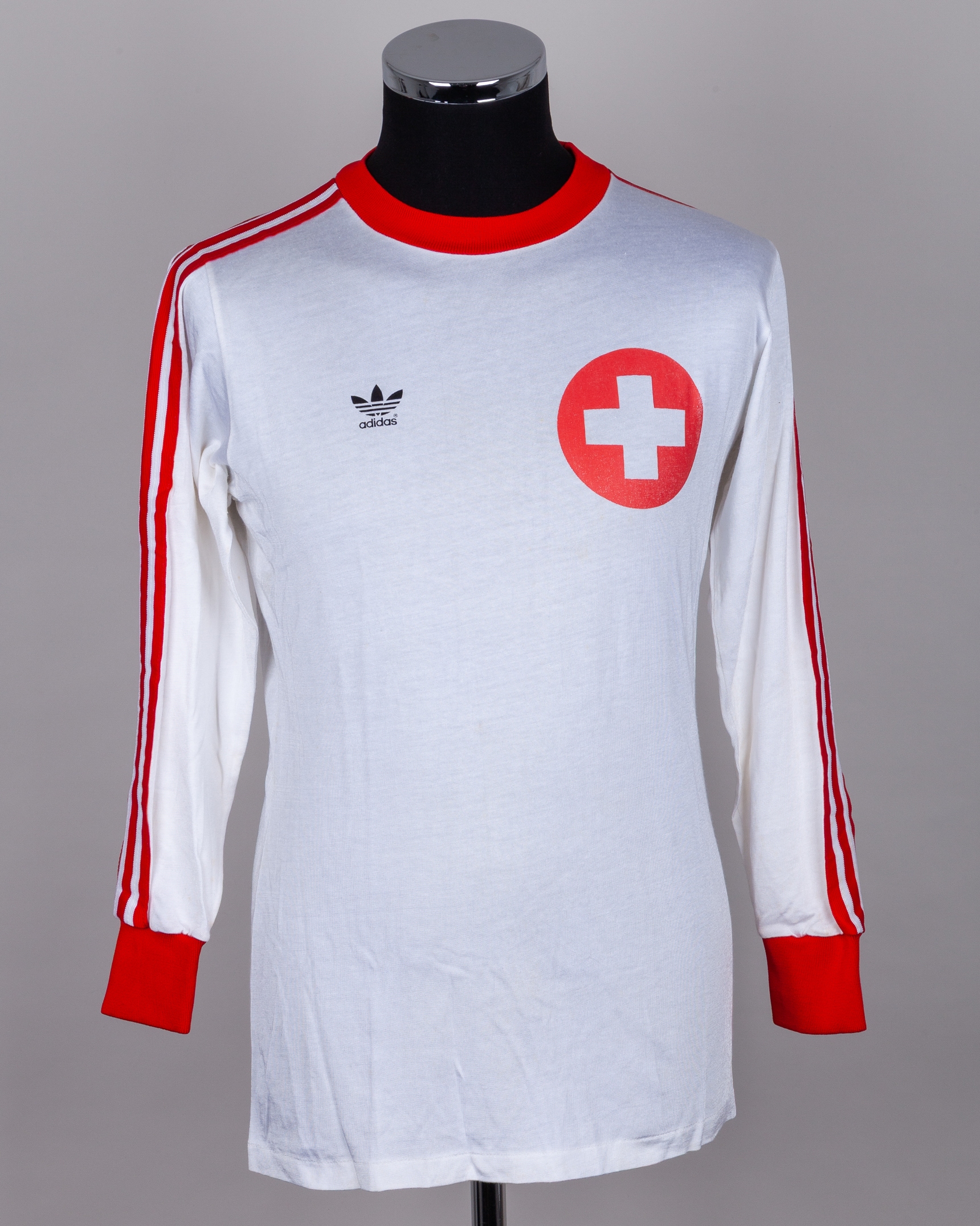 Gilbert Guyot white and red No.5 Switzerland v. Scotland long-sleeved shirt, 1976, Adidas, Medium, with crew-neck collar and printed badge, staining