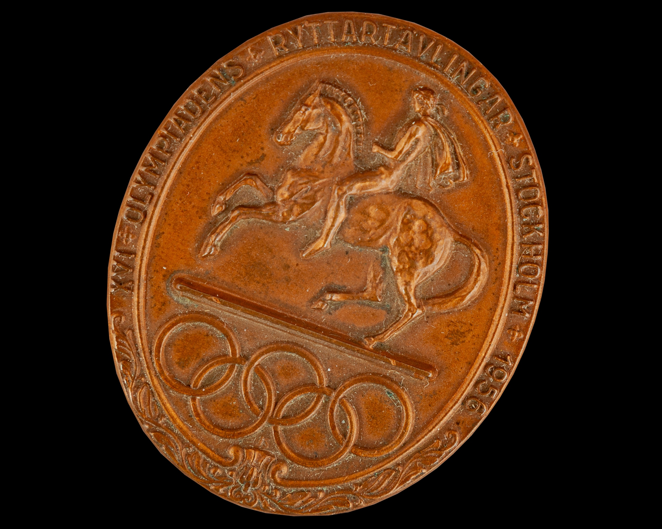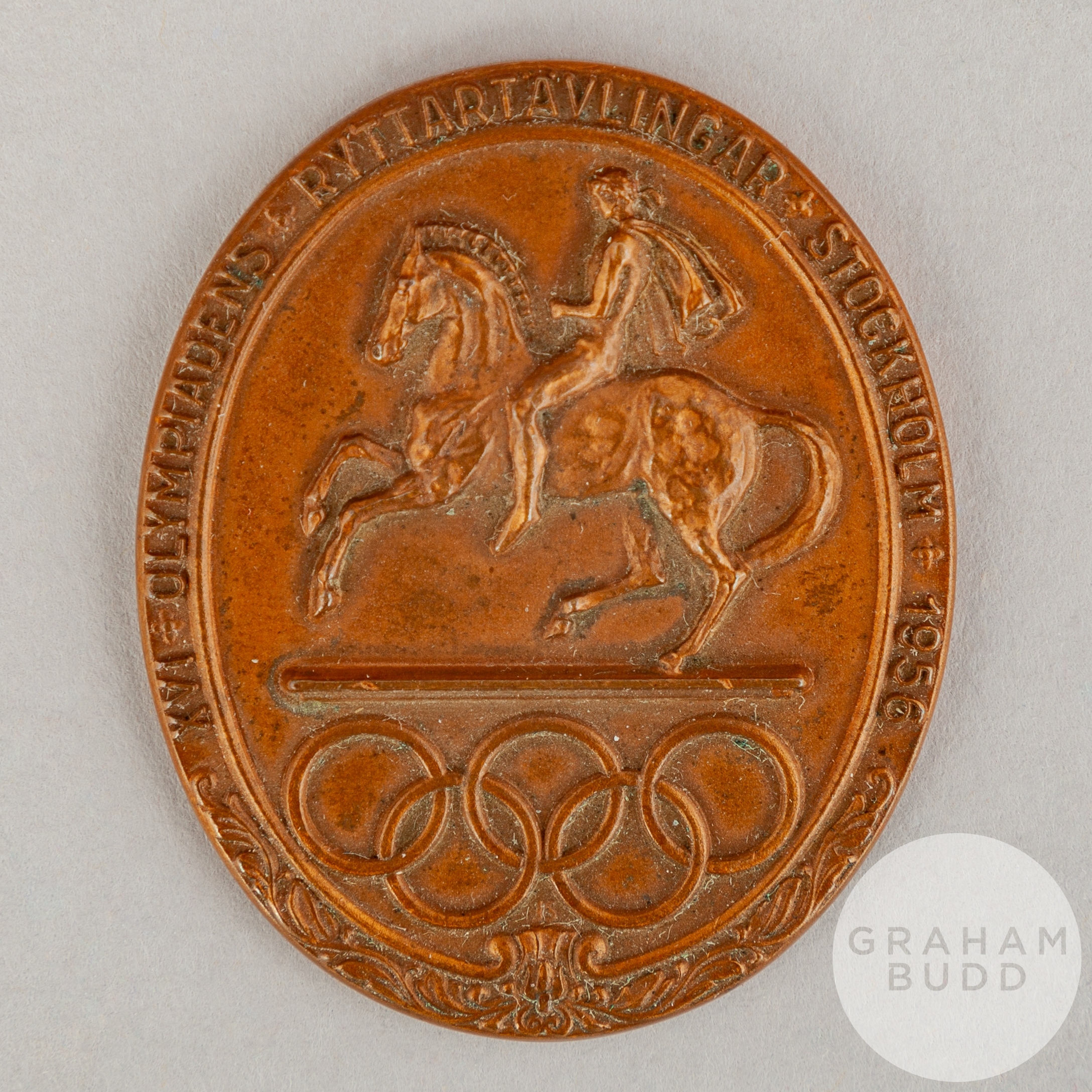 1956 Melbourne Olympic Games extremely rare participation medal designed by J. Sjoesvaerd for the equestrian sports held at Stockholm due to Australian quarantine regulations, the obverse depicting classical horseman above Olympic Rings, the official emblem of the Equestrian games
