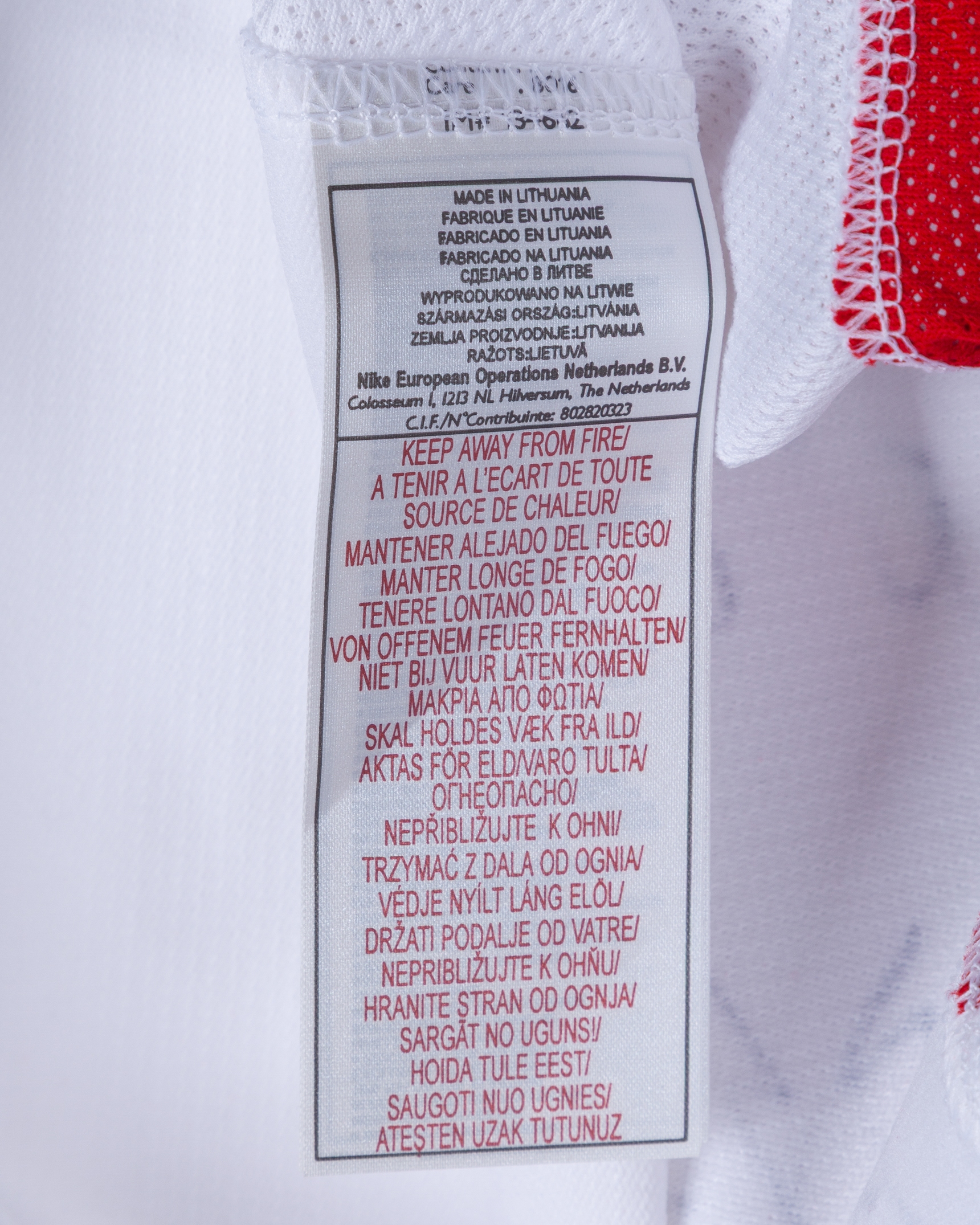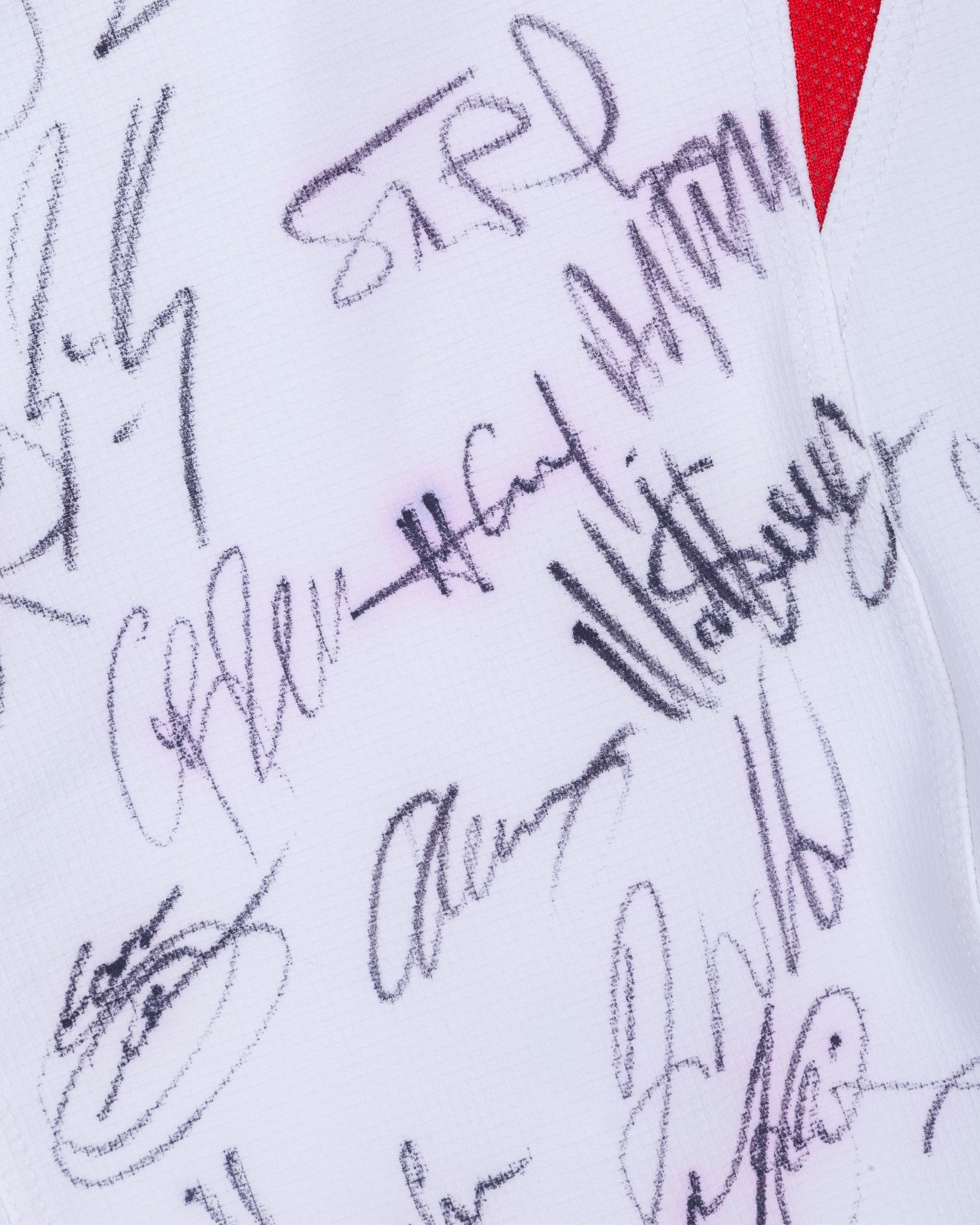 White and red England RFU autographed replica short-sleeved shirt, 2005-06, Nike, L, with crew-neck collar and printed felt badge, with twenty-seven autographs, with COA, with discolouration