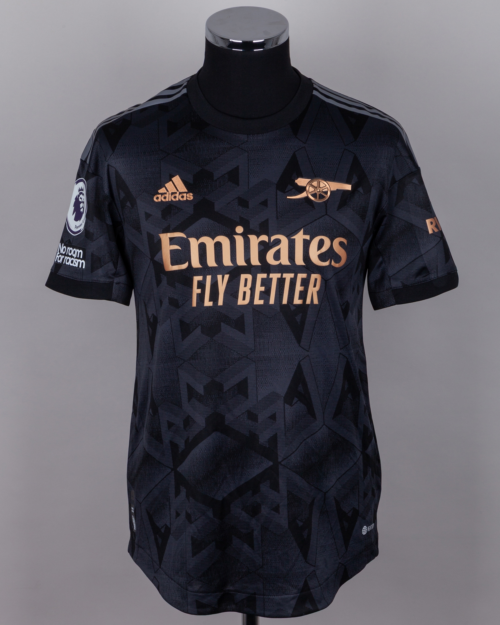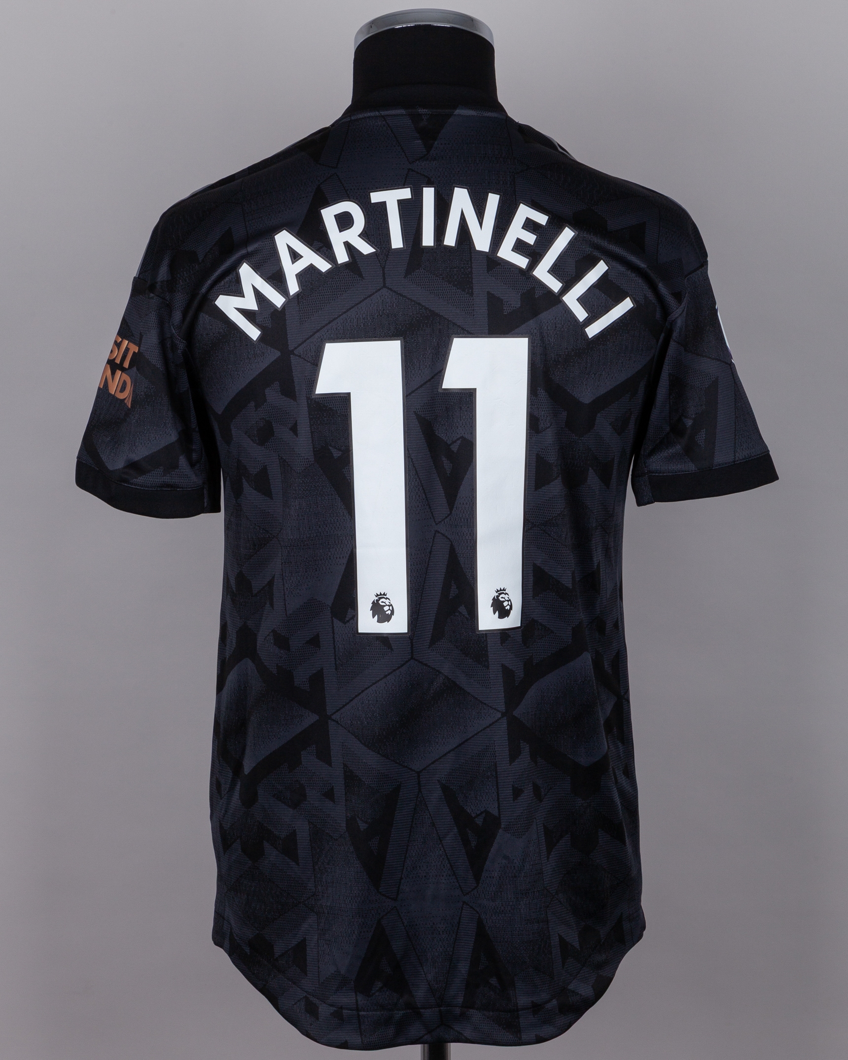 Gabriel Martinelli black No.11Arsenal short-sleeved shirt, 2022-23, Adidas, M, with crew-neck collar and printed badge, the reverse lettered MARTINELLI, the right sleeve with premier League flash