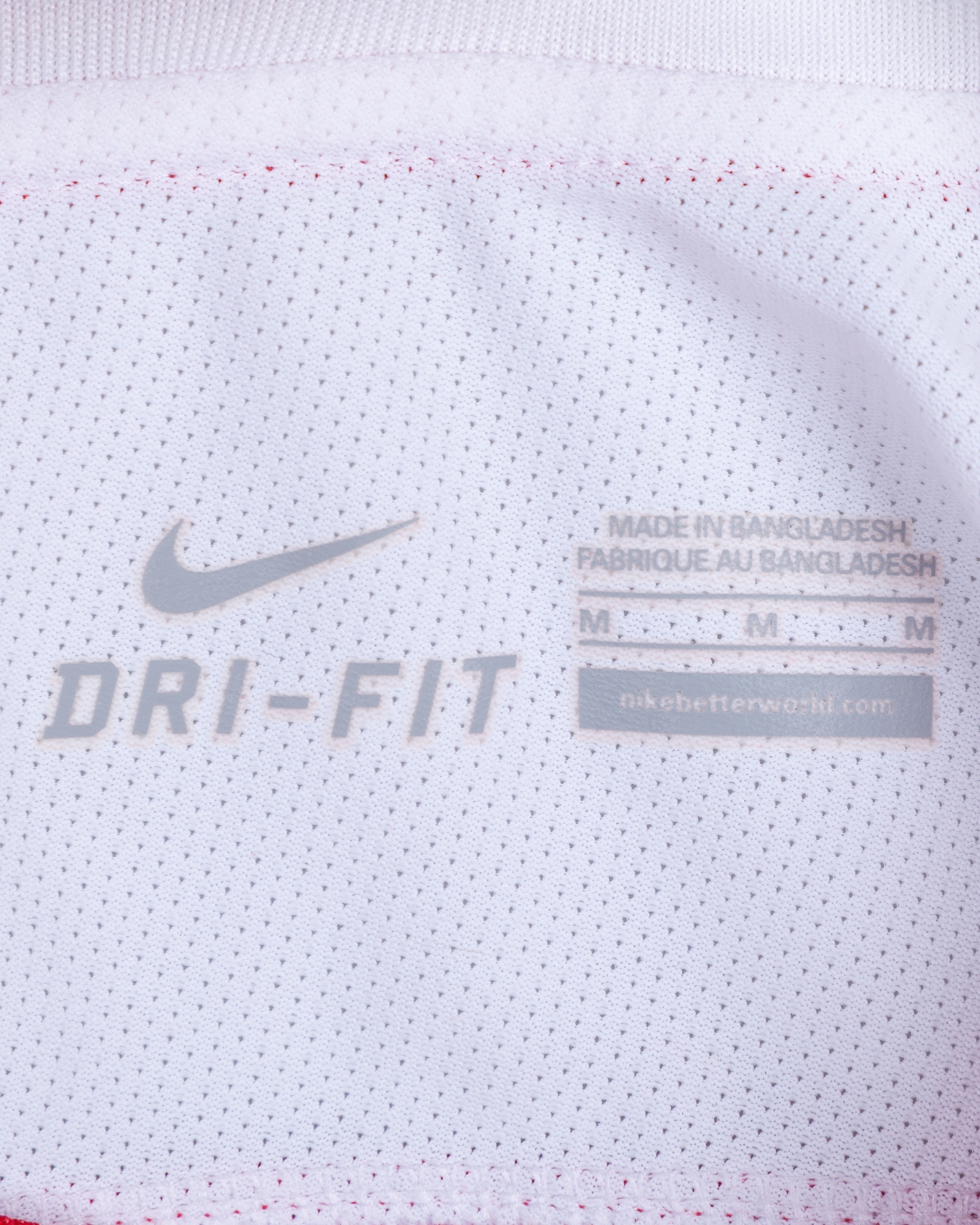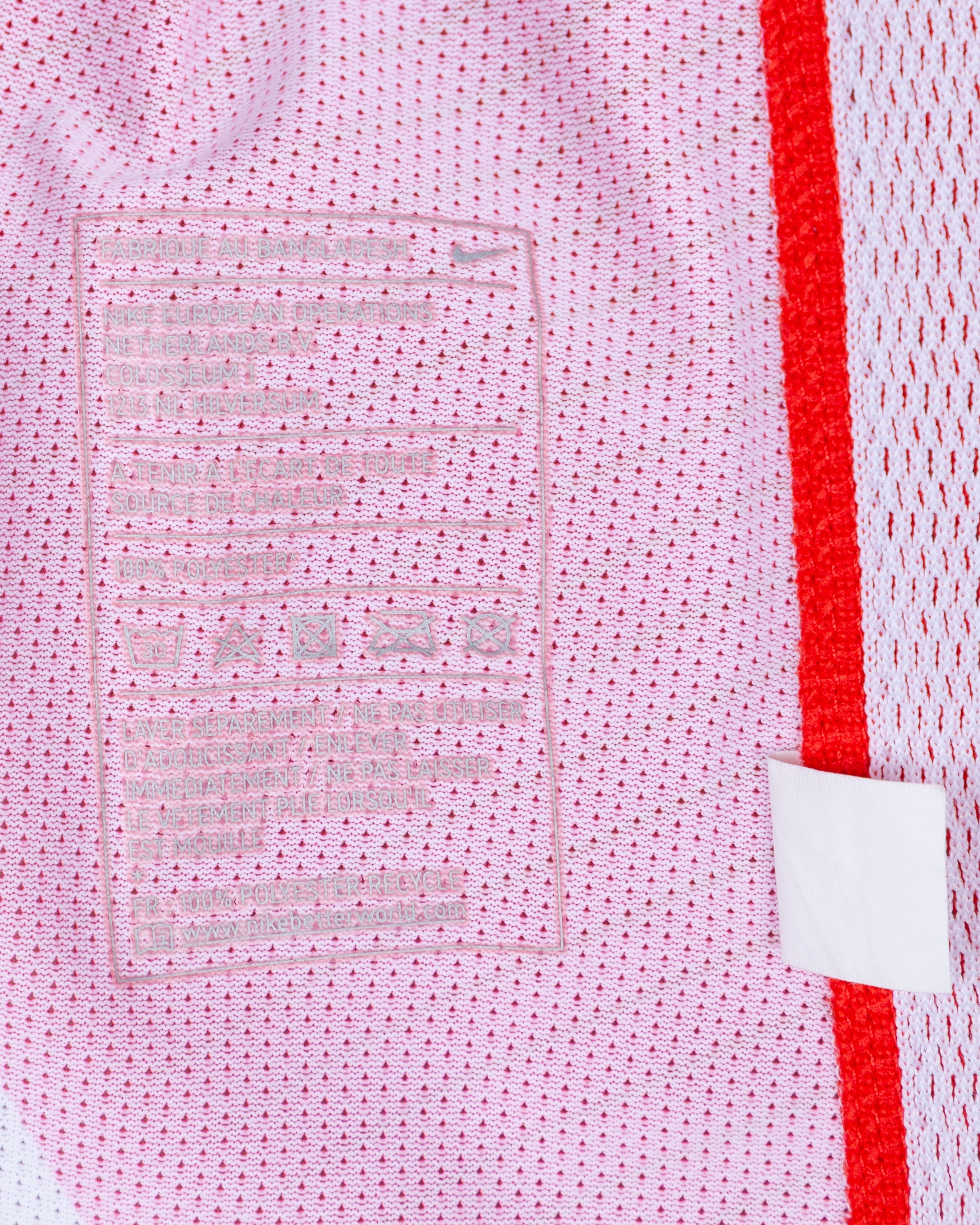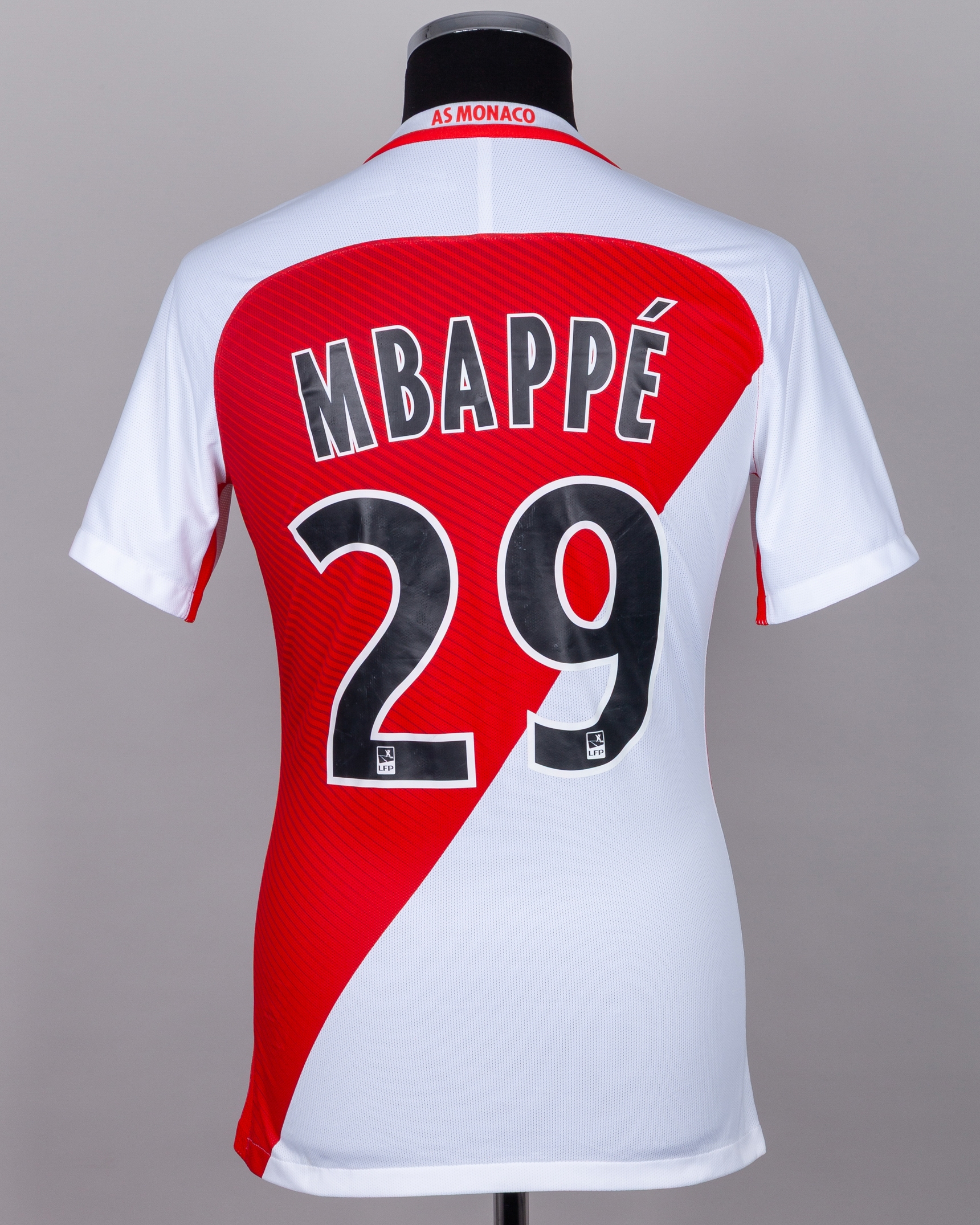 Kylian Mbappe red and white No.29 Monaco short-sleeved shirt, 2016-17, Nike, M, with v-neck collar and printed badge, with embroidered cloth badge inscribed AS MONACO FC, the reverse lettered MBAPPE, with Nike logo loose