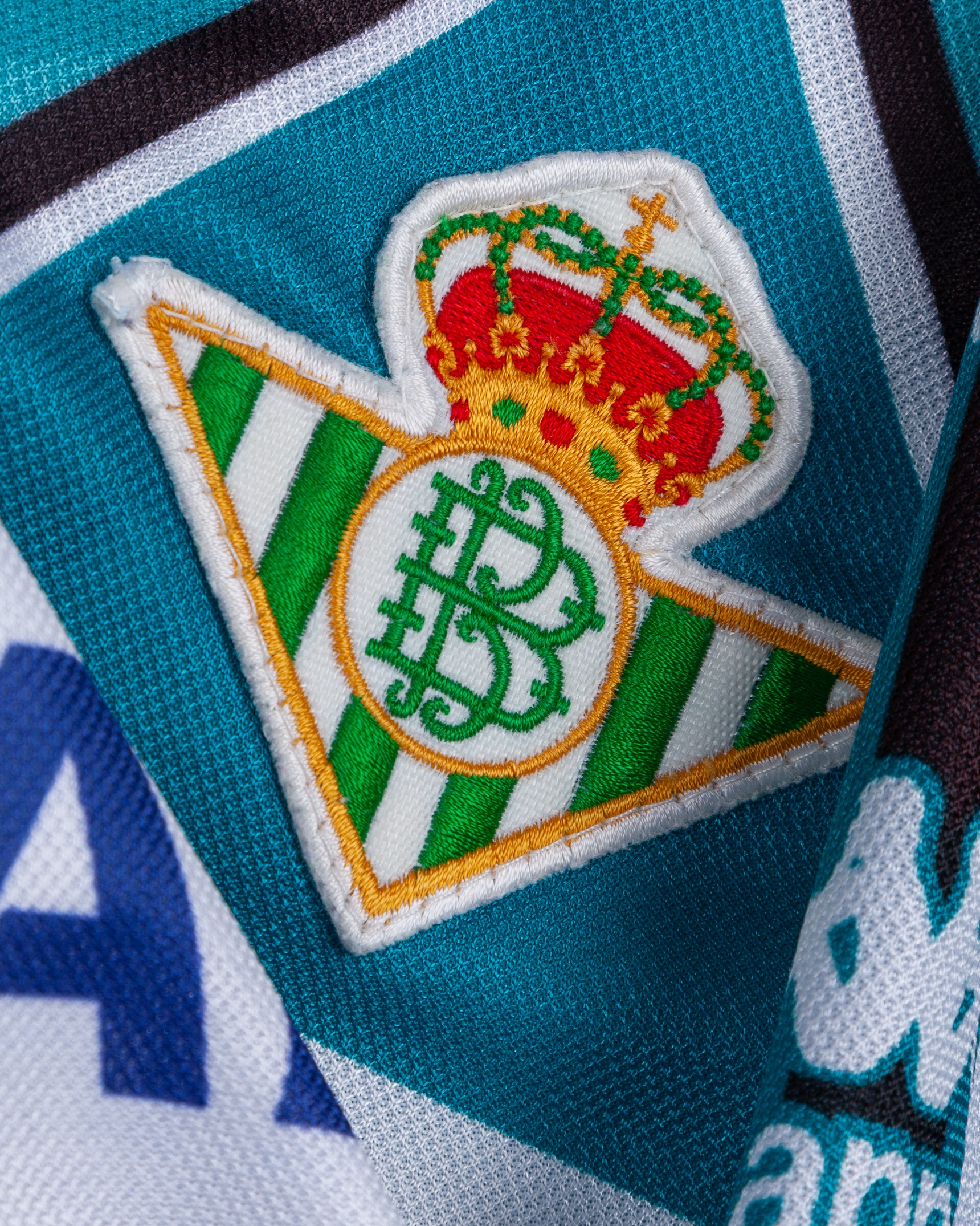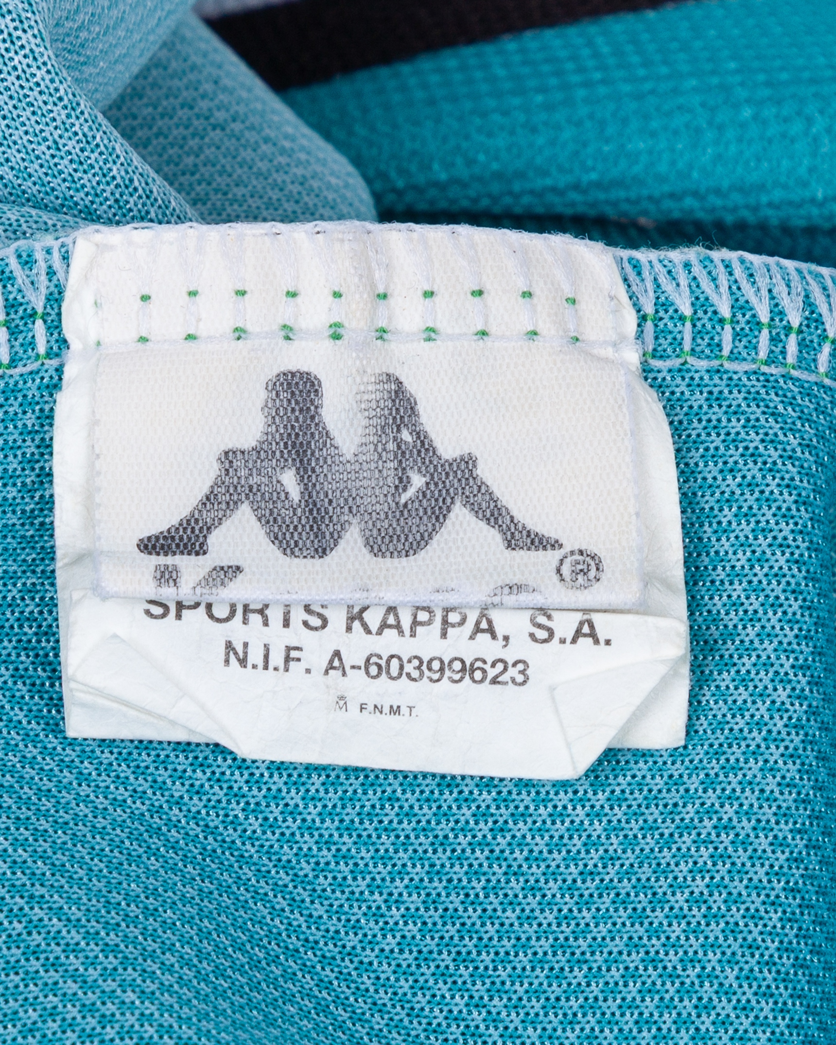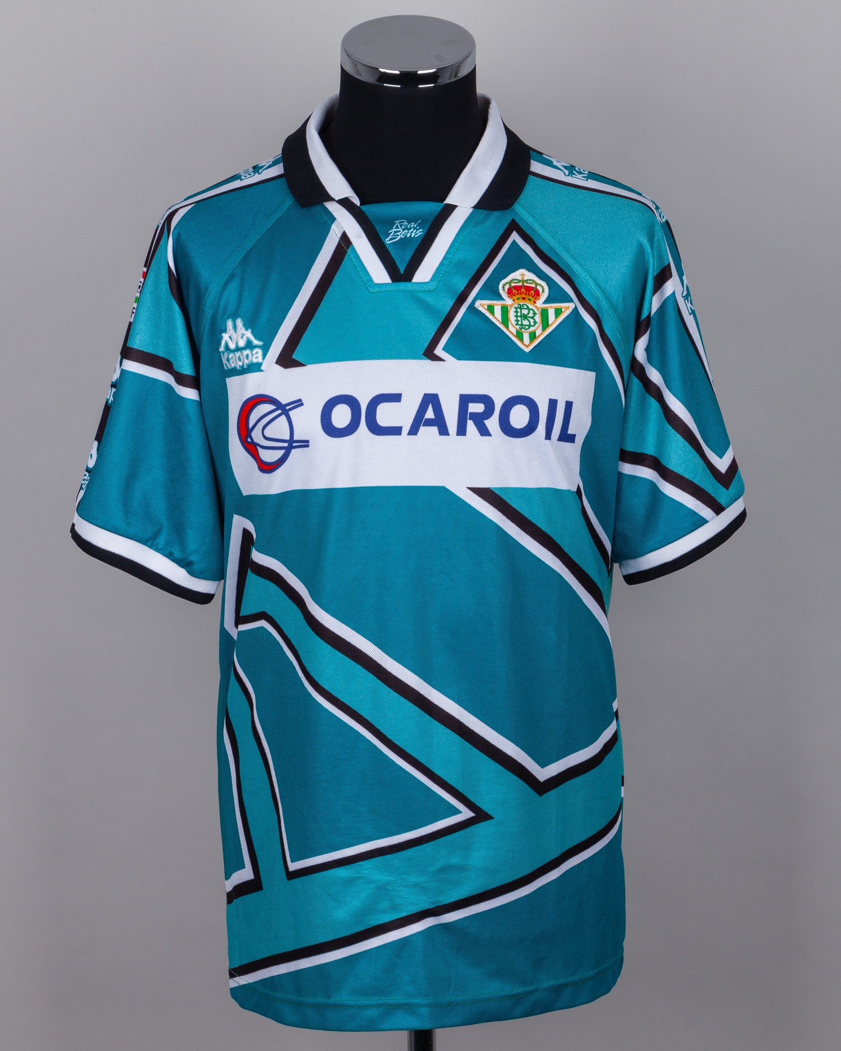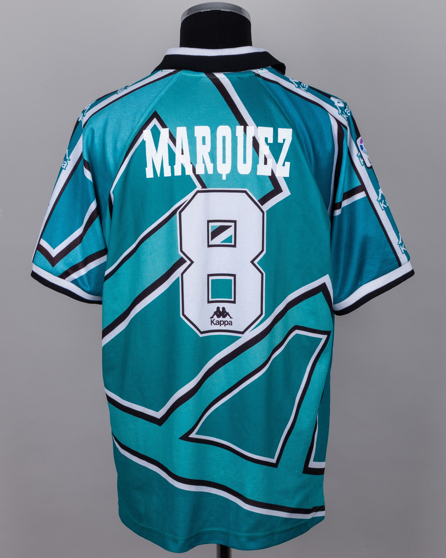 Luis Marquez green, white and black No.8 Real Betis short-sleeved shirt, 1995-97, Kappa, XL, with v-neck style collar and embroidered cloth badge, the reverse lettered MARQUEZ, the right sleeve with LFP printed flash