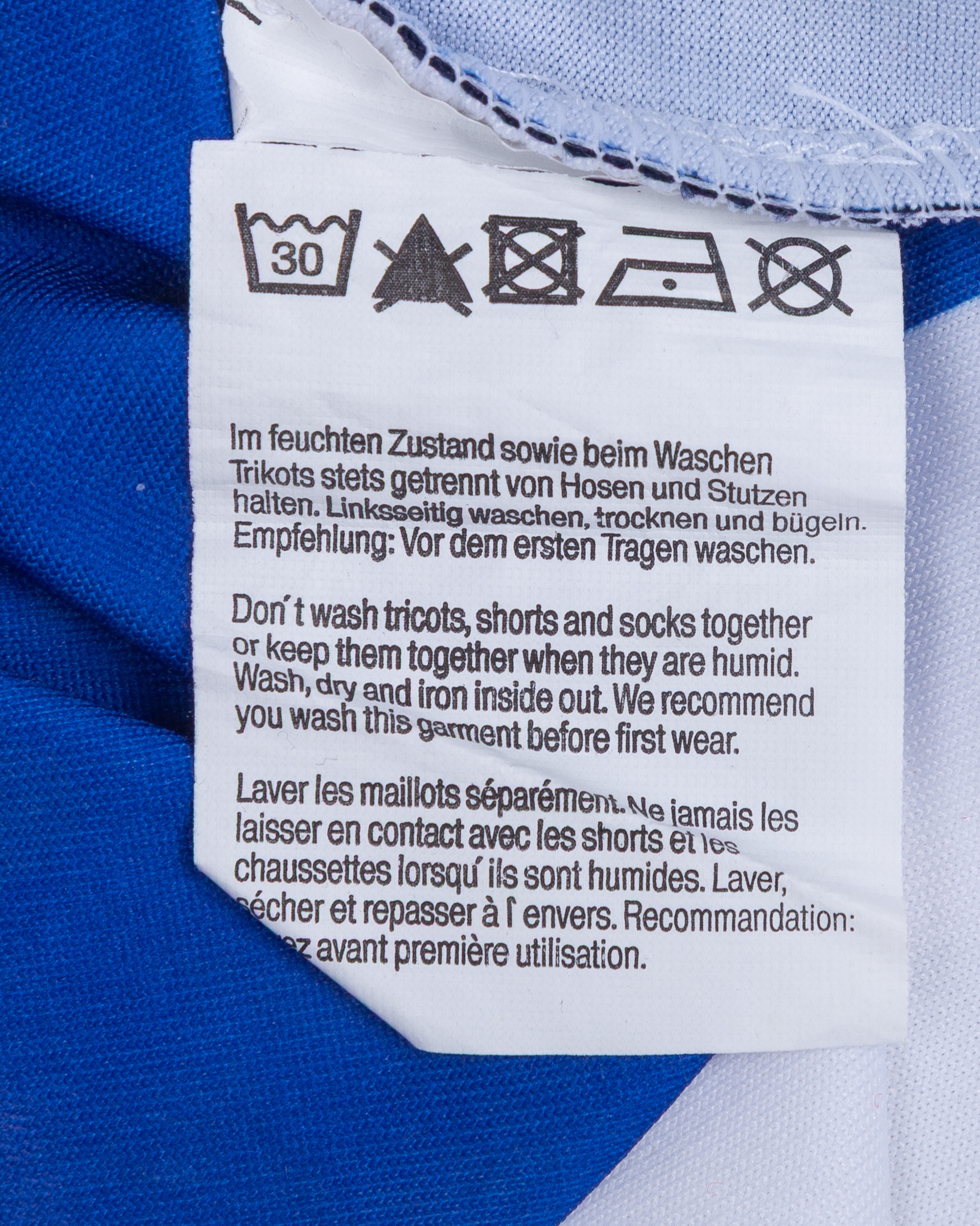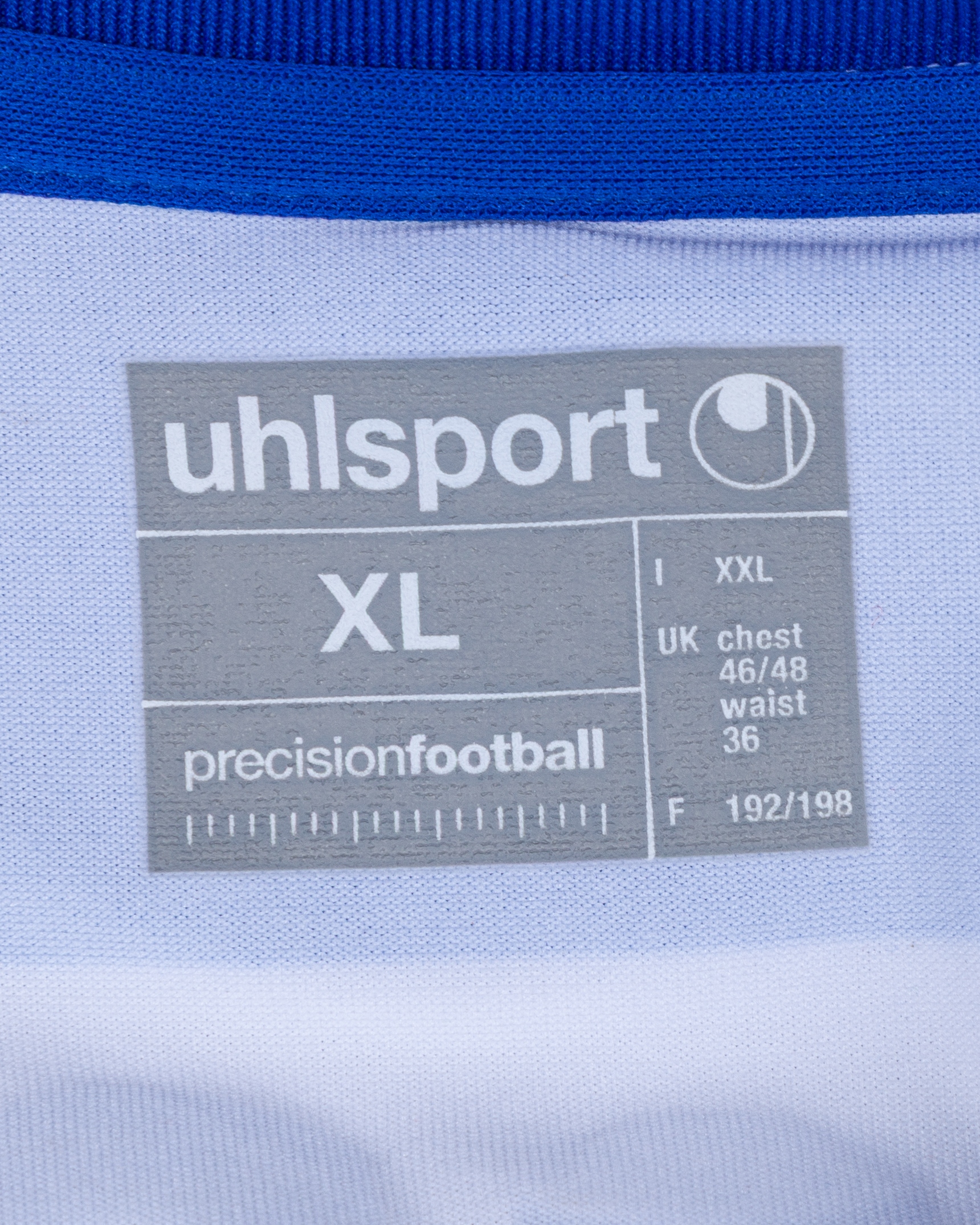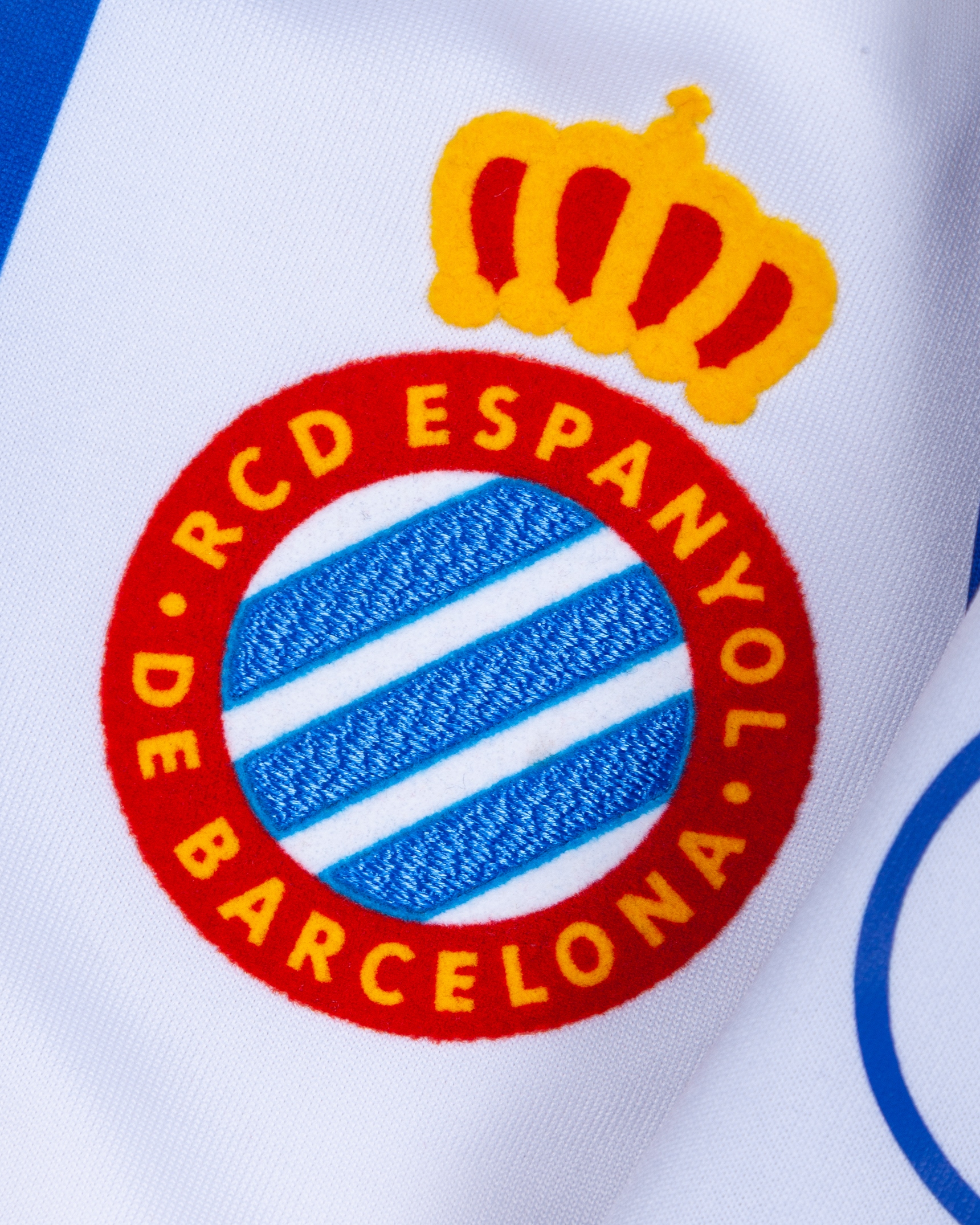 Albert Riera blue and white No.11 Espanyol v. Barcelona match worn short-sleeved shirt, 2007, Uhlsport, XL, with v-neck collar and felt badge, the reverse lettered RIERA, the right sleeve with LFP flash and the left sleeve with TV3 flash, with staining
