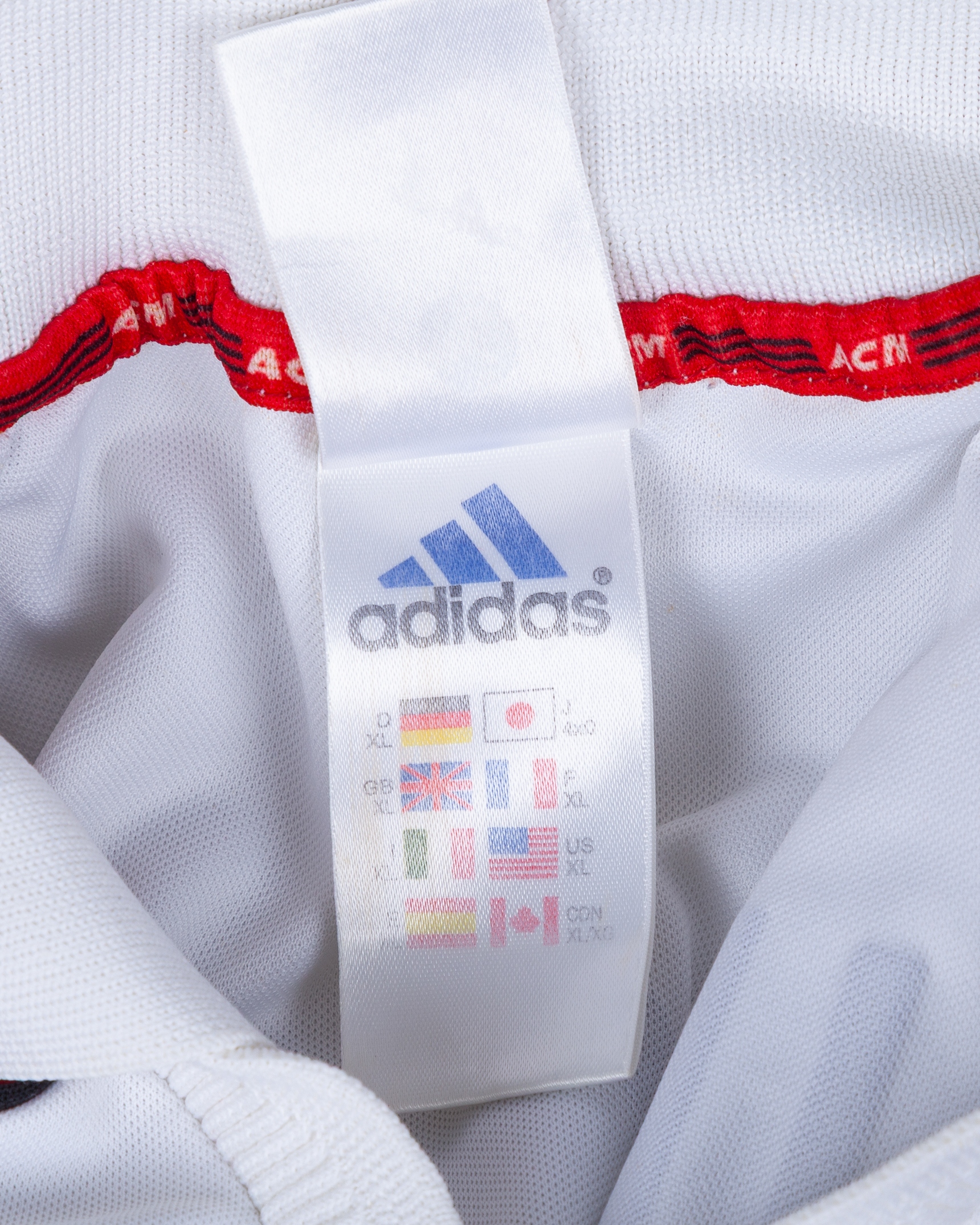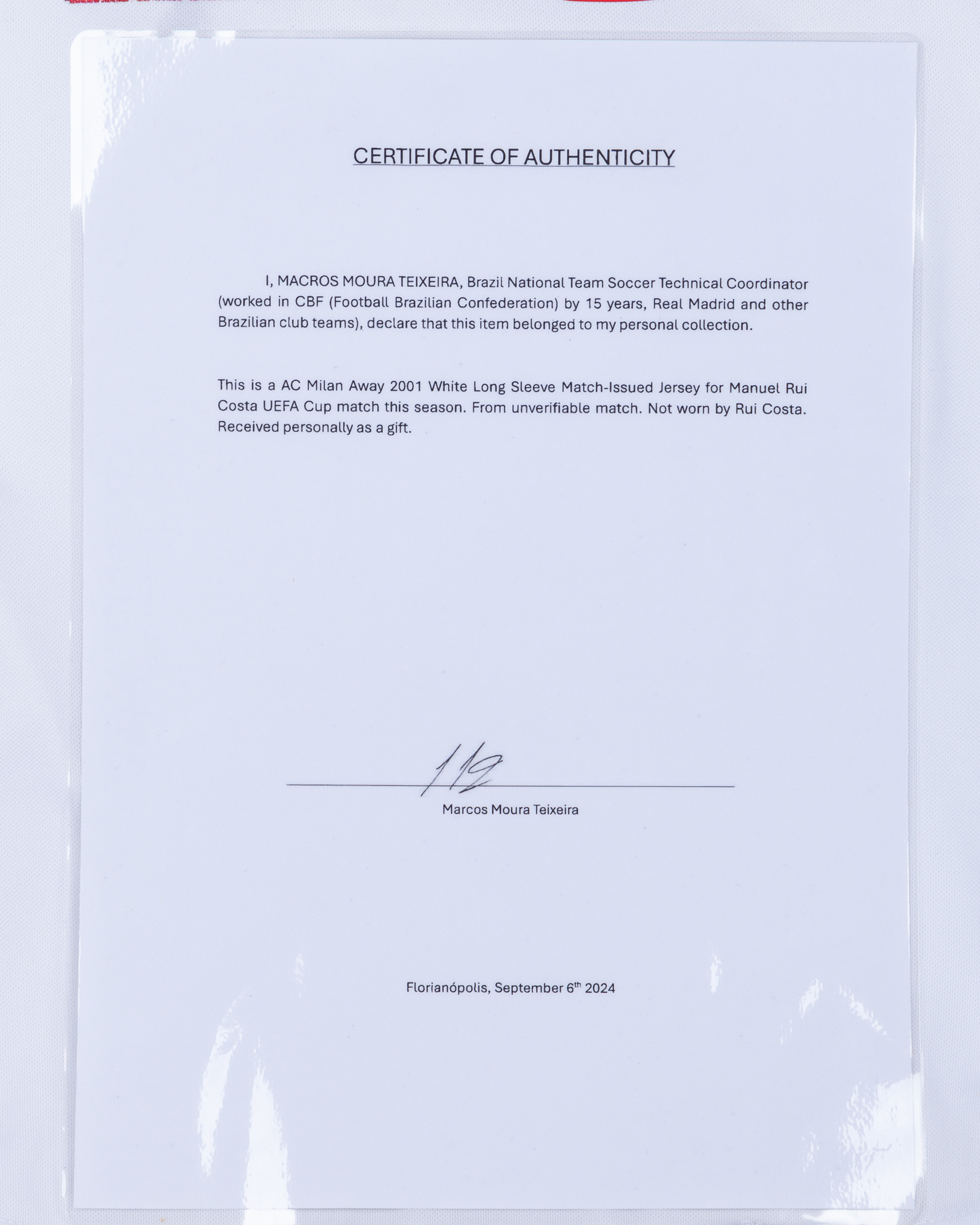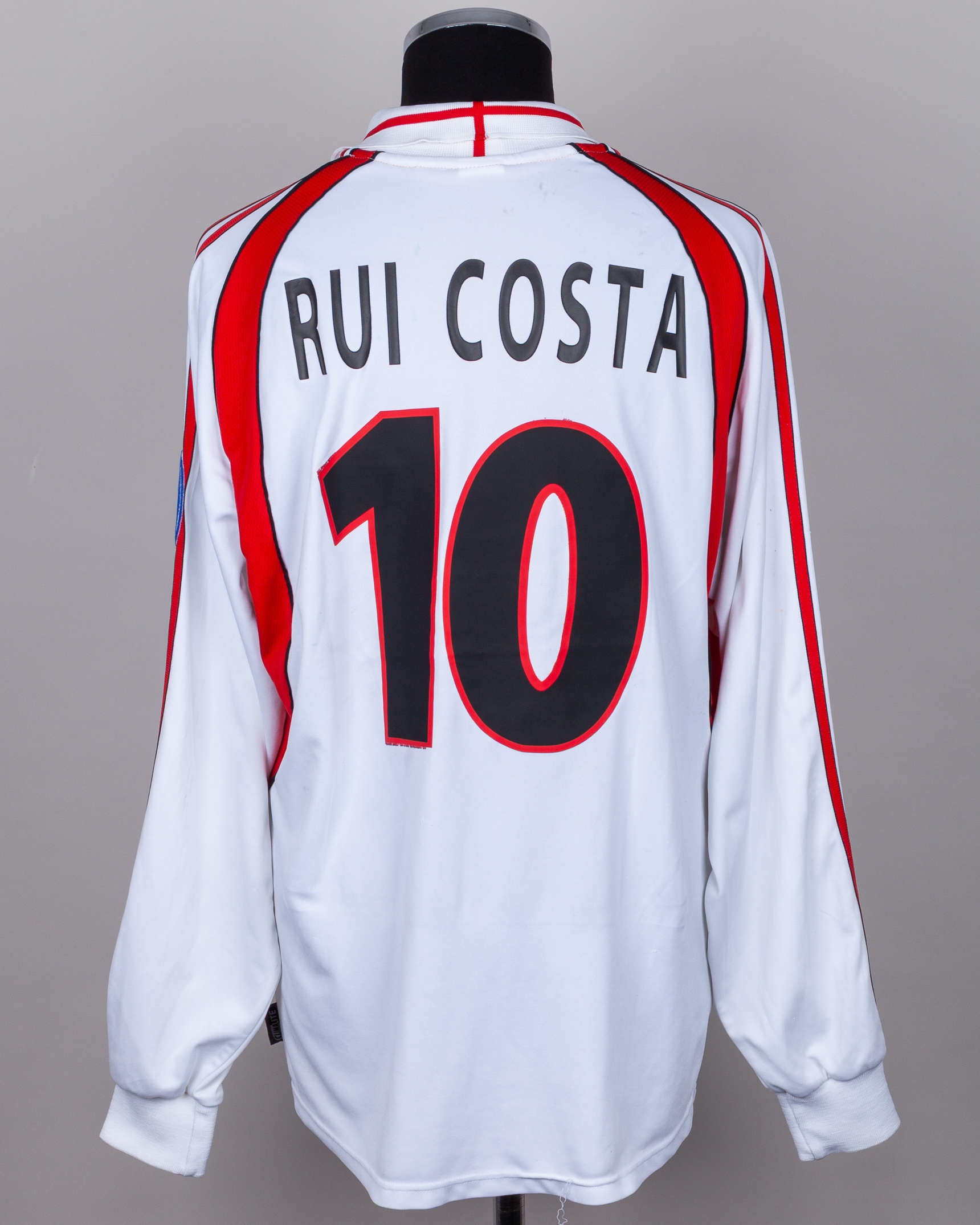 Rui Costa white and red No.10 AC Milan long-sleeved shirt, 2000-02, Adidas, XL, with v-neck collar and embroidered cloth badge inscribed ACM 1899, the reverse lettered RUI COSTA, the left sleeve with 5 Champions League flash, with COA, with some staining, discolouration, pulls and wear to print