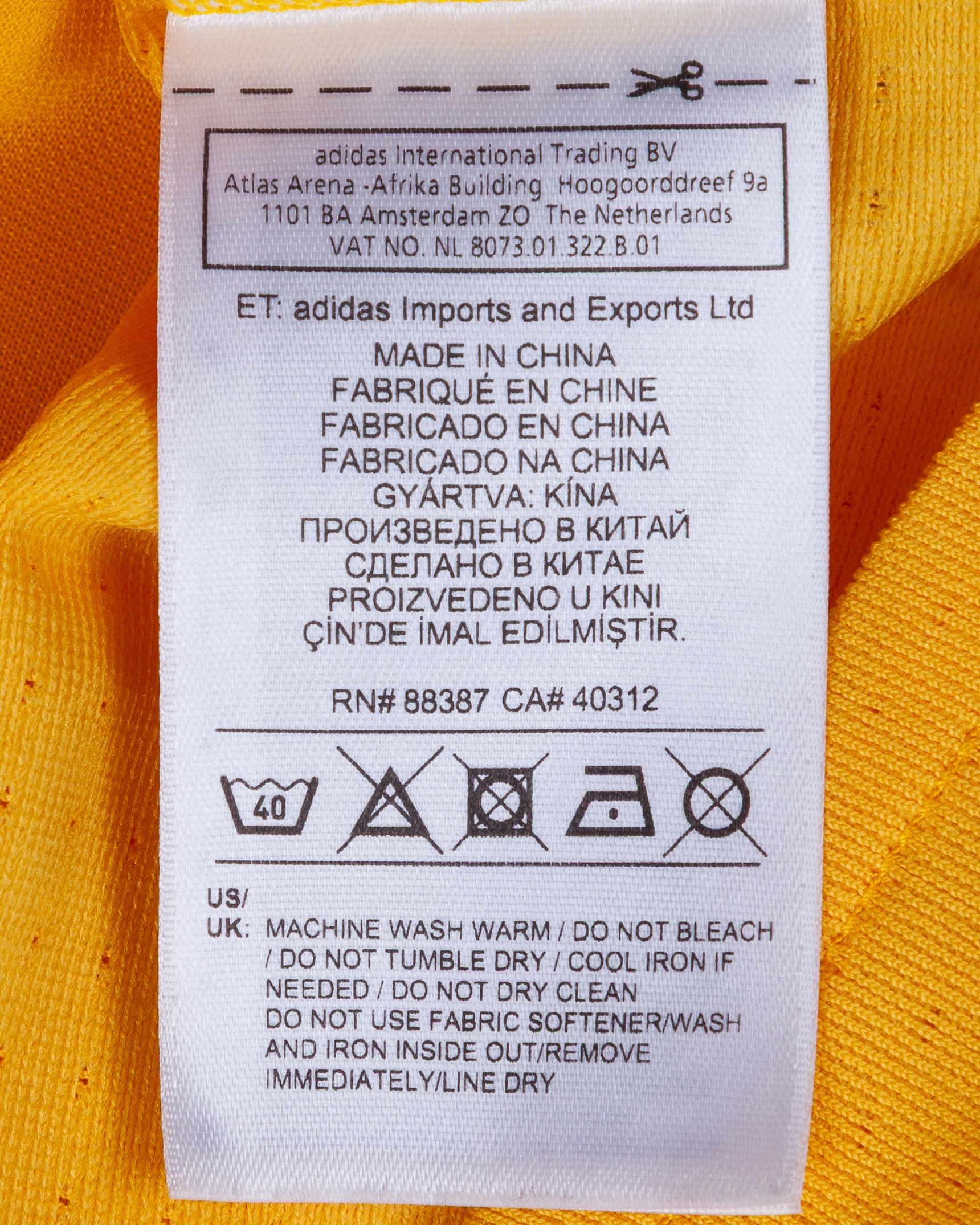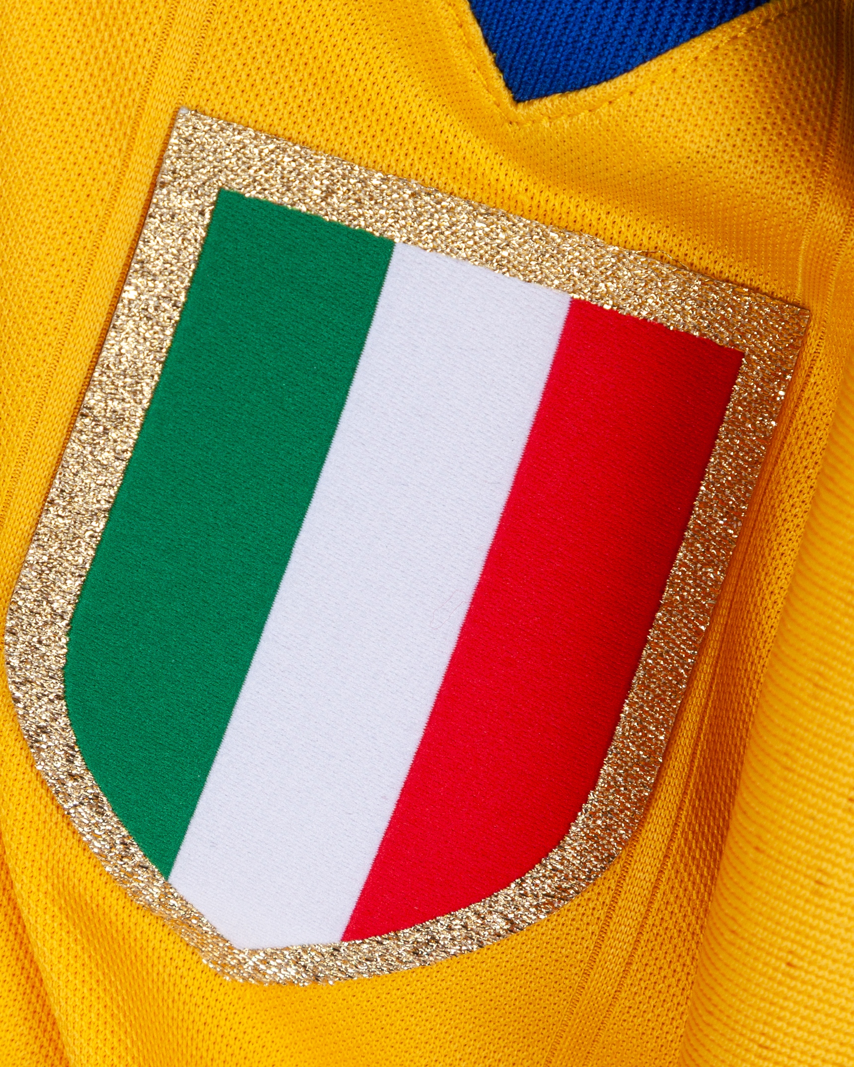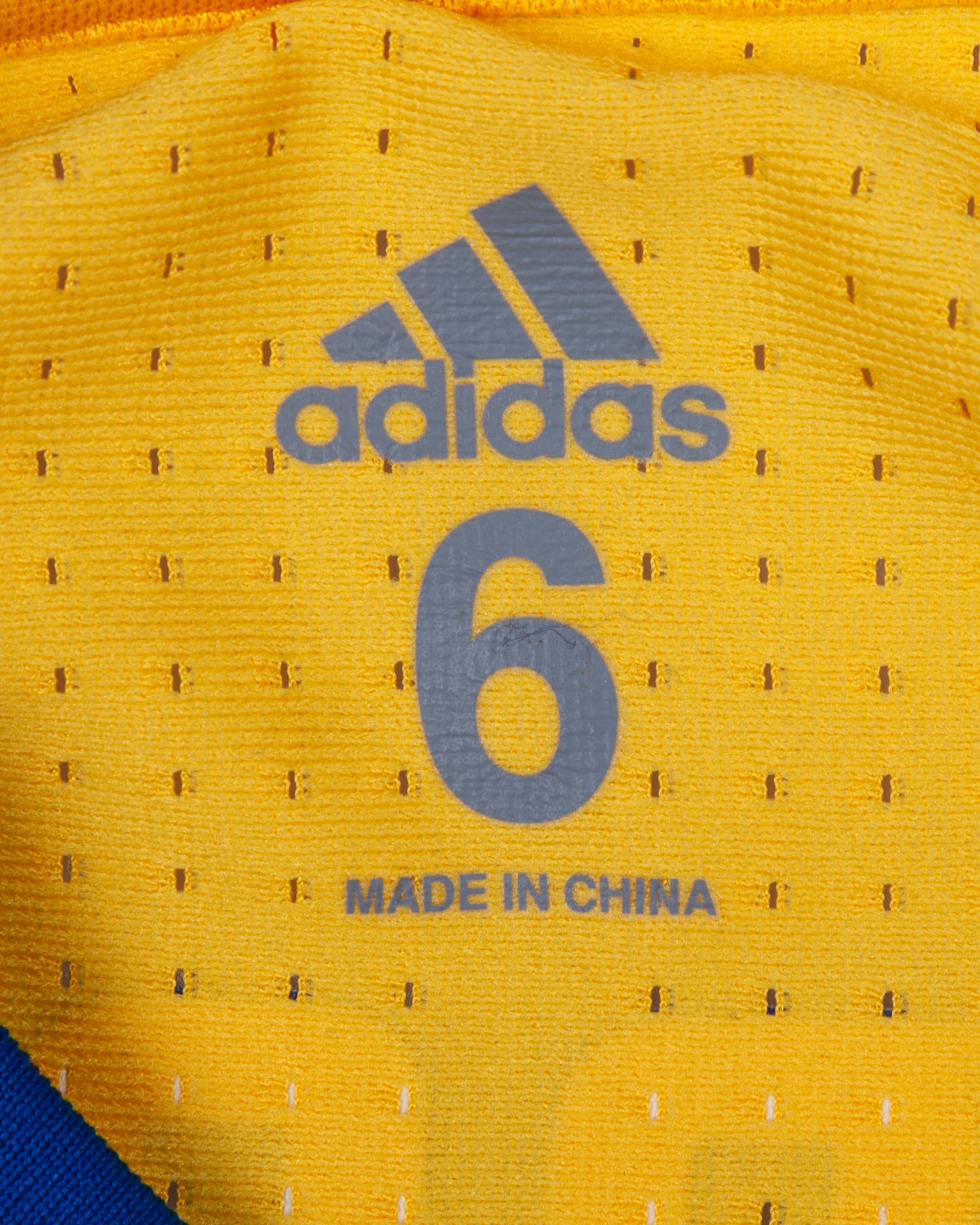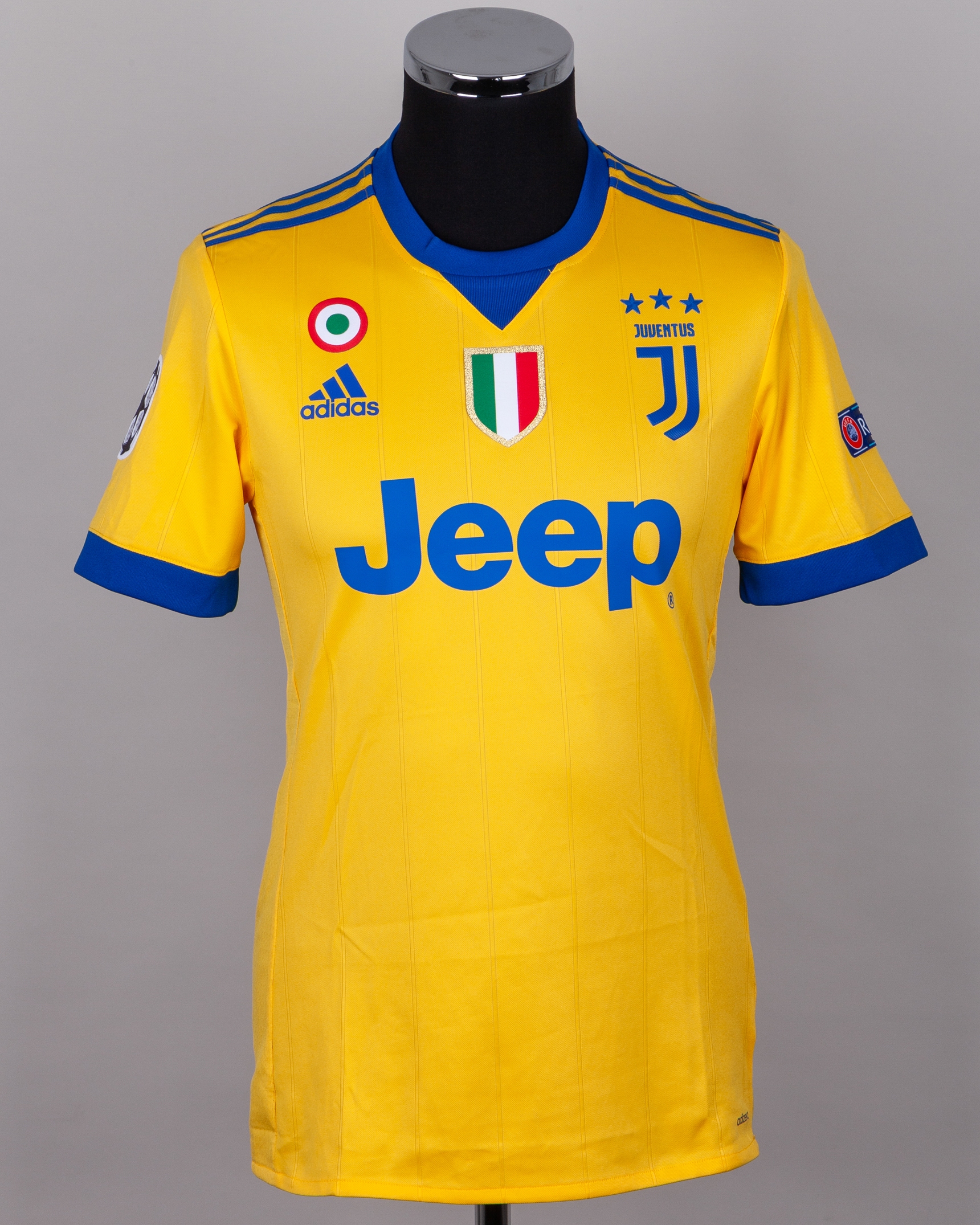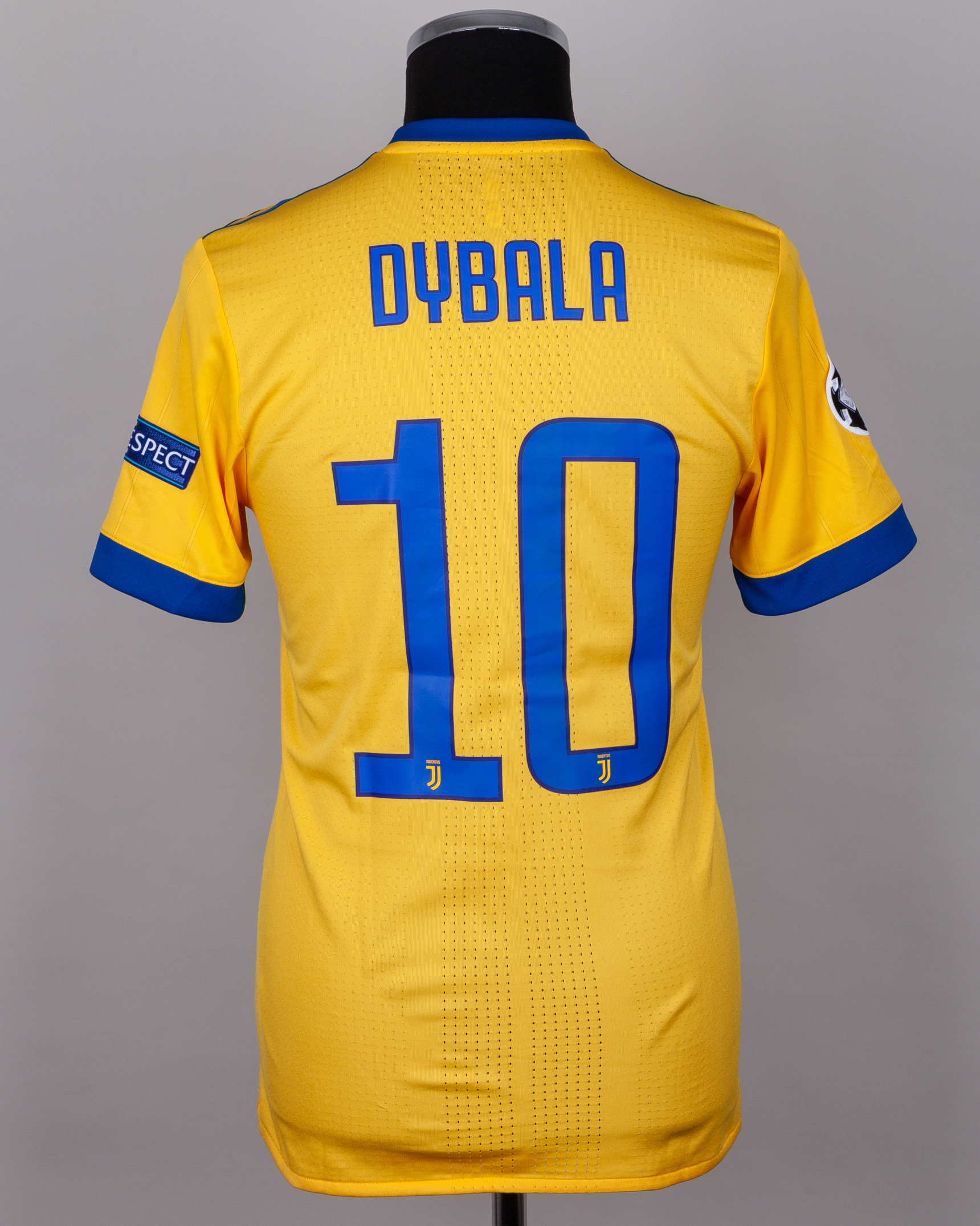 Paulo Dybala yellow No.10 Juventus v. Tottenham Hotspur short-sleeved shirt, 2018, Adidas, 6, with crew-neck collar and printed badge, with Italian flag badge, the reverse lettered DYBALA, the right sleeve with Champions League flash and the left with respect flash