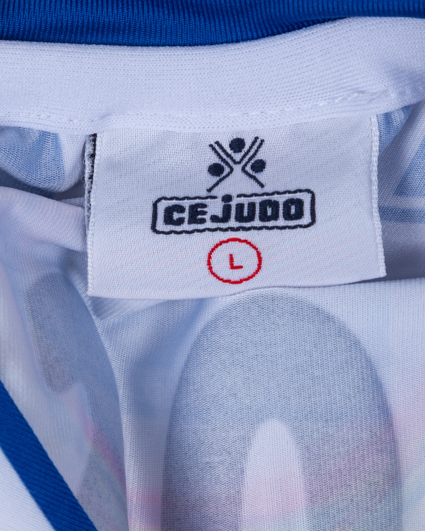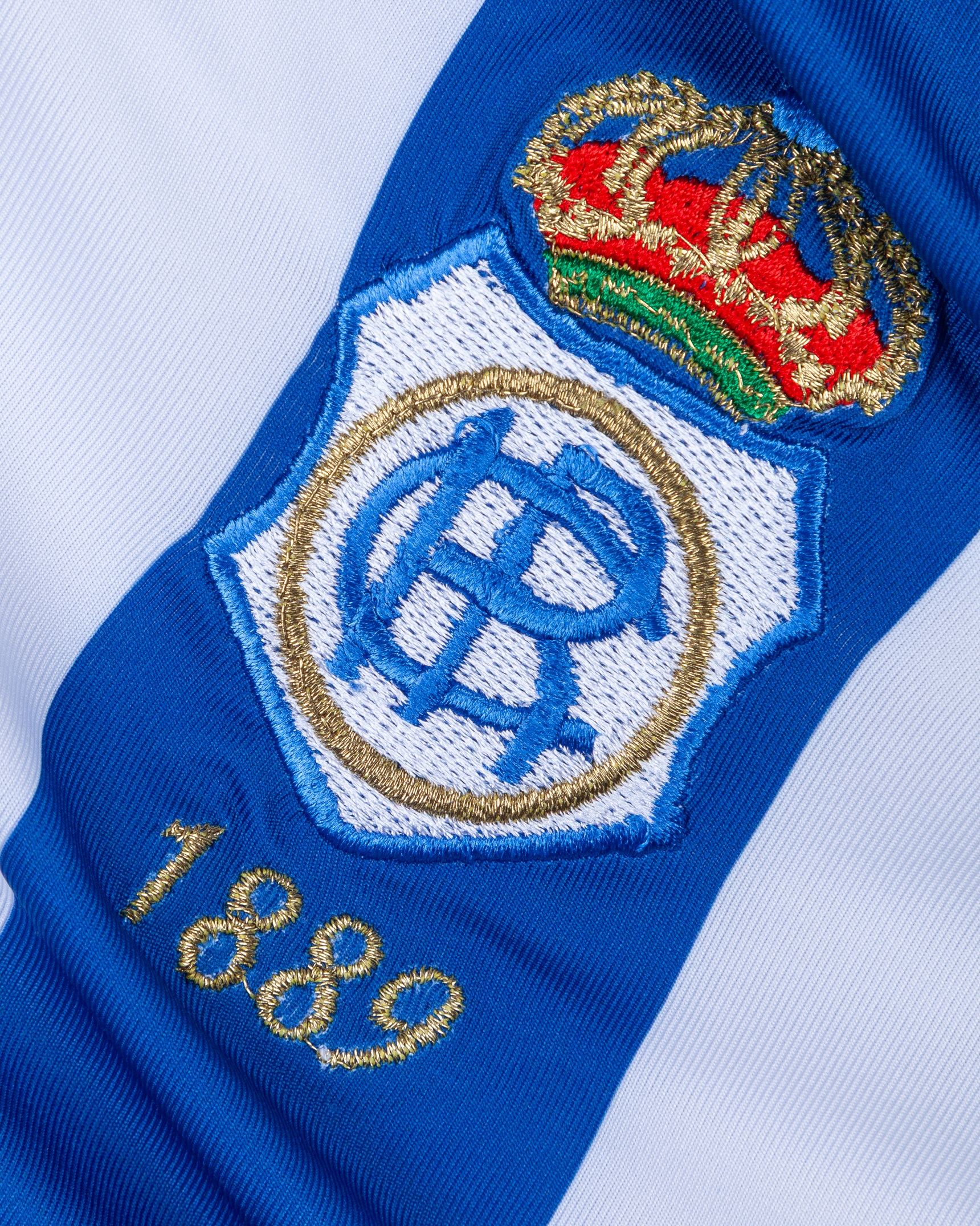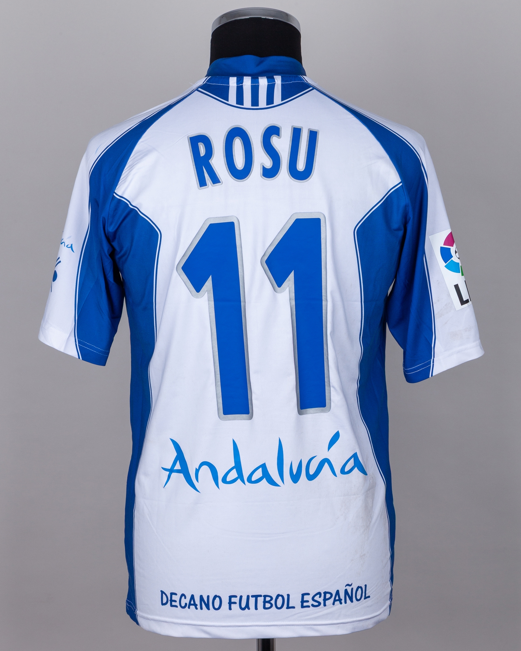 Laurentiu Rosu blue and white No.11 Recreativo Huelva v. Barcelona short-sleeved shirt, 2006, Ce Judo, L, with crew-neck collar and embroidered badge inscribed 1889, the reverse lettered ROSU, the right sleeve with LFP flash