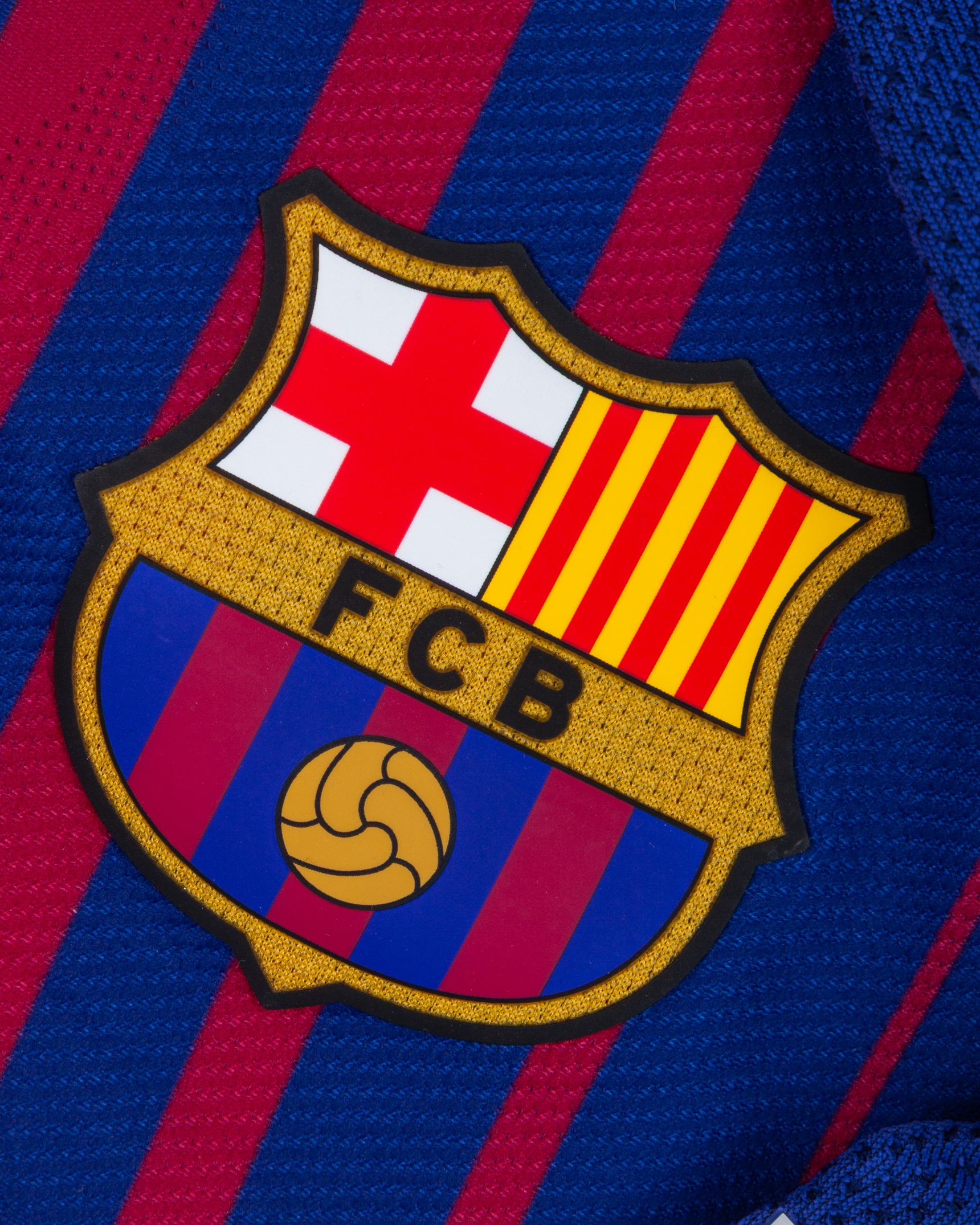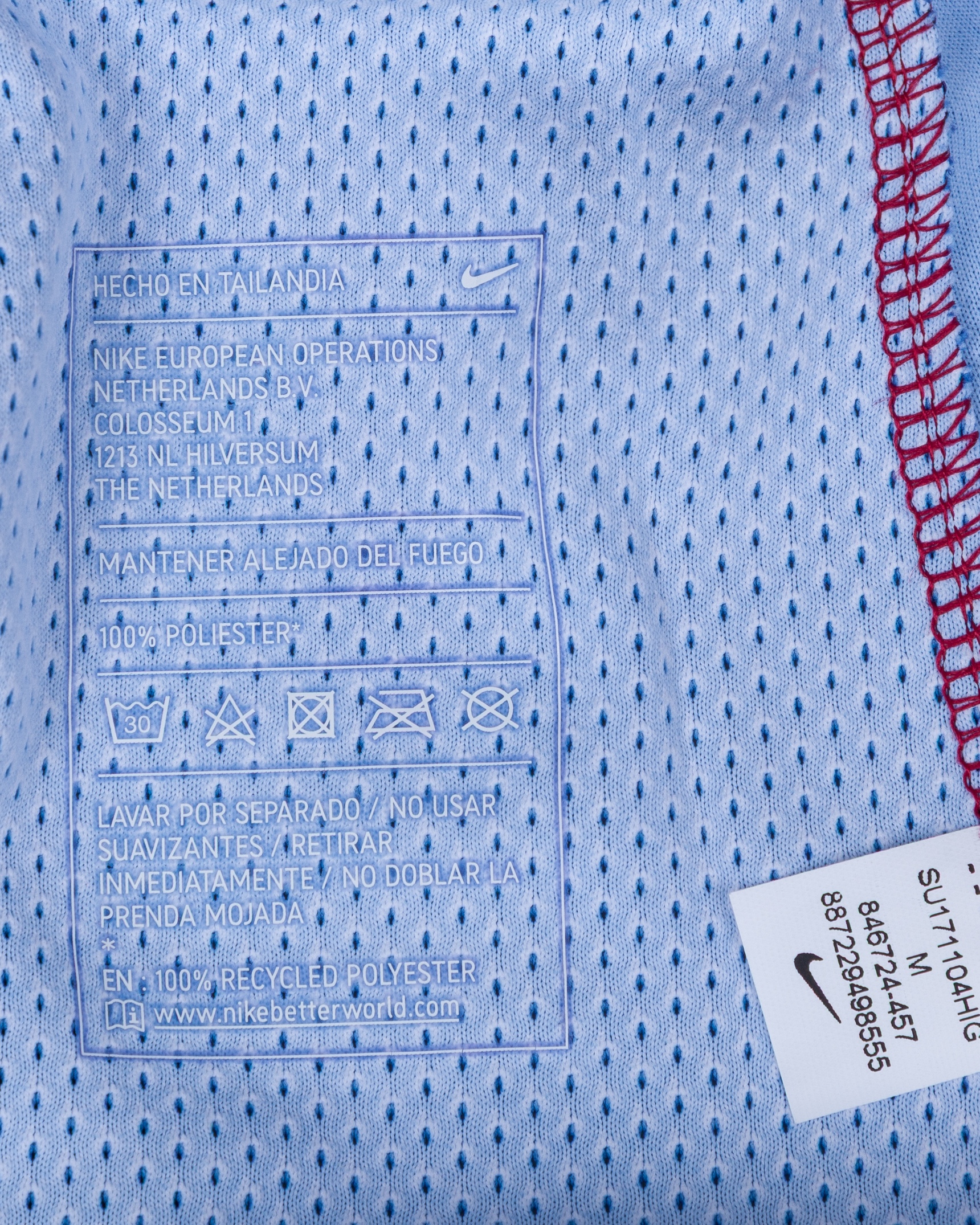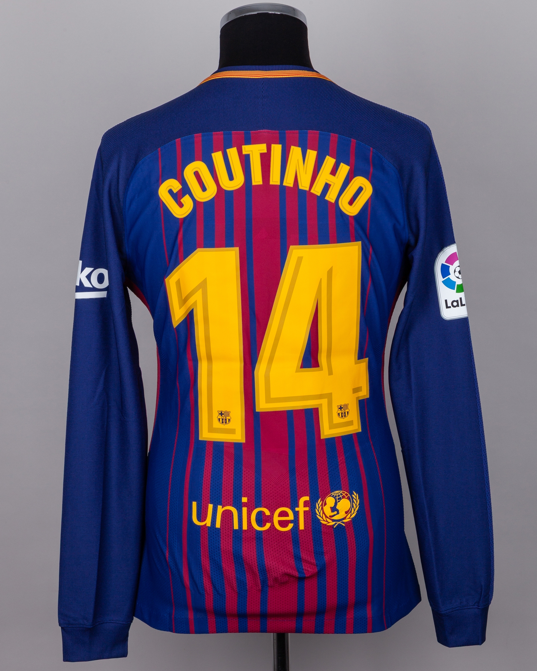 Philippe Coutinho garnet and blue No.14 Barcelona v. Getafe long-sleeved shirt, 2018, Nike, M, with crew-neck collar and printed badge, the reverse lettered COUTINHO, the right sleeve with La Liga flash