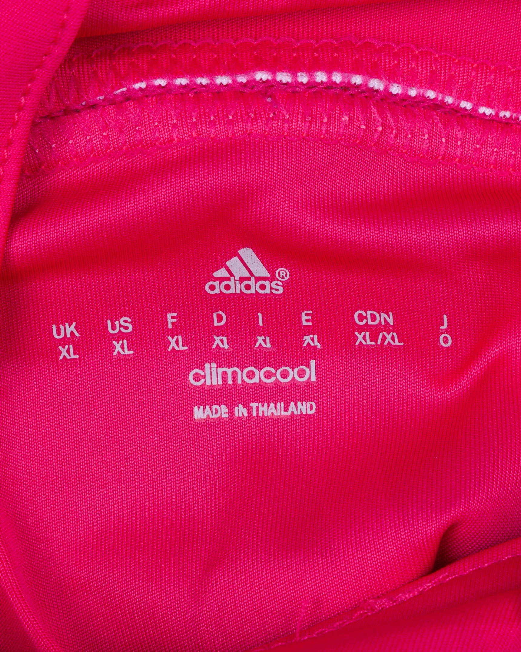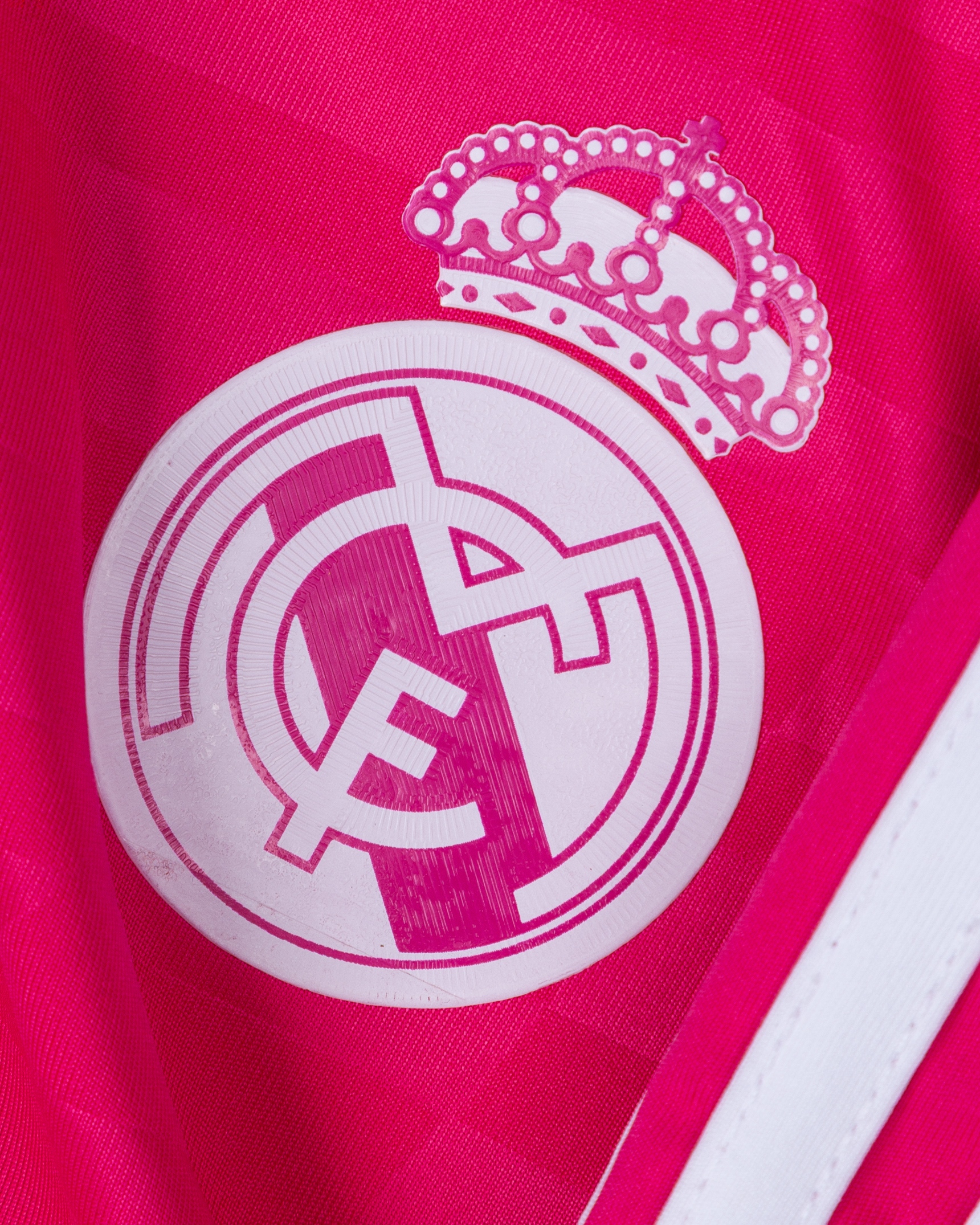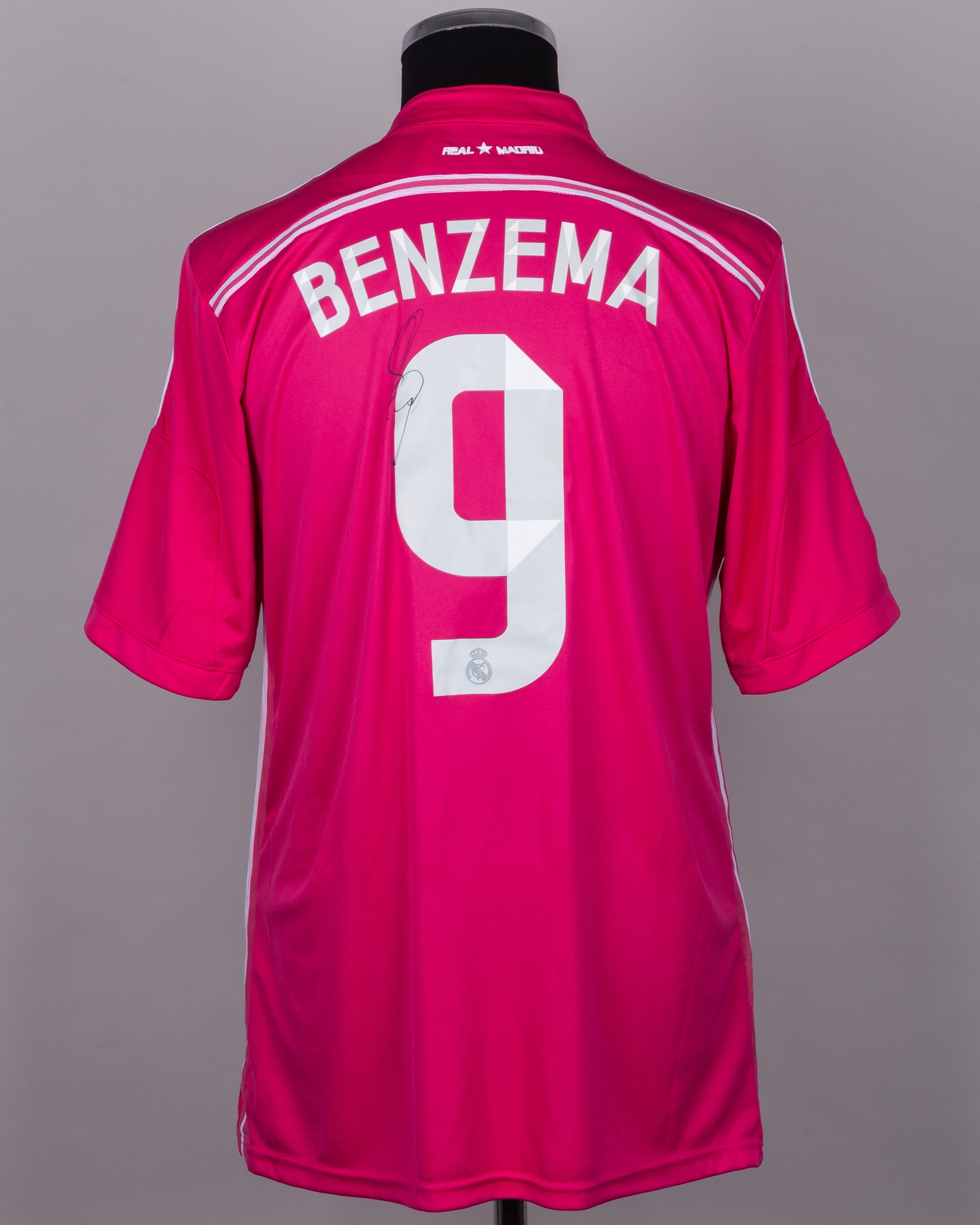 Karim Benzema pink No.9 Real Madrid autographed short-sleeved shirt, 2014-15, Adidas, XL, with button-up collar and printed badge, the reverse lettered BENZEMA, the right sleeve with LFP flash, autographed on the number, with tag