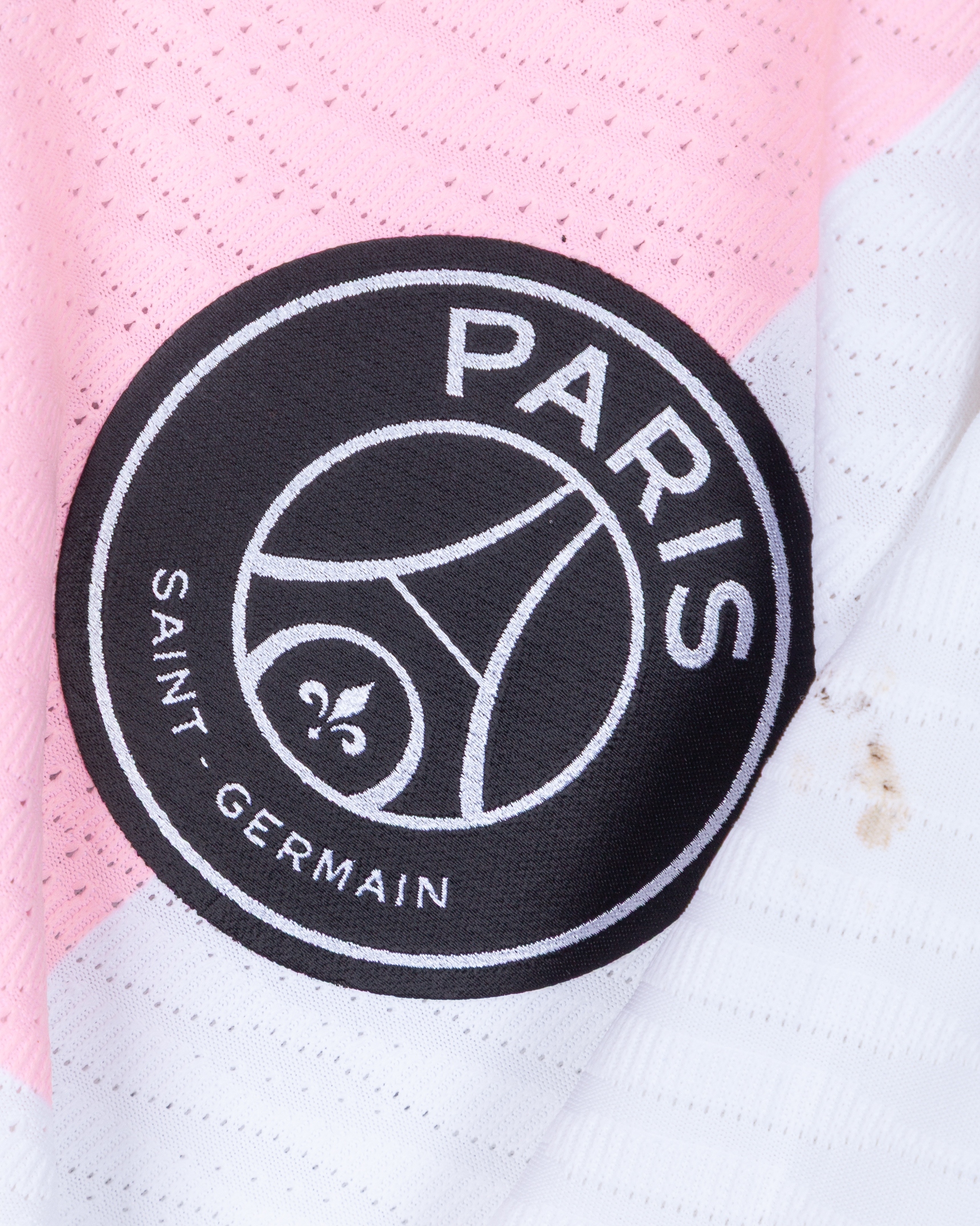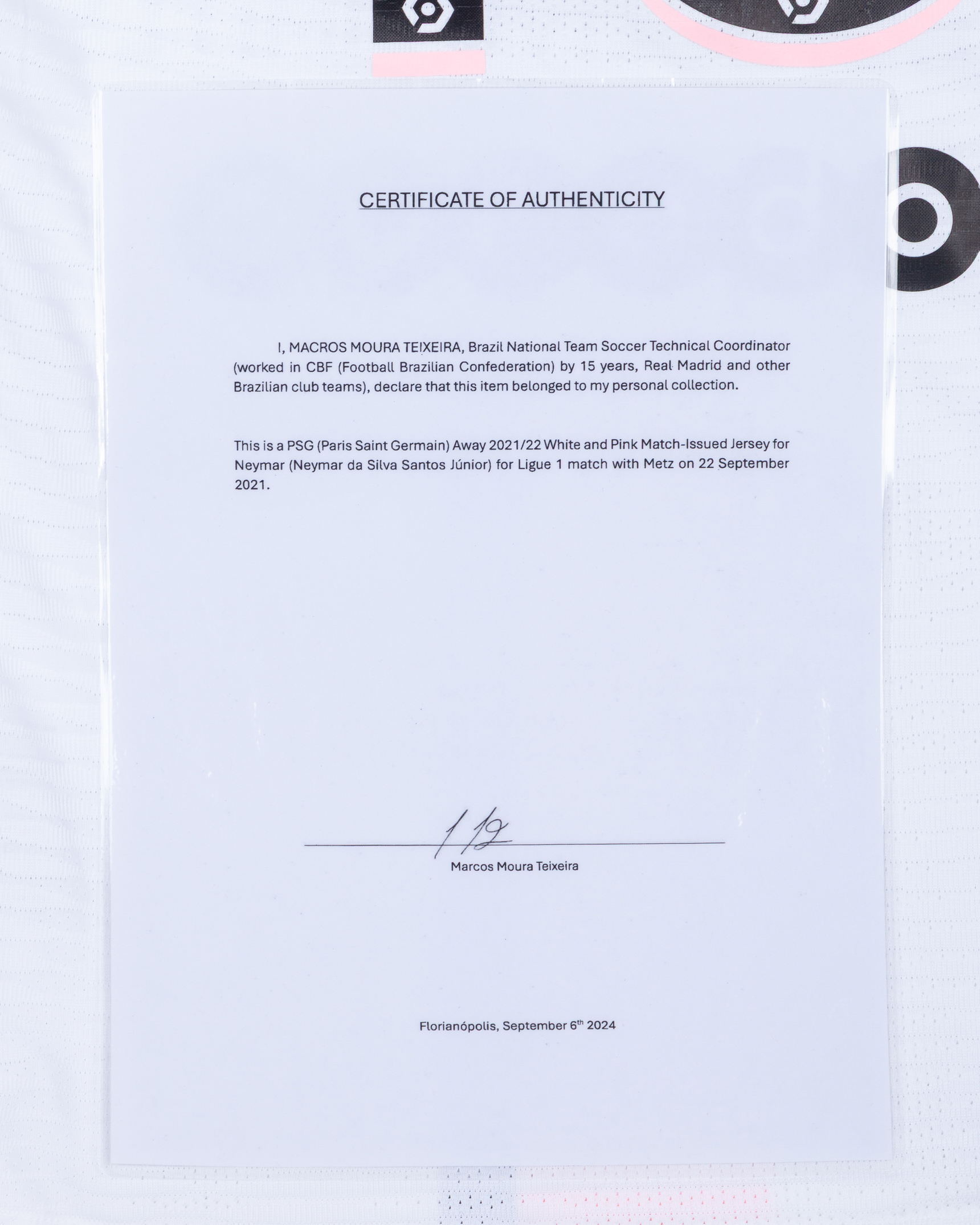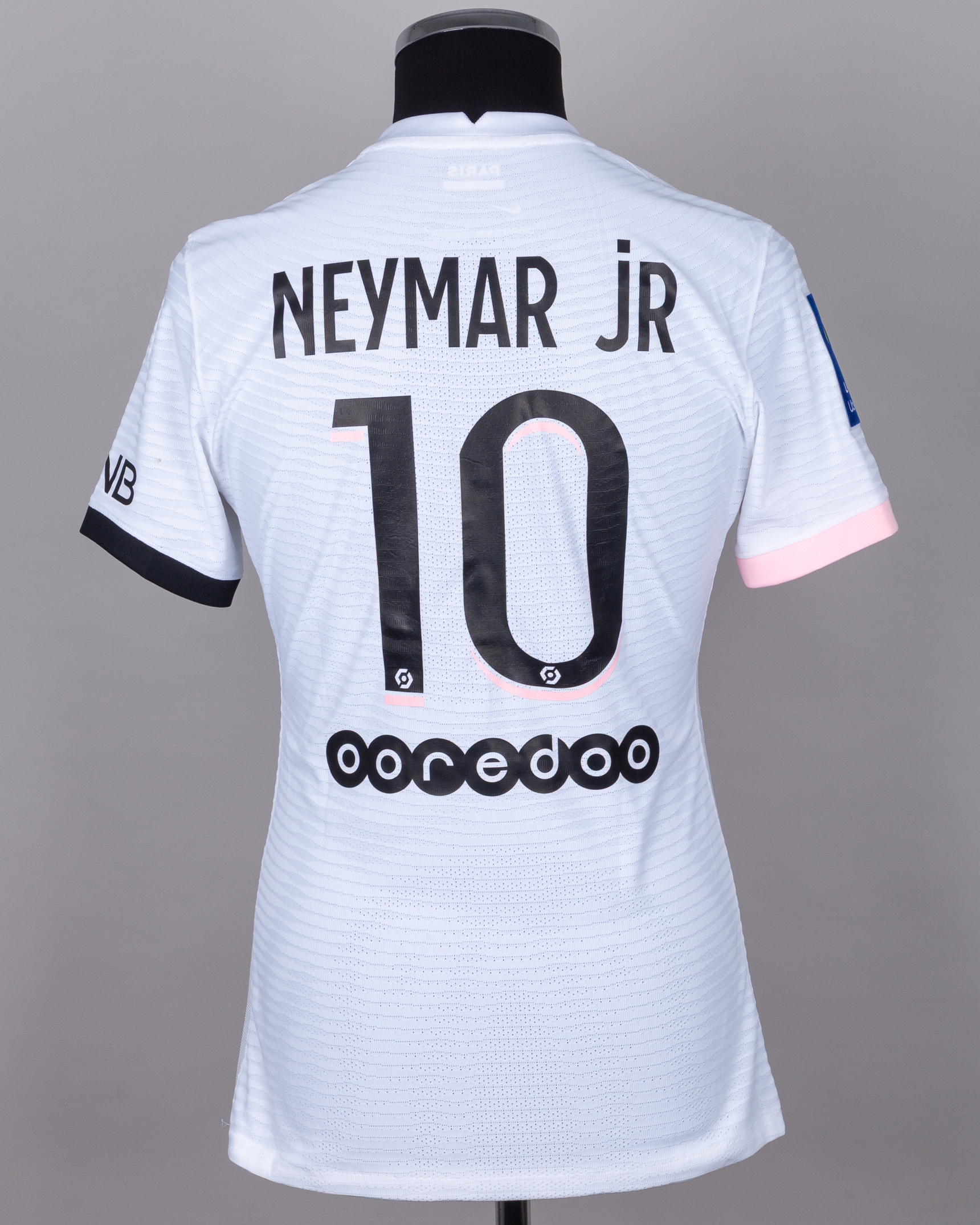 Neymar Jr white and pink No.10 Paris Saint-Germain v. Metz short-sleeved shirt, 2021, Nike, M, with crew-neck collar and printed badge, the reverse lettered NEYMAR JR, the right sleeve with Ligue 1 flash, with COA