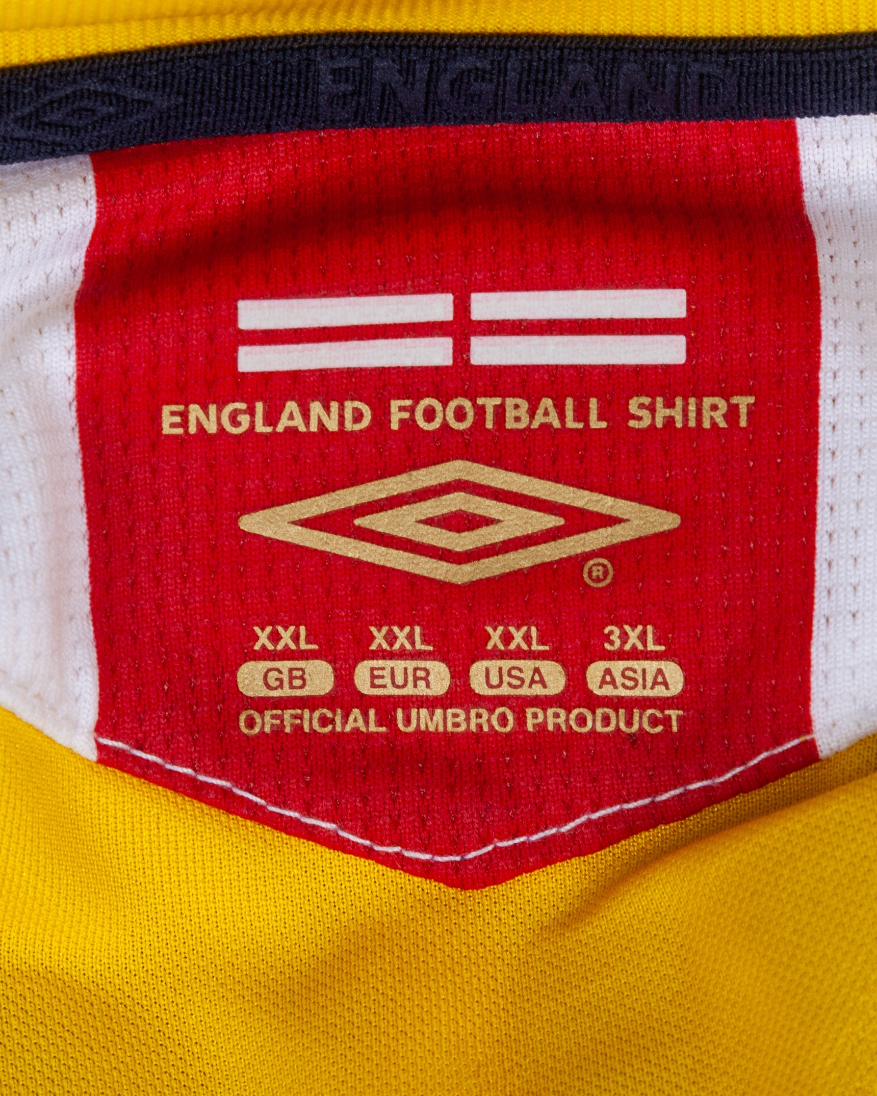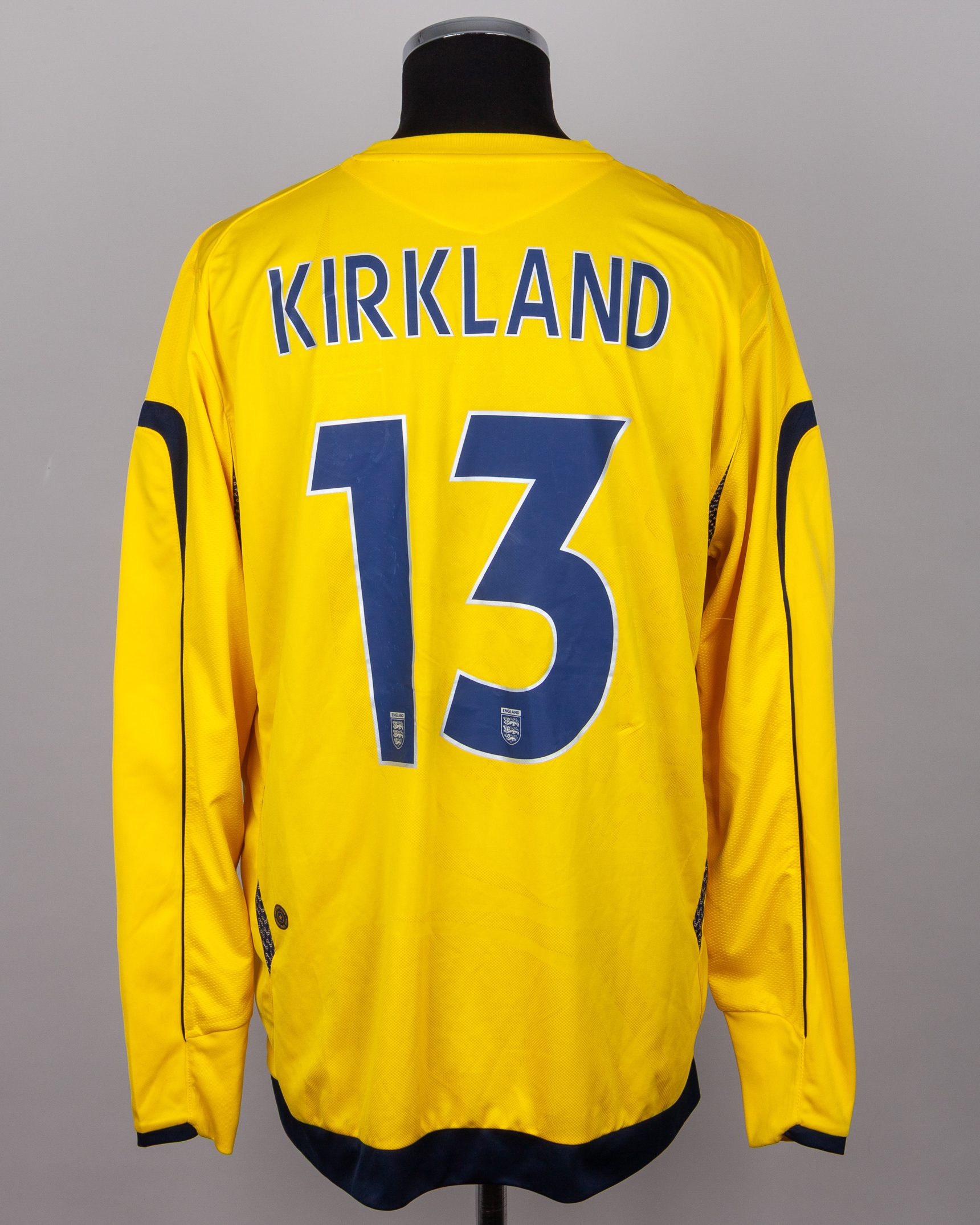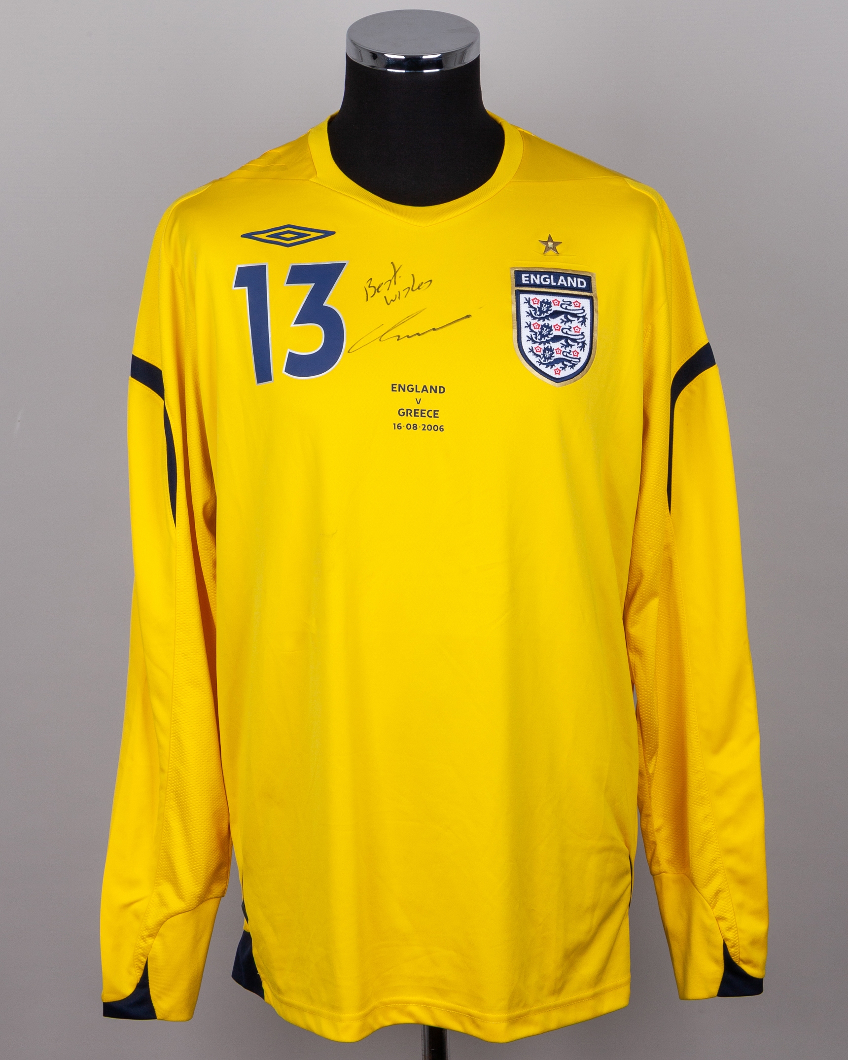 Chris Kirkland yellow No.13 England v. Greece autographed goalkeeper shirt, 2006, Umbro, XXL, with v-neck collar and embroidered cloth badge inscribed ENGLAND, with ENGLAND V GREECE 16.08.2006 decal, the reverse lettered KIRKLAND