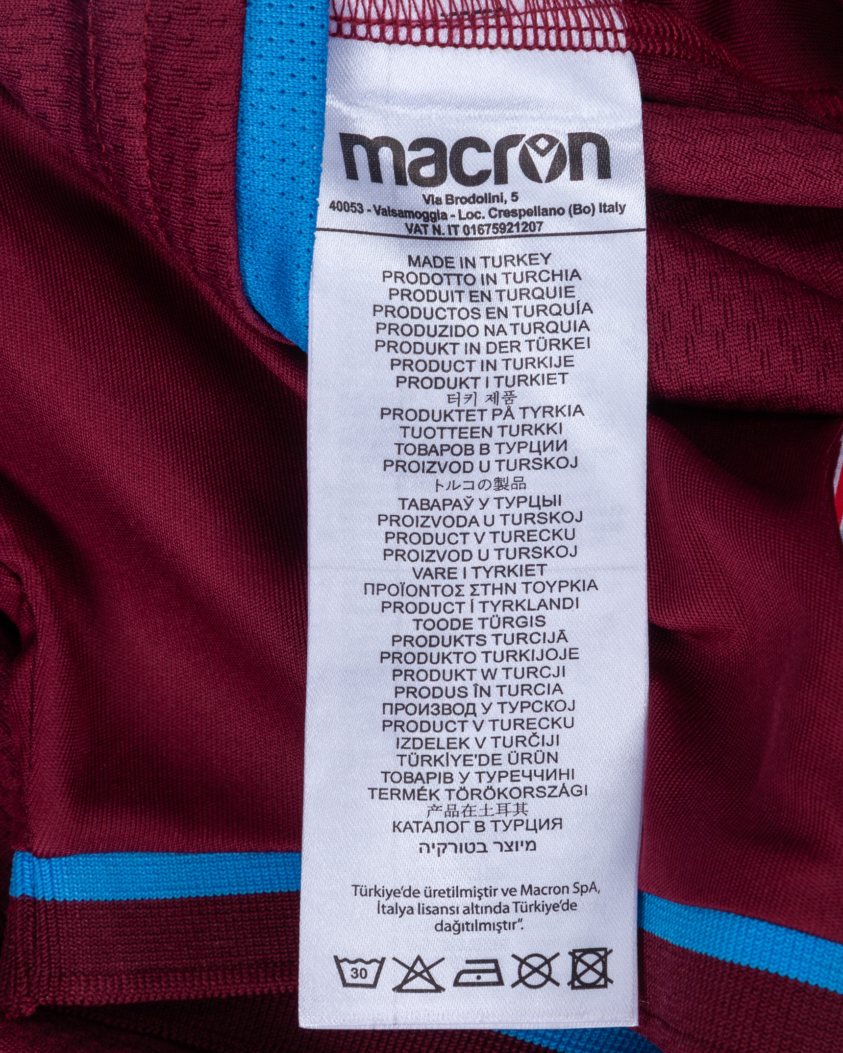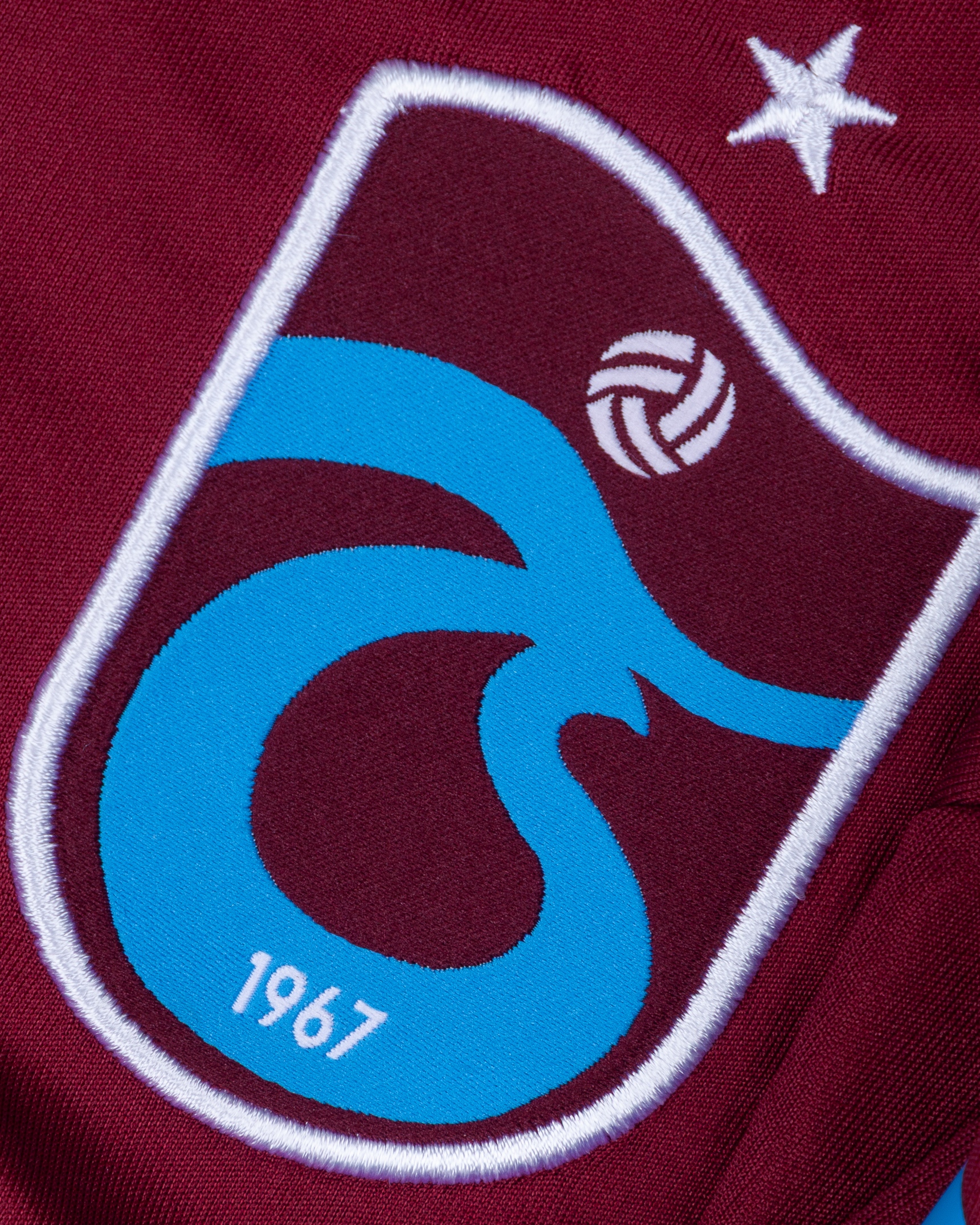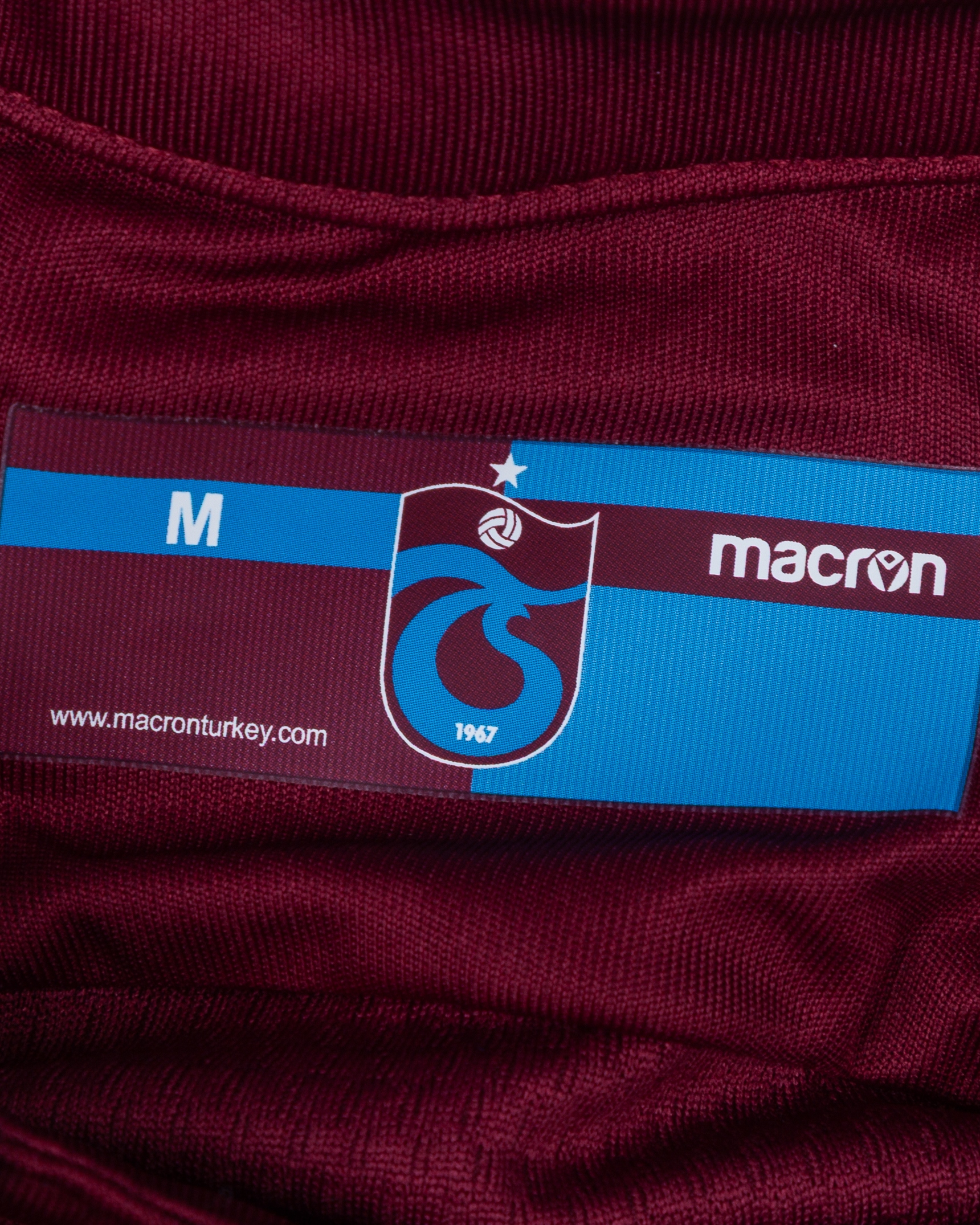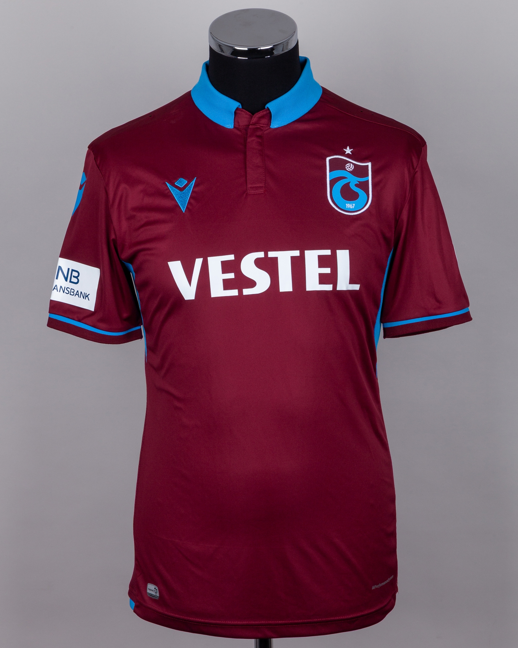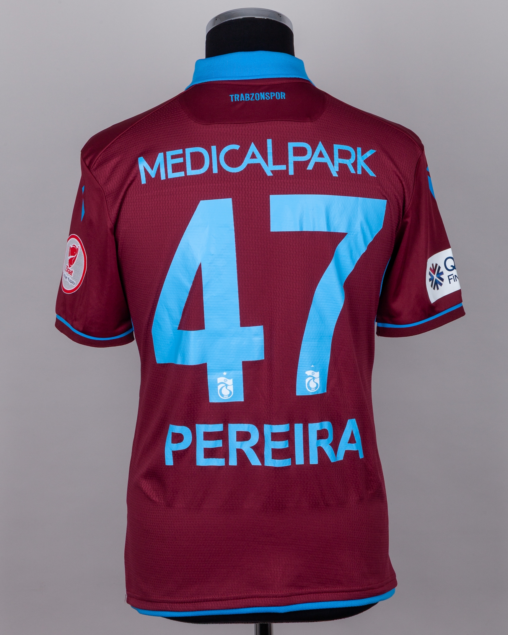 Joao Pereira burgundy and blue No.47 Trabzonspor short-sleeved shirt, 2019-20, Macron, M, with button-up collar and embroidered cloth badge inscribed 1967, the reverse lettered PEREIRA, the right sleeve with Ziraat Turkiye Kupasi (Turkish Cup) flash