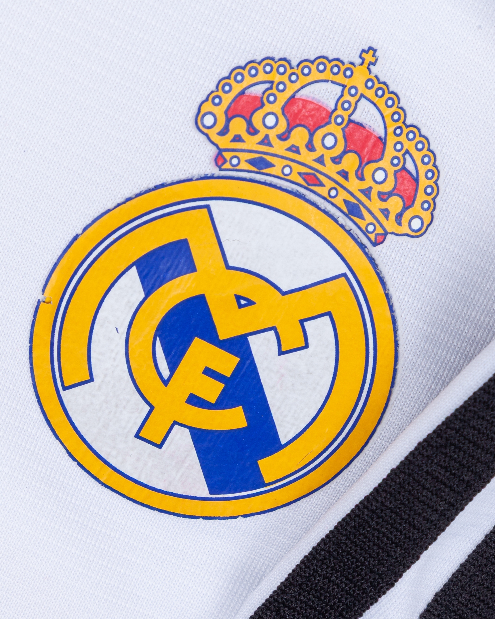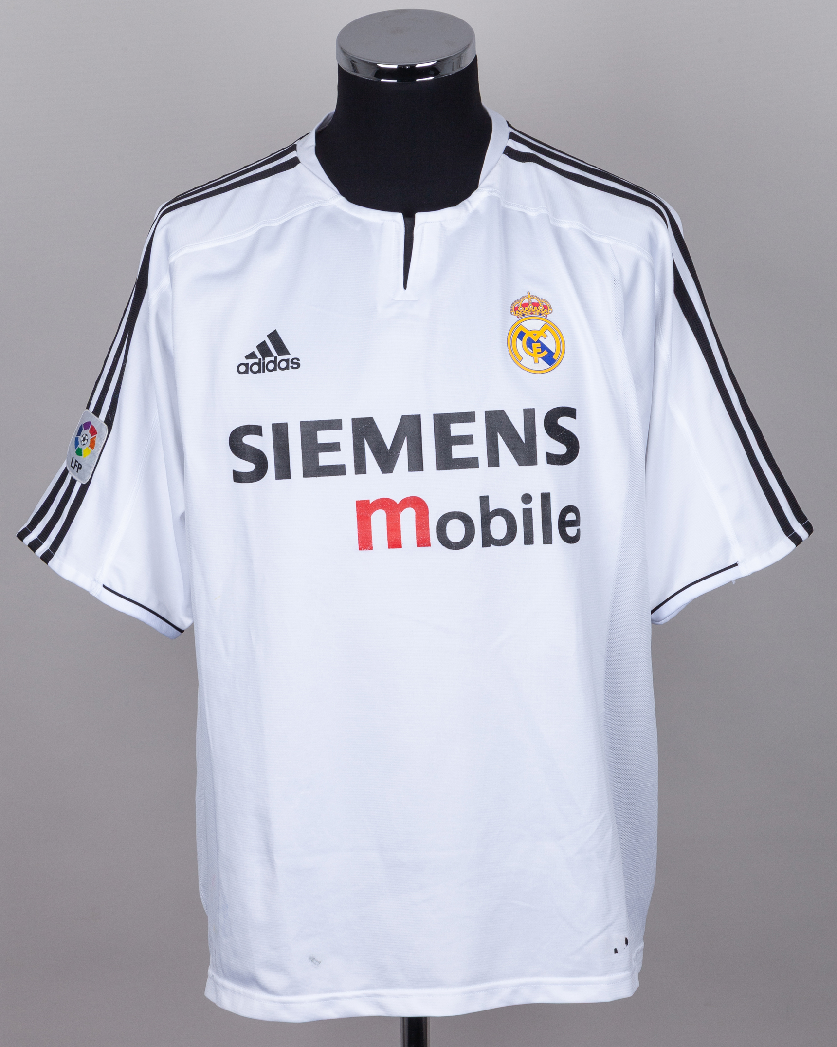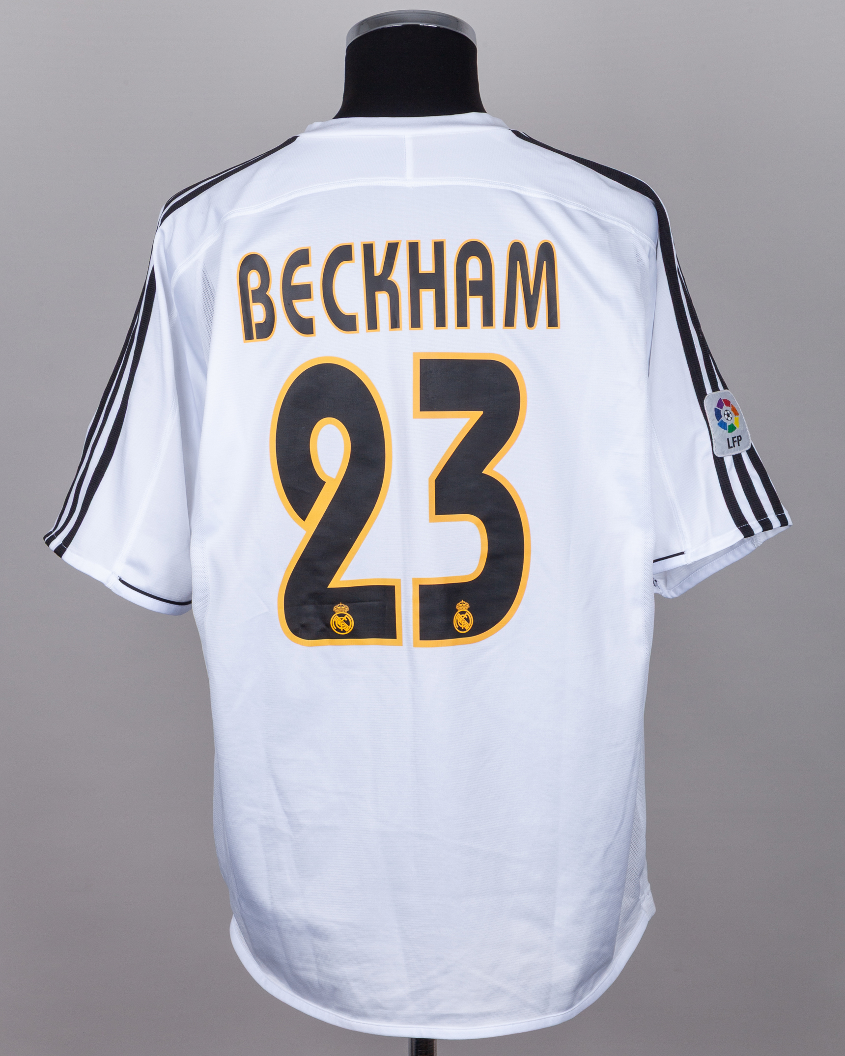 David Beckham white No.23 Real Madrid short-sleeved shirt, 2003-04, Adidas, with crew-neck collar and printed badge, the reverse lettered BECKHAM, the right sleeve with LFP flash, with some staining