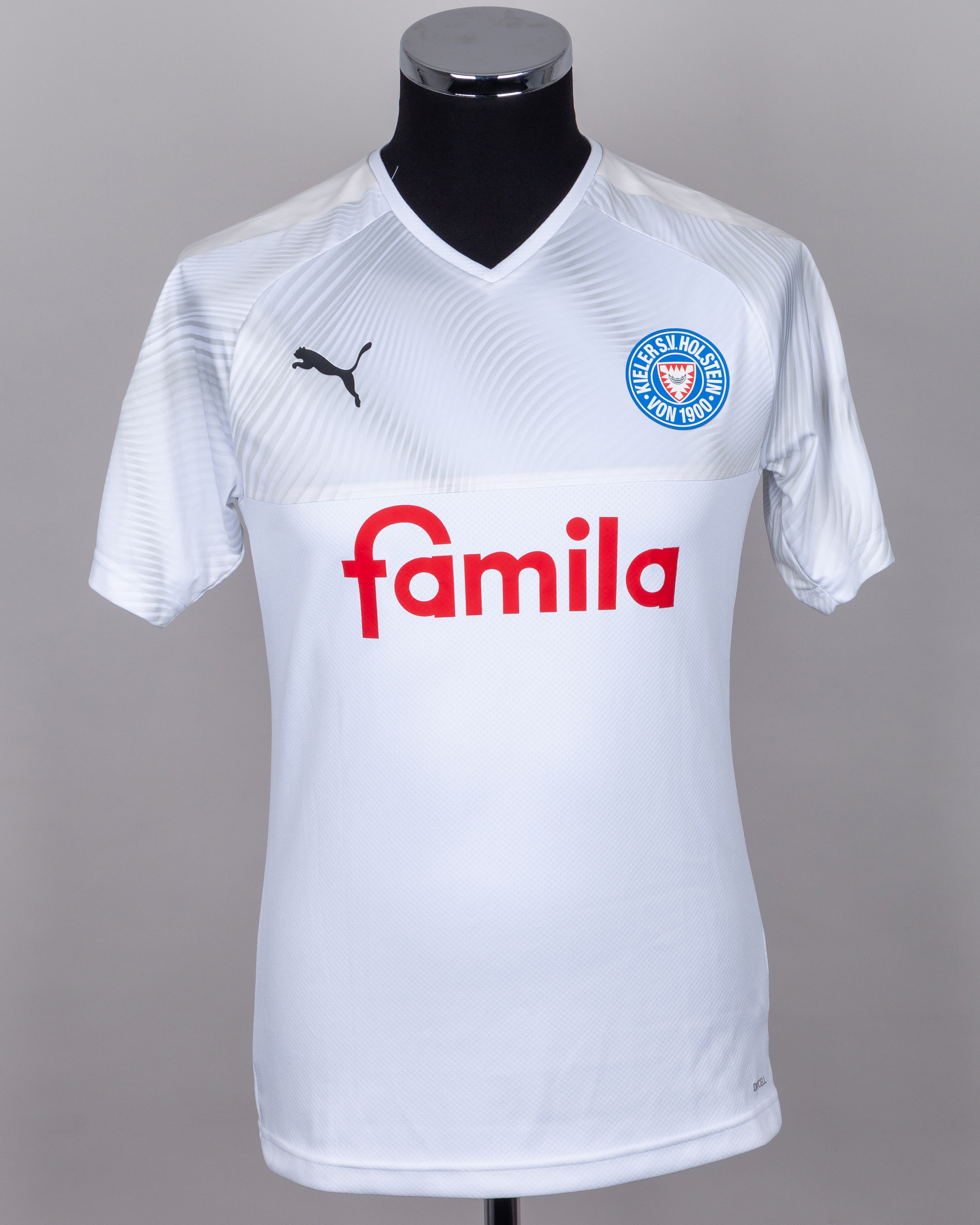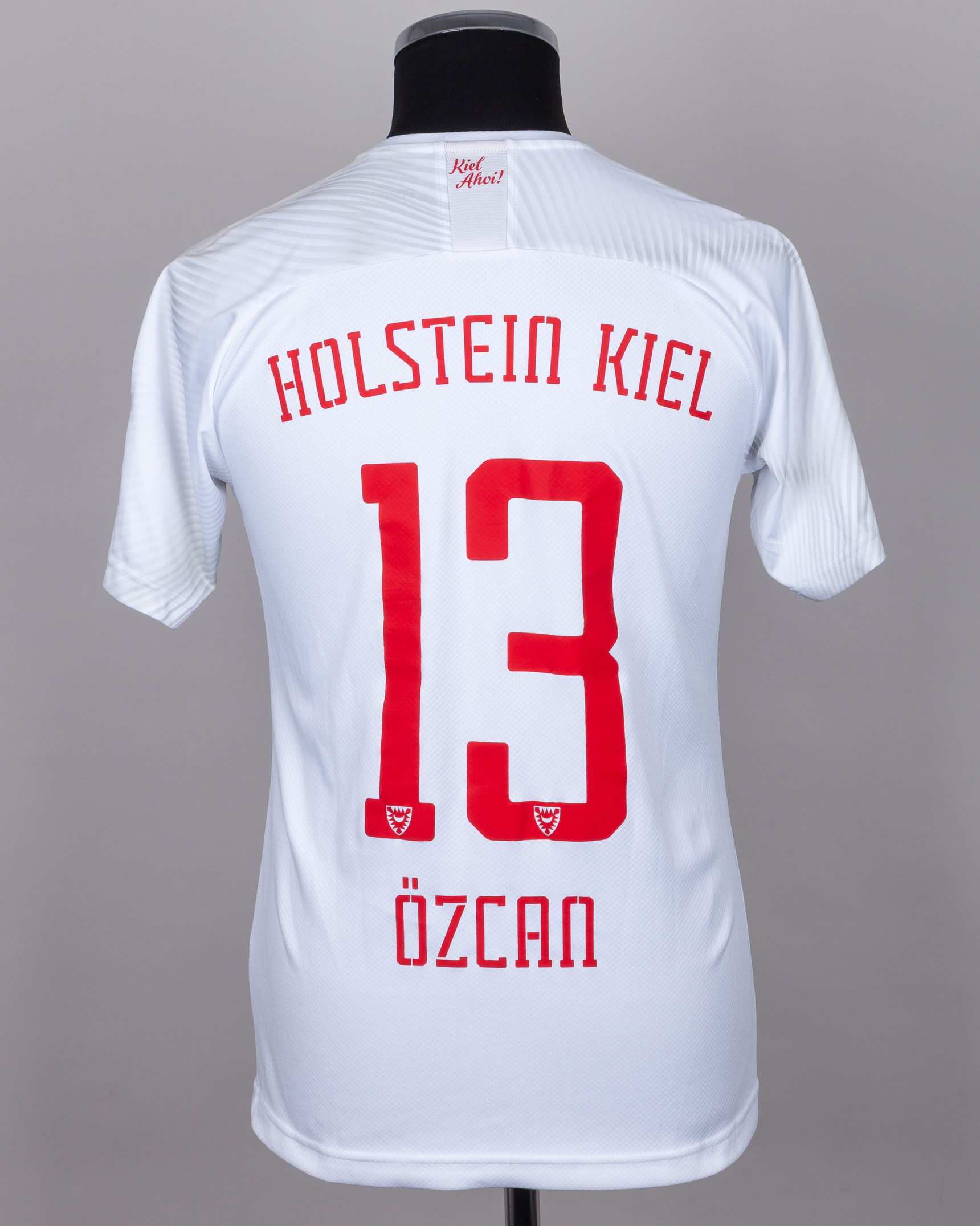 Salih Ozcan white No.13 Holstein Kiel v. Dynamo Dresden short-sleeved shirt, 2019, Puma, M, with v-neck collar and printed badge, the reverse lettered OZCAN, the right sleeve with 2 Bundesliga flash