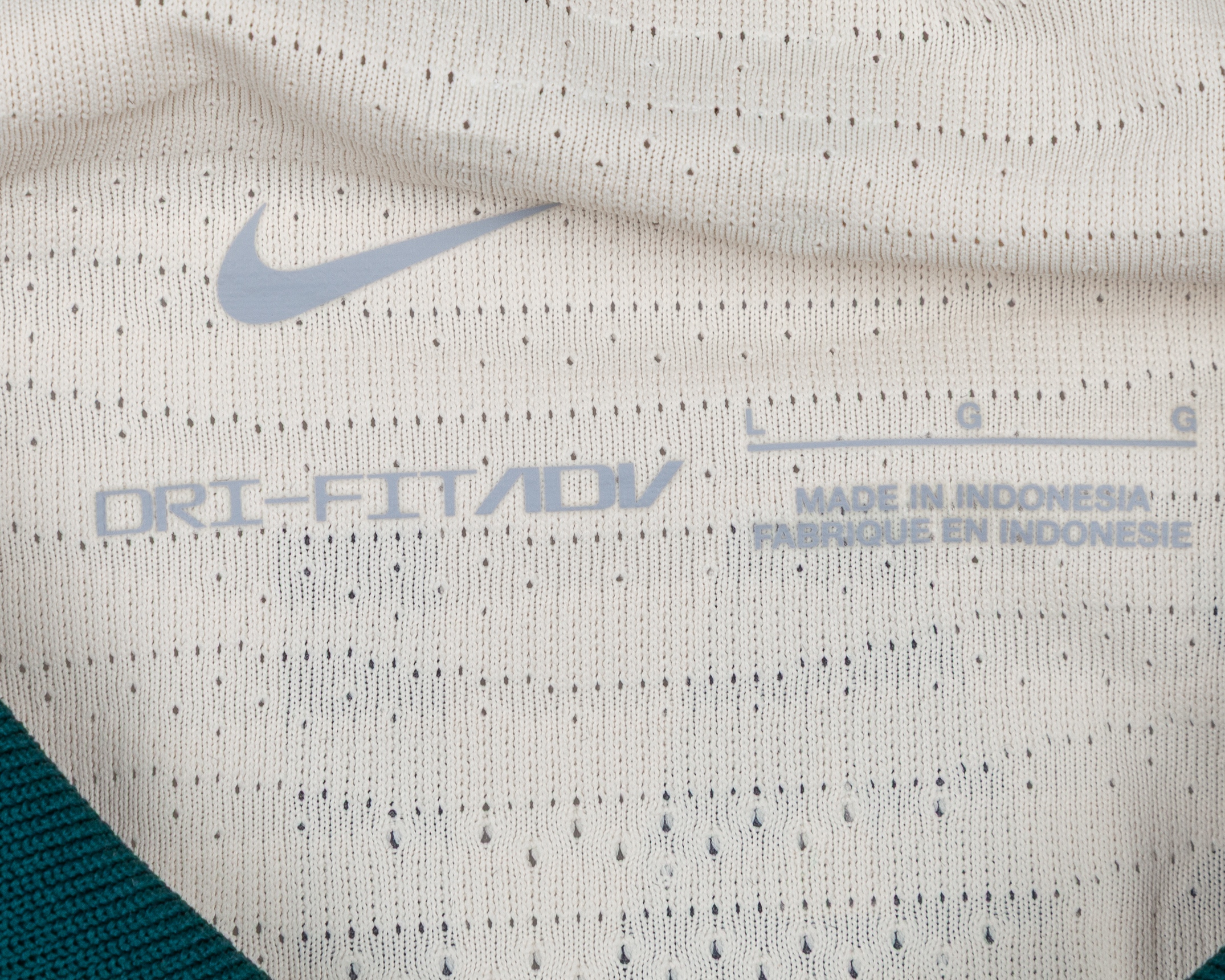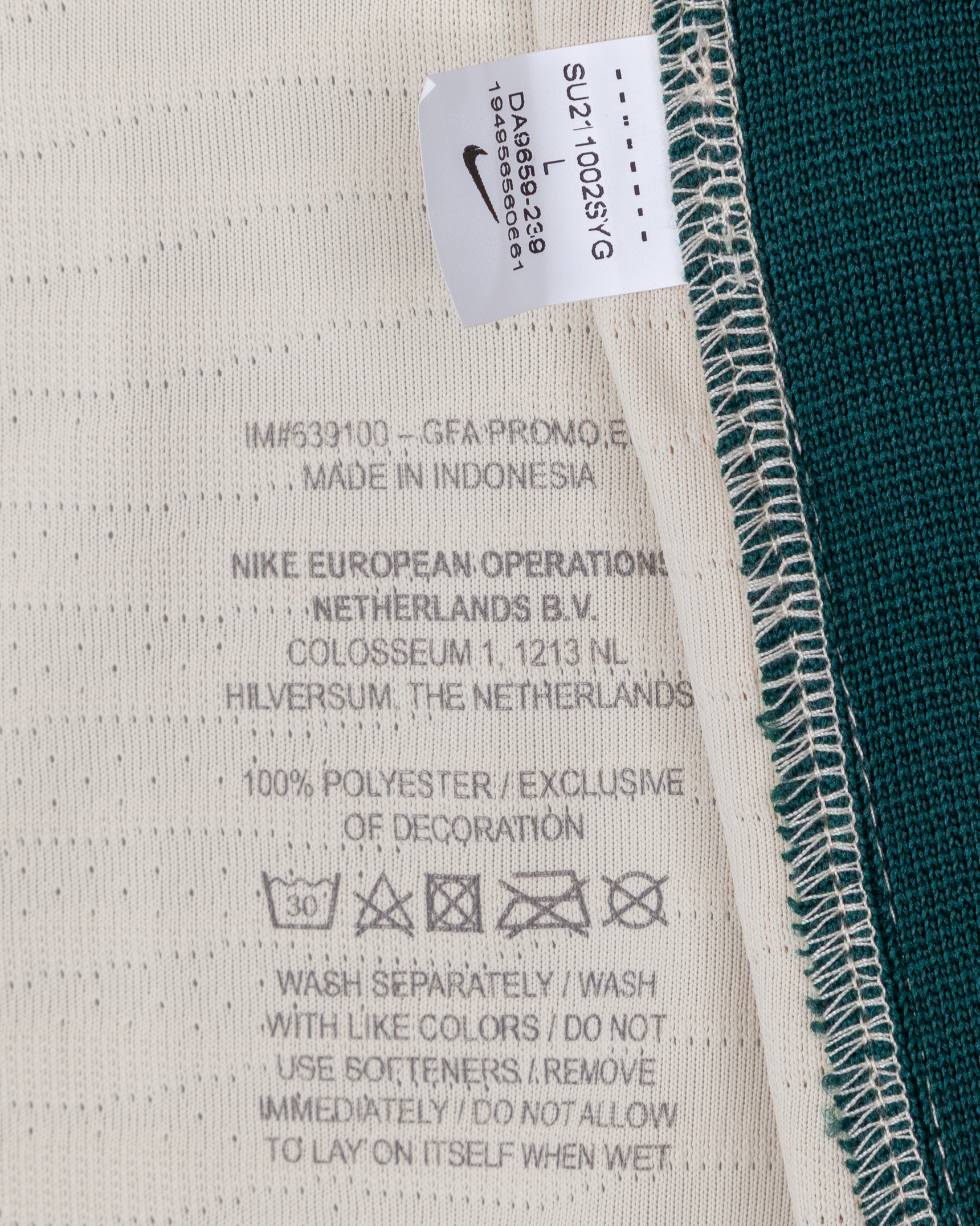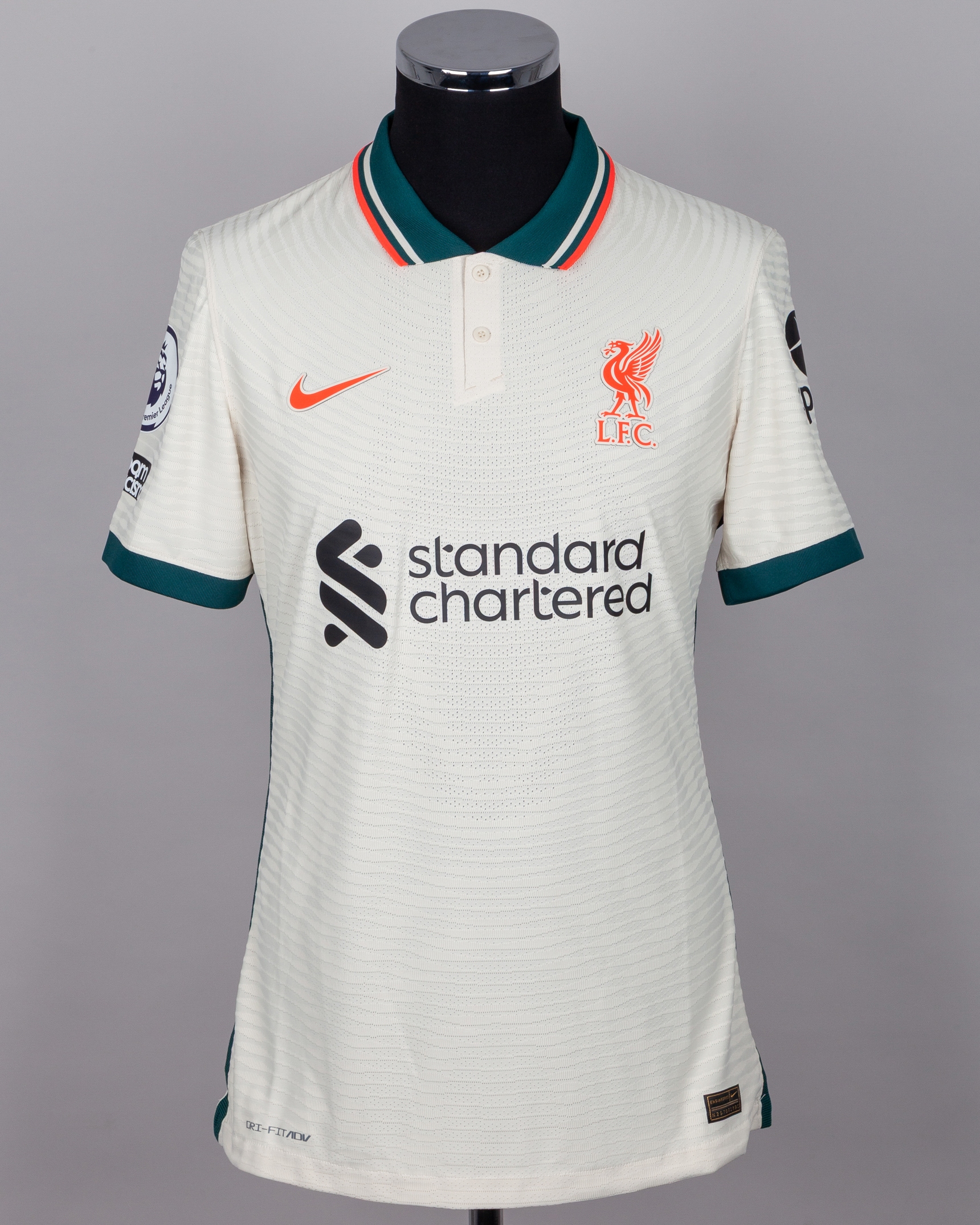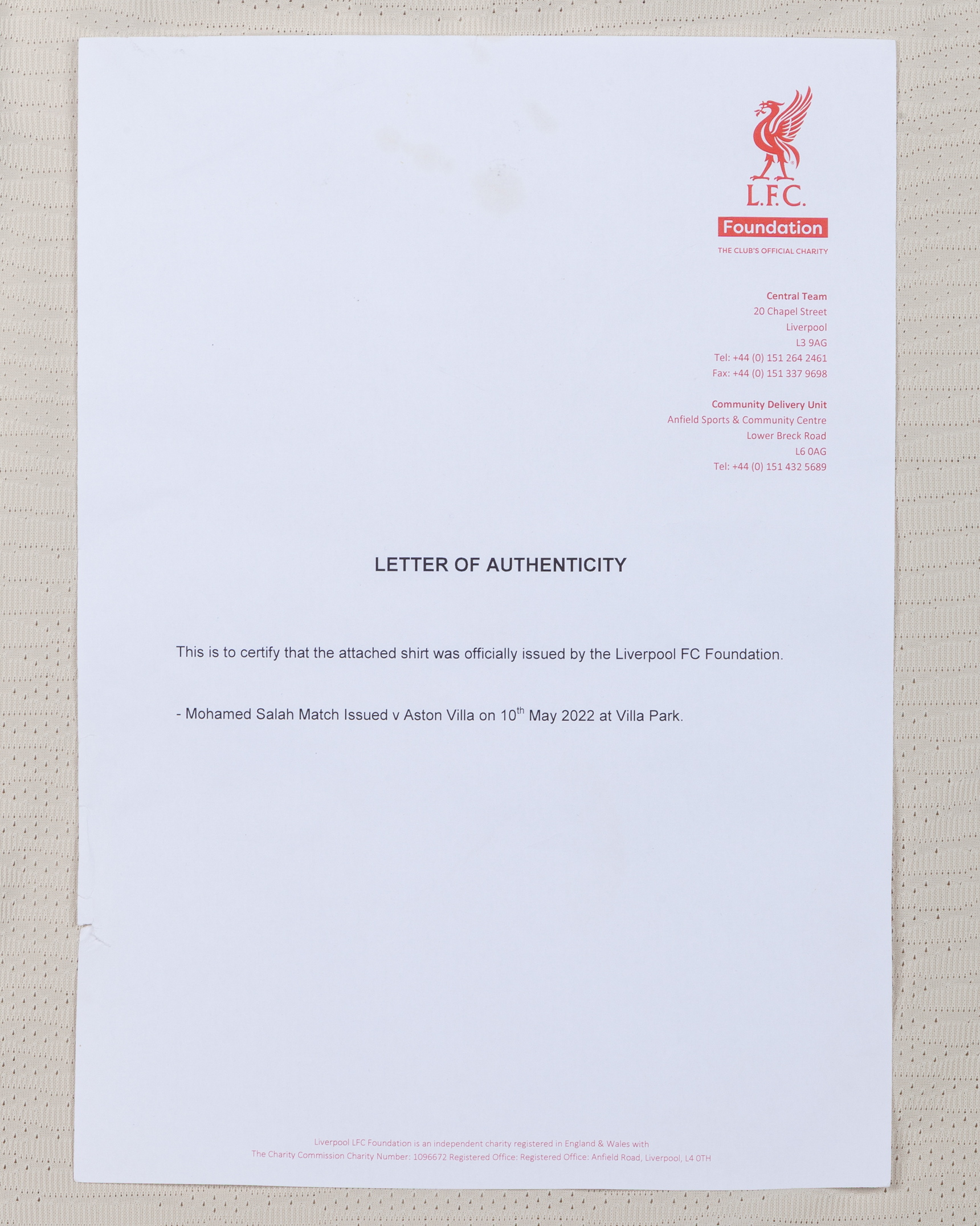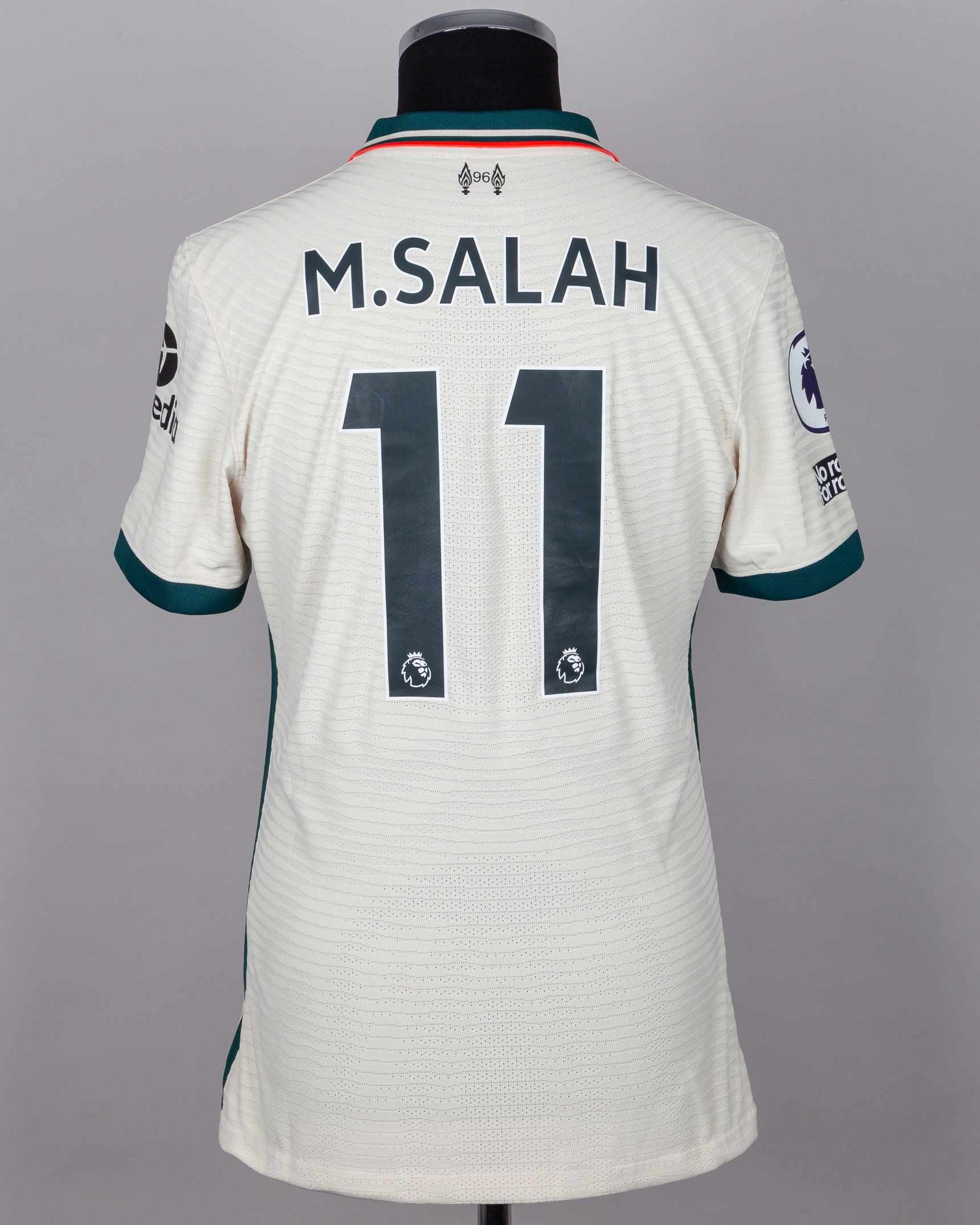 Mohammed Salah cream and green No.11 Liverpool v. Aston Villa short-sleeved shirt, 2022, Nike, L, with button-up collar and printed badge, the reverse lettered M. SALAH, the right sleeve with Premier League flash, with letter of authenticity