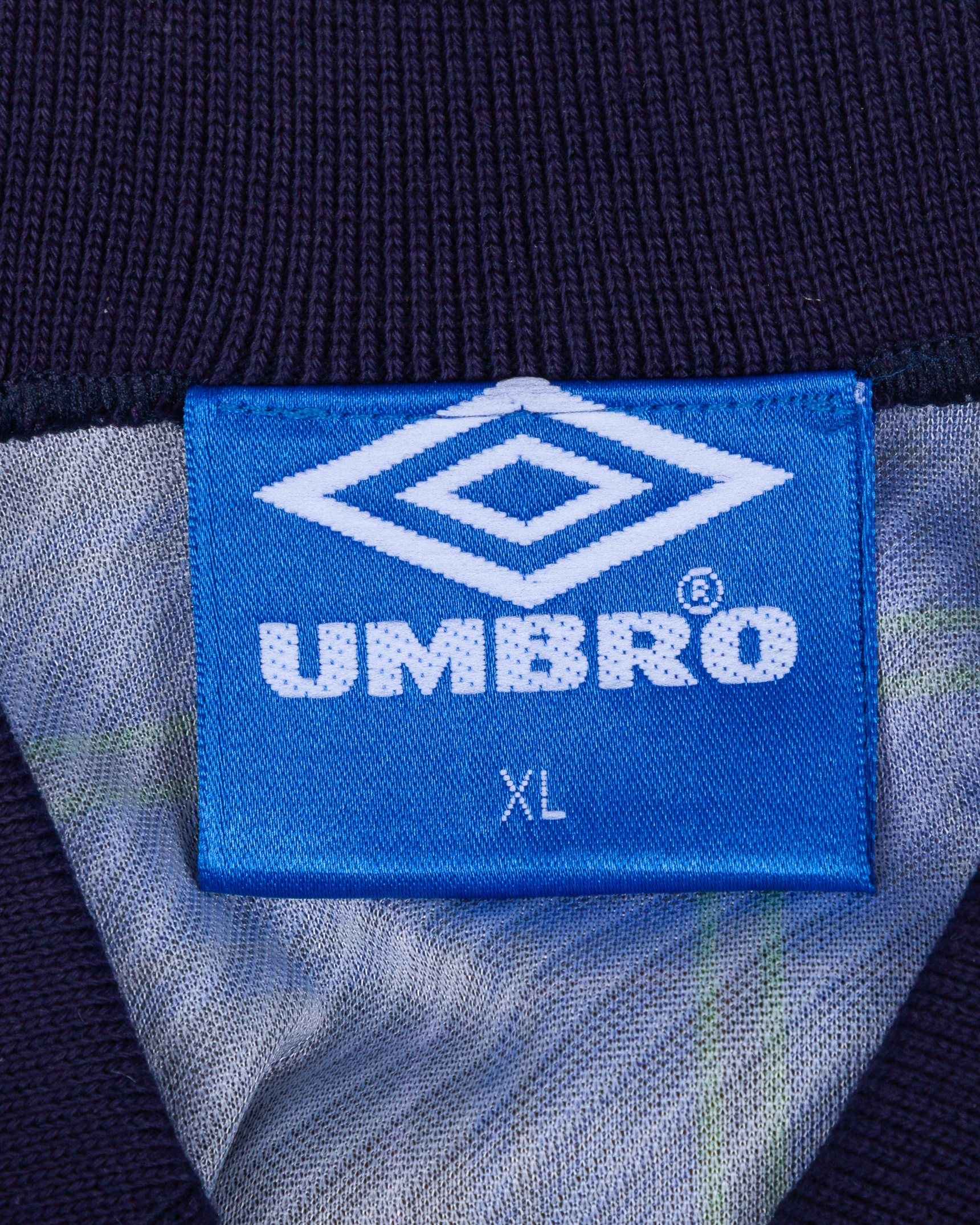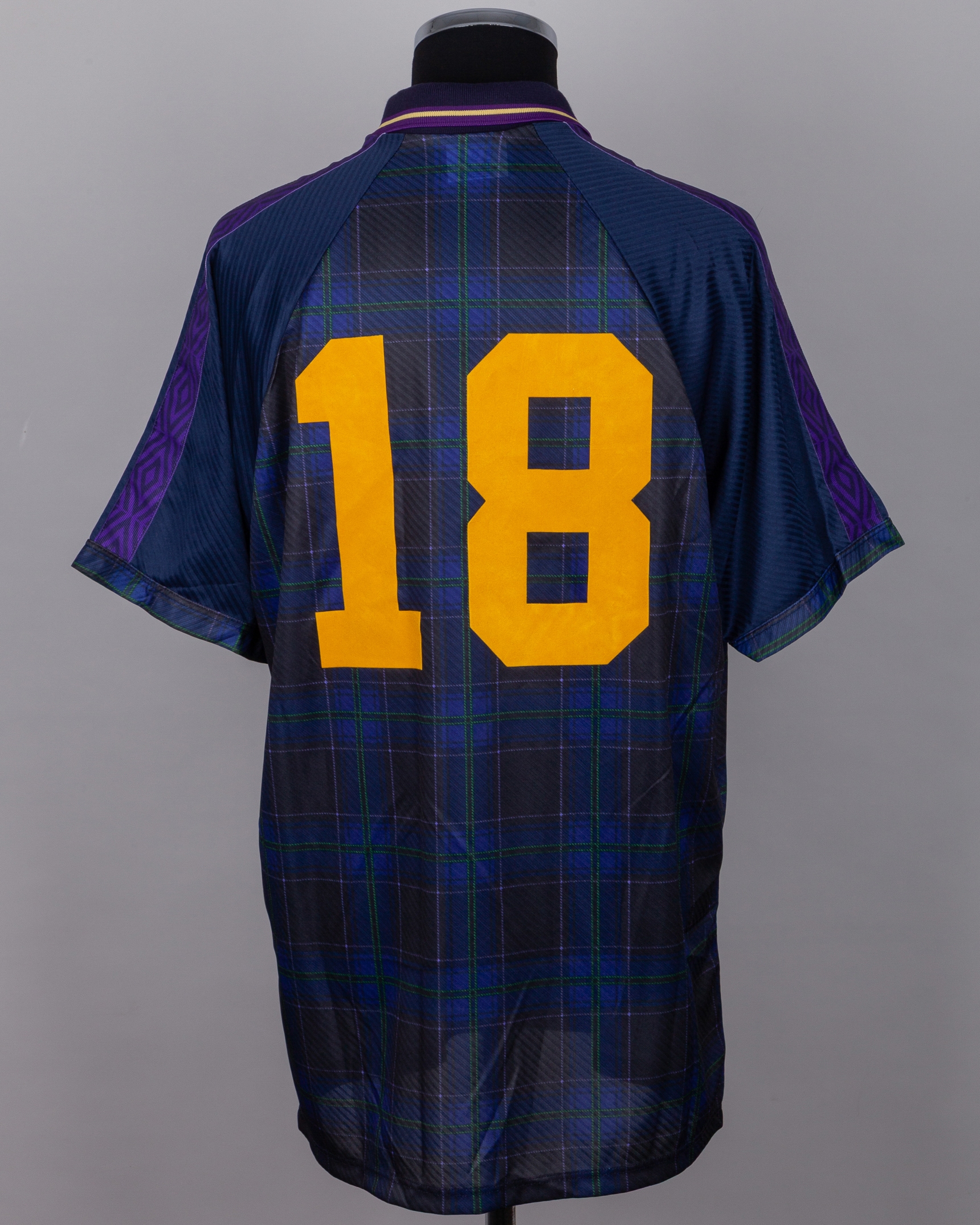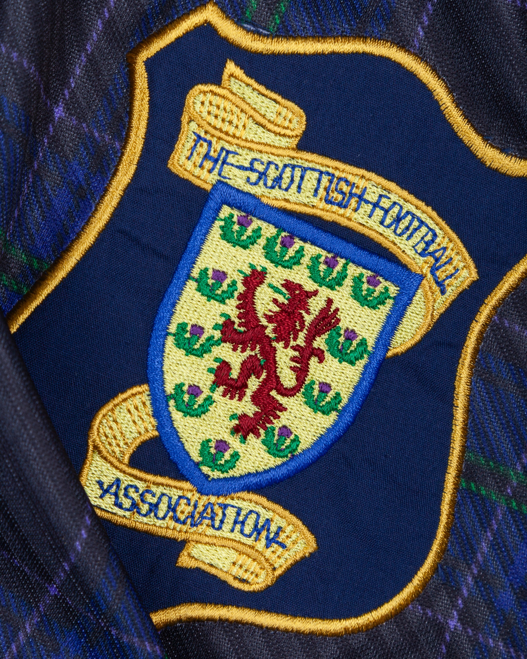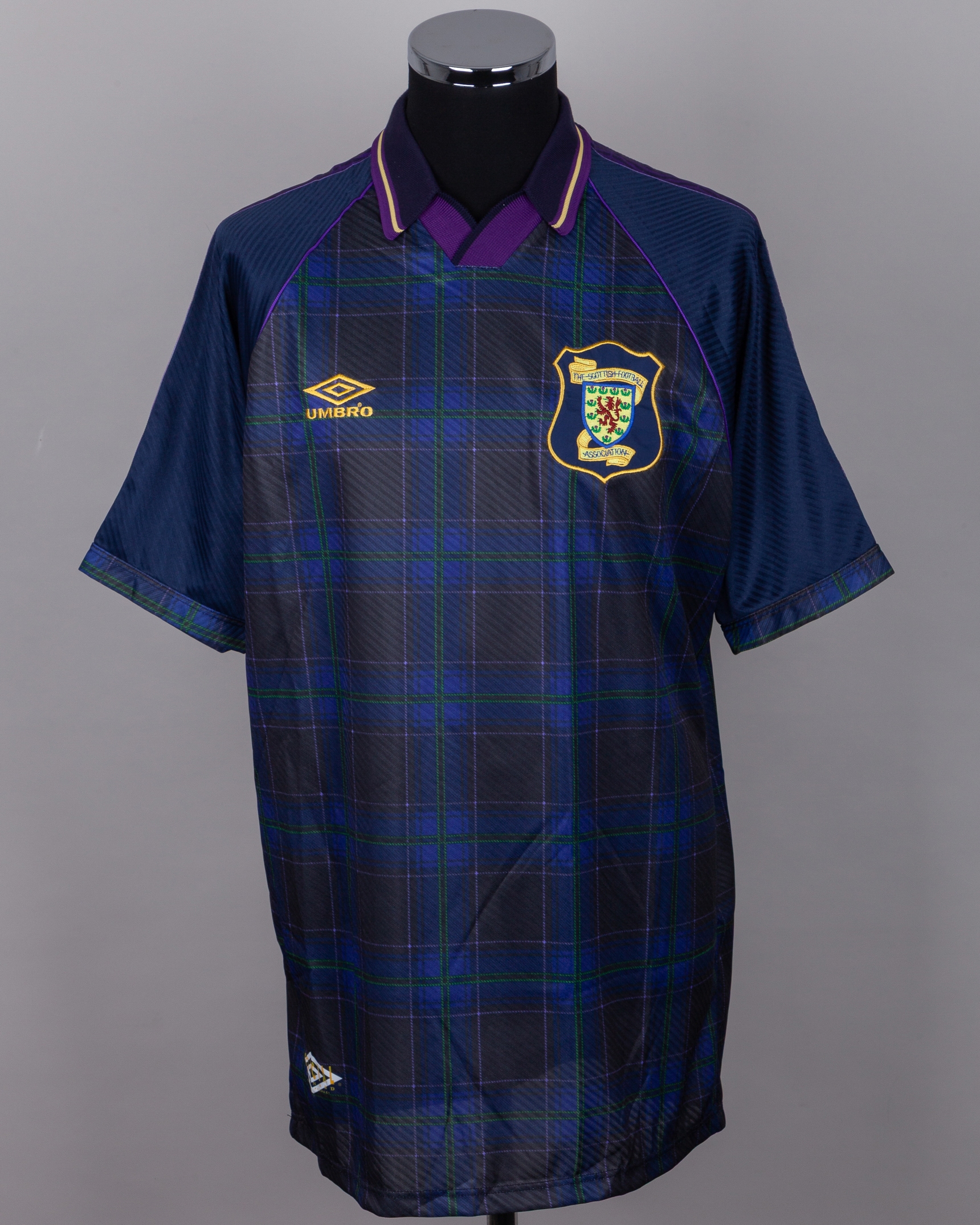 Blue tartan No.18 Scotland short-sleeved shirt, 1994-96, Umbro, XL, with v-neck collar and embroidered cloth badge inscribed THE SCOTTISH FOOTBALL ASSOCIAITION