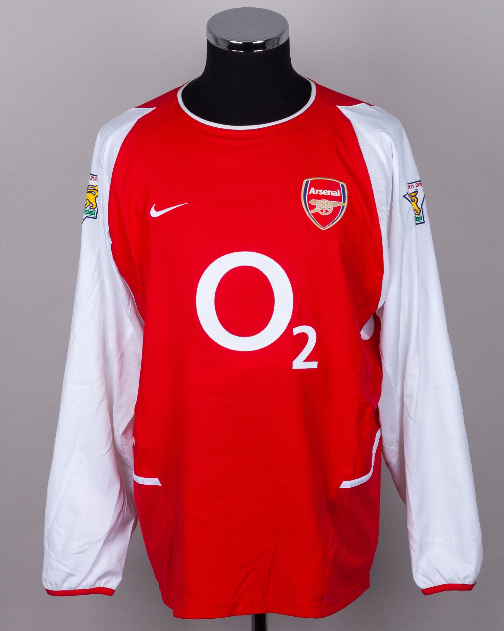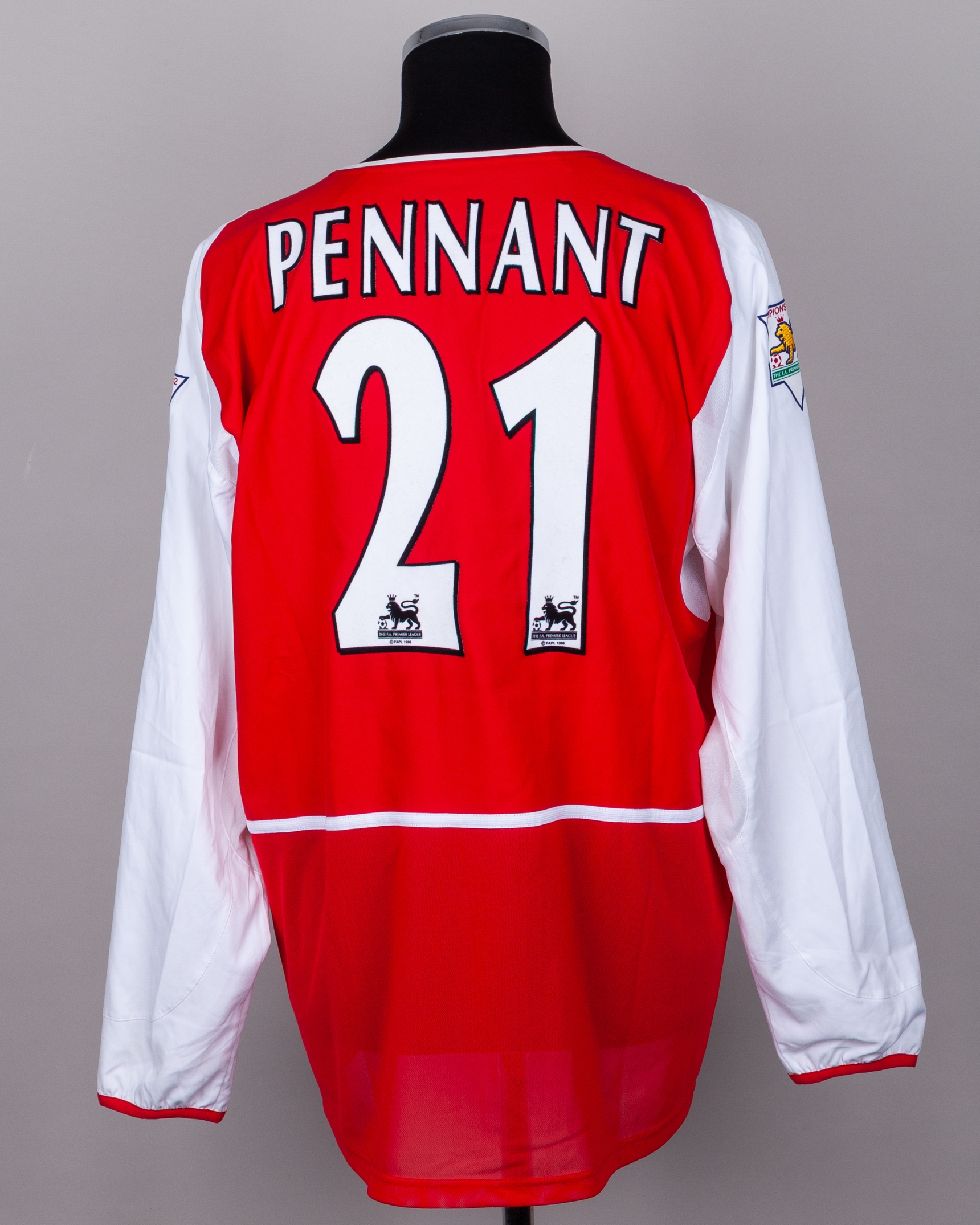 Jermaine Pennant red and white No.21 Arsenal dual layer long-sleeved shirt, 2001-02, Nike, L, with crew-neck collar and embroidered cloth badge inscribed Arsenal, the reverse lettered PENNANT, the sleeves with Champions 2002-02 The F.A.Premier league flashes
