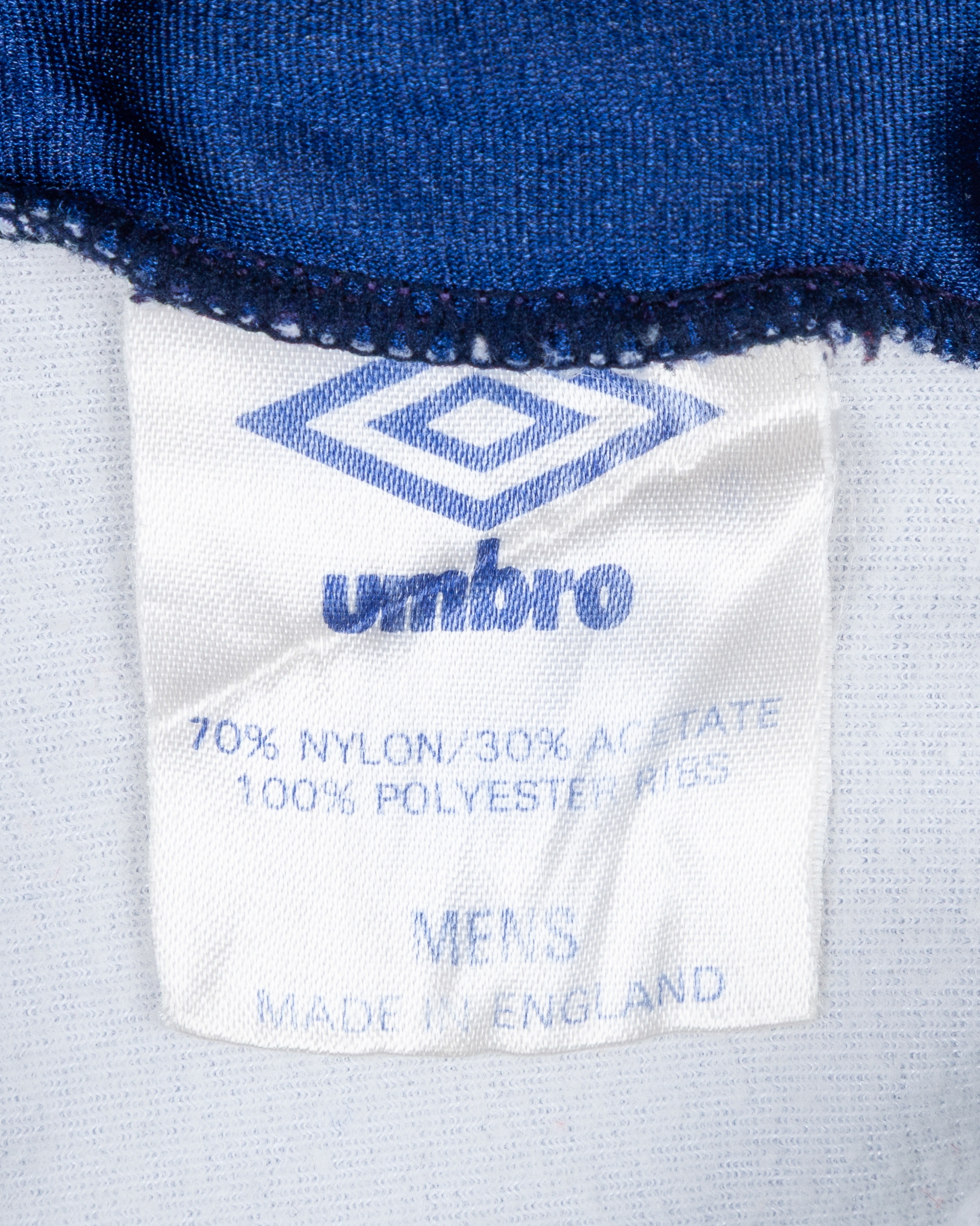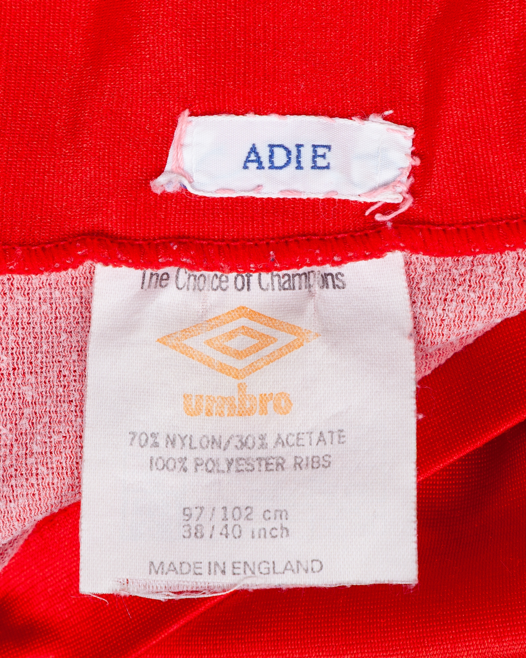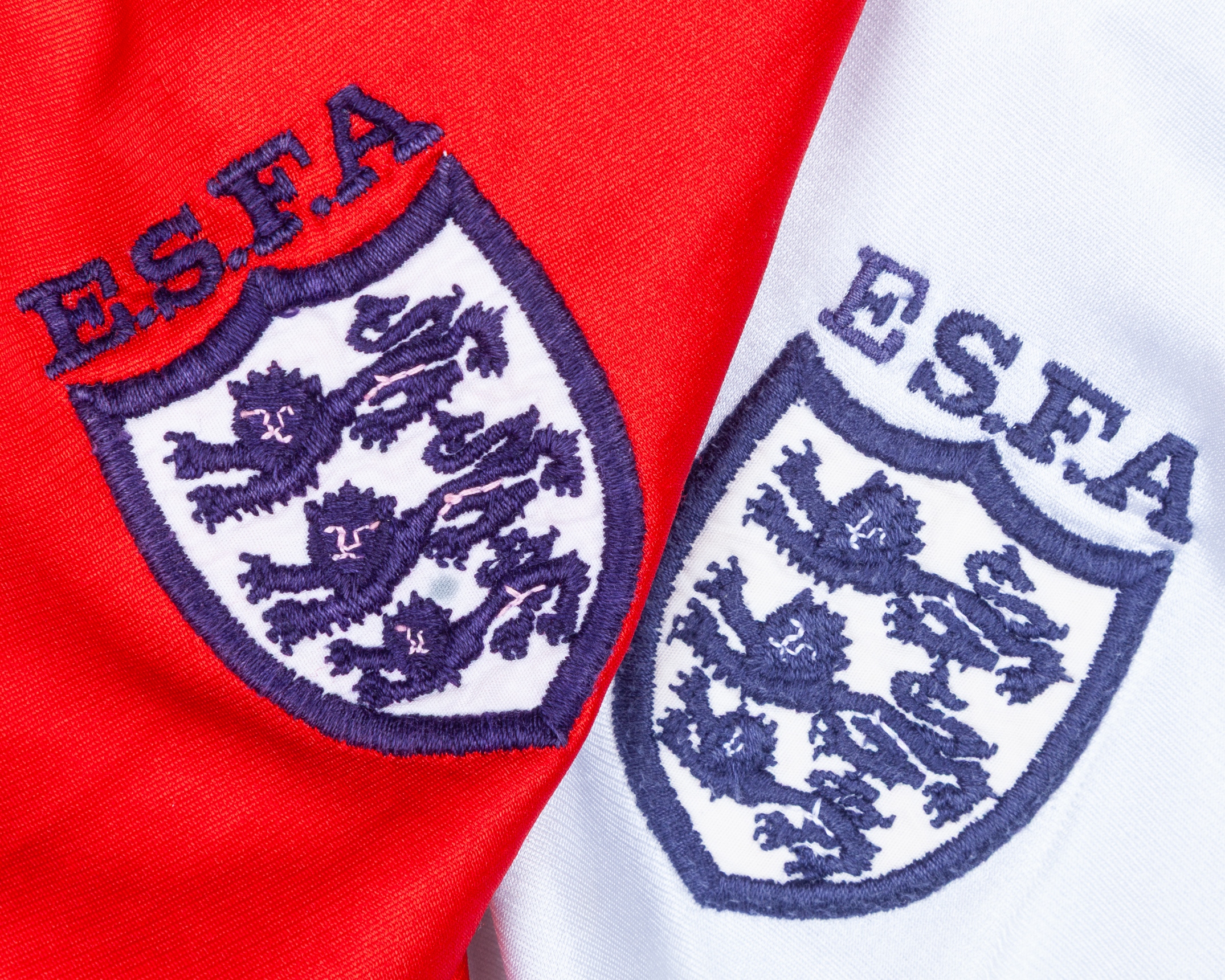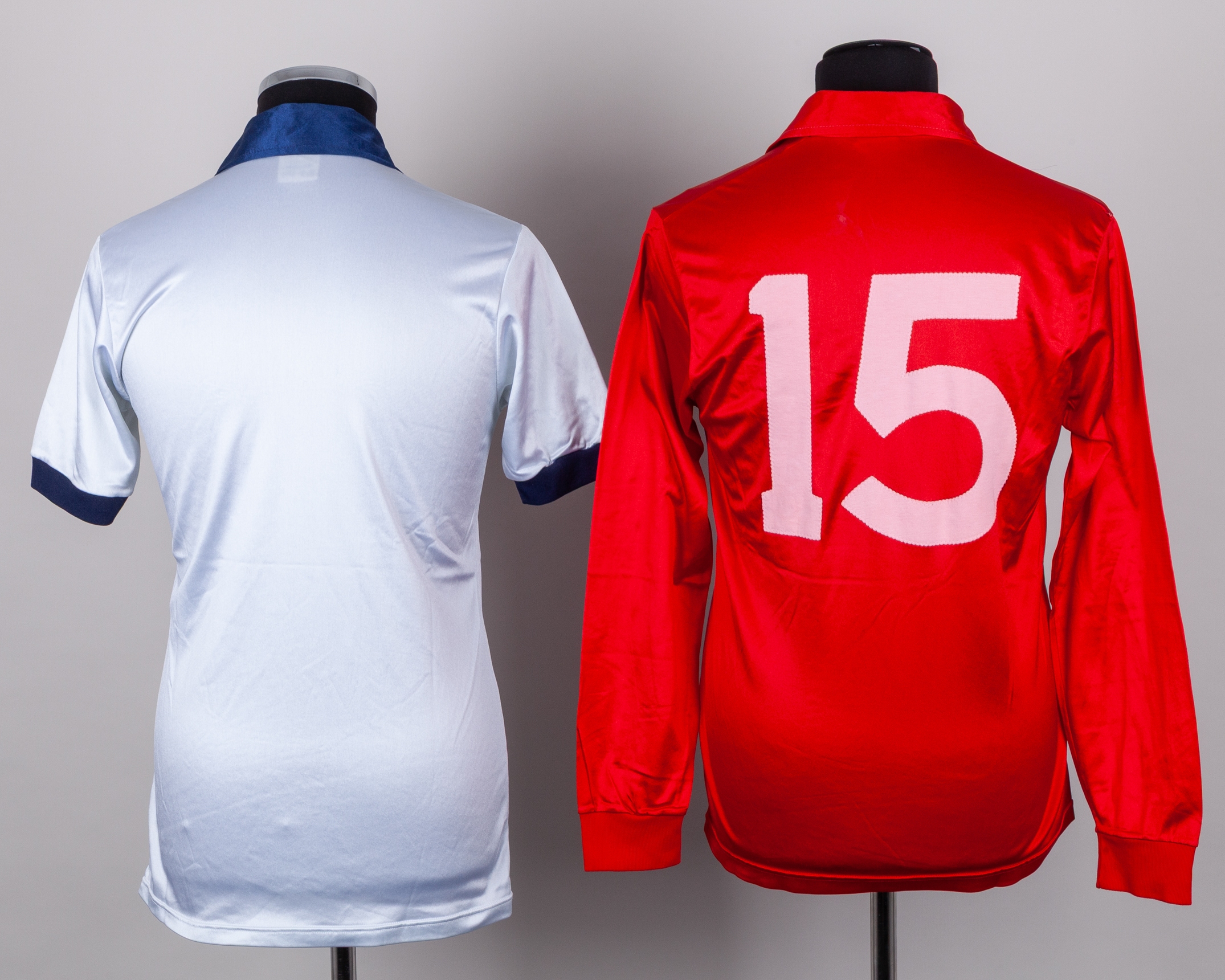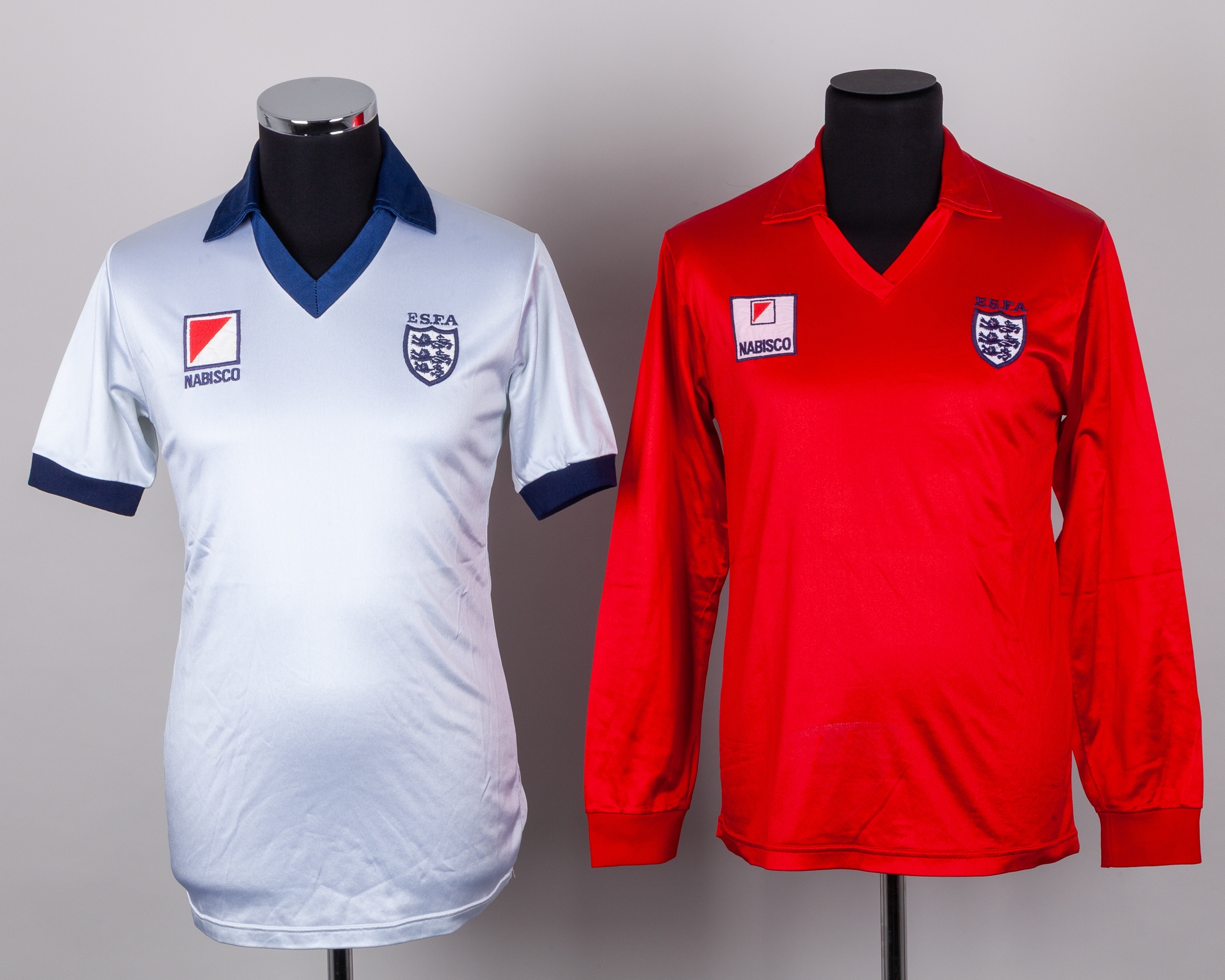 Red No.15 England School Boys long-sleeved shirt, 1980s, Umbro, 38/40in., collar with ADIE label, with v-neck collar and embroidered badge inscribed E.S.F.A. and a white unnumbered example (2)