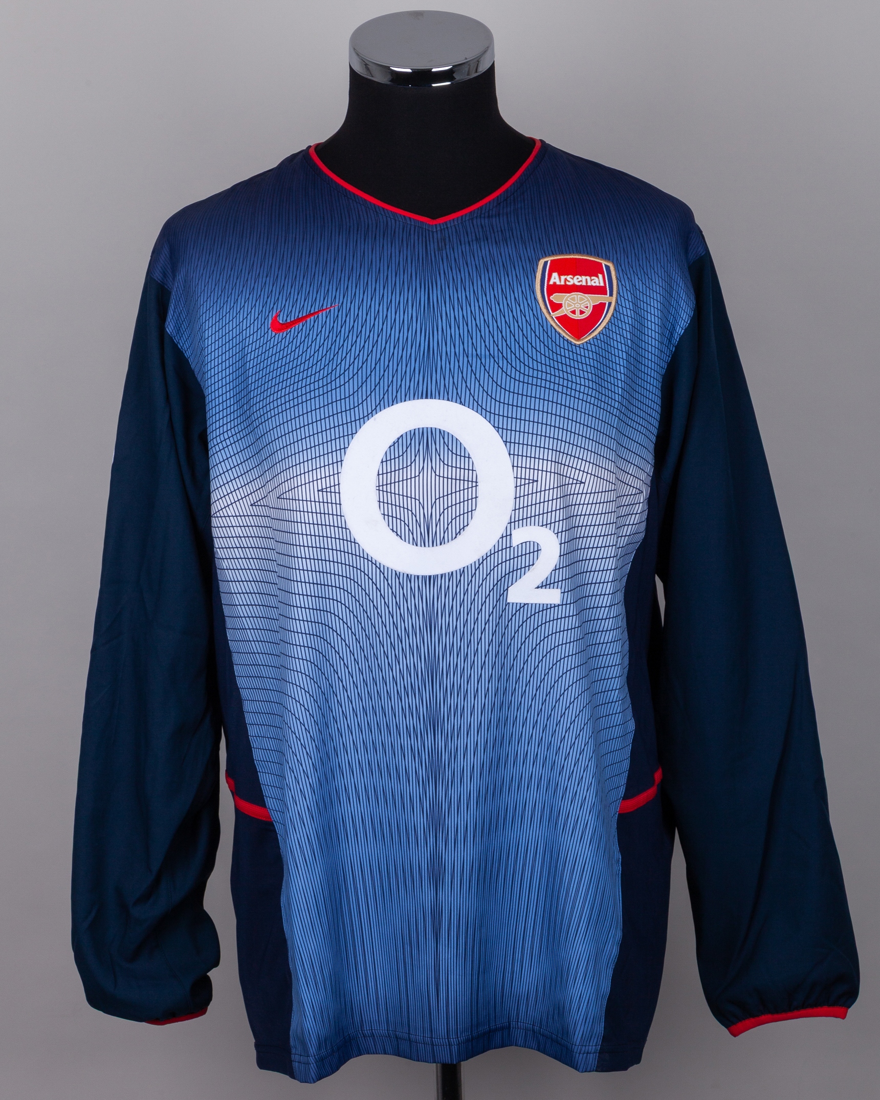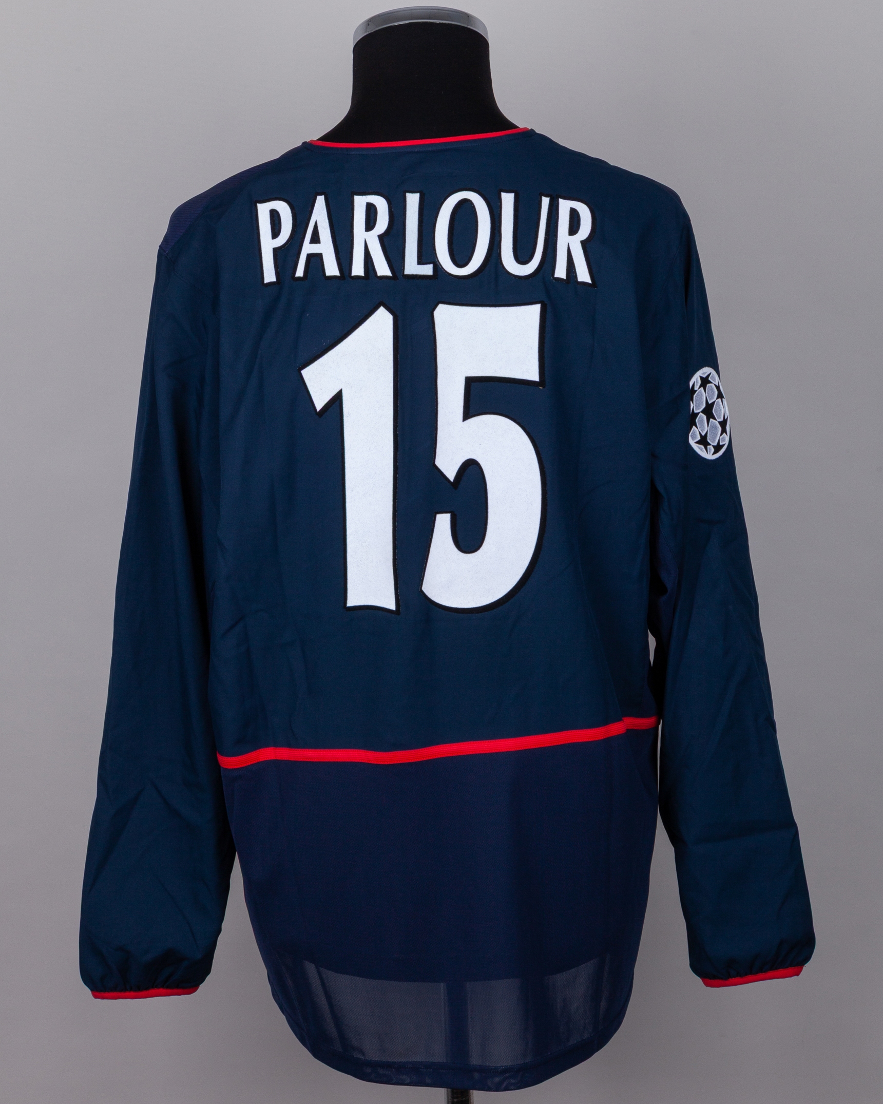 Ray Parlour blue No.15 Arsenal dual layer long-sleeved shirt, 2002-03, Nike, with v-neck collar and embroidered cloth badge inscribed Arsenal, the reverse lettered PARLOUR, the right sleeve with Champions League flash