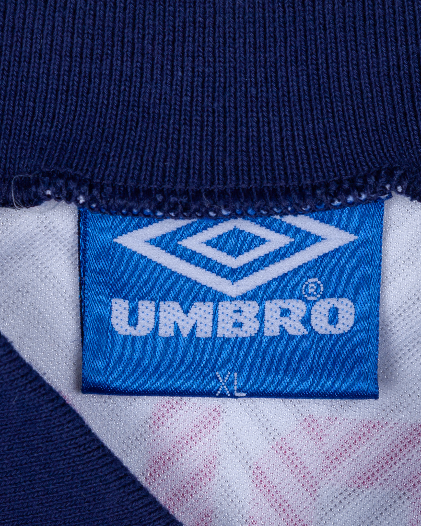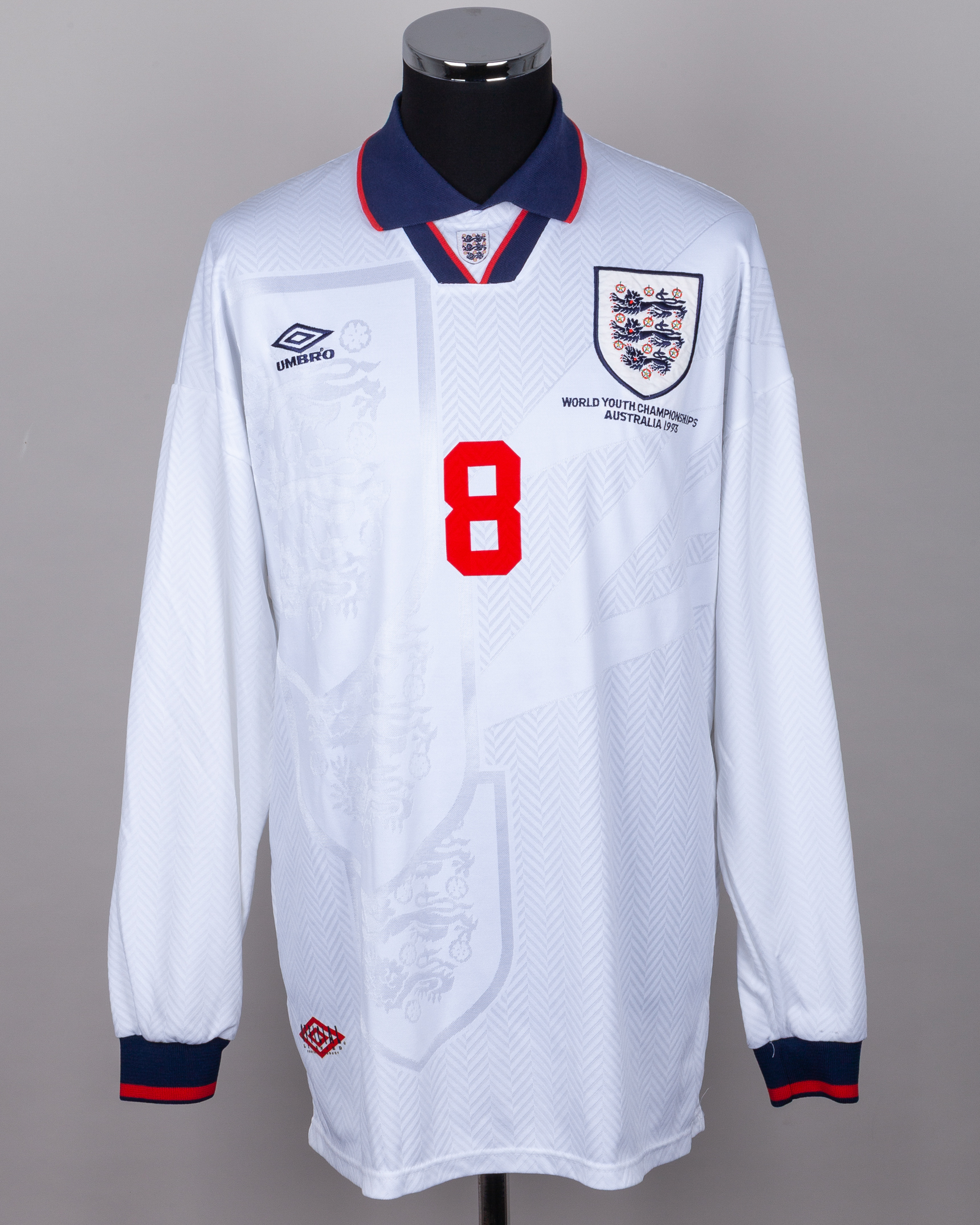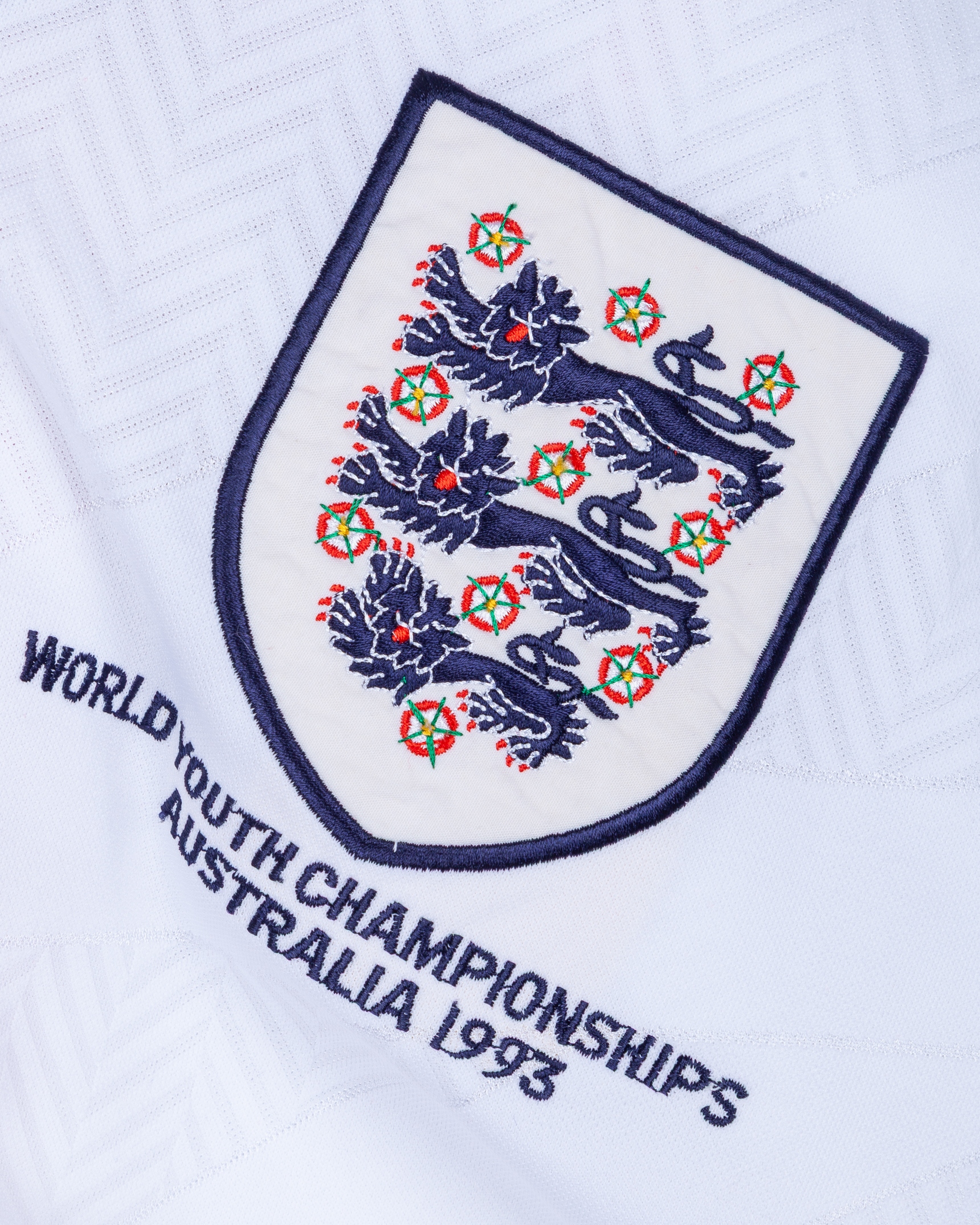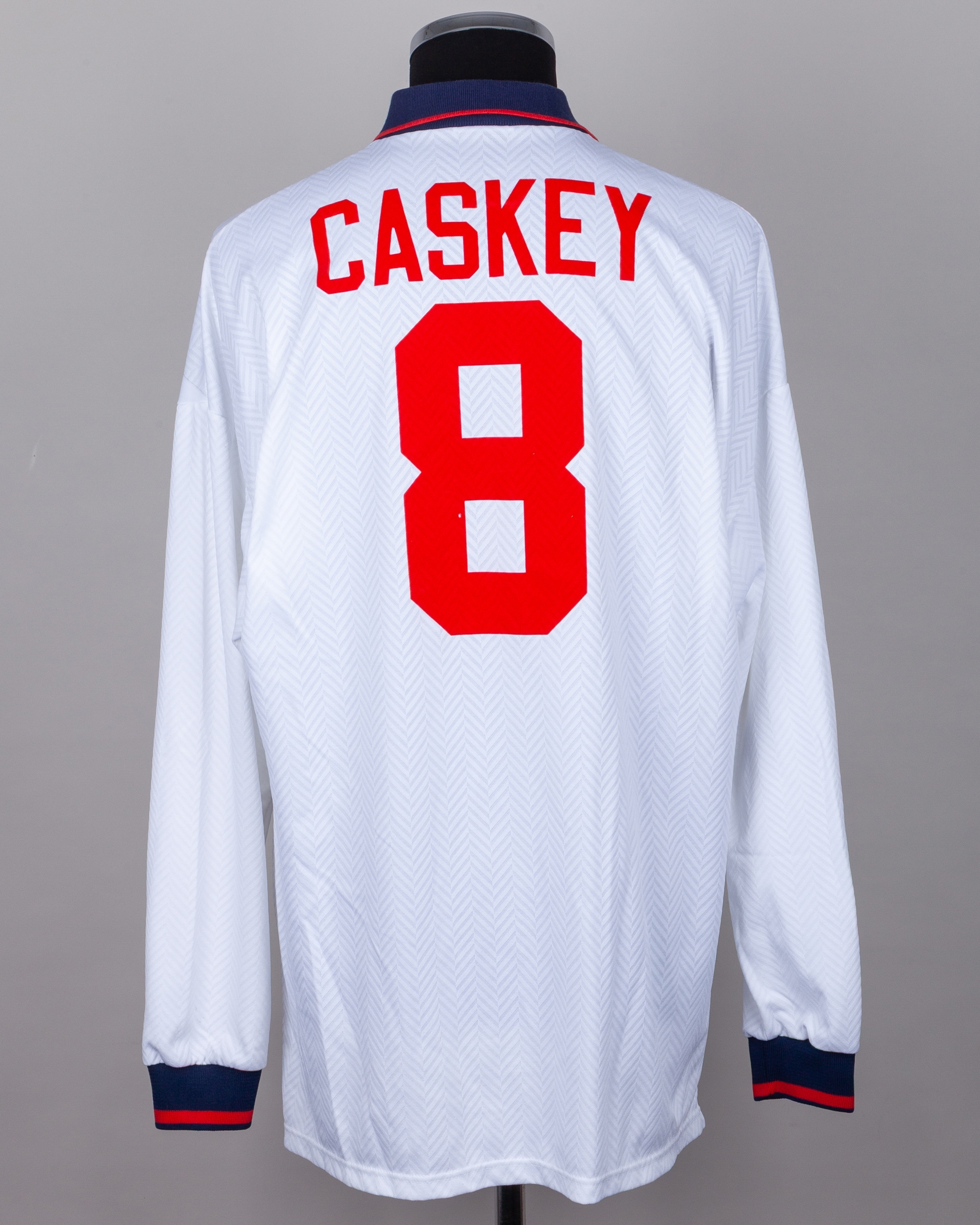 Darren Caskey White and blue No.8 England Youth long-sleeved shirt, 1993, Umbro, XL, with v-neck collar and embroidered cloth badge inscribed WORLD YOUTH CHAMPIONSHIPS AUSTRALIA 1993, the reverse lettered CASKEY