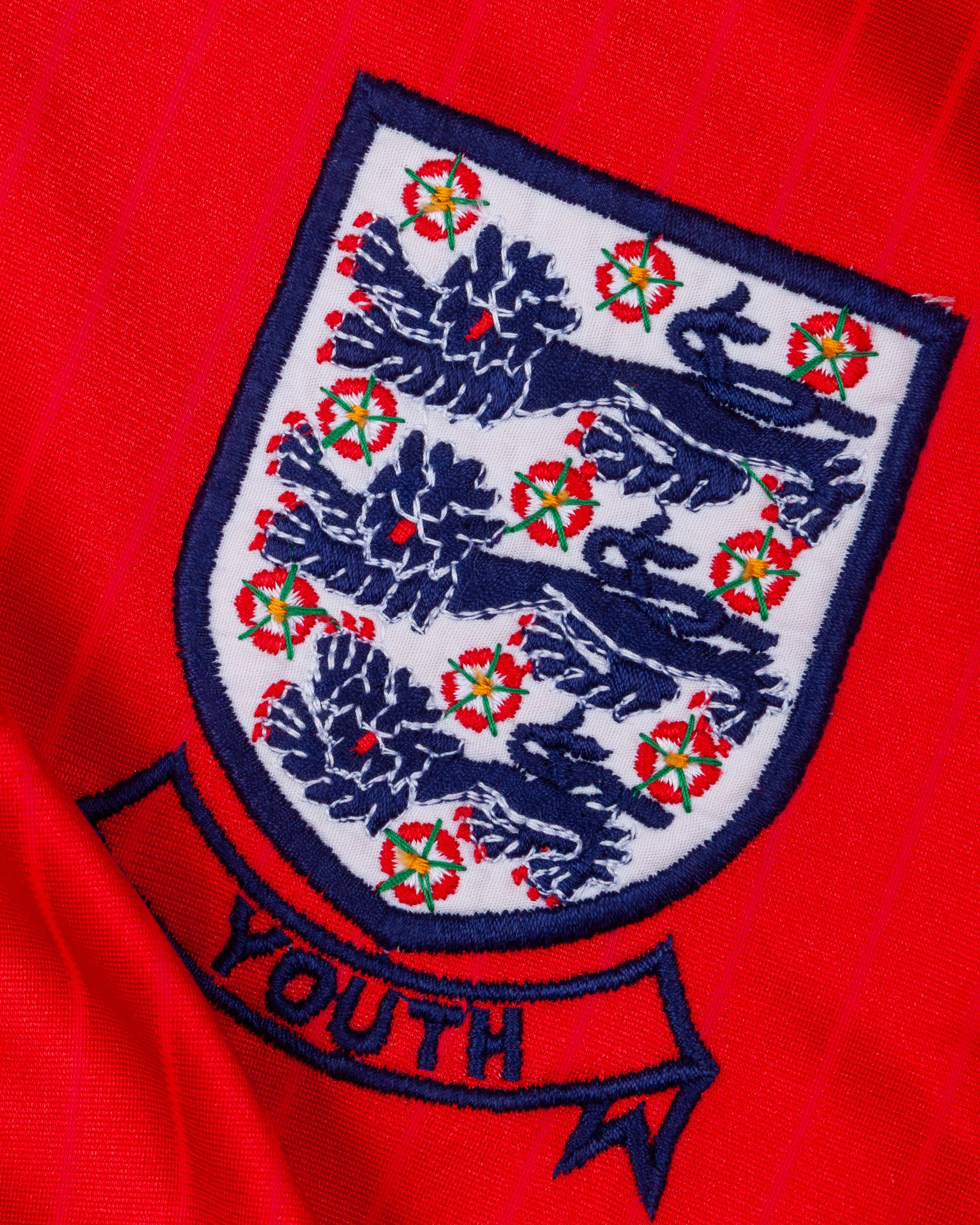 Red No.10 England Youth short-sleeved shirt, 1980s, Umbro, Mens, with v-neck collar and embroidered cloth badge inscribed YOUTH