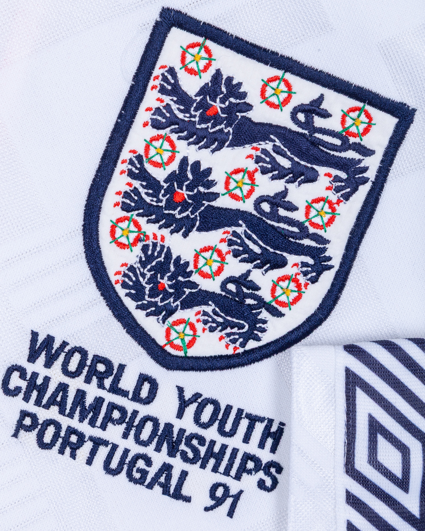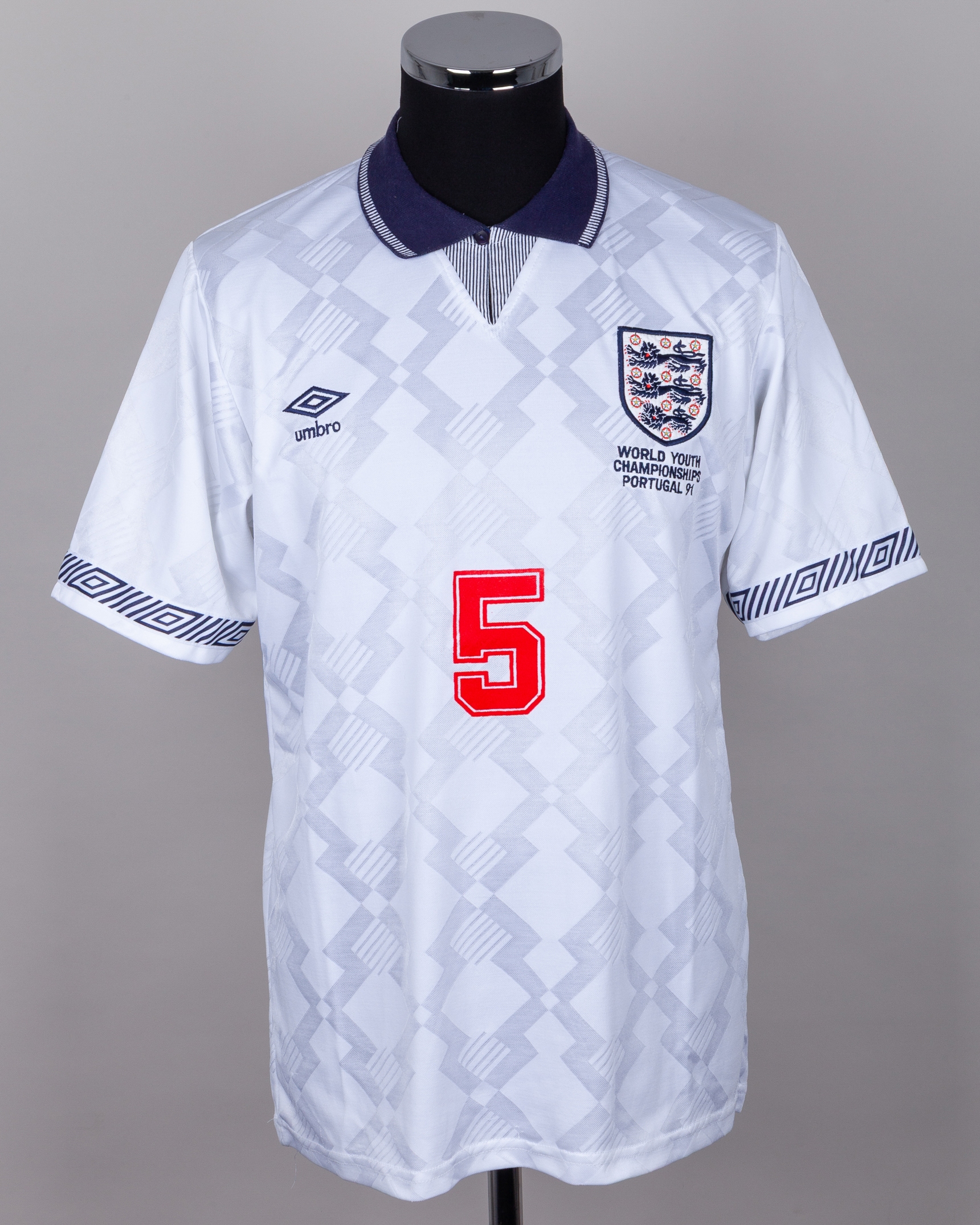 White and blue No.5 England Youth short-sleeved shirt, 1991, Umbro, with button-neck collar and embroidered cloth badge inscribed WORLD YOUTH CHAMPIONSHIPS PORTUGAL 91