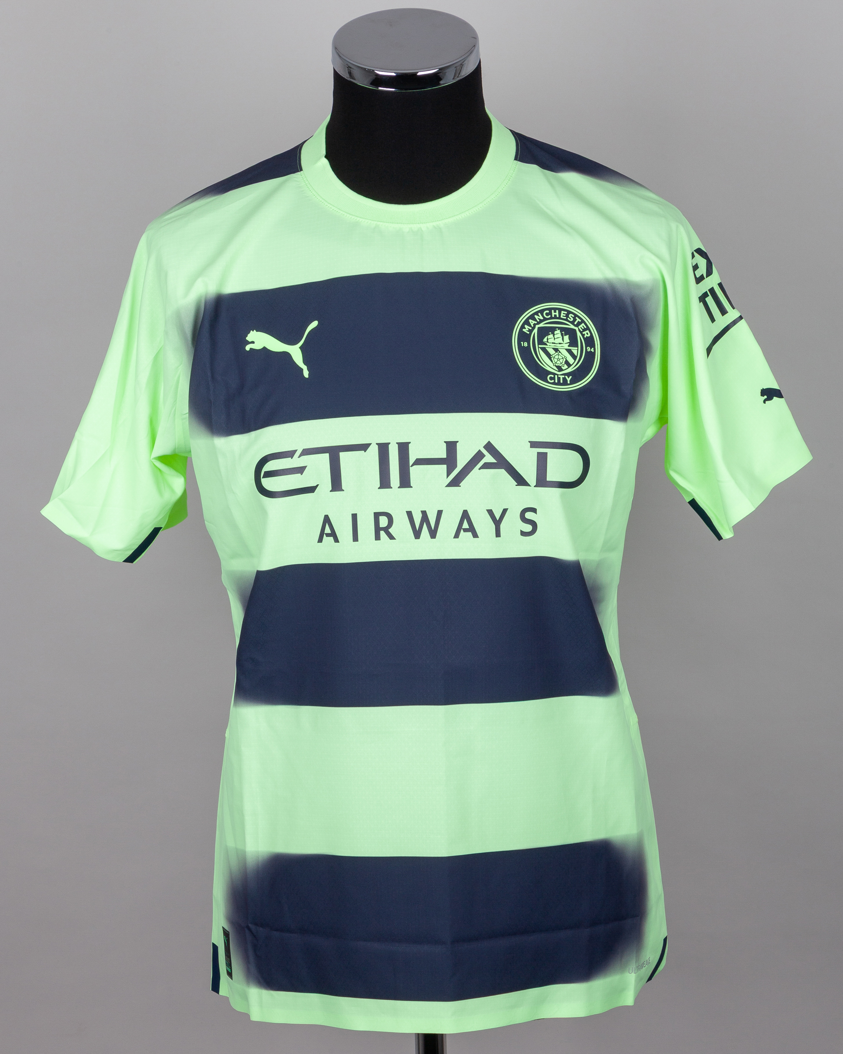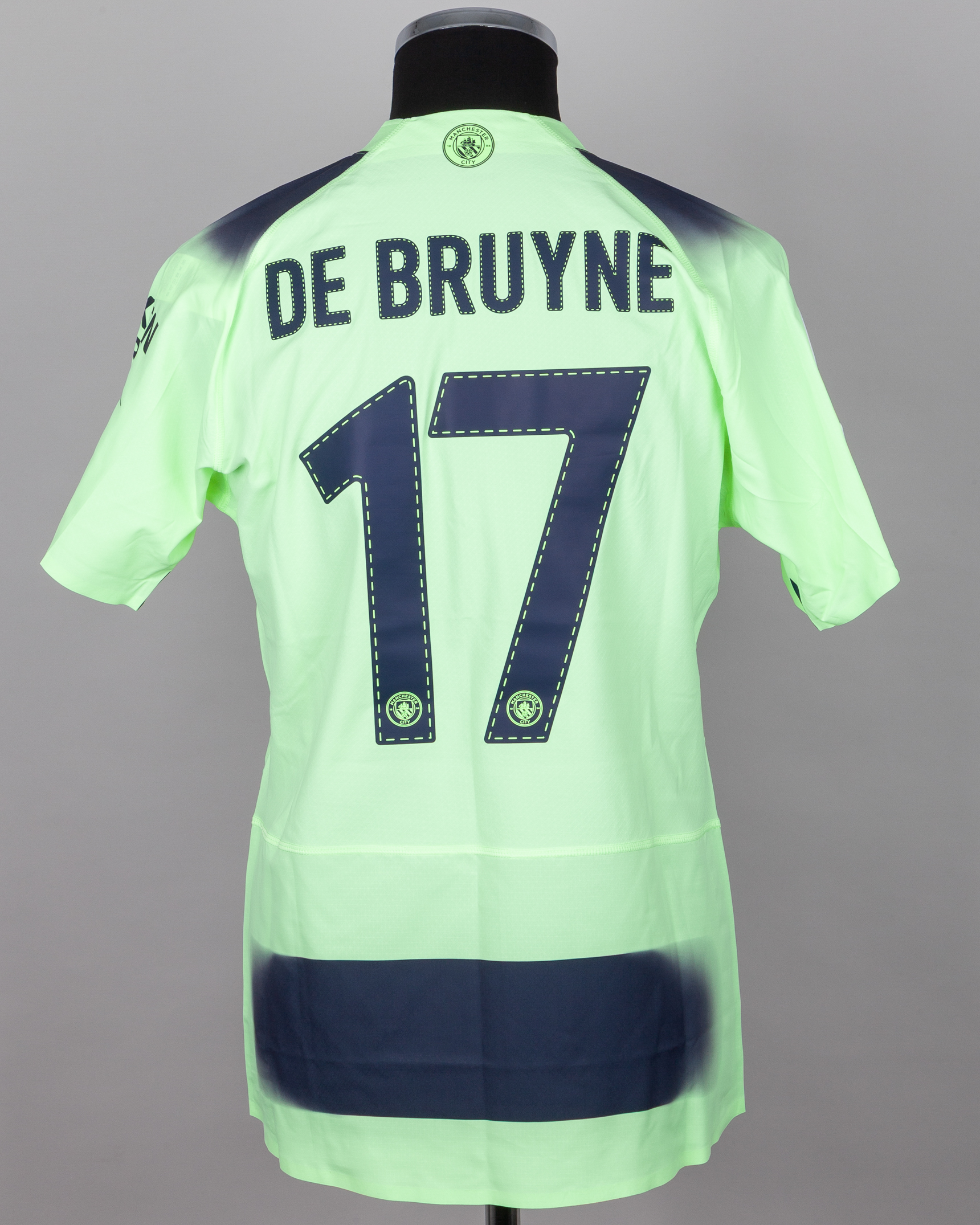 Kevin De Bruyne yellow and black No.17 Manchester City short-sleeved shirt, 2022-23, Puma, M, with crew-neck collar and printed badge, the reverse lettered DE BRUYNE, the right sleeve with Champions League and UEFA Foundation flashes