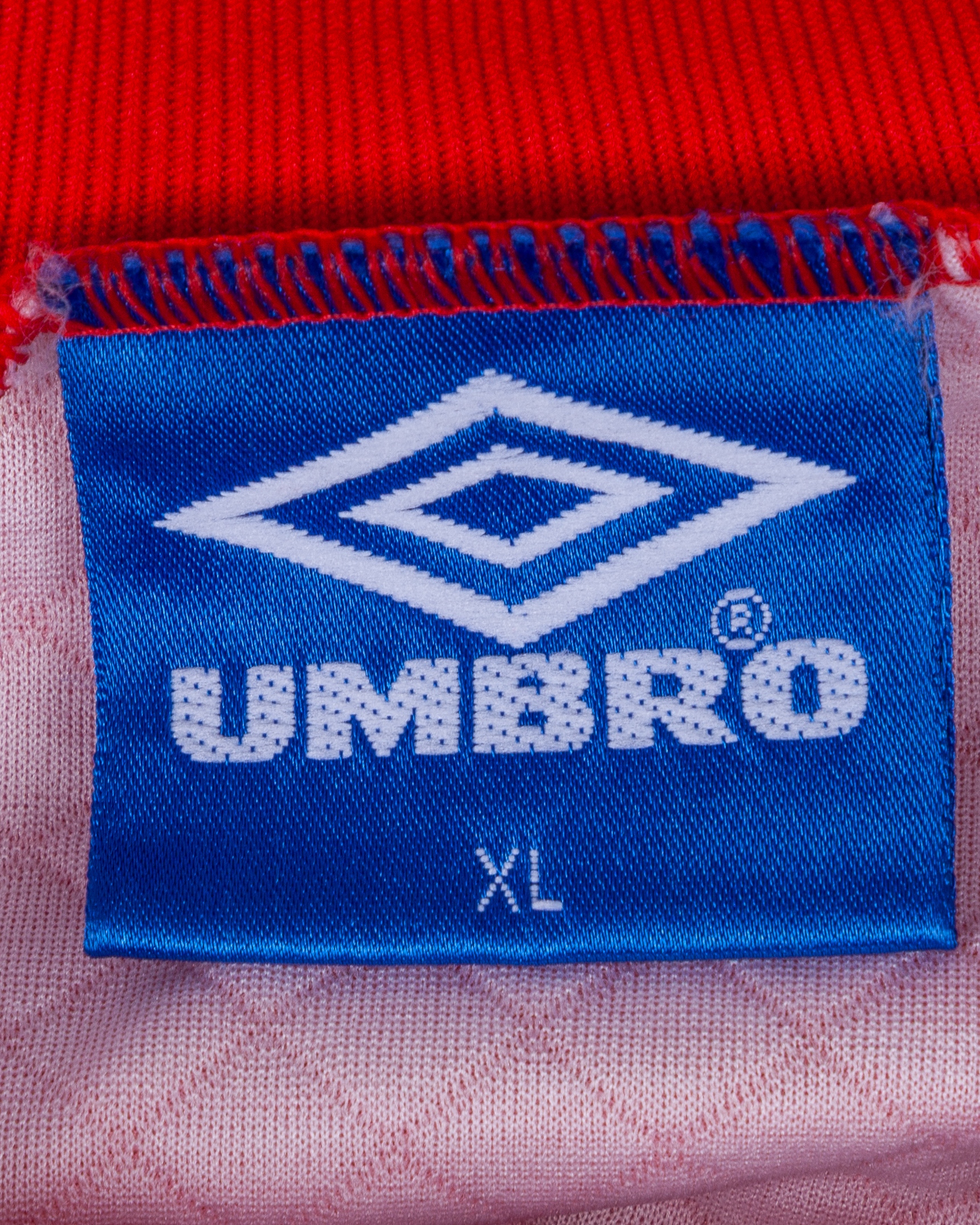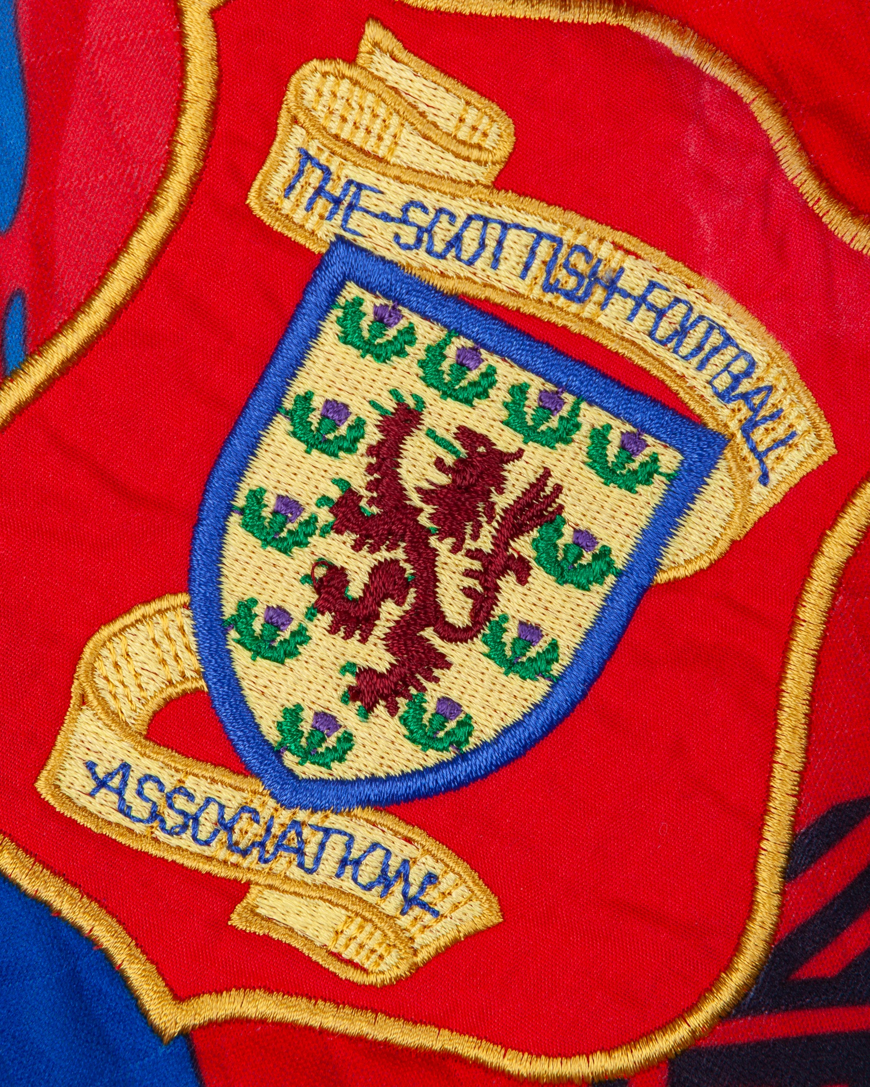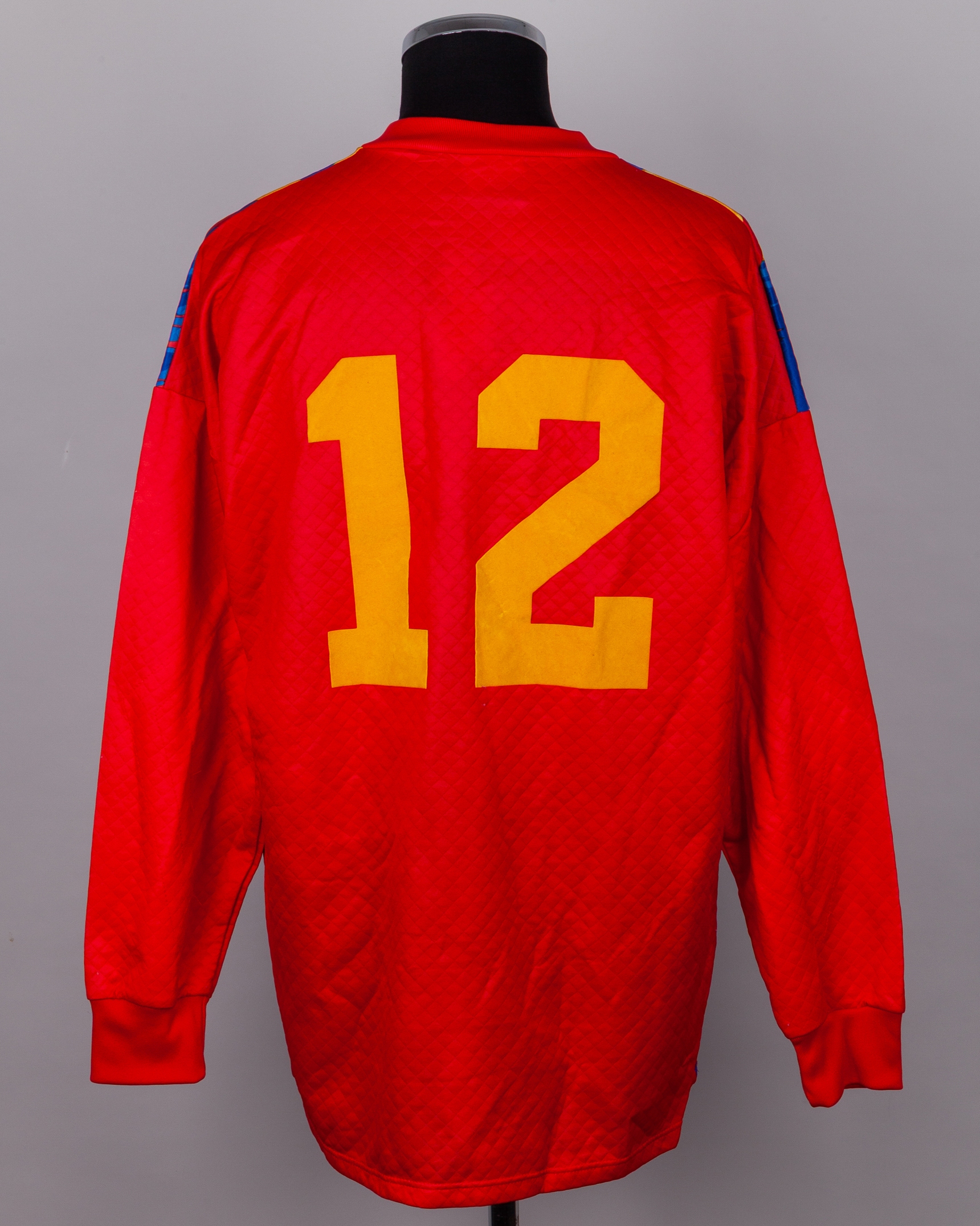 Andy Goram red, blue and yellow No.1 Scotland goalkeeper shirt, 1995-96, Umbro, XL, with crew-neck collar and embroidered badge inscribed THE SCOTTISH FOOTBALL ASSOCIATION