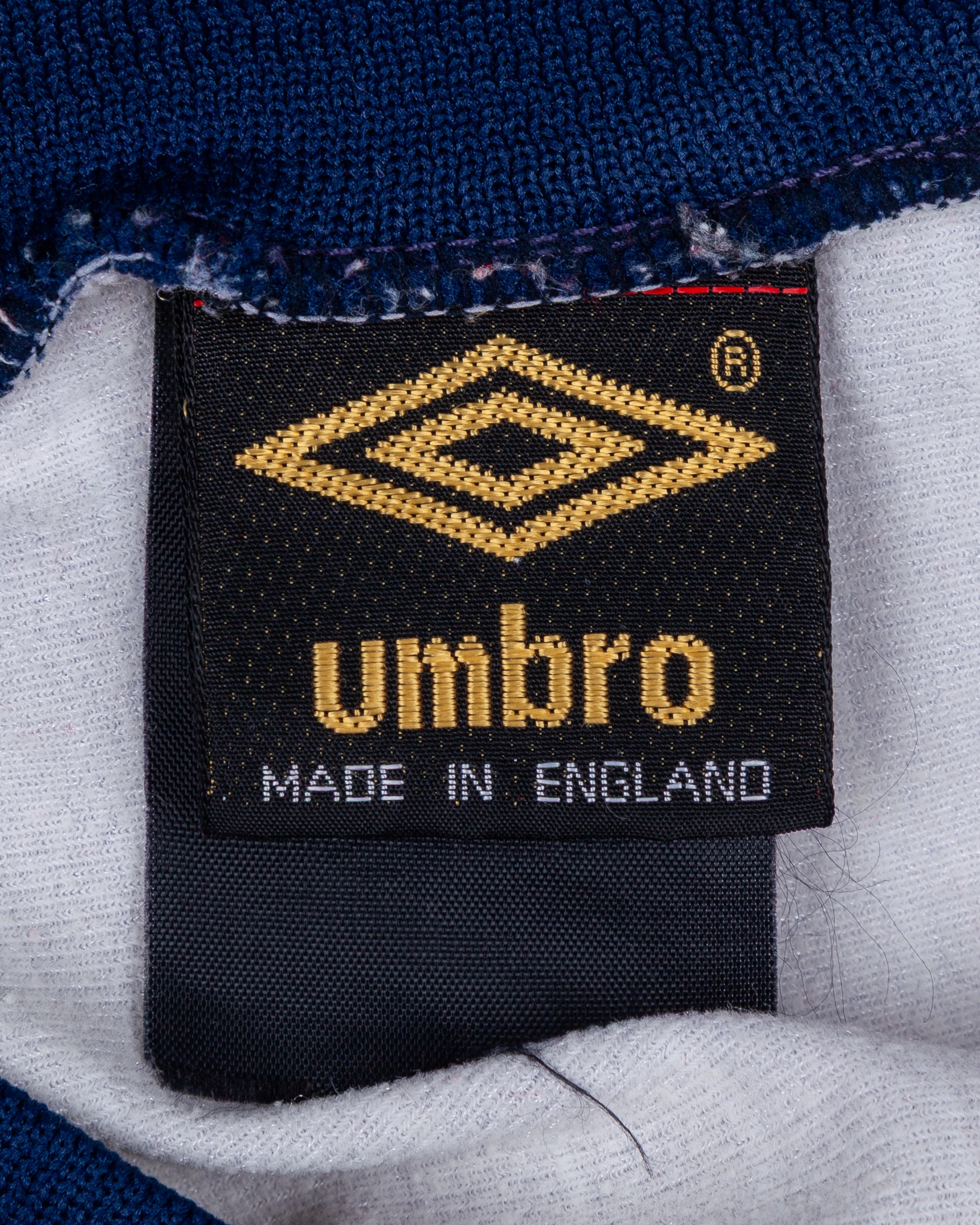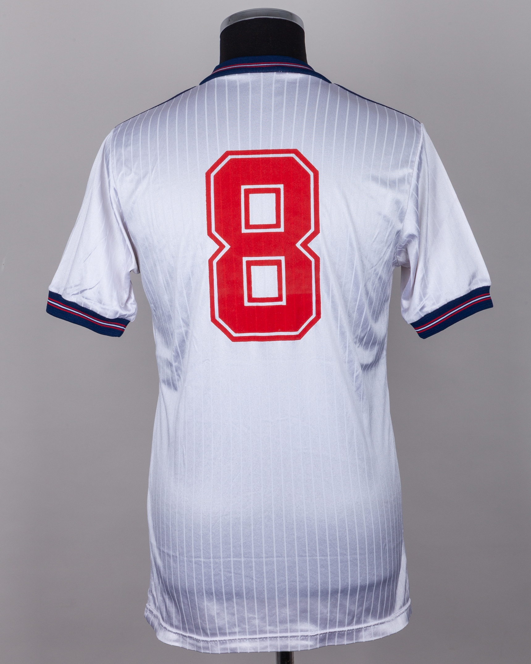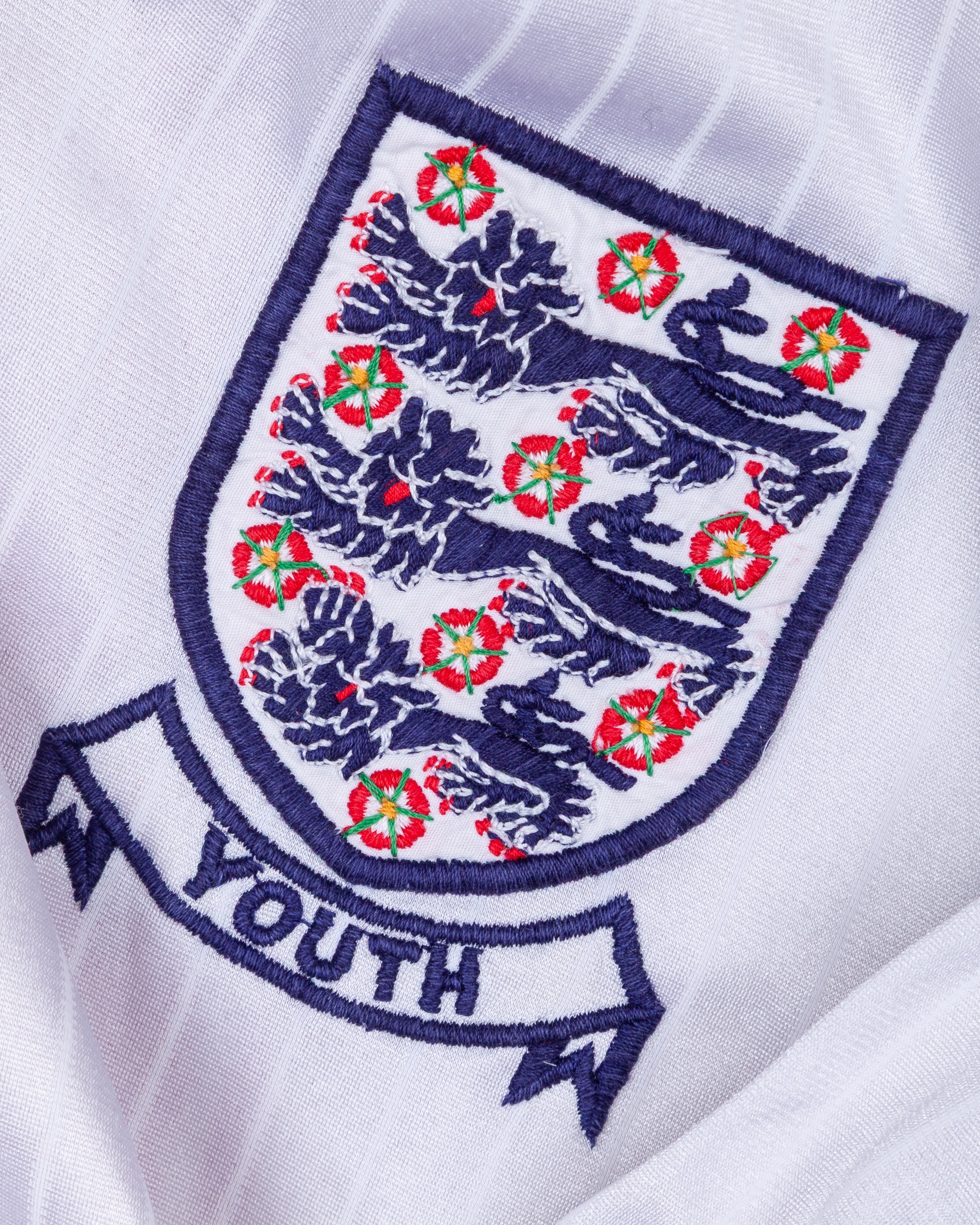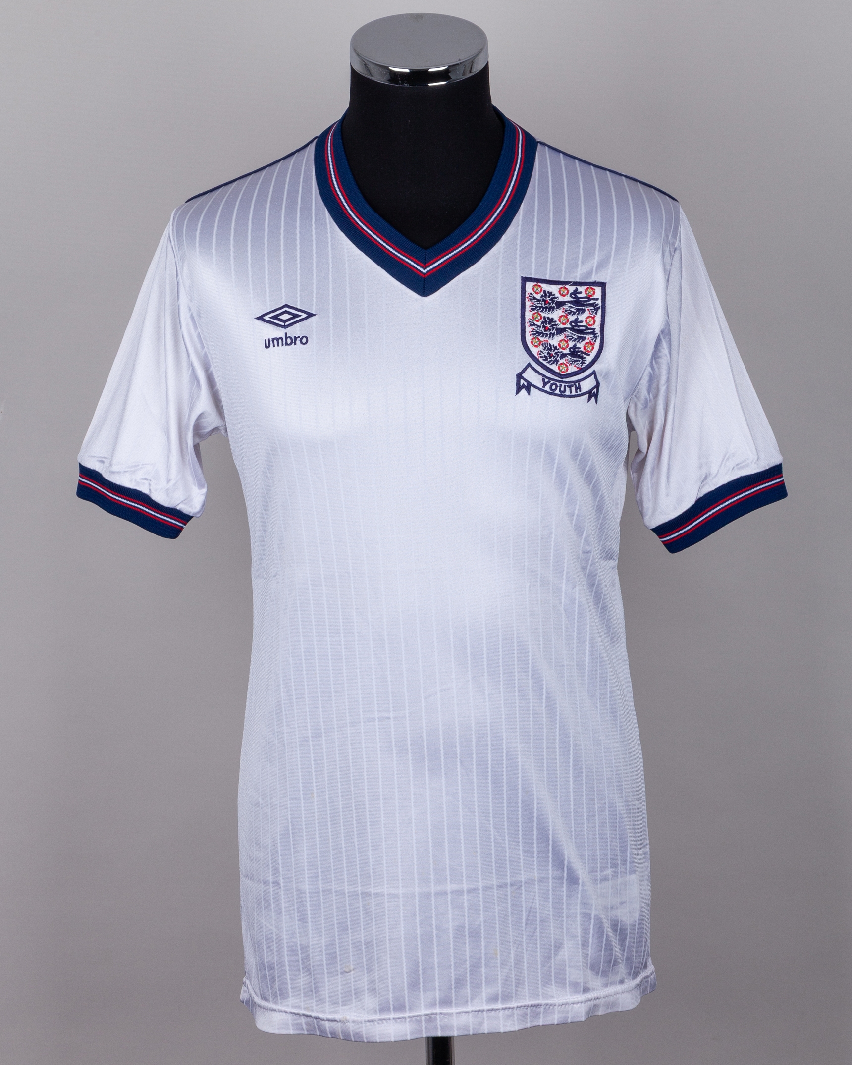 White No.8 England Youth short-sleeved shirt, 1980s, Umbro, with v-neck collar and embroidered cloth badge inscribed YOUTH