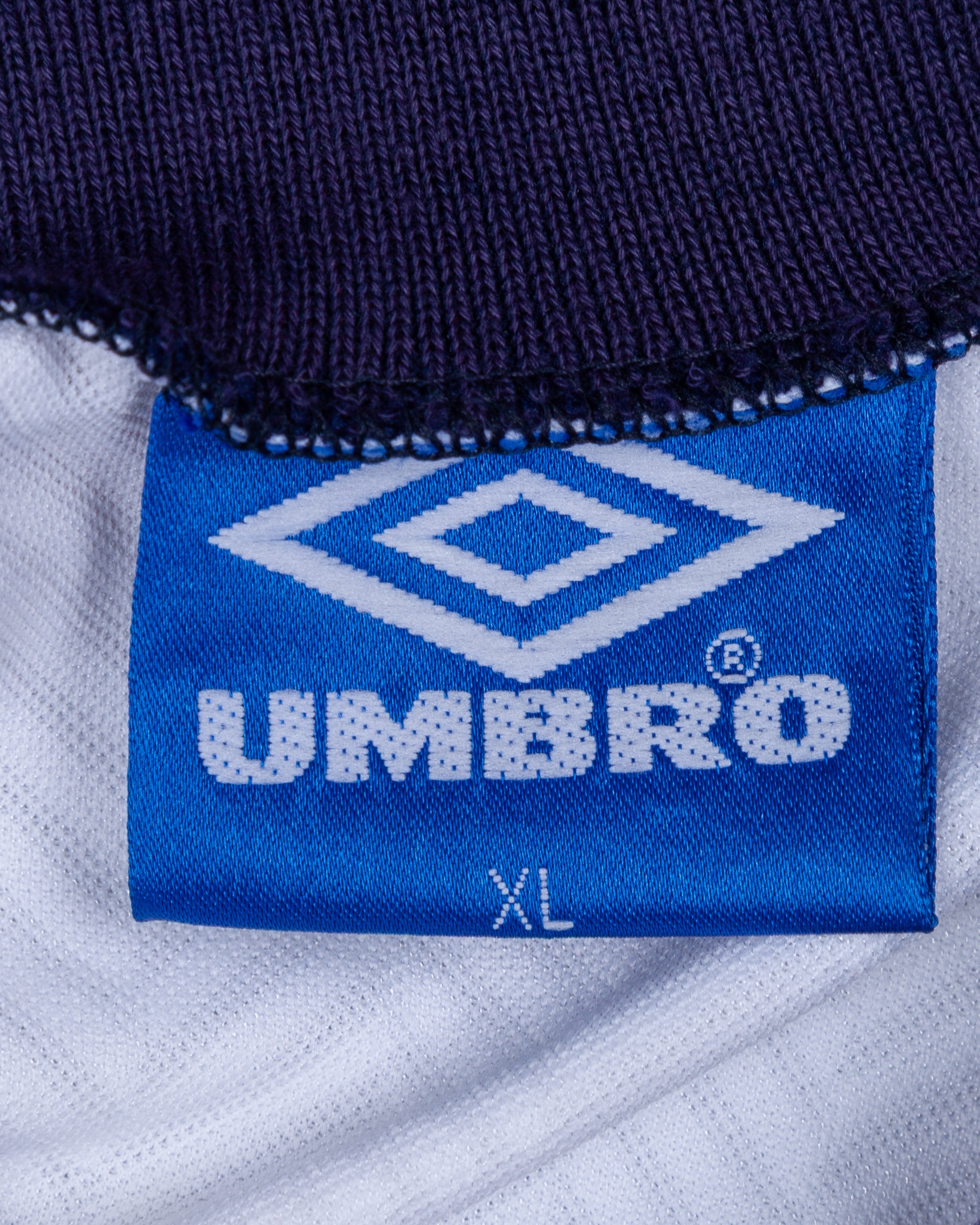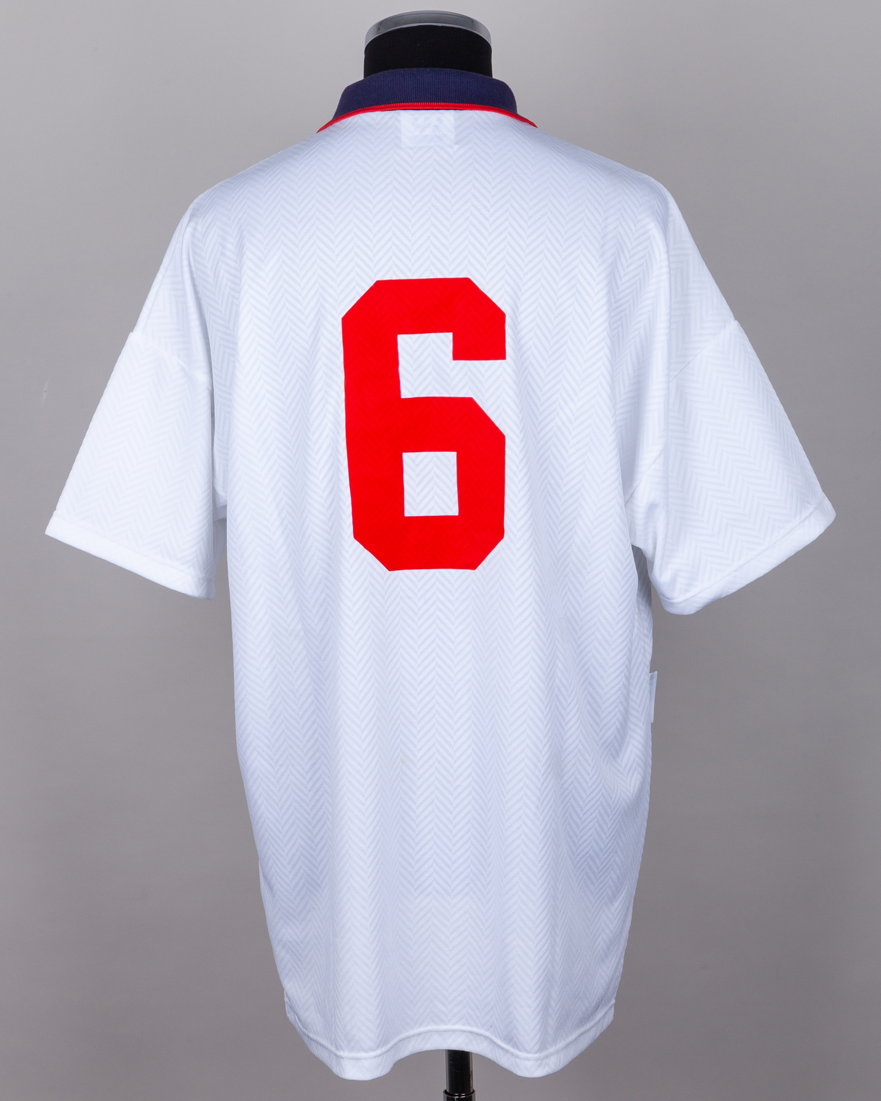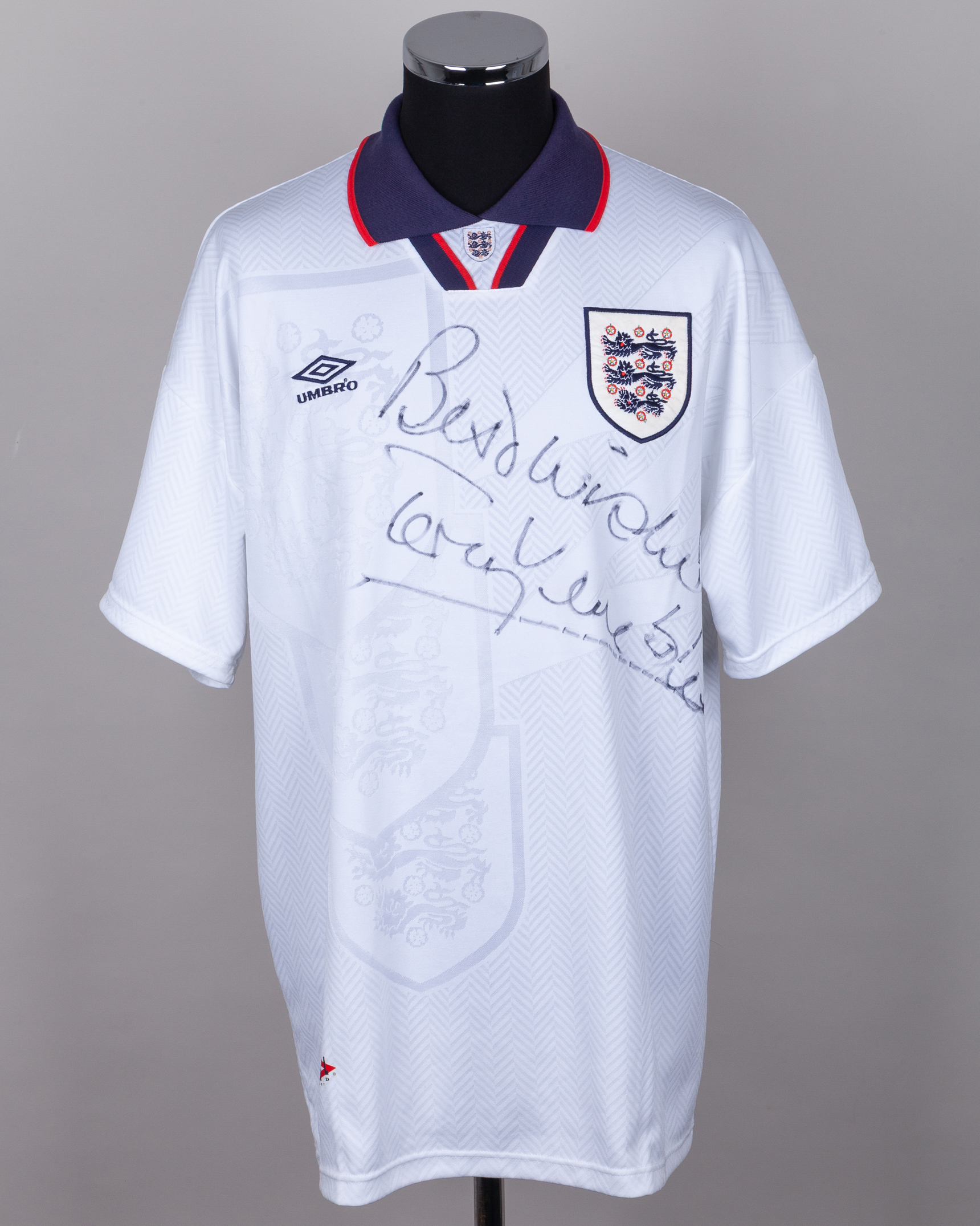 White and blue No.6 England short-sleeved autographed short-sleeved shirt, 1993-94, Umbro, with v-neck collar and embroidered cloth badge, the front of the shirt autographed by Terry Venables.