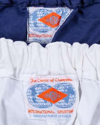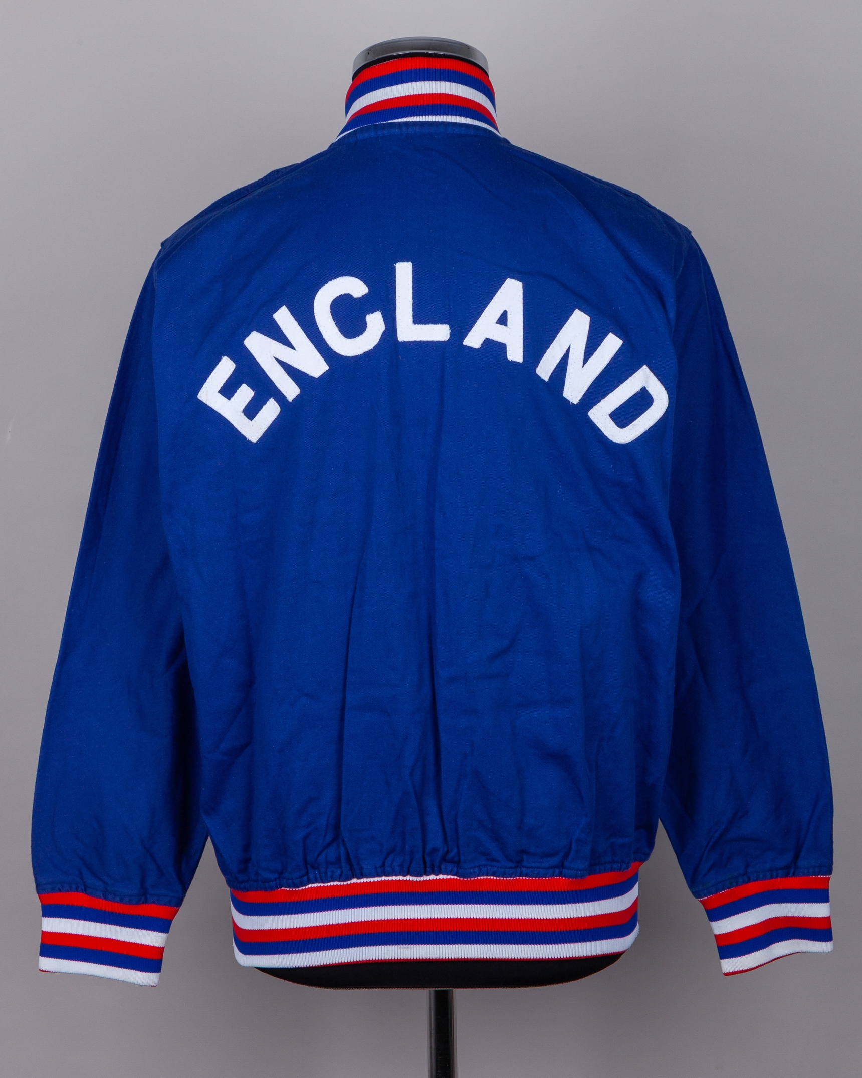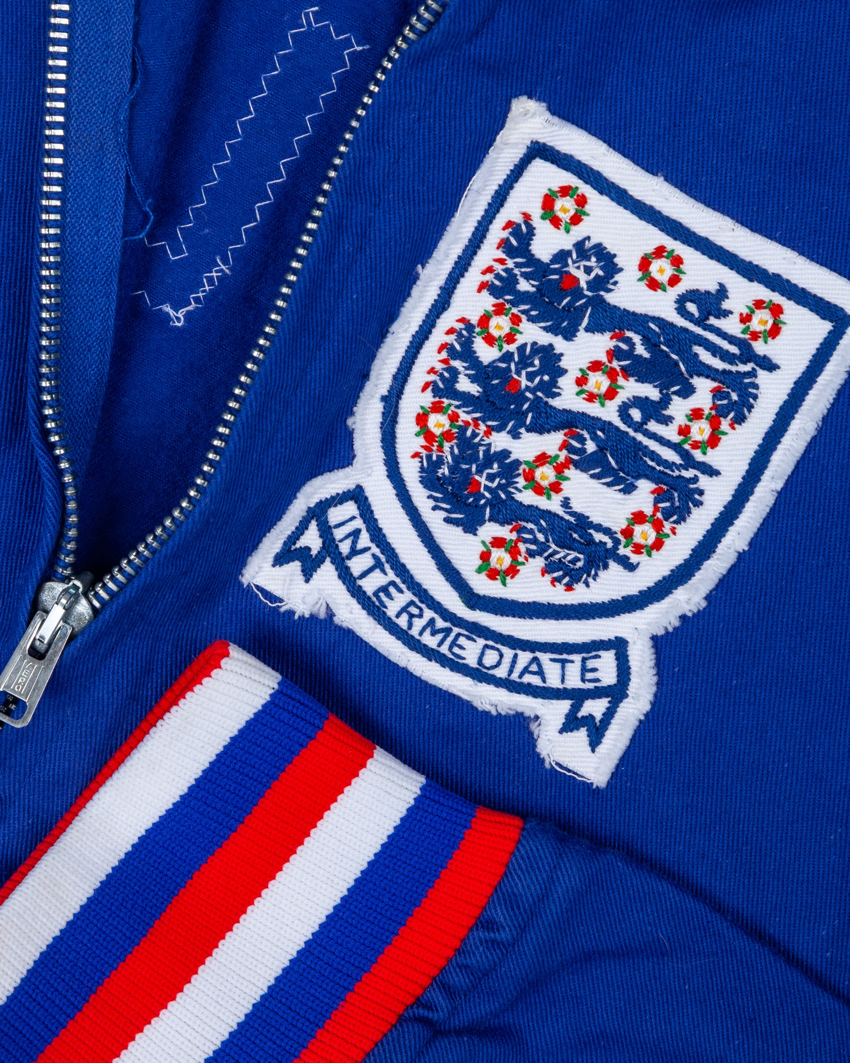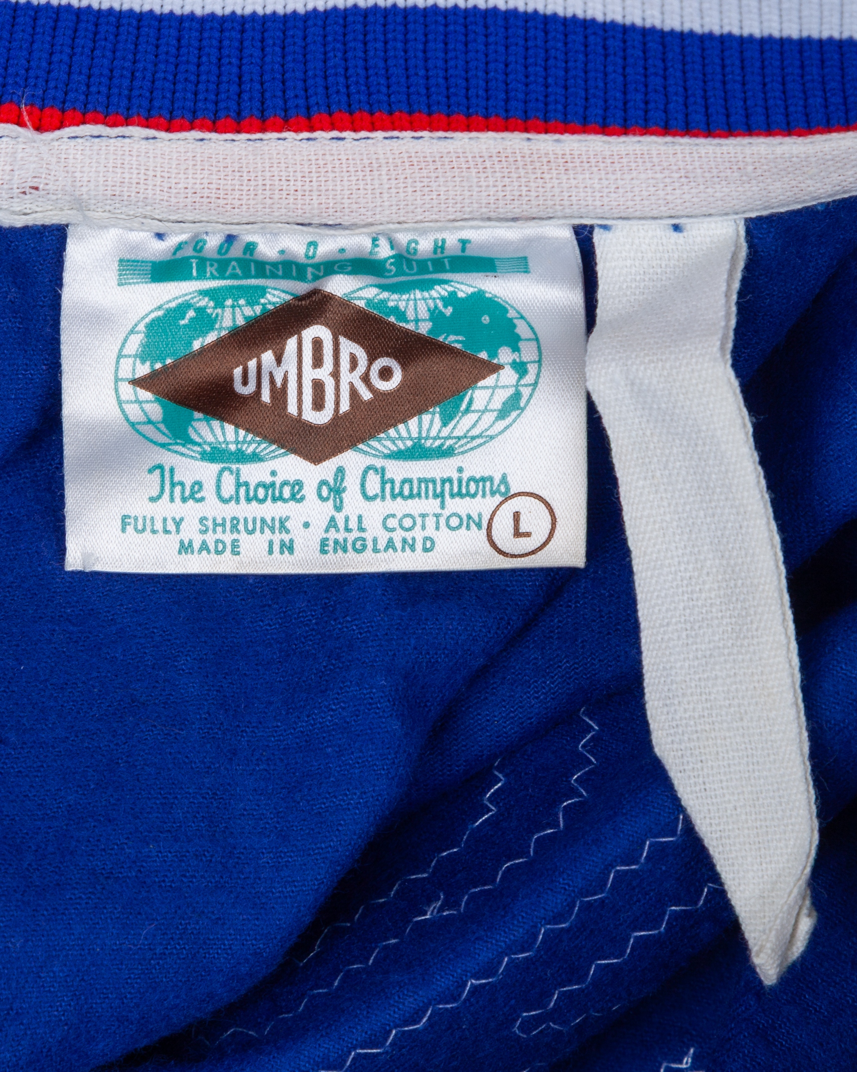 Blue, red and white England Intermediate tracksuit top and bottoms, Umbro, L, with zip-up front and embroidered cloth badge inscribed INTERMEDIATE, the reverse lettered ENGLAND and and pair of white and pair of blue Umbro shorts (3)