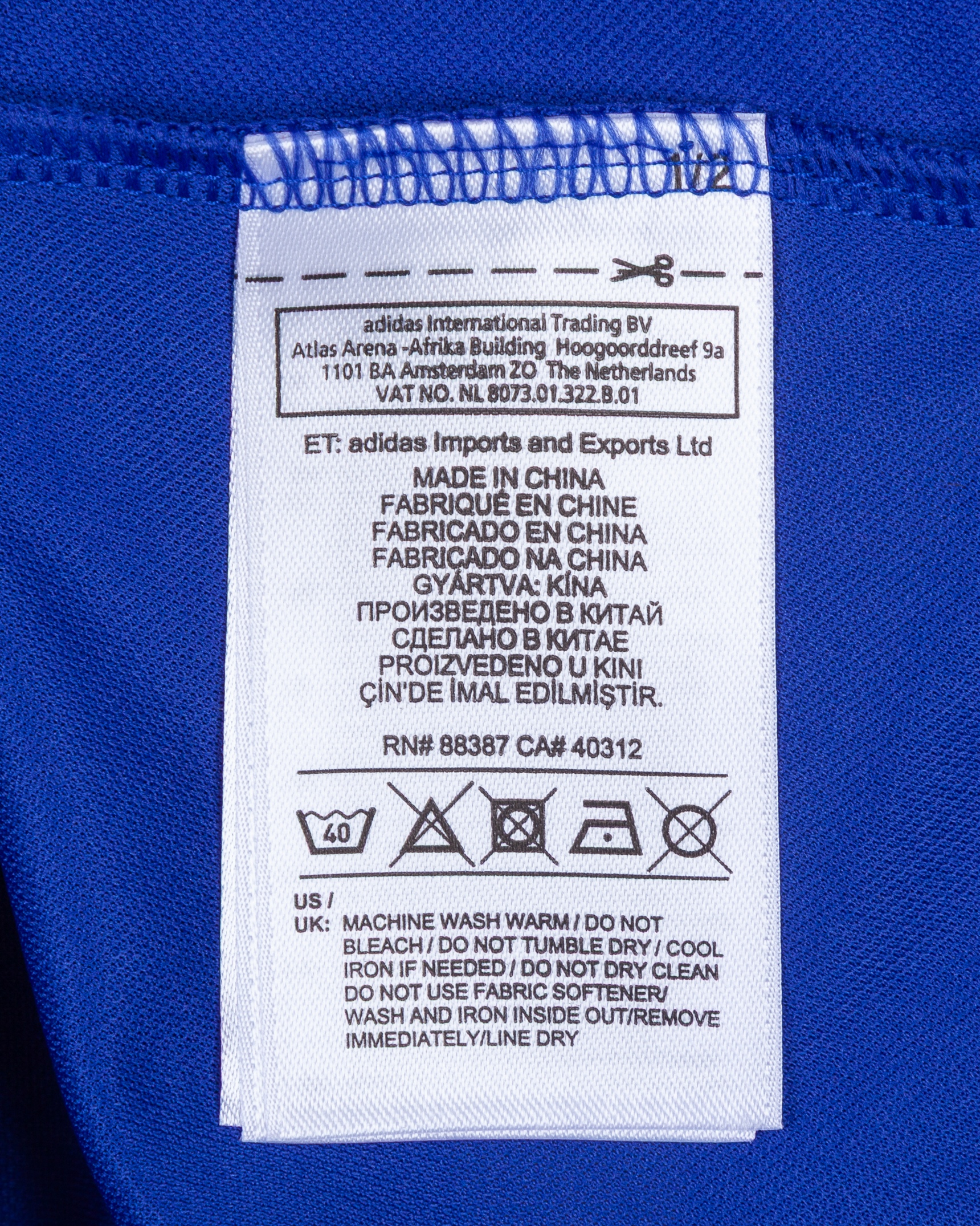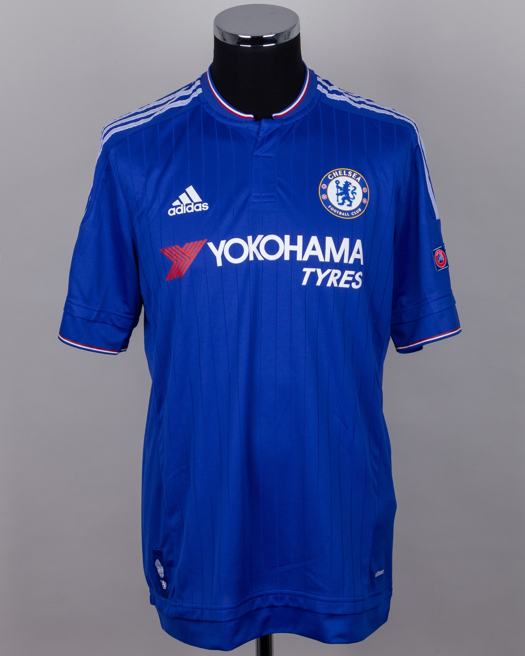 Branislav Ivanovic blue No.2 Chelsea v. Maccabi Tel Aviv autographed short-sleeved shirt, 2015, Adidas, 9, with button-up collar and printed badge, the reverse lettered IVANOVIC, the right sleeve with Champions League flash and the left sleeve with respect flash, with collar button missing
