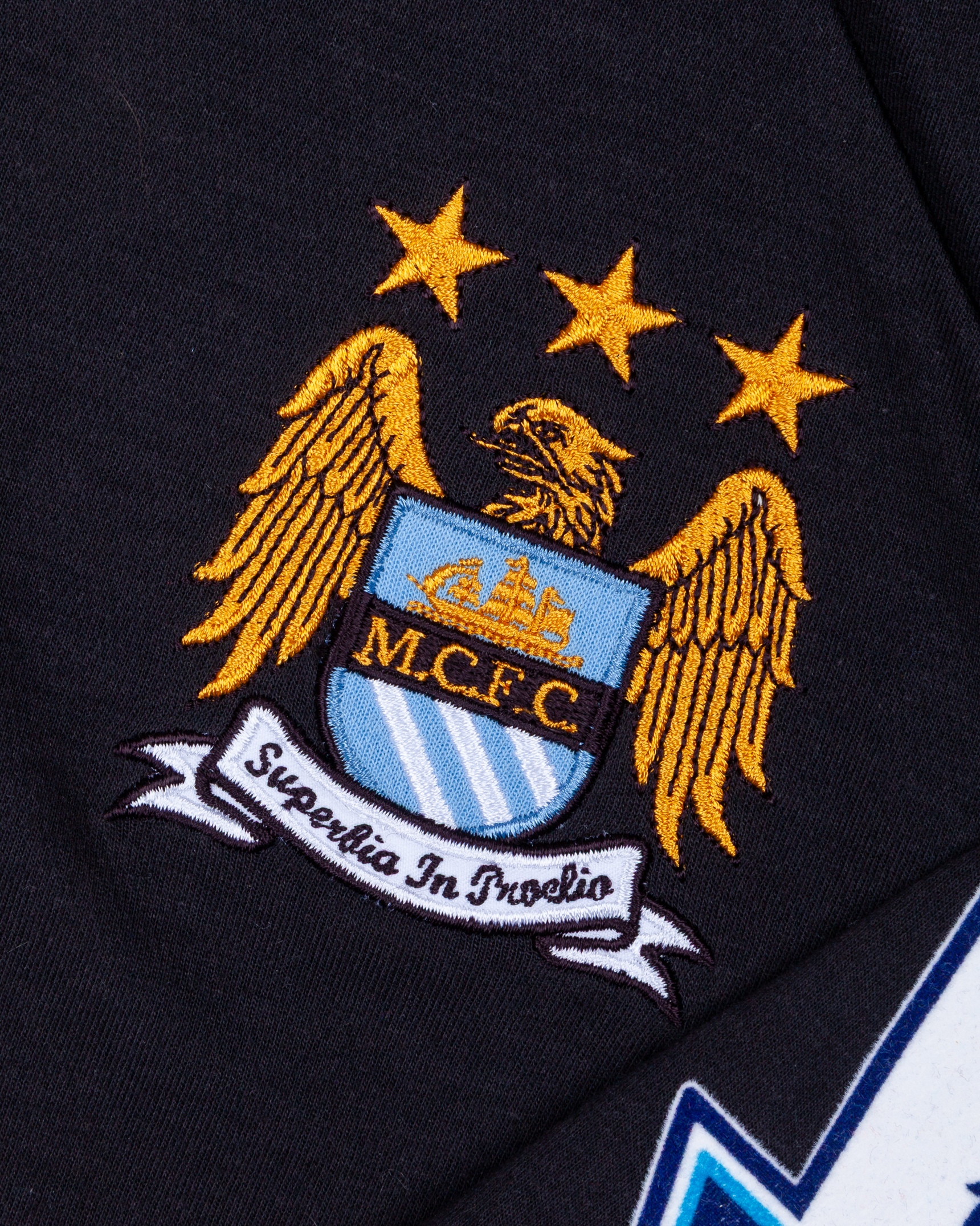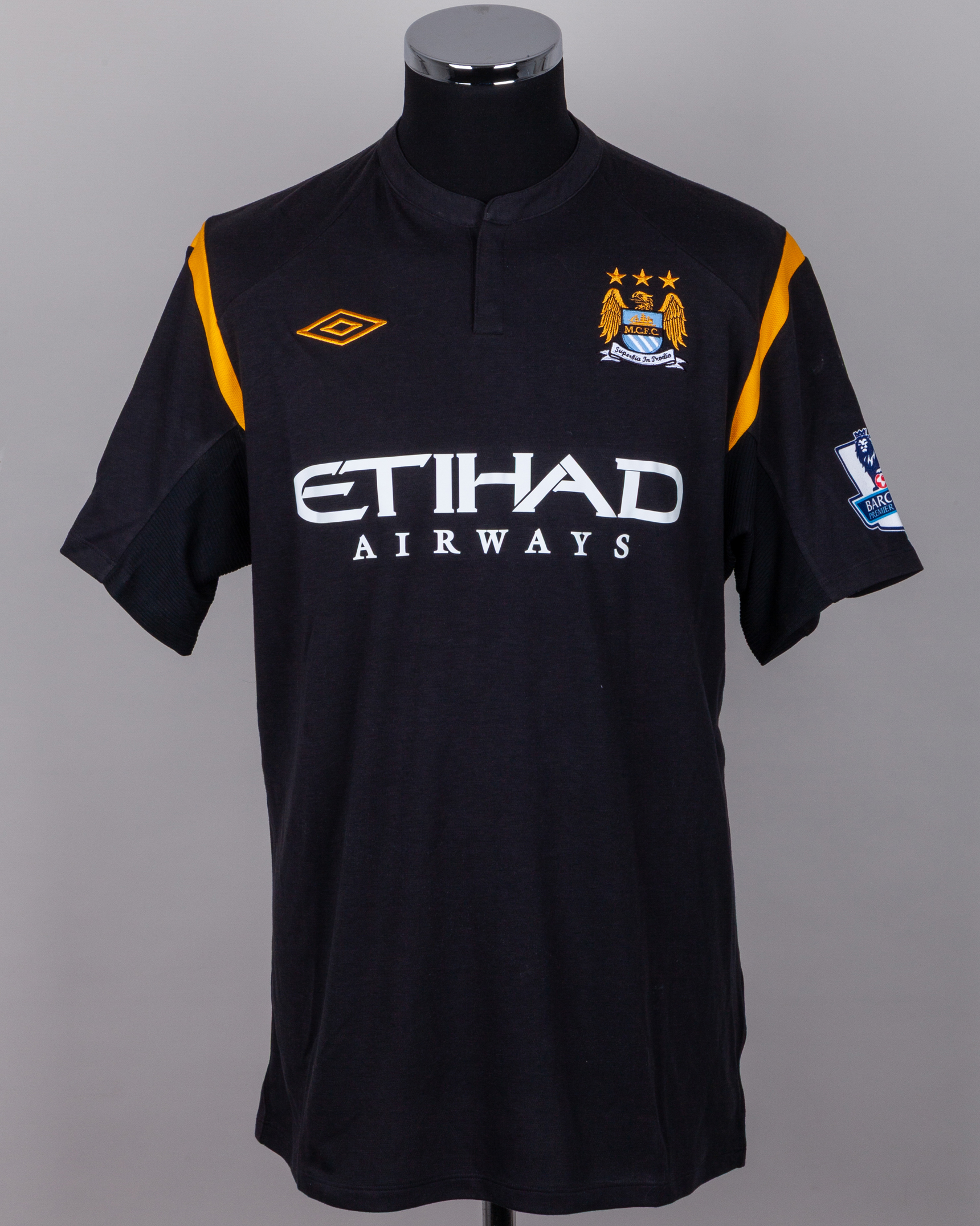 Kolo Toure black and yellow No28 Manchester City v. Arsenal match worn short-sleeved shirt, 2010, Umbro, 44, with crew-neck collar and embroidered badge inscribed M.C.F.C., the reverse lettered TOURE, the sleeves with Barclays Premier league flashes, with COA from Stephen Ireland Foundation