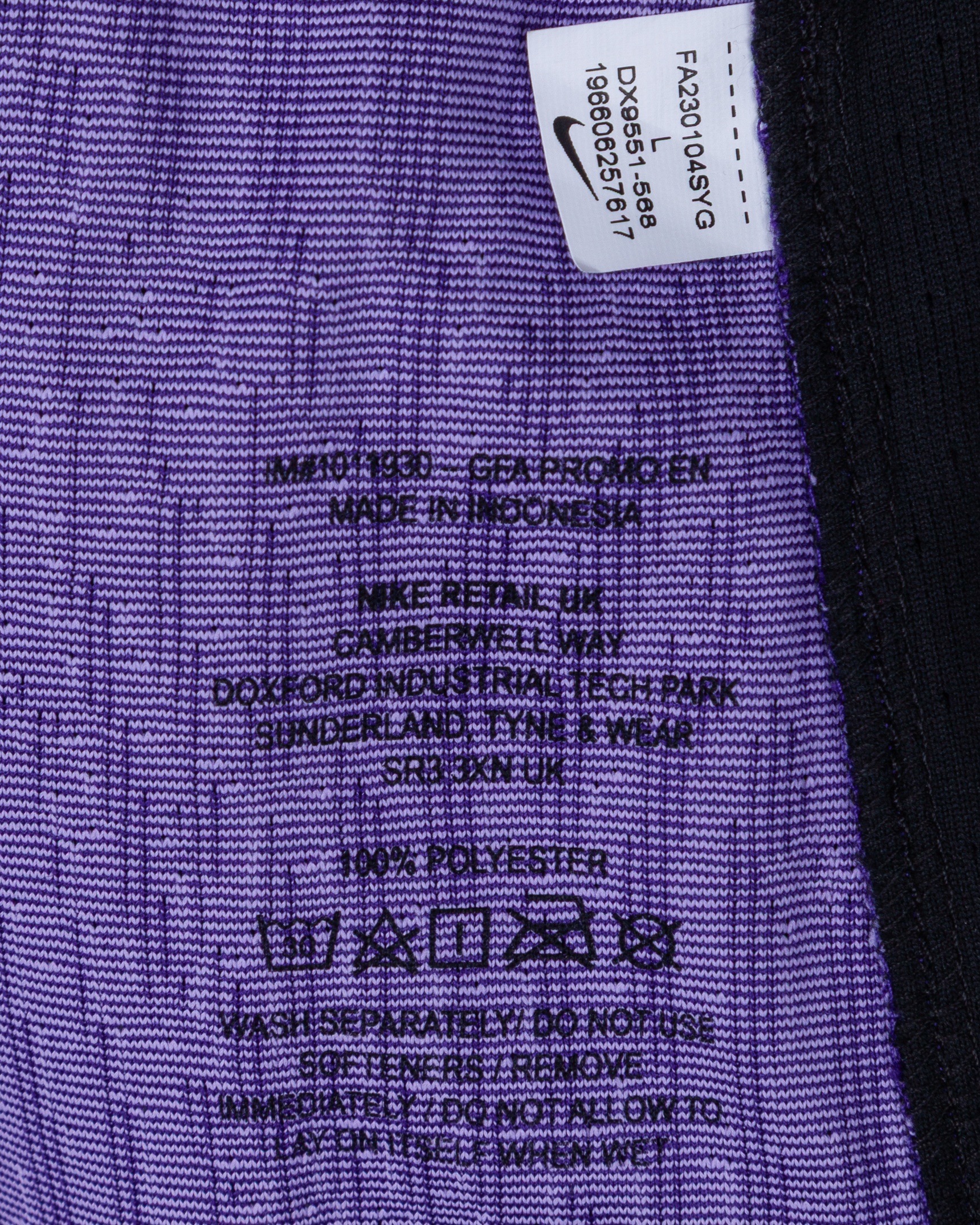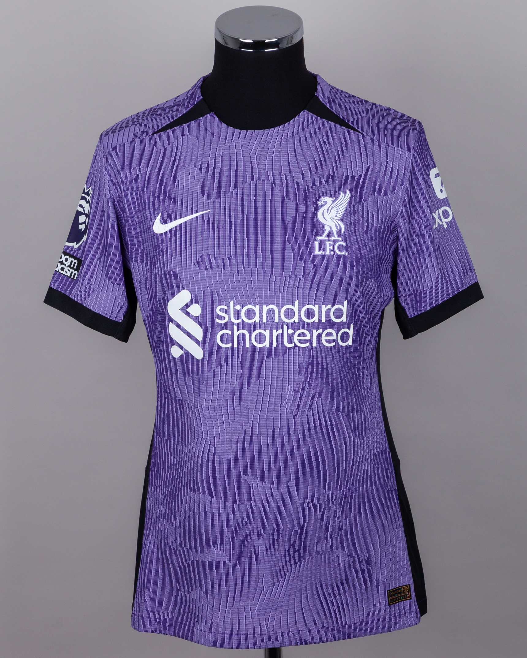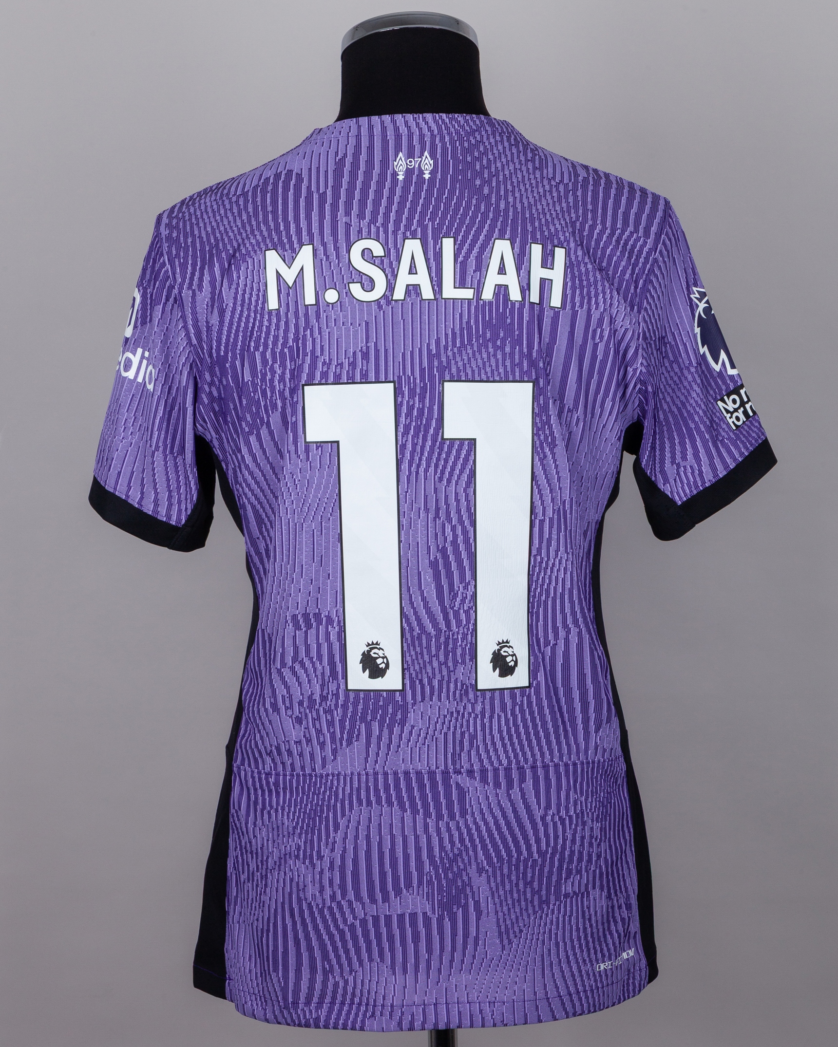 Mohamed Salah purple No.11 Liverpool v. Sheffield United short-sleeved shirt, 2023, Nike, L, with crew-neck collar and printed badge, the reverse lettered M. SALAH, the right sleeve with Premier League flash