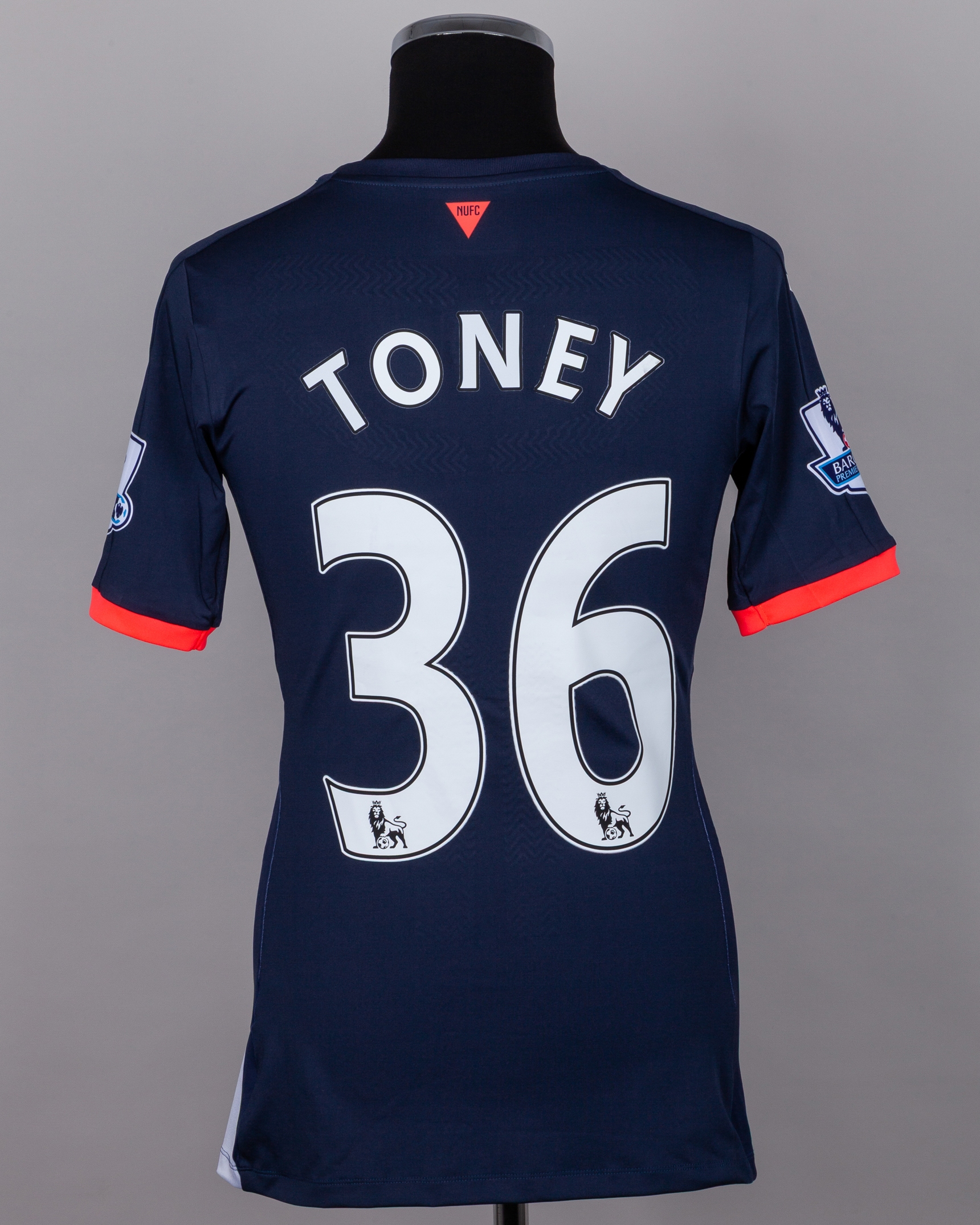 Ivan Toney dark blue No.36 Newcastle United short-sleeved shirt, 2015-16, Puma, L, with crew-neck collar and printed badge, the reverse lettered TONEY, the sleeves with Barclays Premier League flashes